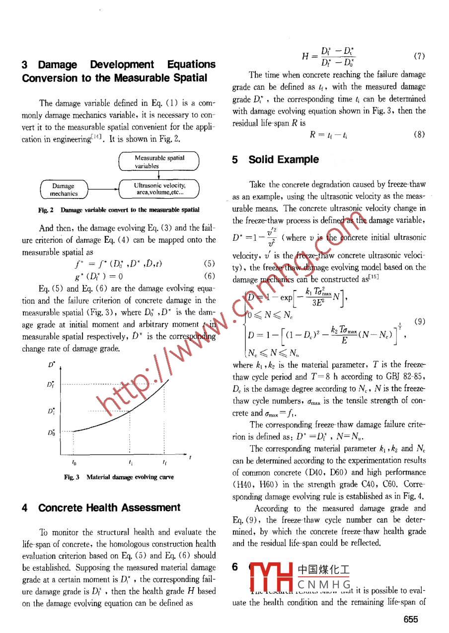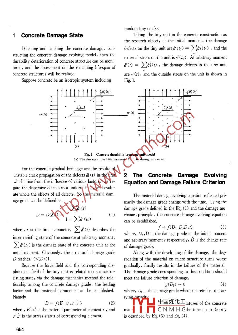 Vol.11 No.3 2006 653 -656WUJNSWuhan University Journat of Natural SciencesArticle ID; 1007 :1202(2006)03-0653-04Description of Concrete DurabilityDamage Process0 Introduction口CHEN Yueshun, WEI Junt , .ZHAO Xiaolongn city infrastructures reconstruction, the concrete struc-School of Civil Engineering and Mechanics, Huazhongtures are common. So it is necessary to carry out the re-University of Science and Technology, Wuhan 430074,Hubei, Chinasearch on the concrete structure health monitoring, structuraldiagnosis and life span evaluation'lJ .The current health monitoring and structural diagnosisAbstract: Based on the dammage mechanics, the concretedamage grade o[ relalive stable environment in tneasurablemethod of concrete structures primarily contain two majortypes, one is to supervise and control them timely at service,ewolving model and corresponding failure rule is constructedthen pass the collection of the structural dynamic displace-based on tbe damage grade fore defined. Tberefore, the con-ments, velocity and acceleration, via numerical analysis to thecrete health slatus and the residual life span can be esessedaccording lo the measured damage grade. It is propitious t0monitor and evaluate continuously the health progress of thedrive the devcloprment of concrete durability assesment andstructure[2-5]; another is to peridically or aperidically checklife span forecast. Its fensibility o[ concrcle damage processdescription and health assment is validated with the exam-and measure the structure non-destructively, and to analyzeple in this paper, in which the damage stale is described withthe examination data 10 assess the structure progressive-the ultrasound velocity attenuation, and the freeze thawly6-10]. Each of them has its superiority and Cdrawbacksprocess is regarded as the concrete durability degradation in-fluencing factor to reflext the concrete durability degradationwhich should be considcred in the further research and devel-process,opment-1.121.Key words : concretc; durability danage; life span assess-Excepl the paroxysmal process, the breakage of concretement; health monitoring; ultrasonic velocitystructure is a gradual procs-1] , and the structural health de-CLC number: TU 317*.5terioration should be closely linked with this process. The :concrete structural gradual failure exhibits mainly its durabilityfailre[13]. Concretely, it includes the concrete material dura-bility deterioration, reinforcement steel material durabilty deterioration, and the bond strength between concrete and rein-Received date; 2005 10-11Foundation item: Supportod by the National Ntural Science Foun-forcement lost gradually. The latter two factors are interrelat-dation of China(50278039), the Natural Scicnce Foundation of Hubeied closcly with the concrete material durability deterioration.Provience of China ( 2004ABA062) and Chenguang Program ofNo matterete material durabilityWuhan Crty(2005003059 29)Biography: CHEN Yueshun(1975-). male, Ph, D. candidate. re-deteriorati中國煤化工t exhibits as the inter-search direction; the durability of concrete. E-mail:chyushli@ pubic.wh. hb. ennal structYHC N M H Gon, cracks propaga-t To whom correspondence should be ndressed E-mail;junewei@ion-14,15].public. wh. hb. cn653random tiny cracks.1 Concrete Damage StateTaking the tiny unit in the concrete construction asthe research object, at the initial moment, the damageDetecting and catching the concrete damagc, condelects on the tiny unit are8()= > 8i(o),and thestructing the concrete damage evolving model, then theexternal stress on the unit is o (t). At arbitrary momentdurabllity deterioration of concrete structure can be moni-8(1) = > δ(t),the darmage defects in the tiny unittored, and the assessment on the remaining lifc span ofconcrete structures will be realized.areo (t), and the outside stress on the unit is shown inSuppose concrete be an isotropic system includingFig. 1.↑↑↑↑↑↑↑↑↑↑8(1)↑↑↑↑↑↑↑↑↑↑F8{() _σ()(2)Fg. 1 Concrete durability breakage unit model(a) The damage at the initial moment; (b) The damagc at momentFor the concrete gradual breakage are the results ofunstable crack propagation of the defects δ% (t) in the unit2 The ConcreteDamage Evolvingwhich arise from the influence of various factors, we reEquation and Damage Failure Criteriongard the dispersive defects as a uniform field, and evalu-ate whole the effects of all defects. So the material dam-The material damage evolving equation rlflected pri-age grade can be defined asmarily the damage grade change with the time. Using theZ8(t)damage grade defined in the Eq. (1) and the damage me-D= D(8,1) =(1)chanics principle, the concrete damage evolving equation1- 28"(o)can be established,f= f(Do,D,D,t)(3)where, t is the time parameter,Z8 (1) describes thewhere, D。,D is the damage grade al the initial momentinner resisting state of the concrete at arbitrary moment,and arbitrary moment t respectively, D is the change rate28(n) is the damage state of the concrete umnit at theof damage grade.initial moment. Obviously, the structural damage gradeAlong with the developing of the damage, the deg-D reaches: 0