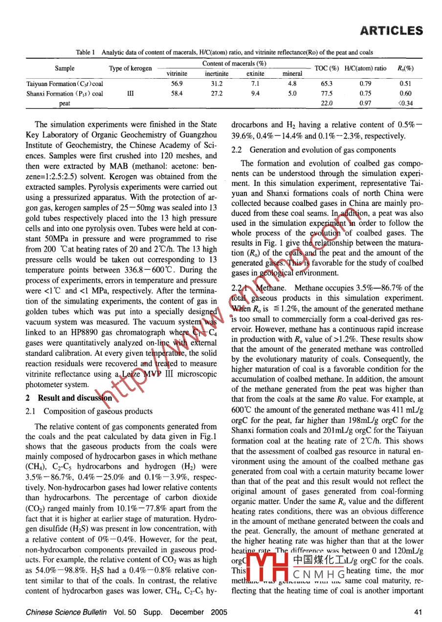 ARTICLESChinese Science Bulletin 2005 Vol 50 Supp 40-44ome researchers have simulated the yields ofThermal simulation of thegases and hydrocarbons, geochemical characteristics ofproducts and kinetics of hydrocarbon generation by meansformation and evolution ofof pyrolysis experiments on total coals. In addition,many simulation experiments of coal macerals have alsocoalbed gasbeen reported and a lot of new findings are obtained5-7Coalbed gases are mainly composed of methane and otherDUAN Yi, WU Baoxiang 2, ZHENG Chaoyang.2hydrocarbons and non-hydrocarbon gases, and the gener-WANG Chuanyuanating process of each gas component and the relationshipsbetween those gases are important for understanding the1. Key Laboratory of Gas Geochemistry, Institute of Geology and Geo- feature of the formation and evolution of coal-derived gas2. Graduate School of Chinese Academy of Sciences, Beijing 100039,So far, studies on these problems are still lacking. Pre-vious pyrolysis simulations of the evolution of coal matuCorrespondence should be addressed to Duan Yi (email: ration usually adopted isothermal heating and only pro-Duany @ns lzb ac cn)longing time in dealing with the influence of heating timeAbstract Thermal simulation experiment of gas generon the evolution of hydrocarbon generation from coalstion from the peat and the coals were performed using the However, the evolution of coal maturation is a dynamichigh temperature and pressure apparatus, at temperature process in geological environment, so it is controlled byranging from 336.8-600'C, a pressure of 50MPa and two temperature and geological time. Thus, this experimentheating rates of 20'C h and 2 C/h, and the evolution and method cannot follow the kinetic process of gas generaformation of coalbed gas components were studied. Results tion from organic matter well. To date, no experimentshow that for the coals, the gaseous products are mainly studies on the evolution of coalbed gas generation fromcomposed of hydrocarbon gases. However, for the peat the peat have been reported. Peat has been considered as thecontent of hydrocarbon gases in gaseous products is lower original matter of coal formation without t undergoingthan that of non-hydrocarbon components. In the gener- deep burial and strong degradation. So peat contains lotsated hydrocarbon gases methane is predominant and heavy of original information important for understanding thevolutionary characteristics of coal-forming organic matated non-hydrocarbon gases, and hydrogen(H) and sul- ter during the cause of coalification. On the basis of thefurated hydrogen(H S)are existent in trace amount. It is above-mentioned facts, the peat and low-maturity coals inalso observed that temperature is the main factor controllingg this study were used in the simulation experiment and thethe evolution of coalbed gas generation. With increasing process and characteristics of gas generation from thesevitrinite reflectance, methane rapidly increases, COz sightly experimental materials were studied. The experimentalincreases, and C2s hydrocarbons first increase and then de- system were performed at the heating rates of 20 and 2Ccrease. The peat and Shanxi formation coal have a higher h to reveal the role of time in the process of gas genera-generative potential of coalbed gases than coals and Taiformation coal, respectively, reflecting the effect of the proption. The potential uses of results obtained in the studyerty of organic matter on the characteristics of coalbed gas coalbed gas components in geological environment arecomponent generation. In this study, it is found that low discussed. This provides a scientific reference for furtherheating rate is favorable for the generation of methane, H2 understanding the genesis and characteristics of coalbedand CO, and the decomposition of C2s hydrocarbons. This gas in geological environmentshows that heating time plays an important controlling rolein the generation and evolution of coalbed gases. The resultsThe results 1 Samples and experimentalbtained from the simulation experiment in the study of In this experiment, two coals and a peat were collectedcoalbed gases in natural system are also discussed.to simulate the formation and evolution of coalbed gasKeywords: coalbed gas, generation and evolution, pyrolysis, peat, components. The coals came from the No. 2 coalbed in theLiyazhuang Coal Mine of the Qinshui Basin(ShanxiDOl:10.1360/98zk0002Formation(Ps), bituminous coal)and No 6 coalbed inTanggongta Coal Mine, Inner Mongolia(Taiyuan Forma-Coalbed gas is a mixture of various kinds of hydrocar- tion(Cat), bituminous coal). The peat was collected frombon and non-hydrocarbon gases generated from the Ruoergai Marsh of Sichuan Province at a depth of 3.0coal-formed organic matter during its geological evolution. 3.2 m, of which the organic carhon content was approxiThermal experiments of organic matter was widely carried中國煤化工 hydrogen, oxygen andout to simulate the process of hydrocarbon generation, nitrogeCNMH were 59.8%,4.8%assess the generative potential of hydrocarbons from dif- 24.20wopwou,vj, and the carbon isotoferent types of organic matter and study the influence of composition was -27. 1%o. Other analytic data for the peatmedia on generation, evolution of hydrocarbons and so and the coals are listed in Table 1Chinese Science Bulletin Vol 50 Supp. December 2005ARTICLESTable 1 Analytic data of content of macerals, H/C(atom)ratio, and vitrinite reflectance( Ro)of the peat and coalsType of kerogenContent of macerals(%)TOC(%)H/C(atom)ratio Ro(InertiniteexiniteTaiyuan Formation( Cyl)coal0.79051Shanxi Formation(P:s)coal272945.00.750.34The simulation experiments were finished in the State drocarbons and H2 having a relative content of 0.5%Key laboratory of Organic Geochemistry of Guangzhou 39.6%,0.4%-14.4% and 0. 1%-2.3%, respectivelyInstitute of Geochemistry, the Chinese Academy of Sences. Samples were first crushed into 120 meshes, and 2.2 Generation and 