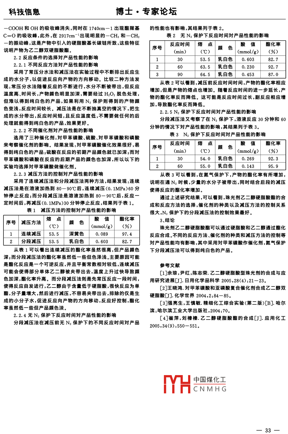 科技信息博士·專家論壇珠光劑乙二醇硬脂酸酯的合成研究沈陽師范大學(xué)化生學(xué)院王明俊孫秋菊辛士剛武士威段紀(jì)東[摘要]本文采用乙二醇和硬脂酸在酸性催化劑的作用下制備了乙二醇硬脂酸酯珠光劑,并通過熔點(diǎn)、酯化率和紅外光譜表征了產(chǎn)品的結(jié)構(gòu)探討了實(shí)施方法、催化劑的種類以及減壓法的控制等條件對(duì)合成的影響結(jié)果表明:以對(duì)甲苯磺酸作催化劑,減壓法反應(yīng)溫度低,酯化率高。同時(shí)在氮?dú)獗Wo(hù)下分段減壓法的控制更優(yōu)化,可以得到純白色的產(chǎn)品。[關(guān)鍵詞]珠光劑乙二醇硬脂酸酯合成乙二醇硬脂酸酯是一種能賦予產(chǎn)品珍珠般光澤的助劑,同1.3產(chǎn)品的結(jié)構(gòu)分析時(shí)它對(duì)頭發(fā)也有一定的調(diào)節(jié)作用。珠光的產(chǎn)生是由于乙二醇硬1.3.1酯化率的測(cè)定脂酸酯它不僅能增加產(chǎn)品的美感和吸引力,還有遮光作用,從而采用氫氧化鉀作標(biāo)定溶液,濃度為0.184mol/L和避免因陽光照射而產(chǎn)生變質(zhì)。它是化妝品行業(yè)中重要的添加0.0184mol/L,酚酞指示劑為1.0%的乙醇溶液。測(cè)定時(shí)準(zhǔn)確稱劑,可在香波浴液等洗滌用品中作為珠光劑使用。乙二醇單硬取產(chǎn)品1.000g放入錐形瓶中,加入乙醇70ml,加熱使其洛解脂酸酯和乙二醇雙硬睸酸酯都能產(chǎn)生很好的珠光,據(jù)介紹乙二后保溫情況下用氫氧化鉀溶液滴定至微紅,并維持30s不褪色醇雙硬脂酸酯比乙二醇單硬脂酸酯的性能好。工業(yè)品乙二醇硬即為終點(diǎn)。每個(gè)樣品均標(biāo)定3次,求平均值。然后采用下列公式脂酸酯是單酯和雙酯的混合物。傳統(tǒng)的合成工藝是由乙二醇與計(jì)算產(chǎn)品的酯化率硬脂酸常壓下合成,為了避免反應(yīng)溫度高(150-210℃)帶來的氧化嚴(yán)重、色澤深的不足,常采用氮?dú)獗Wo(hù),同時(shí)對(duì)于色澤較深初始酸值一終點(diǎn)酸值的產(chǎn)品,需要經(jīng)過脫色處理,但也難以得到純白的產(chǎn)品-3。本酯化率%=X100文比較了常壓分水法和減壓排水法對(duì)產(chǎn)品合成的影響,探討了初始酸值(本實(shí)驗(yàn)中反應(yīng)物的初始酸值為3.49mmol/g)反應(yīng)方法、催化劑的種類、減壓時(shí)間等條件對(duì)合成的影響,制備出了色澤純白的乙二醇硬脂酸酯。1.3.2熔點(diǎn)的測(cè)定實(shí)驗(yàn)部分采用B型管測(cè)定法測(cè)定了產(chǎn)品的熔點(diǎn),每個(gè)樣品測(cè)定三1.1藥品和儀器次,誤差不超過0.5℃,求平均值。乙二醇、硬脂酸、對(duì)甲苯磺酸等均為分析純,產(chǎn)地:國(guó)藥集團(tuán)1.3.3產(chǎn)物結(jié)構(gòu)的表征儀器試劑有限公司。呆用的儀器主要有三囗燒瓶、分水器和真空產(chǎn)品的結(jié)構(gòu)表征通過美國(guó)熱電公司的 Nicolet380FT-IR泵等紅外光譜儀進(jìn)行了結(jié)構(gòu)分析,樣品采用KBr壓片1.2實(shí)驗(yàn)過程2、結(jié)果與討論在裝有攪拌器和溫度計(jì)的三口燒中加入硬脂酸10.000g2.1產(chǎn)品的結(jié)構(gòu)和性能分析乙二醇27m和催化劑0.100g,加熱溶液到80-90℃后,反應(yīng)乙二醇硬脂酸酯是通過硬脂酸與乙二醇在酸性催化劑作用定時(shí)間后,減壓(0.MPa)30分鐘停止反應(yīng),趁熱倒出得粗產(chǎn)下反應(yīng)制得。反應(yīng)方程式如下:品。將粗產(chǎn)品反復(fù)用熱水洗滌,除去未反應(yīng)的乙二醇和催化劑,2C17 H35 COOHHOCH, CH,OH C17 H3s得到純品COOCH2CH2OOCC17H35為了探討反應(yīng)條件對(duì)產(chǎn)品性能的影響,比較了不同的實(shí)驗(yàn)產(chǎn)品之一乙二醇雙硬臏酸酯和反應(yīng)物硬脂酸的紅外光譜如方法和催化劑對(duì)合成的影響,并詳細(xì)研究了減壓法的控制條件。圖1和圖2所示:圖1硬脂酸的紅外譜圖圖2乙二醇雙硬脂酸酯的紅外譜圖1中國(guó)煤化工比較反應(yīng)物硬脂酸和反應(yīng)產(chǎn)物的紅外譜圖可以看到:在硬OH的CNMHG了羧羰基C=O的吸收峰;脂酸的紅外譜圖(圖1)中2500~3300cm-1出現(xiàn)一COOH和而在產(chǎn)物的紅外譜圖(圖2)中可以發(fā)現(xiàn)在2500~3300cm-1的甚金項(xiàng)目:國(guó)家“十一五”科技支撐計(jì)劃項(xiàng)目(項(xiàng)目號(hào)2006BAB09B07)資助項(xiàng)目作者簡(jiǎn)介:王明俊,(1984-),男,沈陽師范大學(xué)化學(xué)與生命科學(xué)學(xué)院應(yīng)用化學(xué)專業(yè)科技信息博士·專家論壇COOH和OH的吸收峰消失,同時(shí)在1740cm-1出現(xiàn)酯羰基的性能也有影響,其結(jié)果列于表2。C=O的吸收峰,此外,在2917cm-1出現(xiàn)明顯的一CH3和一CH表2無N2保護(hù)下反應(yīng)時(shí)間對(duì)產(chǎn)品性能的影響的振動(dòng)峰,這是產(chǎn)物中引入的硬脂酸基長(zhǎng)碳鏈所致,這些特征說明產(chǎn)物為乙二醇雙硬脂酸酯。序號(hào)反應(yīng)時(shí)間熔點(diǎn)顏色毆值|酯化率(℃)(mmo/g)(%)2.2反應(yīng)條件的選擇對(duì)產(chǎn)品性能的影響55乳白色0.6082.72.2.1不同反應(yīng)方法對(duì)產(chǎn)品性能的影響263.5乳白色0.23092.7采用了常壓分水法和減壓法在實(shí)驗(yàn)過程中不斷排出反應(yīng)生645乳白色0.45387成的水分子,以促進(jìn)反應(yīng)向產(chǎn)物的方向移動(dòng)。比較二種方法發(fā)從表2可以看到,減壓前反應(yīng)時(shí)間時(shí)間,產(chǎn)物的酯化率相應(yīng)現(xiàn):常壓分水法隨著反應(yīng)的不斷進(jìn)行,水分不斷被帶出,但反應(