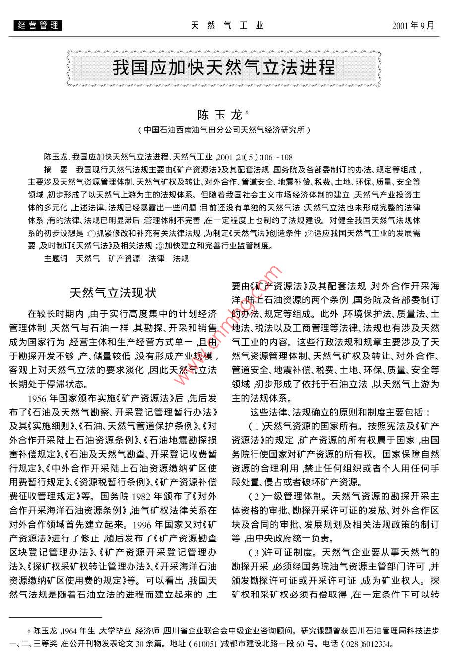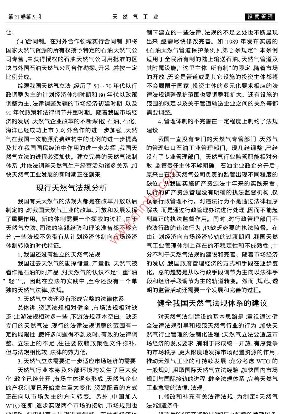 經(jīng)營管理天然氣工業(yè)2001年9月我國應(yīng)加快天然氣立法進程陳玉龍*(中國石油西南油氣田分公司天然氣經(jīng)濟研究所)陳玉龍.我國應(yīng)加快天然氣立法進程.天然氣工業(yè)2001 21(5):106~ 108摘要我國現(xiàn)行天然氣法規(guī)主要由《礦產(chǎn)資源法》及其配套法規(guī)國務(wù)院及各部委制訂的辦法、規(guī)定等組成,主要涉及天然氣資源管理體制、天然氣礦權(quán)及轉(zhuǎn)讓、對外合作、管道安全、地震補償、稅費、土地、環(huán)保、質(zhì)量、安全等領(lǐng)域初步形成了以天然氣上游為主的法規(guī)體系。但隨著我國社會主義市場經(jīng)濟體制的建立,天然氣產(chǎn)業(yè)投資主體的多元化上述法律、法規(guī)已經(jīng)暴露出一些問題:目前還沒有單獨的天然氣法天然氣立法也未形成完整的法律體系有的法律、法規(guī)已明顯滯后管理體制不完善在-定程度上也制約了法規(guī)建設(shè)。對健全我國天然氣法規(guī)體系的初步設(shè)想是①抓緊修改和補充有關(guān)法律法規(guī)為制定《天然氣法》創(chuàng)造條件;②適應(yīng)我國天然氣工業(yè)的發(fā)展需要及時制訂《天然氣法》及相關(guān)法規(guī)③加快建立和完善行業(yè)監(jiān)管制度。主題詞天然氣礦產(chǎn)資源法律法規(guī)要由《礦產(chǎn)資源法》及其配套法規(guī),對外合作開采海天然氣立法現(xiàn)狀洋、陸上石油資源的兩個條例,國務(wù)院及各部委制訂在較長時期內(nèi),由于實行高度集中的計劃經(jīng)濟的辦法、規(guī)定等組成。此外環(huán)境保護法、質(zhì)量法、土.管理體制,天然氣與石油一樣其勘探、開采和銷售地法、稅法以及工商管理等法律、法規(guī)也有涉及天然成為國家行為經(jīng)營主體和生產(chǎn)經(jīng)營方式單一,且由氣工業(yè)的內(nèi)容。這些行政法規(guī)和規(guī)章主要涉及了天于勘探開發(fā)不夠產(chǎn)、儲量較低沒有形成產(chǎn)業(yè)規(guī)模,然氣資源管理體制、天然氣礦權(quán)及轉(zhuǎn)讓、對外合作、客觀.上對天然氣立法的要求淡化,因此天然氣立法管道安全、地震補償、稅費、土地、環(huán)保、質(zhì)量、安全等長期處于停滯狀態(tài)。領(lǐng)域初步形成了依托于石油立法,以天然氣上游為1956年國家頒布實施《礦產(chǎn)資源法》后,先后發(fā)主的法規(guī)體系。布了《石油及天然氣勘察、開采登記管理暫行辦法》這些法律、法規(guī)確立的原則和制度主要包括:及其《實施細則》《石油、天然氣管道保護條例》《對( 1 )天然氣資源的國家所有。按照憲法及《礦產(chǎn)外合作開采陸上石油資源條例》《石油地震勘探損資源法》的規(guī)定礦產(chǎn)資源的所有權(quán)屬于國家,由國害補償規(guī)定》、《石油及天然氣勘查、開采登記收費暫務(wù)院行使國家對礦 產(chǎn)資源的所有權(quán)。國家保障自然行規(guī)定》《中外合作開采陸上石油資源繳納礦區(qū)使資源的合理利用禁止任何組織或者個人用任何手用費暫行規(guī)定》《資源稅暫行條例》《礦產(chǎn)資源補償段處置、侵占或者破壞礦產(chǎn)資源。費征收管理規(guī)定》等。國務(wù)院1982年頒布了《對外(2)-級管理體制。天然氣資源的勘探開采主合作開采海洋石油資源條例》油氣礦權(quán)法律關(guān)系在體資格的審批、勘探開采許可證的發(fā)放、對外合作區(qū)對外合作領(lǐng)域首先建立起來。1996 年國家又對《礦塊及合同的審批、發(fā)展規(guī)劃及相關(guān)法規(guī)政策的制訂產(chǎn)資源法》進行了修正隨后發(fā)布了《礦產(chǎn)資源勘查等,由中央政府統(tǒng)一負責。區(qū)塊登記管理辦法》《礦產(chǎn)資源開采登記管理辦(3 )許可證制度。天然氣企業(yè)要從事天然氣的法》《探礦權(quán)采礦權(quán)轉(zhuǎn)讓管理辦法》《開采海洋石油勘探開采必須經(jīng)國務(wù)院油氣資源主管部門許可并資源繳納礦區(qū)使用費的規(guī)定》等??梢钥闯?,我國天頒發(fā)勘探許可證或開采許可證,成為礦業(yè)權(quán)人。探然氣法規(guī)是隨著石油立法的進程而建立起來的,主礦權(quán)和采礦 權(quán)必須有償取得,在一定條件下可以轉(zhuǎn)*陳玉龍,1964年生大學畢業(yè)經(jīng)濟師四川省企業(yè)聯(lián)合會中級企業(yè)咨詢顧問。研究課題曾獲四川石油管理局科技進步一、二、三等獎在公開刊物發(fā)表論文30余篇。地址( 610051 )成都市建設(shè)北路一段60號。電話( 028 6012334。第21卷第5期天然氣工業(yè)經(jīng)營管理讓。制下建立的一些法律、法規(guī)的不足之處也不斷顯現(xiàn)( 4合同制。在對外合作領(lǐng)域?qū)嵭泻贤?即將出來亟需盡快修改完善。如:1989年發(fā)布實施的國家天然氣資源的所有權(quán)授予特定的石油天然氣公《石油天然氣管道保護條例》,第2條規(guī)定":本條例司專營,由獲得授權(quán)的石油天然氣公司用批準的區(qū)適用于全民所有制的陸上輸送石油、天然氣管道及塊與外國石油天然氣公司合作勘探、開采,并按一定其附屬設(shè)施。”這里主體所有制”的限定隨著市場比例分成。的開放無論是管道或是其它設(shè)施的投資主體都將綜觀我國天然氣立法經(jīng)歷了50~ 70年代以行不 會局限于國家,投資主體的多元化要求相應(yīng)的法政調(diào)整為主的計劃經(jīng)濟體制時