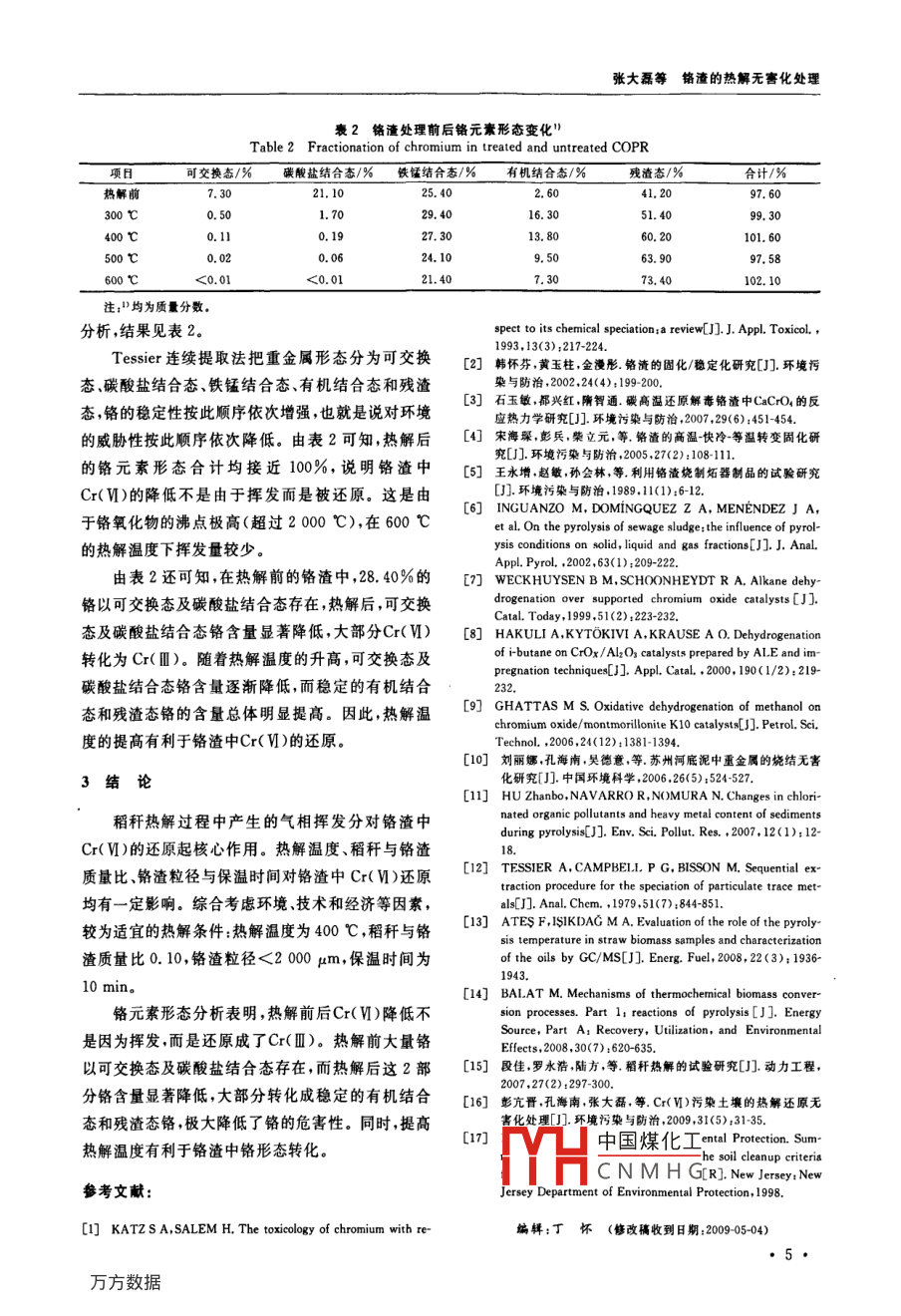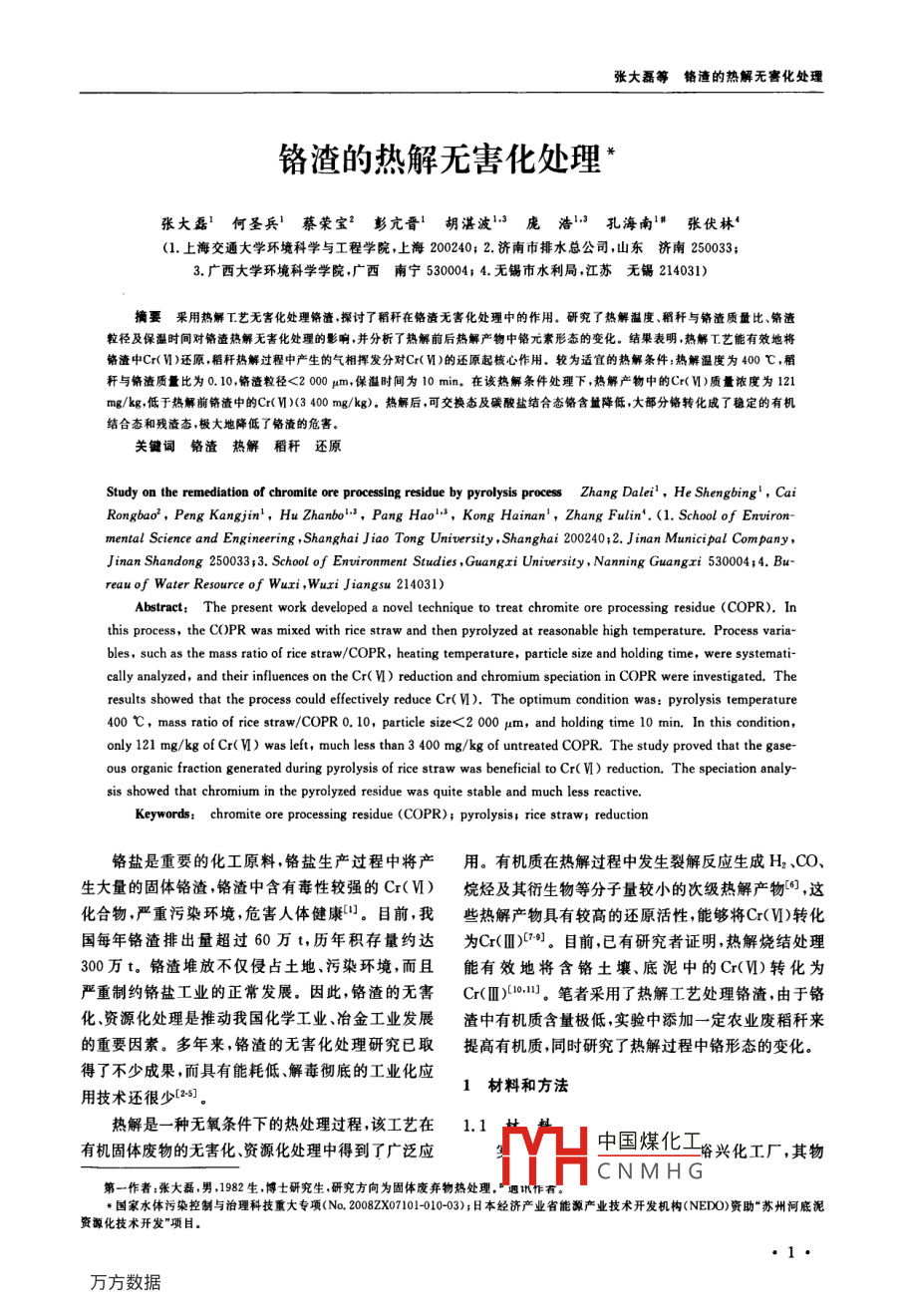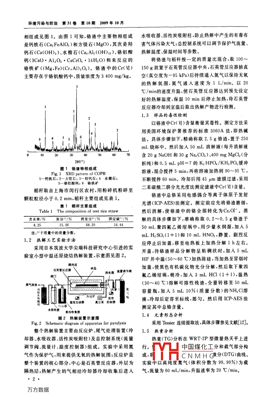 張大磊等鉻渣的熱解無害化處理鉻渣的熱解無害化處理*張大磊何圣兵'蔡榮寶’彭亢晉胡湛波13龐浩13孔海南1張伏林(1.上海交通大學環(huán)境科學與工程學院,上海200240;2.濟南市排水總公司,山東濟南250033;3.廣西大學環(huán)境科學學院,廣西南寧530004;4,無錫市水利局,江蘇無錫214031)摘要采用熱解工藝無害化處理鉻渣探討了稻稈在鉻渣無害化處理中的作用。研究了熱解溫度稻稈與鉻渣質(zhì)量比、鉻渣粒徑及保溫時間對鉻渣熱解無害化處理的影響,并分析了熱解前后熱解產(chǎn)物中鉻元素形態(tài)的變化。結(jié)果表明,熱解T藝能有效地將鉻渣中Cr(Ⅵ)還原,稻稈熱解過程中產(chǎn)生的氣相揮發(fā)分對Cr(Ⅵ)的還原起核心作用。較為適宜的熱解條件:熱解溫度為400℃,稻桿與鉻渣質(zhì)量比為0.10,鉻渣粒徑<2000μm,保溫時間為10min,在該熱解條件處理下,熱解產(chǎn)物中的Cr(Ⅵ)質(zhì)量濃度為121mg/kg,低于熱解前鉻渣中的Cr(Ⅵ)(3400mg/kg),熱解后,可交換態(tài)及碳酸鹽結(jié)合態(tài)鉻含量降低,大部分鉻轉(zhuǎn)化成了穩(wěn)定的有機結(jié)合態(tài)和殘渣態(tài),極大地降低了鉻渣的危害關鍵詞鉻渣熱解稻稈還原Study on the remediation of chromite ore processing residue by pyrolysis process Zhang Dalei, He Shengbing,CaiRongbao, Peng Kangjin, Hu Zhanbo, Pang Hao, Kong Hainan, Zhang Fulin'(1. School of Environ-Jinan Shandong 250033; 3. School of Environment Studies, Guangri University, Nanning guangri 530004: 4. Bureau of Water Resource of wuri, Wuri Jiangsu 214031)Abstract: The present work developed a novel technique to treat chromite ore processing residue (COPR). Inthis process, the COPR was mixed with rice straw and then pyrolyzed at reasonable high temperature. Process varia-bles, such as the mass ratio of rice straw/COPR, heating temperature, particle size and holding time, were systemati-cally analyzed, and their influences on the Cr( V) reduction and chromium speciation in COPR were investigated. Theresults showed that the process could effectively reduce Cr( V). The optimum condition was: pyrolysis temperature400C, mass ratio of rice straw/COPR 0. 10, particle size<2 000 um, and holding time 10 min. In this conditiononly 121 mg/kg of Cr(V)was left, much less than 3 400 mg/kg of untreated COPR. The study proved that the gase-ous organic fraction generated during pyrolysis of rice straw was beneficial to Cr( V)reduction. The speciation analy-sis showed that chromium in the pyrolyzed residue was quite stable and much less reactive.Keywords: chromite ore processing residue(COPR); pyrolysis; rice straw; reduction鉻鹽是重要的化工原料鉻鹽生產(chǎn)過程中將產(chǎn)用。有機質(zhì)在熱解過程中發(fā)生裂解反應生成H2、CO生大量的固體鉻渣,鉻渣中含有毒性較強的Cr(Ⅵ)烷烴及其衍生物等分子量較小的次級熱解產(chǎn)物,這化合物嚴重污染環(huán)境危害人體健康。目前,我些熱解產(chǎn)物具有較高的還原活性,能夠?qū)r(Ⅵ)轉(zhuǎn)化國每年鉻渣排出量超過60萬t,歷年積存量約達為Cr(Ⅲ)0)。目前已有研究者證明,熱解燒結(jié)處理300萬t。鉻渣堆放不僅侵占土地、污染環(huán)境,而且能有效地將含鉻土壤、底泥中的Cr(Ⅵ)轉(zhuǎn)化為嚴重制約鉻鹽工業(yè)的正常發(fā)展。因此鉻渣的無害Cr(Ⅲ)0,1。筆者采用了熱解工藝處理鉻渣,由于鉻化資源化處理是推動我國化學工業(yè)、冶金工業(yè)發(fā)展渣中有機質(zhì)含量極低,實驗中添加一定農(nóng)業(yè)廢稻稈來的重要因素。多年來,鉻渣的無害化處理研究已取提高有機質(zhì)同時研究了熱解過程中鉻形態(tài)的變化得了不少成果,而具有能耗低、解毒徹底的工業(yè)化應1材料和方法用技術還很少熱解是一種無氧條件下的熱處理過程,該工藝在1.1有機固體廢物的無害化資源化處理中得到了廣泛應中國煤化工興化工廠,其物CNMHG第一作者:張大磊,男,1982生,博士研究生,研究方向為固體廢棄物熱處理國家水體污染控制與治理科技重大專項(No.2008ZX07101-010-03);日本經(jīng)濟產(chǎn)業(yè)省能源產(chǎn)業(yè)技術開發(fā)機構(NEDO)資助“蘇州河底泥資源化技術開發(fā)項目。環(huán)境污染與防治第31卷第10期2009年10月相組成見圖1。由圖1可知,鉻渣中主要物相組成水吸收器、活性炭吸附柱,防止熱解中產(chǎn)生的有毒有是鈣鐵石(Ca2FeA|O3)和方鎂石(MgO),其次是羥害氣體污染大氣;總控制系統(tǒng)可以調(diào)節(jié)保護氣流量、鈣石(Ca(OH)2)、水榴石(Ca3Al2(OH)12)、鉻鋁酸熱解溫度、保溫時間等參數(shù)。鈣(3CaO·A12O23· CaCaO4·14H2O)和未反應的將鉻渣與稻稈按一定的質(zhì)量比混合,取100~鉻鐵礦(Mg,Fe)(Cr,A)2O4)。鉻渣中的Cr(Ⅵ)150g放置于石英管反應器中央,石英管反應器抽真主要存在于鉻鋁酸鈣中,質(zhì)量濃度為3400mg/kg???真空度為-95kPa)后持續(xù)通人氮氣以保持無氧的熱解氛圍,氮氣通入速度為1L/min。以20℃/min的速度升溫,使石英管反應器達到預先設定好的熱解溫度,保溫10min后停止加熱,待石英管反應器冷卻到室溫后取出熱解產(chǎn)物進行檢測。1.3樣品的毒性檢測以鉻渣中Cr(Ⅵ)含量衡量其毒性。測定方法采用美國環(huán)境保護署推薦的標準3060A法,即熱堿法。具體步驟如下:精確稱取2.5g鉻渣,置于250M水wmL燒杯中。然后加入50mL消解液(每升消解液含20 g Naoh和30)、400 mg MgCI2(分析純)和0.5mLpH=7的K2HPO4/KH2PO緩沖圖1鉻渣物相組成Fig 1 XRD pattern of COPR溶液,混合攪拌5min,再將溶液加熱到90~95℃1—鈣鐵石;2-方鎂石;3—羥鈣石;4水榴石;不斷攪拌60mn。冷卻