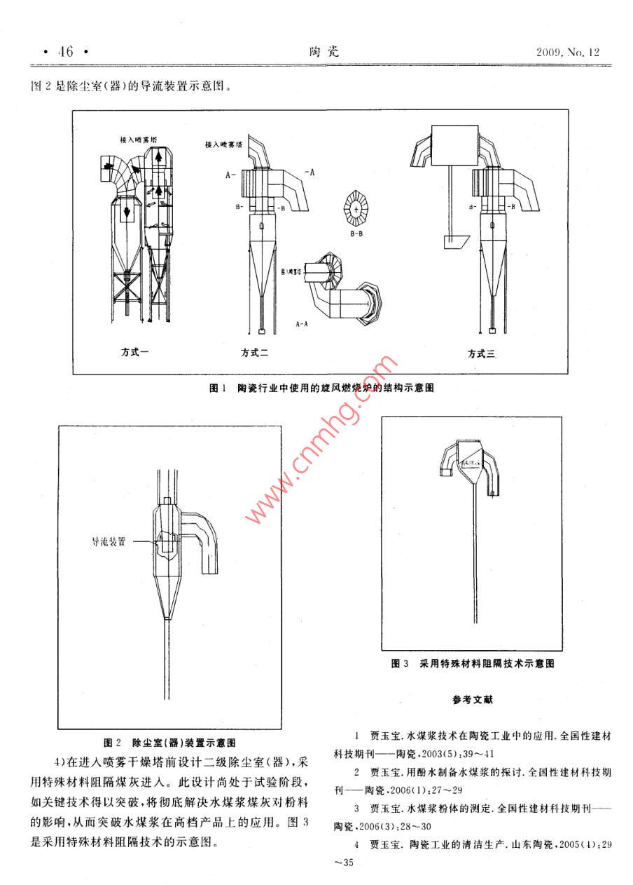 陶瓷2009.No.12優(yōu)質(zhì)水煤漿的研發(fā)與燃燒設(shè)備的技術(shù)改造薛麗峰賈玉寶(Ⅰ洛陽(yáng)晶久玻璃制品有限公司河南洛陽(yáng)471003)(2江西新明珠建材有限公司江西高安330812)摘要滲花拋光磚粉料、微粉拋光磚的面料生產(chǎn)一般使用重油或是煤氣,成本比較髙,筆者通過(guò)對(duì)水煤漿的理化性能作為研發(fā)重點(diǎn)使之適合作為滲花拋光磚粉料、微粉拋光磚的面料的燃料,從而代替重油或煤氣降低生產(chǎn)成本。為了做到清潔生產(chǎn),優(yōu)化了水煤漿的配方使用合適的添加劑使用全酚水制漿,并按一定的比例添加煤氣站的副產(chǎn)品——煤粉.從而降低生產(chǎn)成本,并對(duì)水煤漿的燃燒設(shè)備進(jìn)行了技術(shù)改造,改善了除塵器除塵效果不佳的狀況取得了很好的效果。關(guān)鍵詞優(yōu)質(zhì)水煤漿研發(fā)除塵器技術(shù)改造Research Develop about the good Water Coal Mixtures and the Technique Reformation in Burnable EquipmentsXuc Lifeng, Jia Yubao(l Luoyang Jingjiu Class Products Co.. Ltd Henan Luoyang 471003)(2 Jiangxi Newpcarl CeramicsBuilding Matcrial Co. Ltd Jiangxi Gaoan, 330812)Abstract:The powder of the permeate brick and the tiny powder brick produce usually uses the heavy oil and the coal gas inceramics industry. the cost is higher. ' This paper to be used as development as a point to the physics and chemistry functionof the water coal mixtures, make of in keeping with the permeate brick and the tiny powder brick. replace the heavy oil orcoal gas thus, lower production cost. For attaining to sweep production, excellent turn the formulation of the water coalmixtures, use a suitable additive to use the whole phenol water, and press the by- product-coal powder, lower productioncost thus. The burnable equipments carried on the technique reformation, improving currently in addition to the dust machine in addition to dust ineffective circumstance, obtain to show the good resultsKey Words: Good water coal mixtures; Research develop; Burnable cquipments; Technique reform水煤漿是一種清潔代油的高技術(shù)液體燃料,它由1優(yōu)質(zhì)水煤漿的研發(fā)與應(yīng)用50%~60%的煤、40%~50%的水和1%的化工添加劑經(jīng)深加工而成,其具有流動(dòng)性好的優(yōu)點(diǎn),燃燒效率高1)優(yōu)化水煤漿的配方,主要是優(yōu)化水煤漿的理化的優(yōu)點(diǎn),已成為陶瓷企業(yè)的能源新趨勢(shì)性能,使之適合高檔拋光磚的生產(chǎn)。重點(diǎn)是:通過(guò)添加水煤漿在陶瓷生產(chǎn)中的應(yīng)用已有十幾年,主要用特殊的添加劑改善水煤漿的理化性能,一是提高水煤于低檔次產(chǎn)品,在高檔產(chǎn)品如拋光磚上的應(yīng)用較少,主漿用煤的灰熔點(diǎn),從而提高水煤漿的最高燃燒溫度,改要是由于水煤漿燃燒后的煤灰不可避免地進(jìn)入到粉料中形成雜質(zhì),從而影響拋光磚的質(zhì)量,其次是水煤漿的善水媒漿的燃燒效果,二是通過(guò)優(yōu)選水煤漿的用媒,加燃燒溫度不高,易形成結(jié)焦。上特殊添加劑中的無(wú)機(jī)離子與煤中的有色離子反應(yīng)水煤漿的燃燒是采用水煤漿旋風(fēng)燃燒爐,經(jīng)除塵改善煤灰的白度,減少煤灰對(duì)產(chǎn)品造成的影響。后由熱風(fēng)管道進(jìn)入噴霧干燥塔。由于水煤漿旋風(fēng)燃燒2)對(duì)水煤漿的生產(chǎn)工藝進(jìn)行優(yōu)化,對(duì)顆粒級(jí)配進(jìn)爐的建造沒有統(tǒng)一的設(shè)計(jì)和施工標(biāo)準(zhǔn),造成旋風(fēng)燃燒行調(diào)整改善水煤漿顆粒的吸附和凝聚特性及顆粒的爐自身的效果不是很理想。同時(shí),除塵室(器)的設(shè)計(jì)填充性質(zhì),提高其堆積率使之達(dá)到合理的粒度分布,存在缺陷,不能有效的旋風(fēng),除塵效果差,雖然有些設(shè)改善水煤漿顆粒的沉降效果,達(dá)到除塵的目的計(jì)了三級(jí)除塵,擴(kuò)大管道的空間,降低煙氣的流速,但3)按一定比例使用煤氣站的副產(chǎn)品——酚水和煤由于熱煙氣的流速較快,除塵效果仍然較差。粉來(lái)制漿,既降低了生產(chǎn)成本,又達(dá)到清潔生產(chǎn)的目的。首先,酚對(duì)人體、水生動(dòng)物及農(nóng)作物都是有害的2009.No.12陶瓷45酚水溶液容易被皮膚吸收,酚蒸氣由呼吸道吸入可引果有條件的話,可以將輸送管道中收集到的無(wú)色的酚起中毒,長(zhǎng)期飲用被酚污染的水,會(huì)引起頭暈、貧血以水和制氣過(guò)程中收集到的棕紅色的酚水分開存放和制及神經(jīng)系統(tǒng)疾病。用濃度高于0.1kg/m3的含酚廢水漿。如無(wú)條件,需在使用解膠劑時(shí)做出適當(dāng)?shù)恼{(diào)整灌溉農(nóng)田時(shí),農(nóng)作物會(huì)減產(chǎn),甚至枯死。其次,煤氣站表2水煤漿的用煤標(biāo)準(zhǔn)及添加劑的要求產(chǎn)生的酚水,要是讓其他企業(yè)來(lái)處理,每噸不少于50序號(hào)性能指標(biāo)性能參數(shù)元的費(fèi)用,煤粉外銷價(jià)要比購(gòu)進(jìn)價(jià)低200~300元/t。別煙煤僅以上兩項(xiàng)費(fèi)用,每噸水煤漿降低100~150元/t。用酚水制備水煤漿,不僅可以處理煤粉、酚水,更重要的123焦渣特性煤熱值( kcal/ kg)是避免了對(duì)環(huán)境造成的污染,同時(shí)給企業(yè)創(chuàng)造了巨大灰分(%)≤18的經(jīng)濟(jì)效益。揮發(fā)分(%)≥284)通過(guò)攻關(guān),選用了A、B、C3種不同產(chǎn)地的煤,硫分(%)≤0.5經(jīng)過(guò)合理的配煤,作為水煤漿的制漿用煤,通過(guò)添加7內(nèi)外水分(%)0.5%的特殊添加劑和1.0