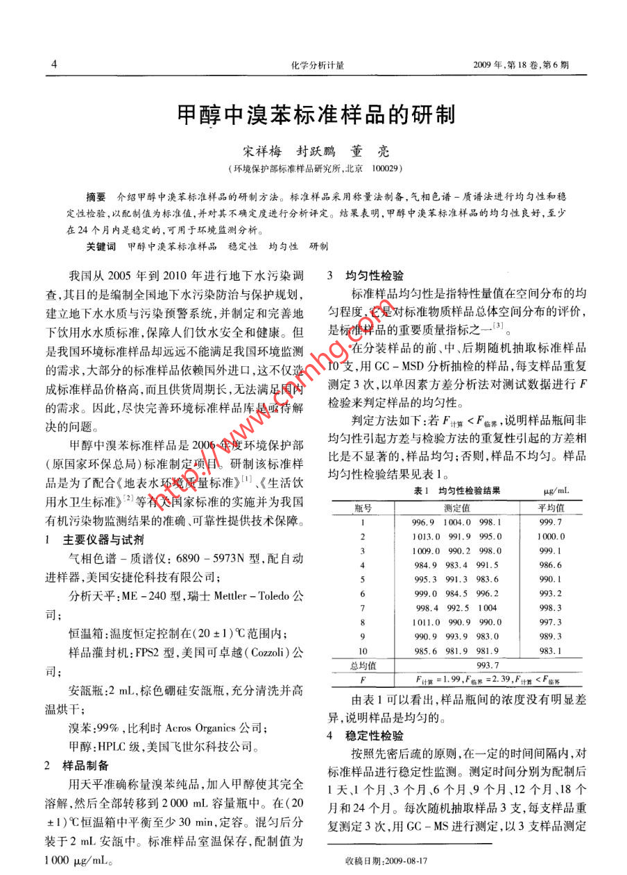 4化學(xué)分析計(jì)量2009年,第18卷,第6期甲醇中溴苯標(biāo)準(zhǔn)樣品的研制宋祥梅封躍鵬董亮(環(huán)境保護(hù)部標(biāo)準(zhǔn)樣品研究所,北京00029)摘要介紹甲醇中渙苯標(biāo)準(zhǔn)樣品的研制方法。 標(biāo)準(zhǔn)樣品采用稱量法制備,氣相色譜-質(zhì)譜法進(jìn)行均勻性和穩(wěn)定性檢驗(yàn),以配制值為標(biāo)準(zhǔn)值,并對其不確定度進(jìn)行分析評定。結(jié)果表明,甲醇中澳苯標(biāo)準(zhǔn)樣品的均勻性良好,至少在24個(gè)月內(nèi)是穩(wěn)定的,可用于環(huán)境監(jiān)測分析。關(guān)鍵詞甲醇中溴苯標(biāo)準(zhǔn)樣品 穩(wěn)定性均勻性研制我國從2005年到2010年進(jìn)行地下水污染調(diào)3均勻性檢驗(yàn)查,其目的是編制全國地下水污染防治與保護(hù)規(guī)劃,標(biāo)準(zhǔn)樣品均勻性是指特性量值在空間分布的均建立地下水水質(zhì)與污染預(yù)警系統(tǒng),并制定和完善地勻程度 ,它是對標(biāo)準(zhǔn)物質(zhì)樣品總體空間分布的評價(jià),下飲用水水質(zhì)標(biāo)準(zhǔn),保障人們飲水安全和健康。但是標(biāo)準(zhǔn)樣品的重要質(zhì)量指標(biāo)之一門。是我國環(huán)境標(biāo)準(zhǔn)樣品卻遠(yuǎn)遠(yuǎn)不能滿足我國環(huán)境監(jiān)測在分裝樣品的前、中、后期隨機(jī)抽取標(biāo)準(zhǔn)樣品的需求,大部分的標(biāo)準(zhǔn)樣品依賴國外進(jìn)口,這不僅造10支,用CC-MSD分析抽檢的樣品,每支樣品重復(fù)成標(biāo)準(zhǔn)樣品價(jià)格高,而且供貨周期長,無法滿足國內(nèi)測定3次,以單因素方差分析法對測試數(shù)據(jù)進(jìn)行F的需求。因此,盡快完善環(huán)境標(biāo)準(zhǔn)樣品庫是亟待解檢驗(yàn)來判定樣品的均勻性。判定方法如下:若Ft算< F臨界,說明樣品瓶間非決的問題。甲醇中溴苯標(biāo)準(zhǔn)樣品是2006年度環(huán)境保護(hù)部均勻性引起方差與檢驗(yàn)方法的重復(fù)性引起的方差相(原國家環(huán)??偩?標(biāo)準(zhǔn)制定項(xiàng)目。研制該標(biāo)準(zhǔn)樣比是不顯著的,樣品均勻;否則,樣品不均勻。樣品品是為了配合《地表水環(huán)境質(zhì)量標(biāo)準(zhǔn)》”.《生活飲均勻性檢驗(yàn)結(jié)果見表1。表1均勻性檢驗(yàn)結(jié)果μg/mL用水衛(wèi)生標(biāo)準(zhǔn)》(2等有關(guān)國家標(biāo)準(zhǔn)的實(shí)施并為我國瓶號測定值平均值有機(jī)污染物監(jiān)測結(jié)果的準(zhǔn)確、可靠性提供技術(shù)保障。996.9 1004.0 998. 1999.7主要儀器與試劑1013.0 991.9 995.01000.1009.0 990.2 998.0999. 1氣相色譜-質(zhì)譜儀: 6890 - 5973N型,配自動(dòng)984.9 983.4 991.5986. 6.進(jìn)樣器,美國安捷倫科技有限公司;95.3 991.3 983.6990. 1分析天平:ME -240型,瑞士Metler - Toledo公999.0 984.5 996.2993. 2998.4 992.5 1004998.3司;1011.0 990.9 990.0997. 3恒溫箱:溫度恒定控制在(20土1)C范圍內(nèi);990.9 993.9 983.0989. 3樣品灌封機(jī):FPS2型,美國可卓越(Cozzoli)公10985.6 981.9 981.9983.1總均值993. 7FF計(jì)算=1.99,Fex-=2.39,Fm