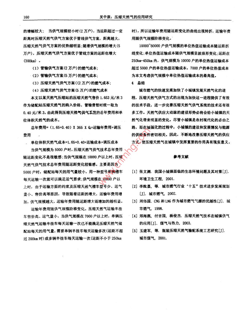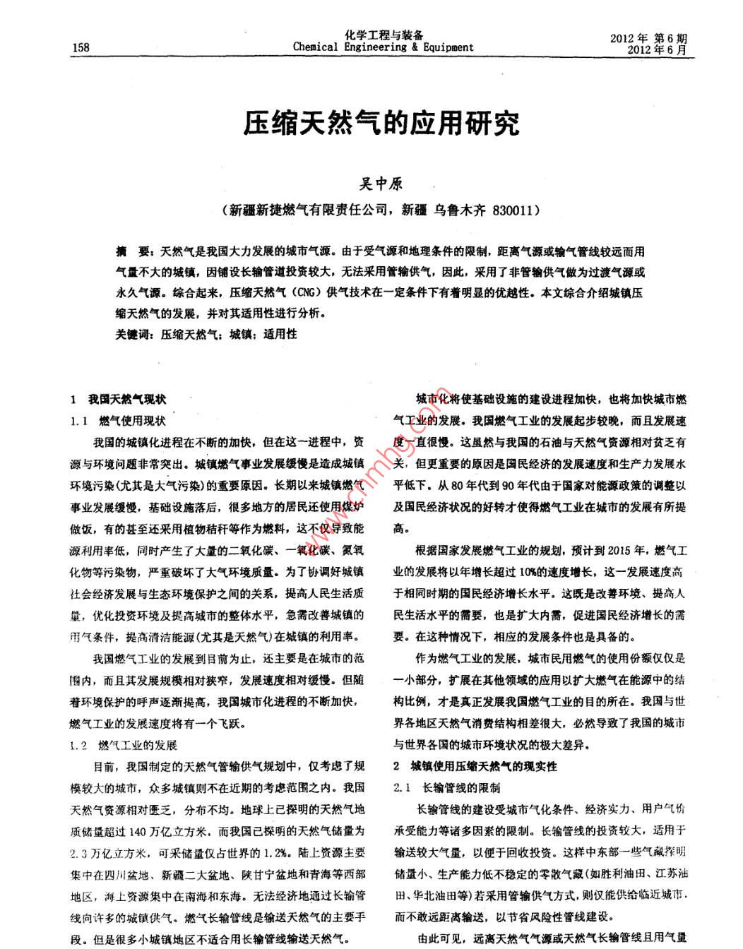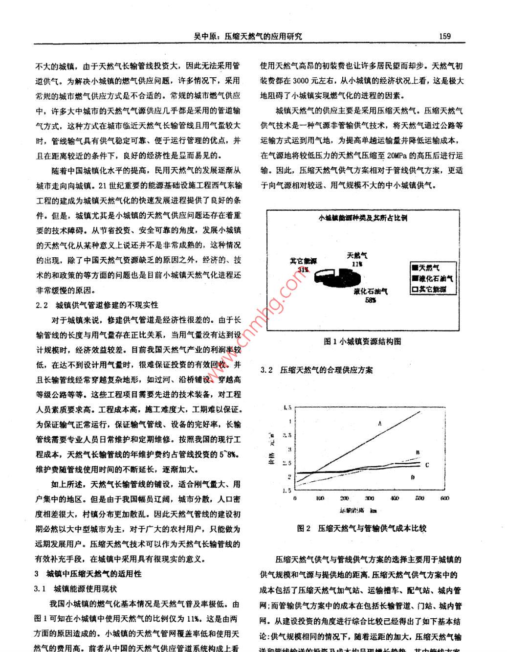 化學工程與裝備2012年第6期Chemical Engineering& equipment2012年6月壓縮天然氣的應用研究吳中原(新疆新捷燃氣有限責任公司,新疆烏魯木齊830011)摘要:天然氣是我國大力發(fā)展的城市氣源。由于受氣源和地理條件的限制,距離氣源或輸氣管線較遠面用氣量不大的城鎮(zhèn),因鋪設(shè)長輸管道投資較大,無法采用管輸供氣,因此,采用了非管輸供氣做為過渡氣源或永久氣源。綜合起來,壓縮天然氣(CNG)供氣技術(shù)在一定條件下有著明顯的優(yōu)越性。本文綜合介紹城鎮(zhèn)壓縮天然氣的發(fā)展,并對其適用性進行分析。關(guān)鍵詞:壓縮天然氣;城鎮(zhèn);適用性我國天然氣現(xiàn)狀城市化將使基礎(chǔ)設(shè)施的建設(shè)進程加快,也將加快城市燃1.1燃氣使用現(xiàn)狀氣工業(yè)的發(fā)展。我國燃氣工業(yè)的發(fā)展起步較晚,而且發(fā)展速我國的城鎮(zhèn)化進程在不斷的加快,但在這一進程中,資度一直很慢。這雖然與我國的石油與天然氣資源相對貧乏有源與環(huán)境問題非常突出。城鎮(zhèn)燃氣事業(yè)發(fā)展緩慢是造成城鎮(zhèn)關(guān),但更重要的原因是國民經(jīng)濟的發(fā)展速度和生產(chǎn)力發(fā)展水環(huán)境污染(尤其是大氣污染)的熏要原因。長期以來城鎮(zhèn)燃氣平低下。從80年代到90年代由于國家對能源政策的調(diào)整以事業(yè)發(fā)展緩慢,基礎(chǔ)設(shè)施落后,很多地方的居民還使用煤爐及國民經(jīng)濟狀況的好轉(zhuǎn)才使得燃氣工業(yè)在城市的發(fā)展有所提做飯,有的甚至還采用植物秸稈等作為燃料,這不僅導致能高。源利用率低,同時產(chǎn)生了大量的二氧化碳、一氧化碳、氮氧根據(jù)國家發(fā)展燃氣工業(yè)的規(guī)劃,預計到2015年,燃氣工化物等污染物,嚴重破壞了大氣環(huán)境質(zhì)量。為了協(xié)調(diào)好城鎮(zhèn)業(yè)的發(fā)展將以年增長超過10%的速度增長,這一發(fā)展速度高社會經(jīng)濟發(fā)展與生態(tài)環(huán)境保護之間的關(guān)系,提高人民生活質(zhì)于相同時期的國民經(jīng)濟增長水平。這既是改善環(huán)境、提高人量,優(yōu)化投資環(huán)境及提高城市的整體水平,急需改善城鎮(zhèn)的民生活水平的需要,也是擴大內(nèi)需,促進國民經(jīng)濟增長的需用氣條件,提高清潔能源(尤其是天然氣)在城鎮(zhèn)的利用率。要。在這種情況下,相應的發(fā)展條件也是具備的。我國燃氣工業(yè)的發(fā)展到目前為止,還主要是在城市的范作為燃氣工業(yè)的發(fā)展,城市民用燃氣的使用份額僅僅是圍內(nèi),而且其發(fā)展規(guī)模相對狹窄,發(fā)展速度相對緩慢。但隨小部分,擴展在其他領(lǐng)域的應用以擴大燃氣在能源中的結(jié)著環(huán)境保護的呼聲逐漸提高,我國城市化進程的不斷加快構(gòu)比例,才是真正發(fā)展我國燃氣工業(yè)的目的所在。我國與世燃氣工業(yè)的發(fā)展速度將有一個飛躍。界各地區(qū)天然氣消費結(jié)構(gòu)相差很大,必然導致了我國的城市1.2燃氣工業(yè)的發(fā)展與世界各國的城市環(huán)境狀況的極大差異。目前,我國制定的天然氣管輸供氣規(guī)劃中,僅考慮了規(guī)2城鎮(zhèn)使用壓縮天然氣的現(xiàn)實性模較大的城市,眾多城鎮(zhèn)則不在近期的考慮范圍之內(nèi)。我國2.1長輸管線的限制天然氣資源相對匱乏,分布不均。地球上已探明的天然氣地長輸管線的建設(shè)受城市氣化條件、經(jīng)濟實力、用戶氣價質(zhì)儲量超過140萬億立方米,而我國已探明的天然氣儲量為承受能力等諸多因素的限制。長輸管線的投資較大,適用于2.3萬億立方米,可釆儲量僅占世界的1.丶%。陸上資源主要輸送較大氣量,以便于回收投資。這樣中東部一些氣藏探明集中在四川盆地、新疆二大盆地、陜甘寧盆地和青海等西部儲量小、生產(chǎn)能力低不穩(wěn)定的零散氣藏(如勝利油田、江蘇油地區(qū),海上資源集中在南海和東海。無法經(jīng)濟地通過長輸管田、華北油田等)若采用管輸供氣方式,則僅能供給臨近城市線向許多的城鎮(zhèn)供氣、燃氣長輸管線是輸送天然氣的主要手而不敢遠距離輸送,以節(jié)省風險性管線建設(shè)。段。但是很多小城鎮(zhèn)地區(qū)不適合用長輸管線輸送天然氣。由此可見,遠離天然氣氣源或天然氣長輸管線且用氣量吳中原:壓縮天然氣的應用研究159不大的城鎮(zhèn),由于天然氣長輸管線投資大,因此無法采用管使用天然氣高昂的初裝費也讓許多居民望而卻步。天然氣初道供氣。為解決小城鎮(zhèn)的燃氣供應問題,許多情況下,采用裝費都在3000元左右,從小城鎮(zhèn)的經(jīng)濟狀況上看,這是極大常規(guī)的城市燃氣供應方式是不合適的。常規(guī)的城市燃氣供應地阻礙了小城鎮(zhèn)實現(xiàn)燃氣化的進程的因素。中,許多大中城市的天然氣氣源供應幾乎都是采用的管道輸城鎮(zhèn)天然氣的供應主要是采用壓縮天然氣。壓縮天然氣氣方式,這種方式在城市臨近天然氣長輸管線且用氣量較大供氣技術(shù)是一種氣源非管輸供氣技術(shù),將天然氣通過公路等時,管線輸氣具有供氣穩(wěn)定可靠、便于運行管理的優(yōu)點,并運輸方式運到用氣地,為提高單趟運輸量并降低運輸成本,且在距離較近的條件下,良好的經(jīng)濟性是顯而易見的在氣源地將較低壓力的天然氣壓縮至2MPa的高壓后進行運隨著中國城鎮(zhèn)