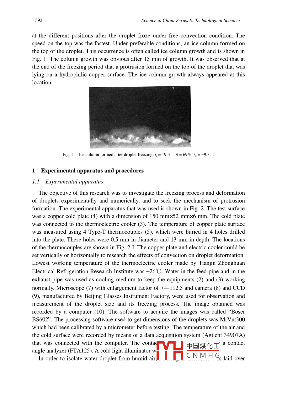 Science in China Series E: Technological Sciences 2006 Vol.49 No.5 590- -600DOI: 10.001/51431-006-2017-yDeformation of freezing water dropletson a cold copper surface .WANG Jieteng, LIU Zhongliang, GOU Yujun, ZHANG Xinhua& CHENG ShuiyuanCollege of Environmental and Energy Engineering, Beiing University of Technology, Beiing 100022, ChinaCorrespondence should be addressed to Liu Zhongliang (email: liuzhl@bjut.edu.cn)Received March 22, 2006; accepted July 15, 2006Abstract Freezing processes of water and peanut oil droplets on a cold surface areinvestigated in this paper. We observed during our experiments that the base surface of awater droplet that is in direct contact with the cold surface keeps its original shape, but theother part of the droplet shows an obvious growth along the direction normal to the basesurface. One small protrusion appears on the top of the water droplet at the end of thefreezing process. The experimental observations also show that no obvious shape changehappens during the freezing of peanut oil droplets. It is postulated that the effects ofsurface tension and volume dilatation resulted from liquid-to-solid phase change cause theshape change and protrusions formation. Based on this postulation, a physical andmathematical model is developed. The results of the model of a water droplet s freezingprocess correspond with our experimental observations. The observed phenomenon thatfrost-growth speed on the protrusion is higher than that on the other part of the waterdroplet is also analyzed.Keywords: frost, droplet, freezing, protrusion formation, surface tension.Frost formation is a very common phenomenon in cryogenic, refrigeration, and airconditioning engineering. The temperature of heat exchange units will undergo a graduallydecreasing process during their thermal defrosting process. When humid air comes in contactwith a cold wall whose temperature is below the dew point of air, vapor contained in thehumid air will condensate and deposit on this cold surface in the form of small water droplets.Continuous condensation of vapor and glomeration of the small droplets will produce largerwater droplets. Meanwhile, when the temperature of the cold surface is lower than thefreezing point of water, the water droplets formed on the cold surface will freeze.Subsequently, frost will deposit on these frozen droplets. Frost deposition on heat transfersurfaces will produce a series of negative effects on heat transfer enuinment For example,heat transfer resistance and pressure loss will inc中國(guó)煤化工at transferperformance. In addition, the air passagMYHCNMHGndmal-www.scichina.com www.springerlink.comDeformation ofreezing water droplets on a cold copper surface591function of the equipment may occur.Hayashi et al.!" divided the frost formation process into three different periods, that is,the crystal growth, the frost layer growth, and the frost layer full growth period. Mostresearch works reported in literature are on the frost layer growth and the frost layer fullgrowth period, but some are concerned with the influences of the external electricalfield2l and the surface characteristics'- 5 on frost formation. Few work has beencompleted on the deformation of freezing water droplets on cold surfaces. Since theprocess is very fast, it has been neglected. However, this period, i.e. the frost crystalgrowth period, is not only the starting point of the frost deposition process and should befully understood as the initial condition for numerical simulation, but it also relates tovery important theoretical problems of nucleation and phase change theory. Therefore,this research has significant relevance to frost formation research. .Feuillebois et al.tol studied the freezing heat transfer problem of supercooled waterdroplets of spherical shape. Richard and Mochel"T gave a detailed thermodynamicsanalysis of the same problem. Tabakova et al.s investigated the freezing process 0supercooled droplets with an assumption that the droplet surface temperature was equal tothe surrounding air temperature. All these research works are about the spherical droplet,which is not the same as the truncated spherical droplets formed on a cold surface. As faras the present authors know, the volume expansion has not been taken into considerationin any of the research reported so far. The shape of the water droplets formed during thefrost formation process is that of a truncated sphere that changes during the freezingprocess. Actually, the shape change of the water droplet during freezing is significant asthe protrusion may appear due to the density discontinuity of liquid water and solid water.Hindmarsh et al.! verified that a single droplet adhered to a thermocouples and put incold air changed its original spherical shape and formed a protrusion on the top side ofitself. The researchers attributed the protrusion to volume dilatation. They attributed thechanging from clear to opaque of the droplet to air bubbles released during freezingprocess. Wang et al. ' '“”analyzed the condensation of vapor and aggregation of droplets oncold surface. The number of droplets increased with the humidity of the air. A hexangularstructure was observed when the diameter of droplet exceeded critical size (80 μm). Butdeformation and protrusion formation were also not taken into consideration. Satoh etal." did not find protrusion formation in their droplets freezing experiments either. Ismailand Salinas2l gave a detailed model of frost formation, but no protrusion was mentioned.Kawanami et al.!15l observed the droplets' freezing process on cold surface and simulatedthe process by using Landau' s theory. Their simulation results did not agree with theexperimental observation of the top part of the droplet. They also did not take protrusionformation into consideration. Shape change and protrusion formation at the top of dropletsat the final stage of freezing was observed by Hokel4. He used a high speed camera toobserv
