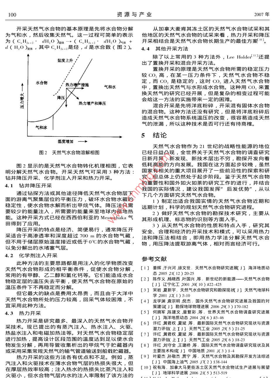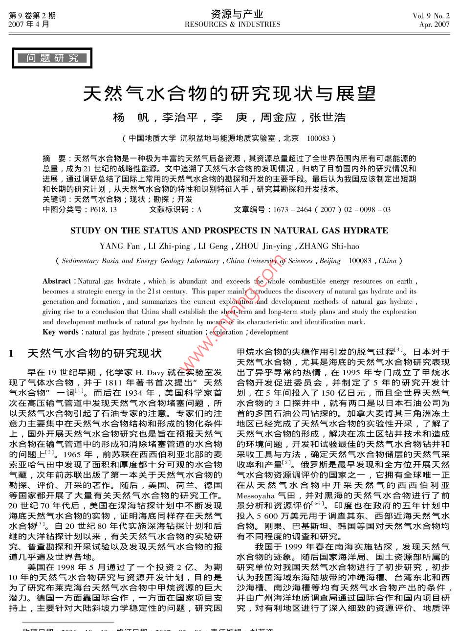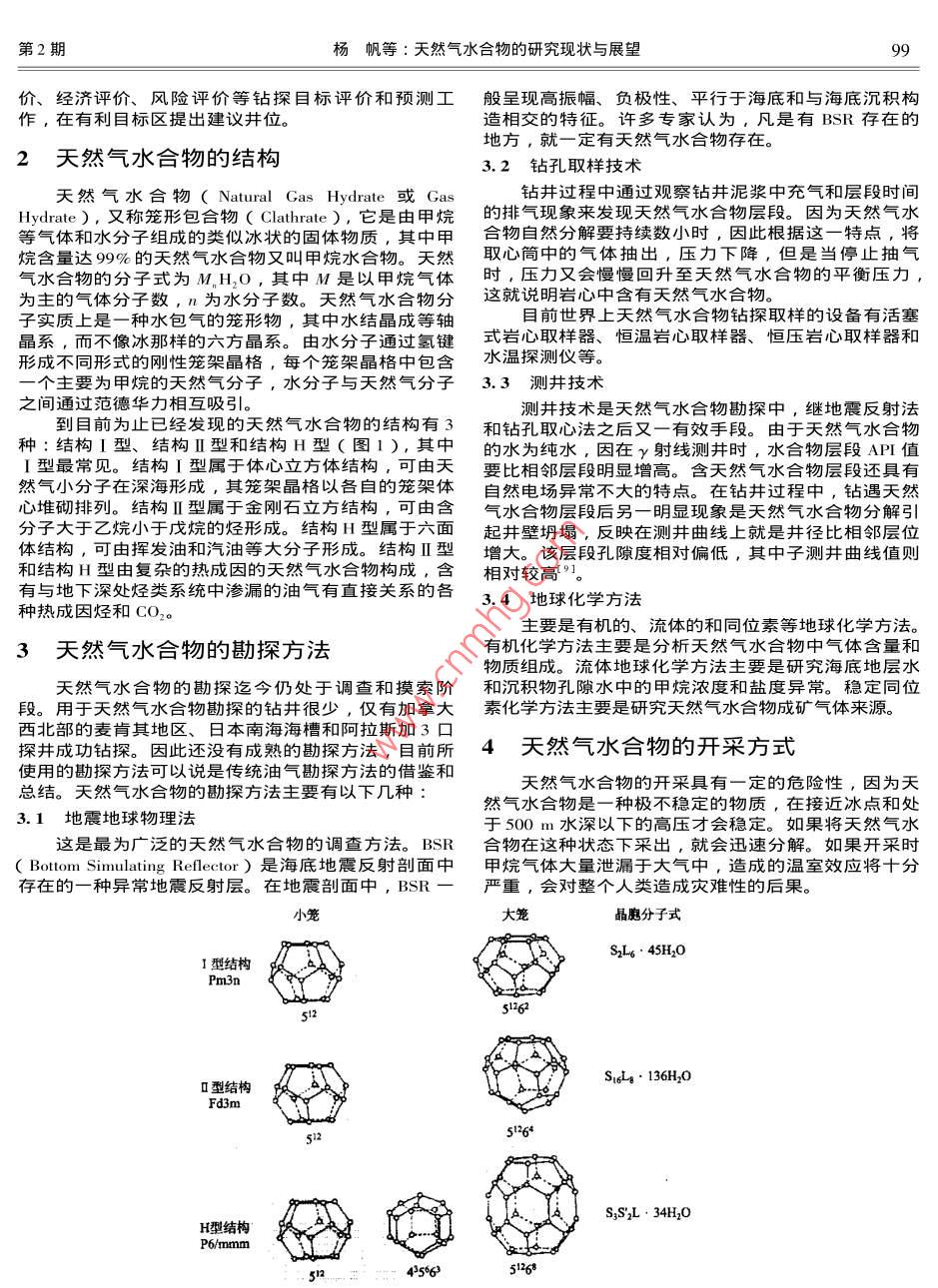 第9卷第2期資源與產(chǎn)業(yè)Vol 9 No. 22007年4月RESOURCeS IndustriesApr.2007題研天然氣水合物的研究現(xiàn)狀與展望楊帆,李治平,李庚,周金應(yīng),張世浩中國(guó)地質(zhì)大學(xué)沉積盆地與能源地質(zhì)實(shí)驗(yàn)室,北京100083)摘要:天然氣水合物是一種極為豐富的天然氣后備資源,其資源總量超過(guò)了全世界范圍內(nèi)所有可燃能源的總量,成為21世紀(jì)旳戰(zhàn)略性能源。文中追溯了天然氣水合物的發(fā)現(xiàn)情況,歸納了目前國(guó)內(nèi)外的研究情況和進(jìn)展,通過(guò)調(diào)研總結(jié)了國(guó)際上常用的天然氣水合物的勘探和開(kāi)發(fā)的主要手段。最后認(rèn)為我國(guó)應(yīng)該制定出短期和長(zhǎng)期的研究計(jì)劃,從天然氣水合物的特性和識(shí)別特征入手,研究其勘探和開(kāi)發(fā)技術(shù)關(guān)鍵詞∵天然氣水合物;現(xiàn)狀;勘探;開(kāi)發(fā)中圖分類號(hào):P6I8.13文獻(xiàn)標(biāo)識(shí)碼:A文章編號(hào):1673-2464(2007)02-0098-03STUDY ON THE STATUS AND PROSPECTS IN NATURAL GAS HYDRATEYANG Fan, LI Zhi-ping, LI Geng ZHOU Jin-ying ZHANG Shi-haoSedimentary Basin and Energy Geology Laboratory, China University of Sciences, Beijing 100083, ChinaAbstract: Natural gas hydrate, which is abundant and exceeds the whole combustible energy resoureearthbecomes a strategic energy in the 21 st century. This paper mainly introduces the discovery of natural gas hydrate and itsgeneration and formation and summarizes the current exploration and development methods of natural gas hydrateiving rise to a conclusion that China shall establish the short-term and long-term study plans and study the explorationand development methods of natural gas hydrate by means of its characteristic and identification markKey words natural gas hydrate present situation exploration development1天然氣水合物的研究現(xiàn)狀甲烷水合物的失穩(wěn)作用引發(fā)的脫氣過(guò)程4。日本對(duì)于天然氣水合物,尤其是海底的天然氣水合物研究表現(xiàn)早在19世紀(jì)早期,化學(xué)家H.Dawy就在實(shí)驗(yàn)室發(fā)岀了異乎尋常的熱情,在1995年專門成立了甲烷水現(xiàn)了氣體水合物,并于1811年著書首次提出”天然合物開(kāi)發(fā)促進(jìn)委員會(huì),并制定了5年的研究開(kāi)發(fā)計(jì)氣水合物”一詞l而后在1934年,美國(guó)科學(xué)家首劃,在5年間投入了150億日元,而且全世界天然氣次在高壓輸氣管道中發(fā)現(xiàn)天然氣水合物堵塞問(wèn)題,所水合物的3口探井中,就有兩口是以日本石油公司為意力主要集中在天然氣水合物結(jié)構(gòu)和形成的物化條件地區(qū)已經(jīng)完成了天然氣水合物的實(shí)驗(yàn)性開(kāi)采,了解了上,國(guó)外開(kāi)展天然氣水合物研究也是旨在預(yù)報(bào)天然氣天然氣水合物的形成,解決在凍土區(qū)鉆井技術(shù)和造成水合物在輸氣管道中的形成和消除堵塞管道的水合物的環(huán)境問(wèn)題,開(kāi)發(fā)和試驗(yàn)最佳的天然氣水合物鉆井和的問(wèn)題上2。1965年,前蘇聯(lián)在西西伯利亞北部的麥采收工具與方法,確定天然氣水合物儲(chǔ)層的天然氣采索亞哈氣田中發(fā)現(xiàn)了面積和厚度都十分可觀的水合物收率和產(chǎn)量。俄羅斯是最早發(fā)現(xiàn)和全方位開(kāi)展天然氣藏,次年前蘇聯(lián)出版了第一本關(guān)于天然氣水合物的氣水合物資源調(diào)評(píng)價(jià)的國(guó)家之一,它擁有全球唯一正勘探、評(píng)價(jià)、開(kāi)采的著作。隨后,美國(guó)、荷蘭、德國(guó)在從天然氣水合物中開(kāi)采天然氣的西西伯利亞等國(guó)家都開(kāi)展了大量有關(guān)天然氣水合物的研究工作。 Messovaha氣田,并對(duì)黑海的天然氣水合物進(jìn)行了前20世紀(jì)70年代后,美國(guó)在深海鉆探計(jì)劃中不斷發(fā)現(xiàn)景分析和資源評(píng)價(jià)6]。印度也在政府的五年計(jì)劃中海底天然氣水合物的實(shí)物,證明海底同樣存在天然氣投入5600萬(wàn)美元用于調(diào)查其東、西部近海天然氣水水合物3。自20世紀(jì)80年代實(shí)施深海鉆探計(jì)劃和后合物。剛果、巴基斯坦、韓國(guó)等國(guó)對(duì)天然氣水合物均迷的大洋鉆探計(jì)劃以來(lái),有關(guān)天然氣水合物的實(shí)驗(yàn)研有不同程度的調(diào)查和研究究、普查勘探和開(kāi)采試驗(yàn)以及發(fā)現(xiàn)天然氣水合物的報(bào)我國(guó)于1999年春在南海實(shí)施鉆探,發(fā)現(xiàn)天然氣道幾乎遍及世界各地。水合物的跡象。隨后國(guó)家海洋局、國(guó)土資源部所屬的美國(guó)在1998年5月通過(guò)了一個(gè)投資2億、為期研究單位對(duì)我國(guó)天然氣水合物進(jìn)行了初步研究,初步10年的天然氣水合物研究與資源開(kāi)發(fā)計(jì)劃,囯的是認(rèn)為我國(guó)海域東海陸坡帶的沖繩海槽、臺(tái)灣東北和西為了研究布萊克海臺(tái)夭然氣水合物中甲烷資源的巨大沙海槽、南沙海槽等均有天然氣水合物產(chǎn)岀的條件潛力。德國(guó)一方面靠國(guó)際合作,一方面在國(guó)家項(xiàng)目支并由廣州海洋地質(zhì)調(diào)査局通過(guò)國(guó)際合作和國(guó)內(nèi)項(xiàng)目研持上,主要針對(duì)大陸斜坡力學(xué)穩(wěn)定性的問(wèn)題,研究因究,對(duì)有利地區(qū)進(jìn)行了深入細(xì)致的資源評(píng)價(jià)、地質(zhì)評(píng)第2期楊帆等:天然氣水合物的研究現(xiàn)狀與展望價(jià)、經(jīng)