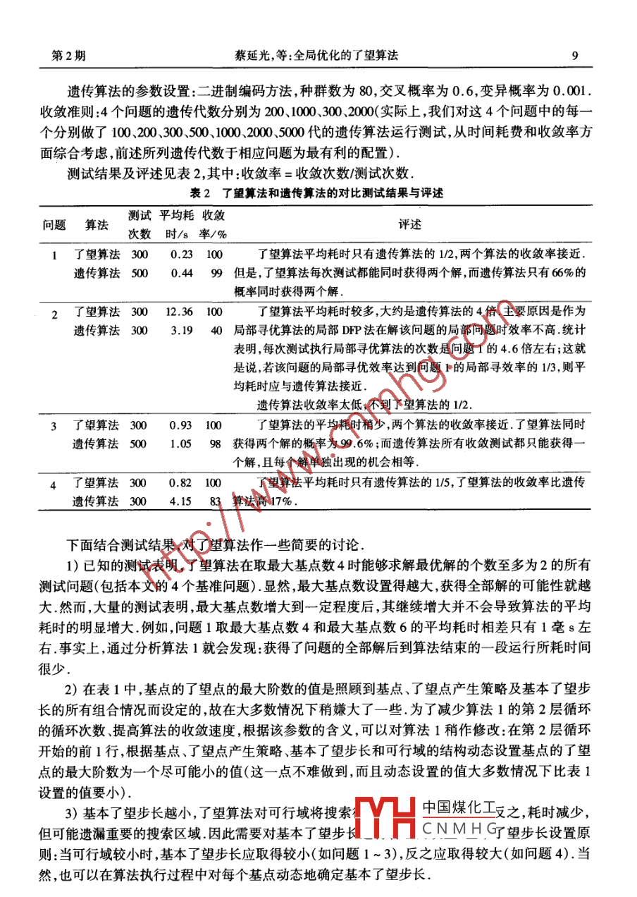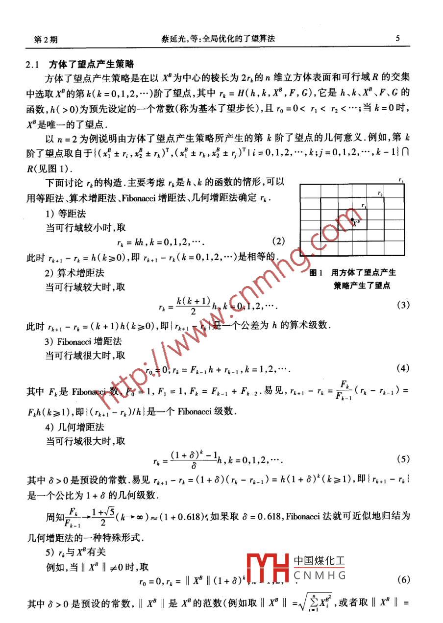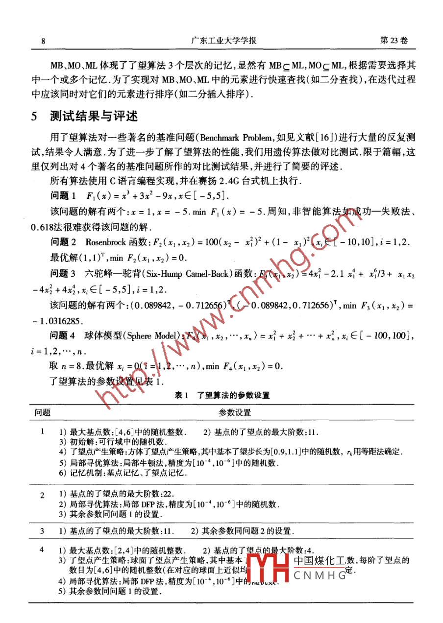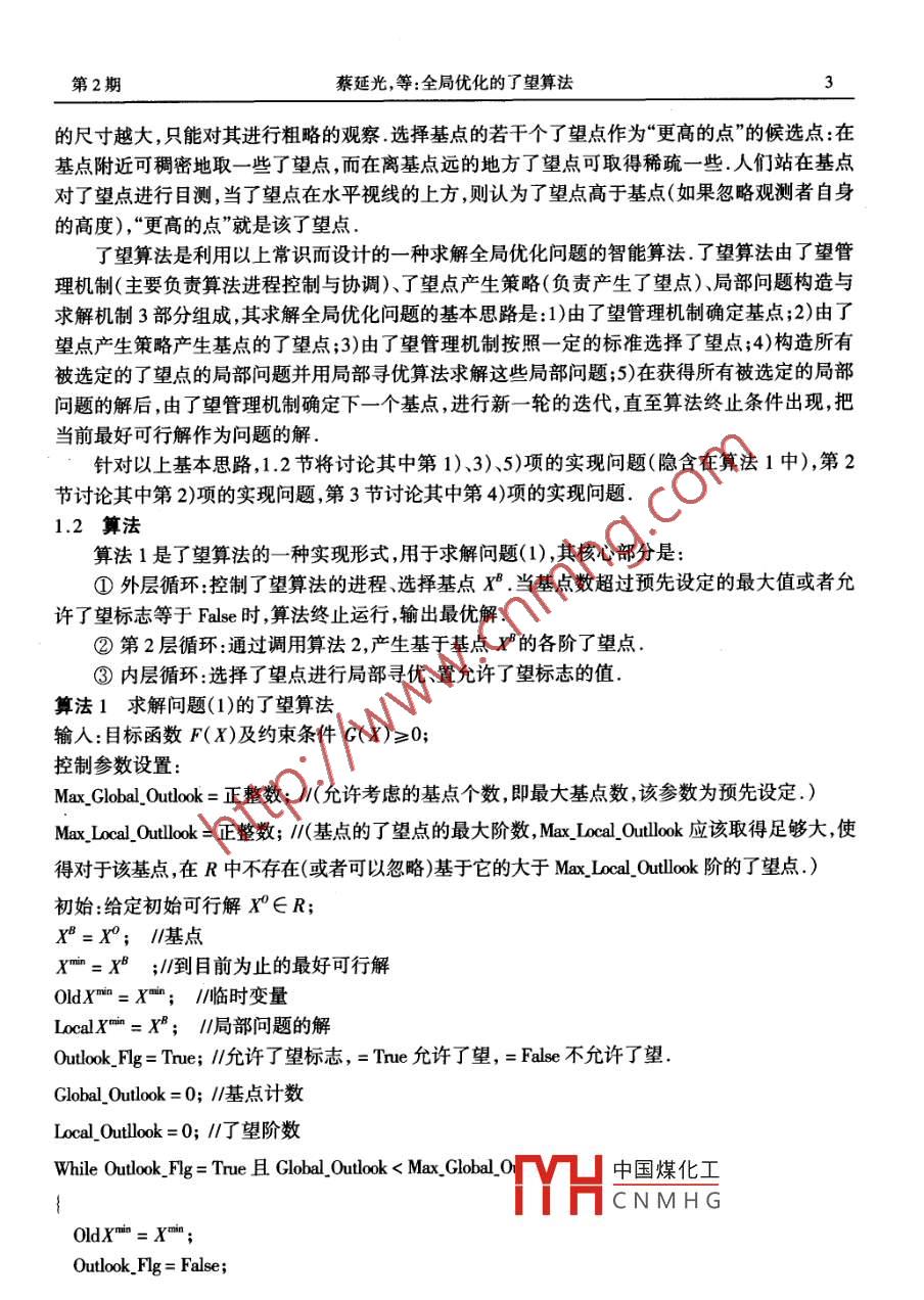 第23卷第2期廣東工業(yè)大學(xué)學(xué)報Vol.23 No.22006年6月Joumal of Guangdong University of TechnologyJune 2006全局優(yōu)化的了望算法蔡延光' ,錢積新”,孫優(yōu)賢2(1.廣東工業(yè)大學(xué)自動化學(xué)院,廣東廣州510090;2.浙江大學(xué)工業(yè)控制技術(shù)國家重點實驗室,浙江杭州310027)摘要:提出求解全局優(yōu)化問題的了望算法.了望算法利用了望技術(shù)確定群山最高點的常識,通過了望管理機制、了望點產(chǎn)生策略、局部問題構(gòu)造與求解機制,能在較短的時間內(nèi)求解全局優(yōu)化問題.大量的測試表明,了望算法具有較高的收斂率和較強的獲得問題全部解的能力,對初始點幾乎沒有依賴,參數(shù)選擇簡單.了望算法能夠保證在迭代過程中迭代點的質(zhì)量逐步變好,所提出的三層次記憶機制極大地提高了望算法的收斂速度.大量的對比測試也表明,在收斂率和全局搜索能力等方面了望算法較遺傳算法有一-定的優(yōu)勢,且在大多數(shù)情況下了望算法耗時較少.由于了望算法是根據(jù)人類的高級行為智能和推理智能提出的一-種智能算法,它為解決全局優(yōu)化問題開辟了--條新的途徑.關(guān)鍵詞:了望算法;全局優(yōu)化;智能算法中圈分類號:0224文獻(xiàn)標(biāo)識碼:A文章編號:1007-7162(2006)02-000-11引言最近二十多年來,全局優(yōu)化技術(shù)得到了長足的發(fā)展,模擬退火算法、遺傳算法神經(jīng)網(wǎng)絡(luò)算法禁忌搜索算法( Tabu Search)、蟻群算法( Ant Colony Agrithm)等智能算法得到了廣泛而深入的研究,在解決全局優(yōu)化問題方面獲得了很大的成功.模擬退火算法[14]是基于物理學(xué)中固體物質(zhì)退火過程所表現(xiàn)出的特性而發(fā)展起來的一-種智能算法,屬于一種低級的智能,它的計算量雖然較Monte Carlo方法顯著減少,但其全局收斂性能仍然很差遺傳算法[s]是基于生物本能的智能算法,是利用生物進(jìn)化論中優(yōu)勝劣汰、適者生存的原理及遺傳機理而提出的-種智能算法,其主要優(yōu)點是并行性和全局空間搜索;但其計算時間長,常常出現(xiàn)早熟收斂神經(jīng)網(wǎng)絡(luò)算法[89]是利用基于聯(lián)結(jié)的生物神經(jīng)系統(tǒng)協(xié)同工作原理而設(shè)計的- -種智能算法,其計算簡單、快速;但它的參數(shù)魯棒性差,容易陷于局部最優(yōu),有時可能收斂于問題的不可行解禁忌搜索算法([042]是對人類智能的--種模擬,具有較強的爬山能力和較好的局部改進(jìn)能力;但它對初始解有較強的依賴性,迭代過程是串行的,參數(shù)的選擇不當(dāng)可能造成早熟收斂.蟻群算法[4151 是模擬螞蟻群體行為特征而設(shè)計的一種基于動物智能的智能算法,利用正反饋原理,蟻群算法具有很強的魯棒性和發(fā)現(xiàn)較好解的能力,是-種基于合作的無監(jiān)督機制的并行算法;但是蟻群算法計算時間較長,參數(shù)選擇更多地依靠實驗和經(jīng)驗、沒有一一個程序化的方法來確定,且容易出現(xiàn)迭代停止現(xiàn)象.以上提及的五大智能算法在解決實際問題時都容易陷于局部最優(yōu),且在迭代過程中不能保證迭代點中國煤化工收稿日期:2005-07-11MHCNMHG基金項目:國家自然科學(xué)基金資助項目(60374062);廣東省自然科學(xué)基金項目(04009488);廣東省科技計劃項目(2004B10101038)作者簡介:蔡延光( 1963-),男,博士,教授,主要研究方向為組合優(yōu)化、智能優(yōu)化智能決策支持系統(tǒng)..廣東工業(yè)大學(xué)學(xué)報第23卷的質(zhì)量逐步變好.本文基于了望技術(shù)確定群山最高點的常識,提出解決全局優(yōu)化問題的了望算法.了望算法本質(zhì)上是- -種基于監(jiān)督的并行算法,在了望管理機制的協(xié)調(diào)下,把了望點產(chǎn)生策略和局部尋優(yōu)算法有機地結(jié)合起來,能在較短的時間內(nèi)求解全局優(yōu)化問題.大量的測試表明,了望算法具有較高的收斂率和較強的獲得問題全部解的能力,對初始點幾乎沒有依賴,參數(shù)選擇簡單,能夠保證在迭代過程中迭代點的質(zhì)量逐步變好.大量的對比測試也表明,在收斂率和全局搜索能力等方面了望算法較遺傳算法有- -定的優(yōu)勢,且在大多數(shù)情況下了望算法耗時較少.為了加快了望算法的收斂速度,引人了望算法的三層次記憶機制,即基點記憶、了望點記憶、局部尋優(yōu)記憶.了望算法模擬了人類的高級行為智能一視覺智 能、以及根據(jù)視覺信息分析問題的推理智能,是一種智能算法,與已知的五大智能算法在原理上有明顯的不同,是解決全局優(yōu)化問題的一個新嘗試.為了實現(xiàn)方便,用C語言風(fēng)格書寫算法.1了望算法研究全局優(yōu)化問題[minF(X),X∈RcE"(1)\R={XIg:(X)≥0,i= 1,2,.m},記G(X)=(g;(X),g2(X),",gm(X))".1.1 基本原理為了表述方便,引入幾個基本概念.定義1對于問題(1),設(shè) R'CR,x°∈R',1)把minF(x)(X∈R')稱為x°處的局部優(yōu)化問題,在不引起混淆時簡稱為局部問題;求局部問題的解稱為局部尋優(yōu);2)如果在R'上F(X)是(下)單峰函數(shù),則稱R'為F(X)的(下)單峰區(qū)域,在不引起混淆時簡稱為單峰區(qū)域.定義2對于問題(1),1)了望基準(zhǔn)點(簡稱基點)是可行域R中的-一個點;2)設(shè)x∈R是基點,基于基點x°的了望點是可行域R中的-一個點,在不引起混淆時把基于基點的了望點簡稱為基點的了望點或了望點;把x的全部了望點按照某種標(biāo)準(zhǔn)(例如歐氏距離