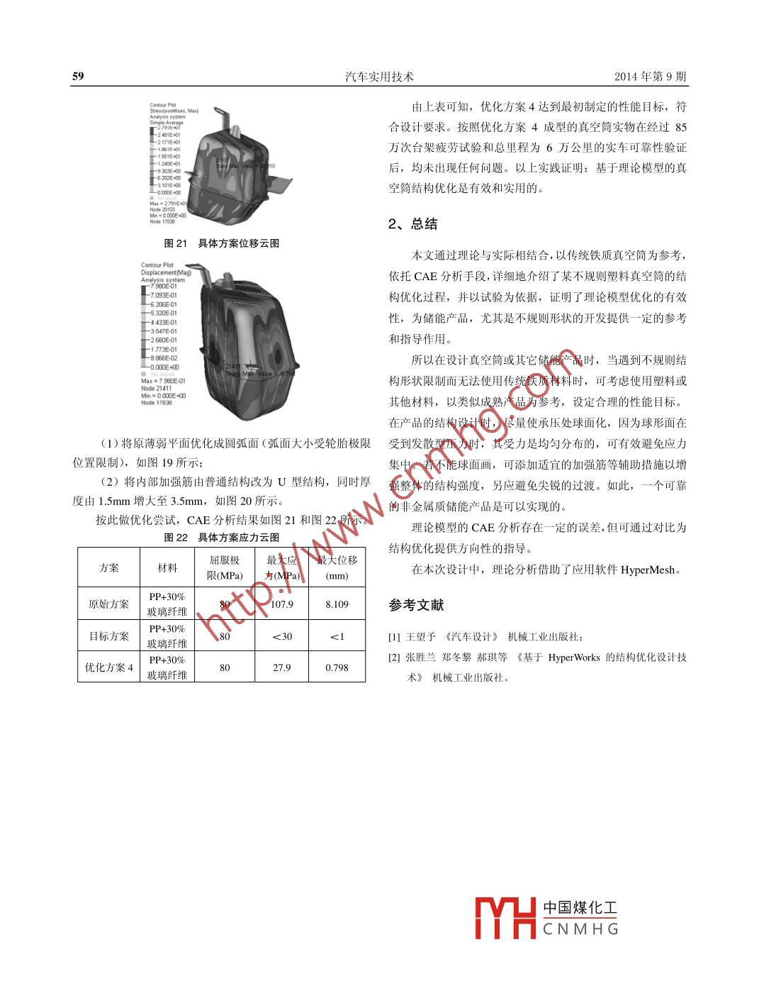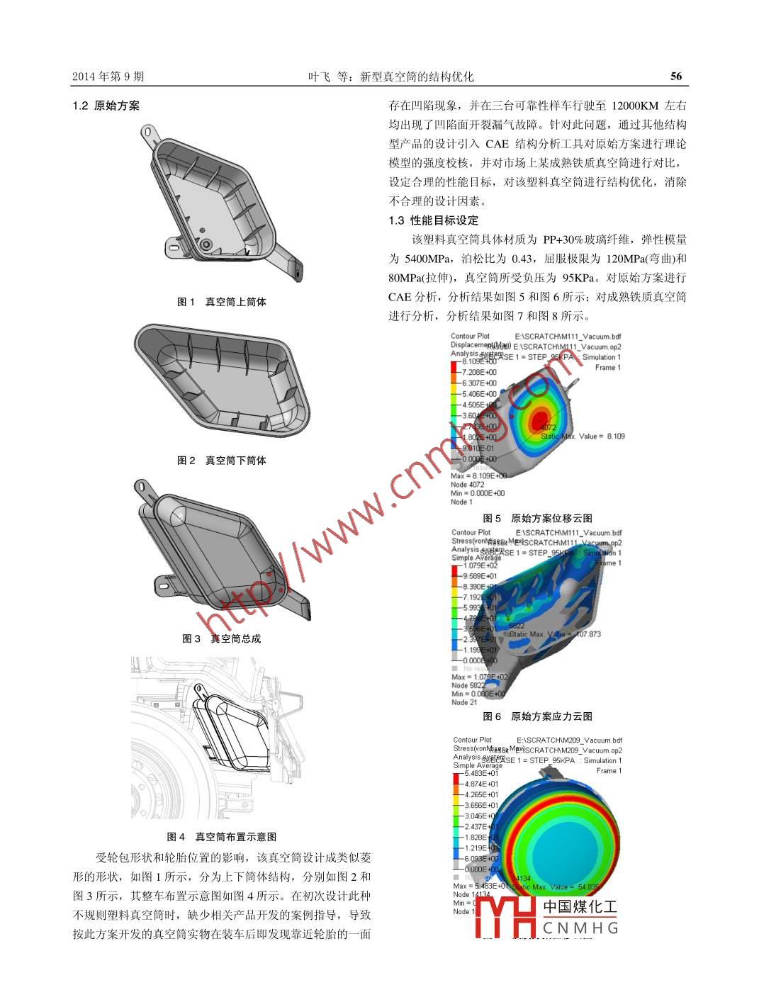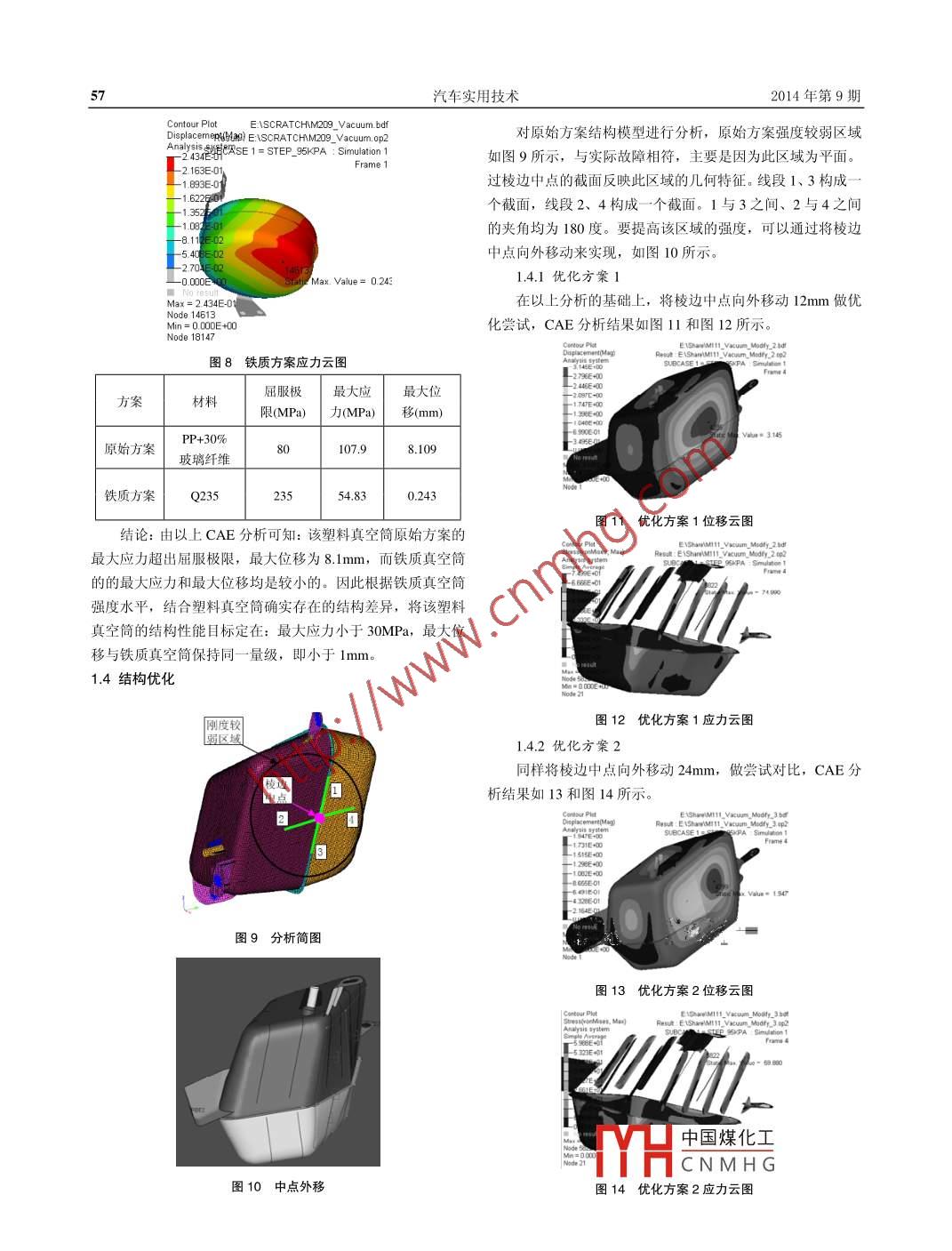 汽車實(shí)用技術(shù)20 13年第9期設(shè)計(jì)研究AUTOMOBILE APPLIED TECHNOLOGY13 NO.9新型真空筒的結(jié)構(gòu)優(yōu)化葉飛(安徽江淮汽車股份有限公司技術(shù)中心,安徽合肥230601)摘要:本文詳細(xì)地介紹了某車型不規(guī)則塑料真空簡(jiǎn)的設(shè)計(jì)過(guò)程,并以實(shí)車驗(yàn)證為依據(jù),證明了理論模型結(jié)構(gòu)優(yōu)化的有效性,為儲(chǔ)能產(chǎn)品的設(shè)計(jì)提供一定的參考和指導(dǎo)作用。關(guān)鍵詞:塑料;真空筒;結(jié)構(gòu)優(yōu)化;儲(chǔ)能中圖分類號(hào): U463.5文獻(xiàn)標(biāo)識(shí)碼: A文章編號(hào): 1671-7988(2014)09- -55- -05New vacuum tube structure optimizationYe Fei(Anhui Jianghuai Automobile Co., Ltd. Technology Center, Anhui Hefei 230601 )A bstract: This paper firstly presents the design process of one plastic vacuum tube, according to vehicle test, proves thevalidity of the theoretical model structure optimization and provides certain reference and guidance for the design of theenergy storage products.Keywords: plastic; vacuum tube; structure optimization; energy storageCLC NO.: U463.5 Document Code: A Article ID: 1671-7988(2014)09-55-05總成。然而不規(guī)則的真空簡(jiǎn)則難以通過(guò)傳統(tǒng)的鈑金沖壓工藝引言實(shí)現(xiàn),而目前常見(jiàn)的儲(chǔ)能產(chǎn)品主要為兩種材質(zhì),一種是金屬真空簡(jiǎn)是液壓制動(dòng)系統(tǒng)中用來(lái)儲(chǔ)存真空的儲(chǔ)能裝置,也材質(zhì),一種是塑料材質(zhì)。而如何設(shè)計(jì)一款結(jié)構(gòu)可靠的不規(guī)則有稱之為真空罐。其儲(chǔ)存的真空可在車輛行車制動(dòng)時(shí),為真塑料真空筒成為擺在設(shè)計(jì)人員面前的-一個(gè)難題, 下 文則將通空助力器提供足夠的真空以滿足頻繁制動(dòng)的需求。真空簡(jiǎn)多過(guò)某一-輕型客 車塑料真空簡(jiǎn)的開發(fā)案例,介紹塑料材質(zhì)真空見(jiàn)于輕型商用車上,而很少應(yīng)用到乘用車上。其主要原因是:筒從結(jié)構(gòu)設(shè)計(jì)到強(qiáng)度優(yōu)化以及試驗(yàn)驗(yàn)證的開發(fā)過(guò)程,為同類-般乘用車的總質(zhì)量較小,制動(dòng)時(shí)所需的真空較少,即使是型產(chǎn)品的開發(fā)提供指導(dǎo)性建議。頻繁的制動(dòng),真空泵的抽取速度基本都能滿足要求,而商用1、某車型塑料真空筒的結(jié)構(gòu)設(shè)計(jì)車的總質(zhì)量較大,其制動(dòng)時(shí)所需的真空相對(duì)較多,頻繁制動(dòng)時(shí),若不匹配真空簡(jiǎn),真空泵的抽取速度難以跟上消耗速度,1.1 概述會(huì)降低真空助力器助力的助力效果,尤其在山路下坡時(shí),會(huì)在某輕型客車開發(fā)過(guò)程中,由于發(fā)動(dòng)機(jī)較大,導(dǎo)致發(fā)艙因?yàn)檎噾T性較大,產(chǎn)生安全隱患。內(nèi)空間狹小,難以布置下一個(gè)6L大小的真空筒,即使勉強(qiáng)隨著越來(lái)越多的新車型的開發(fā),發(fā)艙的布置會(huì)不盡相同。布置下, 也會(huì)影響發(fā)艙散熱,產(chǎn)生熱害風(fēng)險(xiǎn),所以需要將真當(dāng)某些車型的發(fā)艙空間難以存放一-個(gè) 規(guī)則的固定容積的真空空簡(jiǎn) 移至發(fā)艙外布置。最終經(jīng)過(guò)綜合考慮決定將真空簡(jiǎn)布置簡(jiǎn)時(shí),將真空簡(jiǎn)設(shè)計(jì)成不規(guī)則形狀會(huì)成為-一種需求。目前傳在右前輪包下, 由于布置位置特殊,真空簡(jiǎn)形狀無(wú)法設(shè)計(jì)成統(tǒng)的真空簡(jiǎn)都是通過(guò)鈑金沖壓生成上下兩個(gè)簡(jiǎn)體,然后將上傳統(tǒng)的圓簡(jiǎn)狀或方 盒狀,造型相對(duì)奇特;而受造型影響,傳下簡(jiǎn)體以及附屬的支架等焊接在一起,如此就行成了真空簡(jiǎn)統(tǒng)的鈑 金沖壓件工藝難以實(shí)現(xiàn),因此該真空簡(jiǎn)最終采用了塑料材質(zhì)。上下簡(jiǎn)中國(guó)煤化工簡(jiǎn)體通過(guò)熱板作者簡(jiǎn)介:葉飛,就職于安徽江淮汽車股份有限公司技術(shù)中心。焊接成一體,如1MHCNMHG2014年第9期葉飛等:新型真空筒的結(jié)構(gòu)優(yōu)化1.2原始方案存在凹陷現(xiàn)象,并在三臺(tái)可靠性樣車行駛至12000KM 左右均出現(xiàn)了凹陷面開裂漏氣故障。針對(duì)此問(wèn)題,通過(guò)其他結(jié)構(gòu)0型產(chǎn)品的設(shè)計(jì)引入CAE結(jié)構(gòu)分析工具對(duì)原始方案進(jìn)行理論模型的強(qiáng)度校核,并對(duì)市場(chǎng)上某成熟鐵質(zhì)真空簡(jiǎn)進(jìn)行對(duì)比,設(shè)定合理的性能目標(biāo),對(duì)該塑料真空簡(jiǎn)進(jìn)行結(jié)構(gòu)優(yōu)化,消除不合理的設(shè)計(jì)因素。1.3性能目標(biāo)設(shè)定該塑料真空簡(jiǎn)具體材質(zhì)為PP+30%玻璃纖維,彈性模量為5400MPa,泊松比為0.43,屈服極限為120MPa(彎 曲)和80MPa(拉伸),真空簡(jiǎn)所受負(fù)壓為95KPa。對(duì)原始方案進(jìn)行圖1真空筒上簡(jiǎn)體CAE分析,分析結(jié)果如圖5和圖6所示;對(duì)成熟鐵質(zhì)真空簡(jiǎn)進(jìn)行分析,分析結(jié)果如圖7和圖8所示。Contour PlotE:SCRATCHIM111 Vacum bdfDisplacemeR(ae) E:\SCRATCHM111 Vacum. op21-81092年月ASE 1= STEP_ 95KPA : Simulation 1L -7 208E+00-6.307E+005. 406+00_3 604E+- 2703E+00Slatig Msx. Value= 8.109圖2真空筒下簡(jiǎn)體Node 4072Min=000E+00圖5原始方 案位移云圖Contouplol.. E\SCRATCHM111_Vacum btfStress(vonRaSEHMEPlSCRATCHM111-Yacum-pp2Simple Averag4SE1-STEP_95K f Simrame. -9.589E+01E圖3真空筒總成StaticMax. YlUez 407.873Max=1079E+0270_可Node 21圖