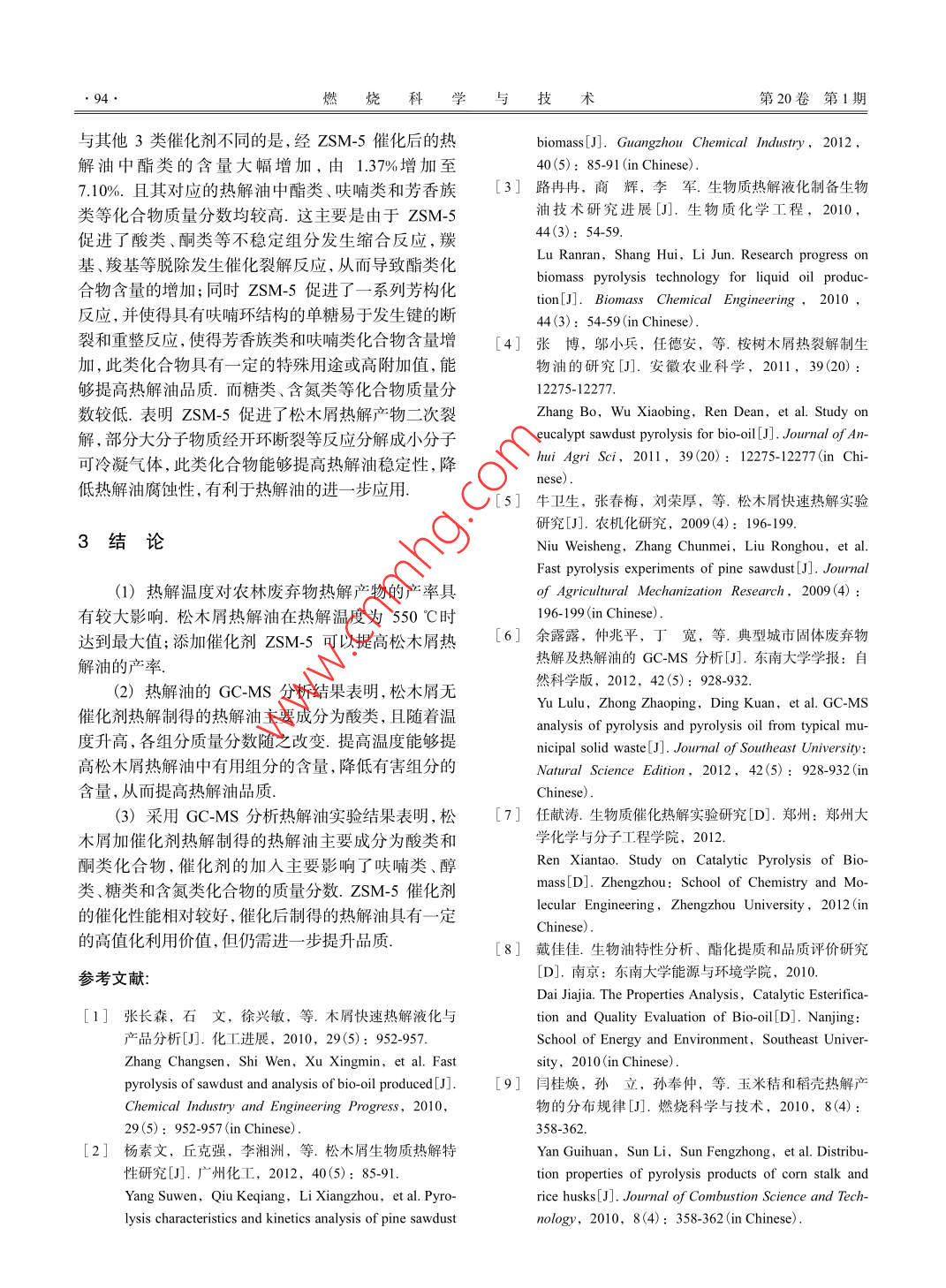 第20卷第1期燃燒科學(xué)與技術(shù)Vol.20 No.12014年2月Journal of Combustion Science and TechnologyFeb. 2014DOI 10.11715/rskxjs. R201305009松木屑催化熱解及熱解油分析劉志超,仲兆平,丁寬,張波(東南大學(xué)能源與環(huán)境學(xué)院能源熱轉(zhuǎn)換及其過(guò)程測(cè)控教育部重點(diǎn)實(shí)驗(yàn)室,南京210096)摘要:以松木屑為原料, 選取無(wú)水Na2CO3、無(wú)水Al2O3、凹凸棒土、ZSM-5共4類(lèi)催化劑,利用管式爐實(shí)驗(yàn)及色質(zhì)聯(lián)用(GC-MS)分析儀進(jìn)行熱解特性研究,探索了熱解產(chǎn)物產(chǎn)率和組分特性的變化規(guī)律.實(shí)驗(yàn)結(jié)果表明,松木屑在熱解溫度為550C時(shí),產(chǎn)油率達(dá)到最大值51.47%(質(zhì)量分?jǐn)?shù));無(wú)催化劑條件下松木屑熱解油主要成分為酸類(lèi)化合物,加催化劑條件F松木屑熱解油主要成分為酸類(lèi)和酮類(lèi)化合物,催化劑的加人主要影響了呋喃類(lèi)、醇類(lèi)、糖類(lèi)和含氮類(lèi)化合物的質(zhì)量分?jǐn)?shù). ZSM-5 催化劑的催化性能最佳,其能夠提高熱解油產(chǎn)率,其對(duì)應(yīng)的熱解油中酯類(lèi)、呋喃類(lèi)和芳香族類(lèi)等能夠提高熱解油品質(zhì)的化合物質(zhì)量分?jǐn)?shù)均較高,而糖類(lèi)、含氮類(lèi)等化合物質(zhì)量分?jǐn)?shù)較低,能夠提高熱解油的穩(wěn)定性.關(guān)鍵詞:松木屑;催化熱解;熱解油;色質(zhì)聯(lián)譜(GC-MS)中圖分類(lèi)號(hào): TK6文獻(xiàn)標(biāo)志碼: A文章編號(hào): 1006-8740 (2014)01-0091-04Catalytic Pyrolysis and Pyrolysis Oil from Pine SawdustLiu Zhichao, Zhong Zhaoping,Ding Kuan, Zhang Bo(Key Laboratory of Energy Thermal Conversion and Control of Ministry of Education, School of Energy andEnvironment, Southeast University, Nanjing 210096, China)Abstract: Pine sawdust as material, Na2CO3, anhydrous Al2O3,attapulgite and ZSM-5 as catalysts,pyrolysischaracteristics are studied using a tubular furnace reactor and the gas chromatography- mass spectrometry (GC-MS) .The yield and composition of pyrolysis products are also investigated. The experimental results show that the maximaloil yield of pine sawdust is about 51.47% (mass fraction) when the pyrolysis temperature is 550 C. In the absence ofcatalyst, the main ingredients of pine sawdust pyrolysis oil are acid compounds,while the main ingredients are acidsand ketone compounds in the presence of catalyst. Catalysts mainly affect the mass fraction of furan, alcohol,saccharides and nitrogen compounds. ZSM-5 shows the best catalytic performance, which can improve the pyrolysisoil yield. There are higher mass fraction of esters,furan and aromatic species in its corresponding pyrolysis oil,which can improve the pyrolysis oil quality, while the mass fraction of carbohydrates and nitrogen compounds arelower, which can improve the stability of pyrolysis oil.Keywords: pine sawdust; catalytic pyrolysis; pyrolysis oil; gas chromatography-mass spectrometry (GC-MS)隨著我國(guó)經(jīng)濟(jì)的快速發(fā)展,不可再生的化石能源棄物轉(zhuǎn)換的一個(gè)重要技 術(shù)1-5].發(fā)展農(nóng)林廢棄物熱解逐步枯竭,且化石能源的利用導(dǎo)致環(huán)境持續(xù)惡化,因技術(shù),對(duì)充分利用豐富的可再生農(nóng)林廢棄物資源,解此清潔可再生的農(nóng)林廢棄物開(kāi)發(fā)利用引起了人們的決能源短缺、環(huán)境污染有著重要的意義,能夠加快實(shí)廣泛關(guān)注!-31.農(nóng)林廢棄物熱解技術(shù)可將農(nóng)林廢棄物現(xiàn)我國(guó)國(guó)民經(jīng)濟(jì)的可持續(xù)發(fā)展甲轉(zhuǎn)換成熱解油、可燃?xì)夂凸腆w殘?zhí)康犬a(chǎn)物,是農(nóng)林廢農(nóng)林廢棄物熱解后的熱解油成分復(fù)雜,傳統(tǒng)的化收稿日期: 2013-05-10.基金項(xiàng)目:國(guó)家重點(diǎn)基礎(chǔ)研究發(fā)展計(jì)劃(973計(jì)劃)資助項(xiàng)目(2013CB228106;2011CB201505);國(guó)家自然科學(xué)基金資助項(xiàng)目(51276040).作者簡(jiǎn)介:劉志超( 1989- ). 男,碩士研究生.通訊作者:仲兆平,男,博士,教授, zzhong@seu.edu.cn..92。然燒科學(xué)與支術(shù)第20卷第1期學(xué)方法無(wú)法鑒別其所含的化合物類(lèi)型色質(zhì)聯(lián)用選,然后置于烘箱中, 105 °C下干燥24 h后待用.(GC-MS)分析儀在測(cè)定熱解油成分方面有著較為廣實(shí)驗(yàn)催化劑選用無(wú)水Na2CO3、無(wú)水Al2O3、 凹凸泛的應(yīng)用間棒土、ZSM-5,其中無(wú)水Na2CO3、無(wú)水Al2O3純度為分本文以松木屑為農(nóng)林廢棄物原料,利用管式爐熱析純,由國(guó)藥集團(tuán)化學(xué)試劑有限公司(上海)提供,凹解裝置進(jìn)行了熱解實(shí)驗(yàn),研究了熱解溫度和催化劑對(duì)凸棒土由南京六合催化劑公司提供,ZSM-5的孔徑為熱解產(chǎn)物產(chǎn)率和熱解油成分的影響.利用GC-MS分0.5 ~ 0.6 nm, Si/Al摩爾比為25 ~ 30,由南開(kāi)大學(xué)催化析儀分析了熱解油成分,以考察熱解油的特性以及催劑廠提供.催化劑使用前經(jīng)550 C高溫煅燒4h.通過(guò)化劑對(duì)成分變化的影響.催化熱解研究催化劑對(duì)松木屑熱解產(chǎn)物產(chǎn)率和熱解油組分的影響,目的在于提高松木屑熱解油品質(zhì)7.1實(shí)驗(yàn)1.2實(shí)驗(yàn)設(shè)備農(nóng)林廢棄物催化熱解實(shí)驗(yàn)裝置示意圖見(jiàn)圖1.該1.1 熱解試樣和催化劑實(shí)驗(yàn)裝置主要由載氣系統(tǒng)、管式爐熱解反應(yīng)系統(tǒng)、溫農(nóng)林廢棄物熱解包括物料的干燥、粉碎、熱裂度控制系統(tǒng)、熱解油冷凝系統(tǒng)、尾氣收集測(cè)