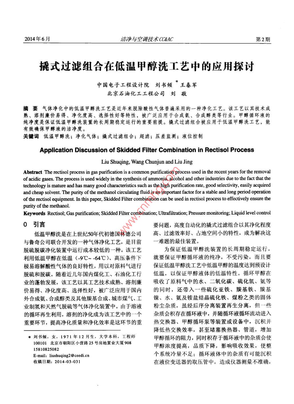 2014年6月潔凈與空調技術CCC第2期撬式過濾組合在低溫甲醇洗工藝中的應用探討中國電子工程設計院劉書傾王春軍北京石油化工工程公司劉敬摘要氣體凈化中的低溫甲醇洗工藝是近年來脫除酸性氣體普遍釆用的一種凈化工藝。該工藝以其技術成熟、溶劑廉價易得、凈化度高、選擇性好等特性,被廣泛應用于合成氨、合成醇類等行業(yè)。甲醇循環(huán)液的純凈度是保證低溫甲醇洗裝置的長周期穩(wěn)定運行的重要前提。撬式過濾組合被應用于低溫甲醇洗工藝,能有效確保甲醇液的潔凈度。關鍵詞低溫甲醇洗;凈化氣體;撬式過濾組合;超濾;壓差監(jiān)測;液位控制Application Discussion of Skidded Filter Combination in Rectisol ProcessLiu Shuqing, Wang Chunjun and Liu JingAbstract The rectisol process in gas purification is a common purification process used in the recent years for the removalof acidic gases. The process is used widely in the synthesis of ammonia, alcohol and other industries due to the fact that thetechnology is mature and has many good characteristics such as the high purification rate, good selectivity, easily acquiredand cheap solvent. The purity of the methanol circulating fluid is an important factor for a stable and long period operationof the rectisol equipment. In this paper, Skidded Filter combination can be used in rectisol process to effectively ensure thepurity of the methanolKeywords Rectisol; Gas purification; Skidded Filter combination; Ultrafiltration; Pressure monitoring: Liquid level control0引言要問題,高度自動化的撬式過濾組合以其凈化程度低溫甲醇洗是在上世紀50年代初德國林德公司高、過濾效率好、占地空間小的特性,成為解決這與魯奇公司聯合開發(fā)的一種氣體凈化工藝,是目前難題的最佳裝置。脫硫脫碳凈化裝置中運行成本較低的一種。該工藝為保證低溫甲醇洗裝置的長周期穩(wěn)定運行,利用低溫甲醇在低溫(-9℃~-64℃)、高壓條件下就要保證甲醇循環(huán)液的純凈,不受污染,而且要極易溶解酸性氣體的良好特性,用以對原料氣進行保證低溫甲醇洗工藝中低溫甲醇的溫度達到預設計脫硫和脫碳。隨著近幾年國內煤化工、石油化工行低溫,以保證甲醇液體的低溫特性。循環(huán)甲醇在業(yè)的蓬勃發(fā)展,該工藝以其工藝技術成熟、溶劑廉吸收了原料氣中的水、二氧化碳、硫化氫、氨等價易得、凈化度高、選擇性好,被廣泛應用于國內的同時,還帶入一些硫化亞鐵、羰基鐵、羰基外合成氨、合成醇類及其他羰基合成、城市煤氣、工鎳、水、氨及銨鹽結晶硫化鐵、煤粉之類的固體業(yè)制氫和天然氣脫硫等氣體凈化裝置中。由于溶液粉塵雜質,雖經后序分離裝置再生分離,但一些的循環(huán)再生利用,溶劑的凈化成為該工藝中的一個雜質會積存在循環(huán)液中,并隨循環(huán)液循環(huán)流動進入重要環(huán)節(jié),提高凈化質量和凈化效率是這環(huán)節(jié)的重熱交換器、甲醇循環(huán)泵等裝置或設備中,沉積并降低熱交換效率,甚至堵塞換熱器、管道,增加劉書傾,女,1971年12月生,大學本科,工程師甲醇循環(huán)的阻力,同時積存于循環(huán)液中的雜質會使100101北京市朝陽區(qū)小營路25號房地置業(yè)大廈90815810825082甲醇濃度提高,品質下降,影響吸收效果,使整E-mail: liushuqing 2@ ceedi.個系統冷量不足;循環(huán)液體中的雜質有可能沉積收稿日期:2014-03-031在液位變送器的取壓管中,造成儀器測量不準確,潔凈與空調技術CC&AC2014同時可能堵塞玻璃管液位計,造成液位指示不μm的不銹鋼纖維燒結氈濾芯,當粗過濾器中由于準;另外雜質顆粒極可能進入運轉泵機械密封的密攔截的固體雜質積聚增多,附著于濾芯的外表面,封面,造成機械密封泄漏,從而降低泵機械密封的形成濾餅,引起壓力增加,通過控制模塊開啟備用使用壽命,增加系統的運行成本;循環(huán)甲醇液體的粗過濾器,保證系統連續(xù)運行,同時撬塊控制模塊固體雜質還會堵塞塔板和填料,從而導致氣液相偏自動打開氮氣反吹閥,利用中低壓氮氣吹掃切換下流,增加塔內阻力,影響吸收和解吸效果:循環(huán)甲的粗過濾器,將附著于濾芯表面的雜質反吹清除掉,醇液體中的高濃度雜質還會造成循環(huán)溶液在塔內起清洗后的粗過濾器進入備用狀態(tài);粗過濾器攔截下泡,產生泛液現象,導致出塔氣中帶液,裝置被迫了大部分的固體雜質,那些比較細微的雜質隨著甲降低負荷運行,從而降低了生產線的產量。高效率、醇液體流入精過濾器,精過濾器中安裝了過濾精度高精度地凈化循環(huán)液體中的固體雜質是解決問題的為3μm的不銹鋼纖維燒結氈濾芯,它對液體中雜有效方法。撬式過濾組合應時而生,成為解決這一質進一步攔截,對3pm及以上的雜質攔截率達到問題的首選。9999%,精濾后液體中的雜質對整個系統的運行1撬式過濾組合的構成已基本沒有影響。精濾后的甲醇液流出過濾組合,進入甲醇洗下一單元。隨著時間的增長,精過濾器撬式過濾組合屬于超濾范疇,它是一個組合的濾芯表面隨著雜質的沉積附著,精過濾器內的壓體,可以是一個過濾組合單元,也可以是兩個或多降增大,控制系統由于壓差到達設定值,啟用備用個過濾組合單元體組合而成,過濾組合單元體的數精過濾器,將原工作的精過濾器從過濾系統中切出,量由系統中的設計流量來確定。撬式過濾組合單元同時清洗系統自動對其進行清洗的主要結構是:粗過濾器2臺(1開1備),每臺在低溫甲醇洗工藝