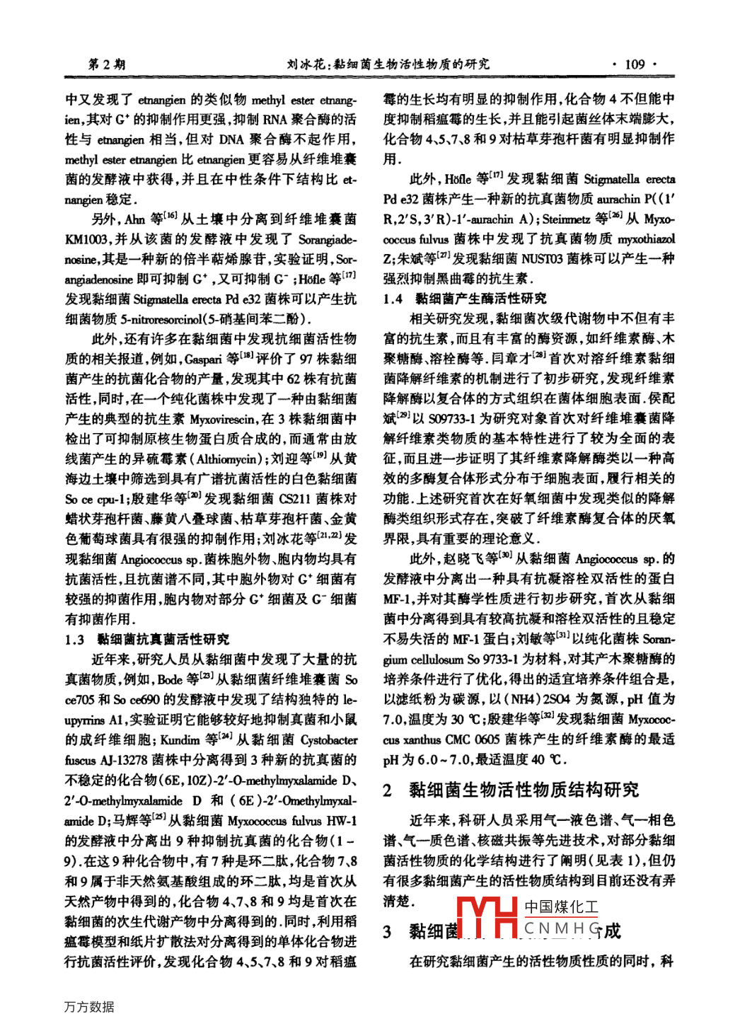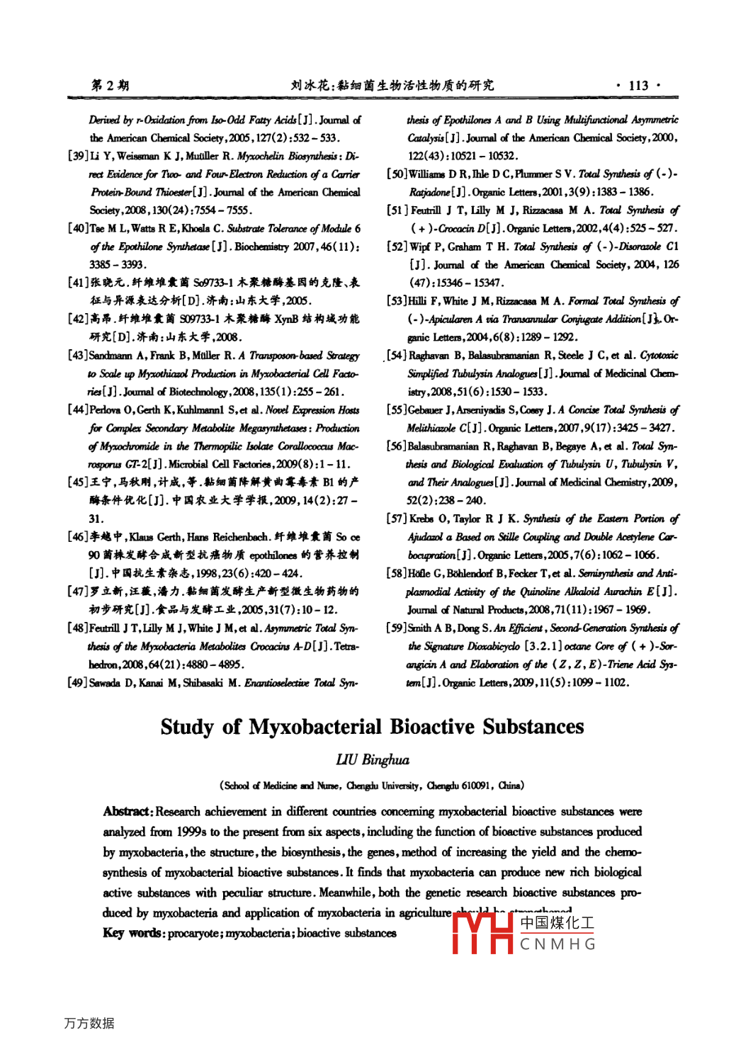 第30卷第2期Vol 30 No. 22011年6月成都大學(xué)學(xué)報(自然科學(xué)版Journal of Chengdu University ( Natural Science Edition)Jun.2011文章編號:1004-5422(2011)02-0108-06黏細菌生物活性物質(zhì)的研究劉冰花(成都大學(xué)醫(yī)護學(xué)院,四川成都610091)摘饔:從6個方面,即黏細菌產(chǎn)生的生物活性物質(zhì)的功能、黏細菌生物活性物質(zhì)的結(jié)構(gòu)、黏細菌生物活性物質(zhì)的生物合成、黏細菌活性物質(zhì)的基因、提高黏細菌活性物質(zhì)產(chǎn)量的方法、黏細菌活性物質(zhì)的化學(xué)合成,分析了自199年至今各國在黏細菌生物活性物質(zhì)方面的研究情況認為黏細菌可以產(chǎn)生豐害的結(jié)構(gòu)奇特的新的生物活性物質(zhì),同時,黏細菌產(chǎn)活性物質(zhì)的基因研究以及黏細菌在農(nóng)業(yè)方面的應(yīng)用工作還有待加強關(guān)鍵詞:原核生物;黏細菌;生物活性物質(zhì)中圖分類號:Q99文獻標識碼:A0引言它們分別為 Avermectin ala Avermectin a2a、 Avermectin bla、 Avermectin B2a麥角甾7,22雙烯3,5,6-三黏細菌是最高等的原核生物可滑動具有多細醇(賽勒維甾醇)李健胡瑋等…3從黏細菌Corl胞行為屬于好氧的革蘭氏陰性桿菌.由于黏細菌 occus coralloides Cc9736菌株的發(fā)酵產(chǎn)物中分離到生長緩慢難于分離純化對其活性物質(zhì)的研究相對種具有抑瘤活性的生物活性物質(zhì)CC;馬中良、李滯后近年來黏細菌作為可產(chǎn)生豐富多樣生物活性艷利等6從纖維堆囊菌菌株 so oe cpu-l中均發(fā)現(xiàn)物質(zhì)的微生物類群逐漸受到科研工作者的重視迄了對多種腫瘤細胞有良好抑制作用的SCC;郭文杰今為止研究人員已經(jīng)發(fā)現(xiàn)了黏細菌產(chǎn)生的幾百種等9-1從菌株 Polyangiumⅶ vitellinum JsW10B3和另外6結(jié)構(gòu)不同的化合物,這些化合物中許多是以前從未株黏細菌菌株中也發(fā)現(xiàn)了活性較強的抗腫瘤物質(zhì)發(fā)現(xiàn)過的本文對1999年至今科研人員在黏細菌生此外,從相關(guān)的報道中可以看到,堆囊菌屬和黏物活性物質(zhì)方面的研究工作進行綜述,以期對黏細球菌屬產(chǎn)生抗癌活性物質(zhì)的幾率較高,研究人員在菌進一步的研究工作有所幫助研究中發(fā)現(xiàn)纖維堆囊菌子實體不但對于腫瘤細胞如1黏細菌生物活性物質(zhì)功能研究肝癌Be7402株系具有很強的體外殺傷活性,其子實體提取物灌胃對小鼠無毒性反應(yīng),并能夠明顯抑相關(guān)研究發(fā)現(xiàn),一株黏細菌可以產(chǎn)生多種不同制移植瘤S180的生長.同時,研究人員還發(fā)現(xiàn)同功能的生物活性物質(zhì),并且黏細菌產(chǎn)生的生物活性株黏細菌的代謝產(chǎn)物可以有多個組分具有抗腫瘤物質(zhì)結(jié)構(gòu)奇特,表現(xiàn)出菌株特異性,而不是種或?qū)偬鼗钚?但這些代謝產(chǎn)物在在抗腫瘤機制上可能具有異性顯著的多樣性1),這些研究說明,黏細菌在抗腫瘤1.1黏細菌抗腫瘤活性研究藥物的開發(fā)方面具有極大的潛力近10多年來,關(guān)于黏細菌中發(fā)現(xiàn)抗腫瘤活性物1.2黏細菌抗細菌活性研究質(zhì)的報道很多,例如:Ahn等從黏細菌 Myxococcus黏細菌可以產(chǎn)生多種結(jié)構(gòu)獨特的抗細菌抗生flvs的次級代謝物中分離得到 myxothiazol和一種素例如rchk等叫從纖維堆囊菌So∞750和So新物質(zhì)KR-025,并發(fā)現(xiàn) myxothiazol和KR025對人類c045菌株的發(fā)酵液中發(fā)現(xiàn) etmangien,研究證明其腫瘤細胞均有明顯抑制作用;施曉瓊等從黏細菌是一種新的能有效抑制C的大環(huán)內(nèi)酯類抗生素,菌株 Myxococcus xanthus095B06中分離到5種明顯同時, etmangnen還可以抑制細菌和病毒的核酸聚合抑制腫瘤細胞SMC72ld的生長的活性物質(zhì),酶活性;Mas"煤化工el045菌株收稿日期:2011-01-25CNMHG甚金項目:四川省教育廳青年基金(08d092)、成都大學(xué)??萍及l(fā)展基金(00X6)資助項目作者簡介:劉冰花(1900-),女,碩士,副教授,從事微生物生物制藥研究第2期劉冰花:黏細菌生物活性物質(zhì)的研究·109中又發(fā)現(xiàn)了 etnangen的類似物 methyl ester etang霉的生長均有明顯的抑制作用化合物4不但能中iem,其對G*的抑制作用更強,抑制RNA聚合酶的活度抑制稻瘟霉的生長,并且能引起菌絲體末端膨大,性與 tangen相當(dāng),但對DNA聚合酶不起作用,化合物4578和9對枯草芽孢桿菌有明顯抑制作methyl ester etnangien比 etange更容易從纖維堆囊用菌的發(fā)酵液中獲得,并且在中性條件下結(jié)構(gòu)比et此外,He等m發(fā)現(xiàn)黏細菌 Stigmatella erectananmen穩(wěn)定.Pde32菌株產(chǎn)生一種新的抗真菌物質(zhì) arachin P(1另外,Ah等從土壤中分離到纖維堆囊菌R,2S,3R)-1- arachin A); Steinmetz等從MxKM1003,并從該菌的發(fā)酵液中發(fā)現(xiàn)了 Sorangiade- coccus fulvus菌株中發(fā)現(xiàn)了抗真菌物質(zhì) myxothiazolnosine,其是一種新的倍半萜烯腺苷,實驗證明,SrZ;朱斌等發(fā)現(xiàn)黏細菌NUSm03菌株可以產(chǎn)生一種angiadenosine即可抑制G,又可抑制G;Hoe等強烈抑制黑曲霉的抗生素.發(fā)現(xiàn)黏細菌 Stigmatella erecta Pd e32菌株可以產(chǎn)生抗1.4黏細菌產(chǎn)生酶活性研究細菌物質(zhì)5- nitrpresorcinol(5-硝基間苯二酚).相關(guān)研究發(fā)現(xiàn),黏細菌次級代謝物中不但有豐此外,還有許多在黏細菌中發(fā)現(xiàn)抗細菌活性物富的抗生素,而且有豐富的酶資源,如纖維素酶、木質(zhì)的相關(guān)報道例如, Gaspari等評