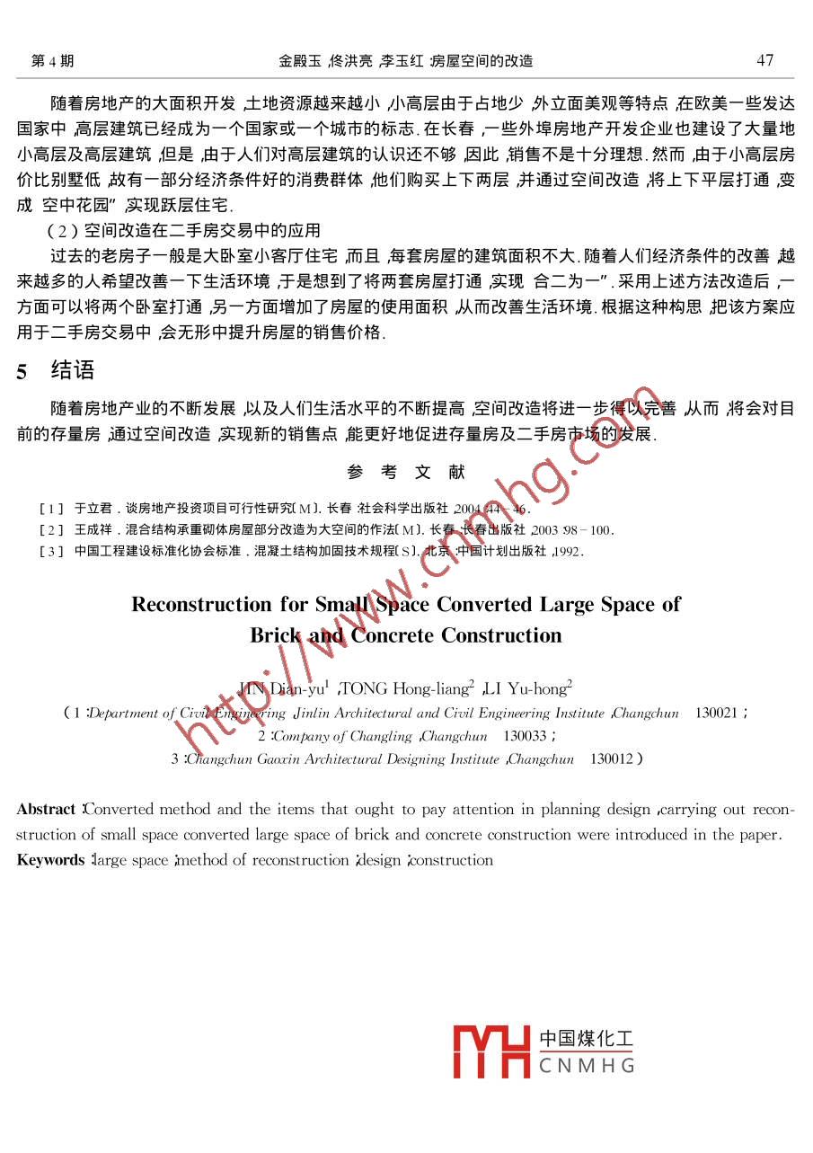 第22卷第4期吉林建筑工程學(xué)院學(xué)報(bào)2005年12月Journal of Jilin Architectural and Civil Engineering InstituteDec.2005文章編號(hào):1009-128X2005)4004503房屋空間的改造金殿玉佟洪亮2李玉紅31吉林建筑工程學(xué)院土木工程系長(zhǎng)春130021;2:春長(zhǎng)鈴集團(tuán)長(zhǎng)春1300333長(zhǎng)春高新建筑設(shè)計(jì)院長(zhǎng)春130012)摘要介紹了空間改造的意義闡述了空間改造在設(shè)計(jì)施工方面的做法及要求尤其是對(duì)目前常見(jiàn)幾種結(jié)構(gòu)形式房屋的改造提岀了具體的設(shè)計(jì)方法并結(jié)合房地產(chǎn)的現(xiàn)狀論述了做好房屋的空間改造將對(duì)房地產(chǎn)的營(yíng)銷起到積極促進(jìn)作用關(guān)鍵詞大空間改造方法沒(méi)計(jì)施工浞銷中圖分類號(hào):IU5文獻(xiàn)標(biāo)識(shí)碼:A目前隨著房地產(chǎn)業(yè)的不斷發(fā)展二手房交易市場(chǎng)的不斷成熟市場(chǎng)上出現(xiàn)了兩種消費(fèi)群體.一種是某些經(jīng)濟(jì)實(shí)力較強(qiáng)又不想張揚(yáng)的群體他們不去購(gòu)買那些高檔旳別墅而是適時(shí)選擇一些高檔的小區(qū)和那些采光好的小高層或高層將樓上樓下打通變成空中花園”從而達(dá)到舒適生活的目的一種則是剛剛步入社會(huì)的青年以及工資收入相對(duì)較低的群體由于經(jīng)濟(jì)方面的原因他們只能購(gòu)買或居住原有的二手房而二手房大多是20世紀(jì)80年代、90年代初期建設(shè)的房屋的戶型大多比較單一,以小三室或二室半為主居住這類房屋的住戶大多向往大開(kāi)間的房屋希望把原有小開(kāi)間的房屋改為大開(kāi)間那么如何把這兩種消費(fèi)群體的需要變?yōu)楝F(xiàn)實(shí)是擺在結(jié)構(gòu)設(shè)計(jì)人員及施工人員面前一個(gè)不小的課題冋時(shí)解決好空間改造問(wèn)題將對(duì)房屋的營(yíng)銷起到積極的促進(jìn)作用1空間改造的必要性1.1促進(jìn)房地產(chǎn)的營(yíng)銷工作進(jìn)入21世紀(jì)房地產(chǎn)市場(chǎng)競(jìng)爭(zhēng)變得更加激烈目前已達(dá)到了白熱化的程度各大房地產(chǎn)商紛紛推出各種營(yíng)銷策略戶型設(shè)計(jì)也變得五花八門岀現(xiàn)了多層、小高層、聯(lián)排別墅、雙拼別墅、獨(dú)立別墅、獨(dú)院別墅、雙復(fù)式、假?gòu)?fù)式、空中花園、空中庭院等概念對(duì)于那些中高檔小區(qū)的中小戶型極少有人問(wèn)津.隨著人們生活水平的不斷提高大空間的向往是必然的因此那些存量房的空間改造對(duì)開(kāi)發(fā)商來(lái)講變得尤為重要.通過(guò)改造可以改變房屋的使用功能從而促進(jìn)房屋的銷售盤活房地產(chǎn)的資產(chǎn),1.2滿足部分消費(fèi)群體的需求部分很早就已購(gòu)買房屋的消費(fèi)者多數(shù)是工薪階層其房屋基本是公司的福利房或是安居房這樣的房屋大多屋大廳小隨著房地產(chǎn)的不斷發(fā)展這部分消費(fèi)群體也要求改造房屋的空間改變?cè)械母窬忠詽M足改善住宅條件的要求12空間改造在設(shè)計(jì)方面的要求(1)對(duì)于磚混結(jié)構(gòu)的房屋現(xiàn)空間改造大多數(shù)是部分V中國(guó)煤化工戶合“的目的目前普遍采用雙側(cè)幫梁做法當(dāng)住戶對(duì)幫梁外觀質(zhì)量要求相對(duì)較CNMH法去這樣做的好處是從外觀上看根本看不出改造的跡象但對(duì)技術(shù)要求很高具體力法如①當(dāng)雙梁位置處的墻體為370mm厚時(shí)經(jīng)結(jié)構(gòu)計(jì)算/2厚墻體可承受上部傳來(lái)的荷載時(shí)可用此法收稿日期2005作者簡(jiǎn)敵據(jù)1962-)男吉林省長(zhǎng)春市人副教授吉林建筑工程學(xué)院學(xué)報(bào)第22卷若為240mm厚墻體時(shí),梁可設(shè)計(jì)成180mm×120mm寬雙梁.這種方法適用于跨度、荷載不大的情況2g20@500220@500②雙梁中間參照梁拉結(jié)筋的構(gòu)造要求用直徑不小于20mm的螺紋鋼,每間距500mm上、下連結(jié)筋拉結(jié)b/2b/2③施工時(shí)先鑿一側(cè)梁窩即鑿為樓板下梁高范圍內(nèi)磚墻,且每隔500mm用直圖1雙側(cè)幫梁圖2雙側(cè)幫梁徑為25mm的螺紋鋼筋支撐以防失穩(wěn)④用電錘在連接筋位置鉆透另側(cè)磚墻再布此梁鋼筋骨架預(yù)埋雙梁水平拉結(jié)筋從側(cè)面澆入含膨脹劑的混凝土⑤混凝土養(yǎng)護(hù)至設(shè)計(jì)強(qiáng)度再鑿另一側(cè)剩余梁窩并把先澆的梁內(nèi)側(cè)鑿毛、布筋、澆微膨脹混凝土養(yǎng)護(hù)至設(shè)計(jì)強(qiáng)度⑥拆除下部墻體需小心施工不可過(guò)界以免損害上部雙梁⑦當(dāng)原有房屋可吊頂或?qū)γ烙^要求不十分嚴(yán)格情況下,可采用圖2方法施工這種方法的優(yōu)點(diǎn)是施工方便快捷但不足之處是外觀不美觀具體方法如下2]:a)先支頂層樓板鑿毛該層設(shè)梁位置的墻面)每隔50mm沿梁長(zhǎng)方向鉆梁與墻拉結(jié)孔且沿梁底每隔1000mm掏120mm×120mm孔洞內(nèi)配2根直徑不小于10mm的拉結(jié)筋d)支梁兩側(cè)模板布設(shè)鋼筋骨架由側(cè)面澆混凝土2)對(duì)于框架結(jié)構(gòu)由于墻體不受力故在改造上比較簡(jiǎn)單只要考慮原有的墻體穿線管等問(wèn)題即可當(dāng)設(shè)計(jì)人員進(jìn)行磚混結(jié)構(gòu)房屋改造設(shè)計(jì)時(shí)應(yīng)注意以下事項(xiàng)①后澆梁注意同疊合梁一樣應(yīng)力應(yīng)變有滯后現(xiàn)象應(yīng)盡量卸荷后再施工這樣可以保證后澆梁的