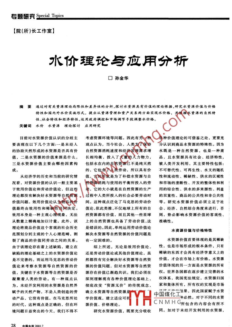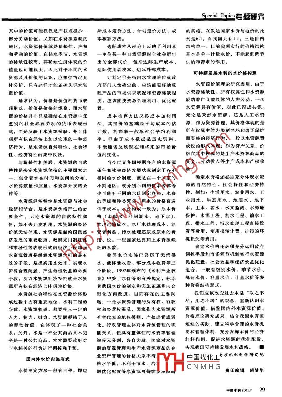 專(zhuān)題研究Special Topics[院(所)長(zhǎng)工作室]水價(jià)理論與應(yīng)用分析口孫金華摘要通過(guò)對(duì)有關(guān)資源理論局限性和差異性的分析,探討水資源具有價(jià)值的理論根據(jù),研究水資源價(jià)值與價(jià)格特性和國(guó)內(nèi)外水價(jià)實(shí)施形式,提出從資源管理和資產(chǎn)關(guān)系兩方面實(shí)現(xiàn)水價(jià)格,并根據(jù)水資源的自然特性、社會(huì)特性和經(jīng)濟(jì)特性,運(yùn)用政府調(diào)控和市場(chǎng)調(diào)節(jié)手段調(diào)整水價(jià)格。關(guān)鍵詞水價(jià)水資源理論探討 應(yīng)用 研究目前對(duì)水資源價(jià)值認(rèn)識(shí)的分歧主考慮資源環(huán)境等問(wèn)題。因此有另一種各種價(jià)值理論的可借鑒之處,更要充要表現(xiàn)在以下幾個(gè)方面:一- 是未經(jīng)人觀點(diǎn)認(rèn)為,當(dāng)今社會(huì),人類(lèi)為了保持分認(rèn)識(shí)到商品水資源的特殊性。因?yàn)榈膮f(xié)助天然形成的水資源是否具有價(jià)自然資源消耗速度和經(jīng)濟(jì)發(fā)展需求增水既是一種自然資源,也是一種商值,二是水資源的價(jià)值來(lái)源是什么,長(zhǎng)相均衡, 投入了大量的人力物力,品,且水資源具有社會(huì)、經(jīng)濟(jì)特性,三是水資源價(jià)值主要由哪些因素構(gòu)包括水在內(nèi)的自然資源已不是純天然被人類(lèi)開(kāi)發(fā)利用,其主要特性包括:成。的,它包含了人類(lèi)勞動(dòng),所以具有價(jià)不可替代性、可再生性、水文的隨機(jī)從經(jīng)濟(jì)學(xué)的歷史和當(dāng)前的研究情值。它的形成是為了補(bǔ)償水資源與自.性和流動(dòng)性、稀缺性、供水的區(qū)域性況看,對(duì)資源價(jià)值的認(rèn)識(shí)一般主要基然資源消耗與使用的平衡所投人的勞和市場(chǎng)的壟斷性、開(kāi)發(fā)的整體性和利于效用價(jià)值論和勞動(dòng)價(jià)值論,但這些動(dòng),它的大小就是在自然資源的生產(chǎn)用的綜合性、供水的多來(lái)源性、利益理論都沒(méi)有解決好水資源等自然資源過(guò)程中人類(lèi)所投入的社會(huì)必要?jiǎng)趧?dòng)時(shí)的雙重性、商品的公共性和非公共性?xún)r(jià)值問(wèn)題。效用價(jià)值論認(rèn)為物品的價(jià)間。這種觀點(diǎn)泛化了馬克思的勞動(dòng)價(jià)等。研究水資源價(jià)值必須立足于社值最終由效用性和稀缺性共同決定。值論,依此類(lèi)推,不僅地球上所有的自會(huì)、經(jīng)濟(jì)、自然綜合角度來(lái)進(jìn)行,否效用本身是- -種主觀心理現(xiàn)象,無(wú)法然資源都有價(jià)值,而且其他一些星球則,勢(shì)必影響水資源價(jià)值的客觀性、從數(shù)量上精確地加以計(jì)量。此外,該上的自然資源也具備了勞動(dòng)價(jià)值,這準(zhǔn)確性。理論將商品價(jià)值這個(gè)客觀的社會(huì)歷史是錯(cuò)誤的。因此,單純運(yùn)用勞動(dòng)價(jià)值論水資源價(jià)值與價(jià)格特性范圍劃分到主觀的個(gè)人心理范疇,割解決水資源等自然資源的價(jià)值問(wèn)題是裂了商品的價(jià)值同勞動(dòng)之間的關(guān)系。有一定 困難的。水資源價(jià)值首要體現(xiàn)的是其稀缺由于該理論存在著上述缺陷,建立在綜上所述,無(wú)論是效用價(jià)值論,性,也是市場(chǎng)形成的根本條件,只有缺陷的理論基礎(chǔ)之上的水資源價(jià)值論還是勞動(dòng)價(jià)值論或其他價(jià)值理論,雖稀缺的東西才會(huì)具有經(jīng)濟(jì)學(xué)意義上的是不完善的。而運(yùn)用馬克思的勞動(dòng)價(jià)然都沒(méi)有完全解決好水資源等自然資價(jià)值,才會(huì)在市場(chǎng)上有價(jià)格。水資源值論來(lái)考察水資源等自然資源的價(jià)源的價(jià)值問(wèn)題,但對(duì)水資源等自然資價(jià)值體現(xiàn)的另一方面是水資源的所有值,關(guān)鍵在于水資源等自然資源是否源存在價(jià)值已漸趨共識(shí)。我們必須在權(quán)。世界各國(guó)都在逐步建立完善的水凝聚著人類(lèi)的勞動(dòng)。有一種觀點(diǎn)認(rèn)深刻理解現(xiàn)有各種價(jià)值理論基礎(chǔ)上,權(quán)體系,我國(guó)憲法規(guī)定,水資源歸國(guó)為,未經(jīng)開(kāi)發(fā)利用的水資源是自然界徹底改變“資源無(wú)價(jià)”的傳統(tǒng)觀念,家和集體所有,所有權(quán)的實(shí)現(xiàn)是市場(chǎng)賦予的天然產(chǎn)物,不是人類(lèi)創(chuàng)造的勞確立水資源等自然資源竹結(jié)果,因此國(guó)家賦予水資動(dòng)產(chǎn)品,它沒(méi)有價(jià)值。在馬克思所處學(xué)價(jià)值觀,建立適應(yīng)可中國(guó)煤化工E中必然。對(duì)于不同的水資的時(shí)代,這種觀點(diǎn)是正確的,但在環(huán)源價(jià)值、價(jià)格理論。TYHCN M H G所包含的內(nèi)容會(huì)有所不境問(wèn)題日益突出的今天,我們不得不研究水資源價(jià)值,既要充分吸收同。如對(duì)于未經(jīng)開(kāi)發(fā)利用的水資源,28中 國(guó)水利20.7Speial Topics專(zhuān)題研究其中的價(jià)值可能僅僅是產(chǎn)權(quán)或極少一際成本定價(jià)方法、計(jì)劃定價(jià)方法、成的實(shí)施。在發(fā)達(dá)國(guó)家水價(jià)與電價(jià)的比部分勞動(dòng)價(jià)值。又如在水資源緊缺的本核算方法。例是6:1,而我國(guó)只有1:1。三是價(jià)格地區(qū),水資源價(jià)值就是稀缺性、產(chǎn)權(q