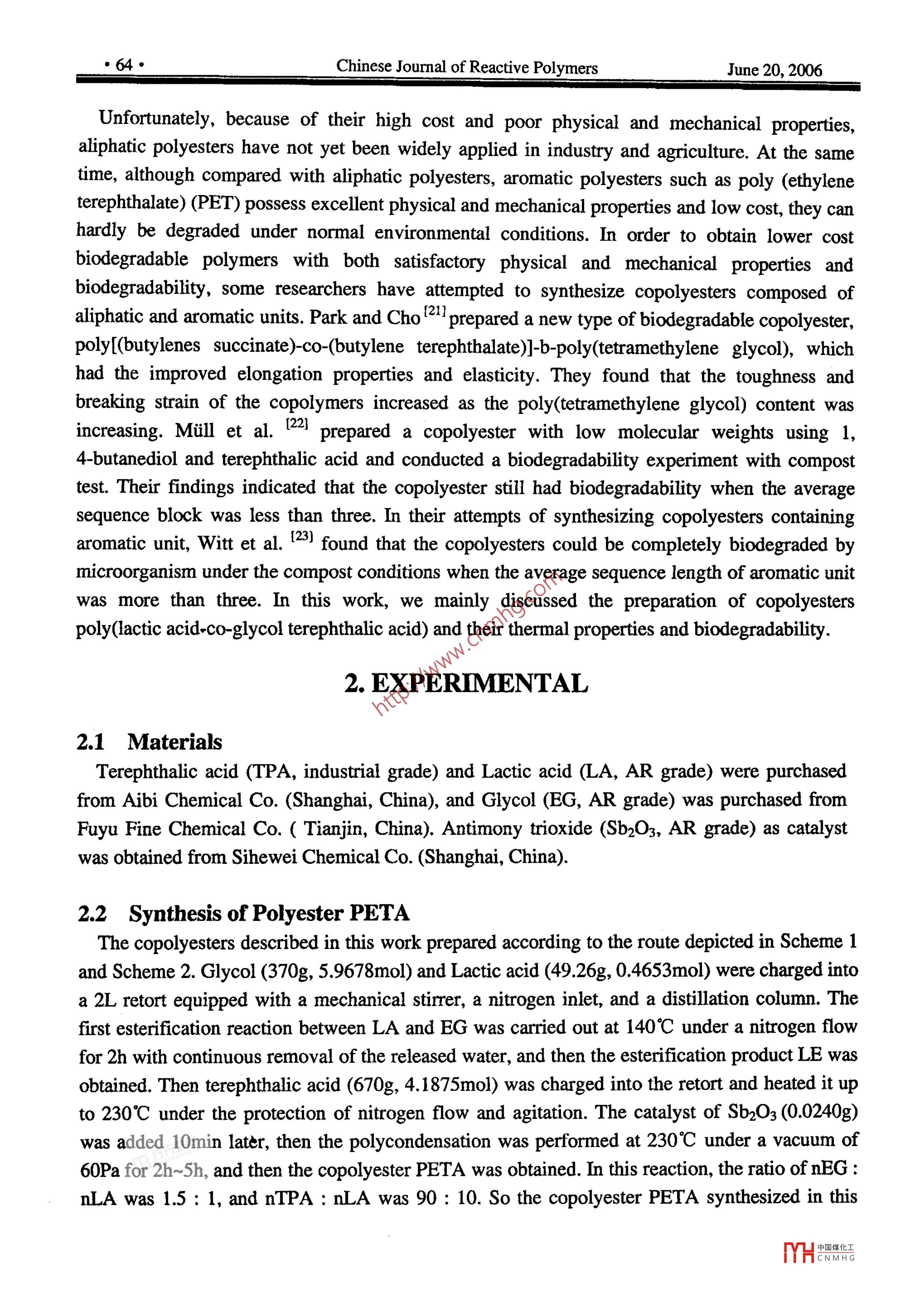 - 期刊名字:反應(yīng)性高分子(英文版)