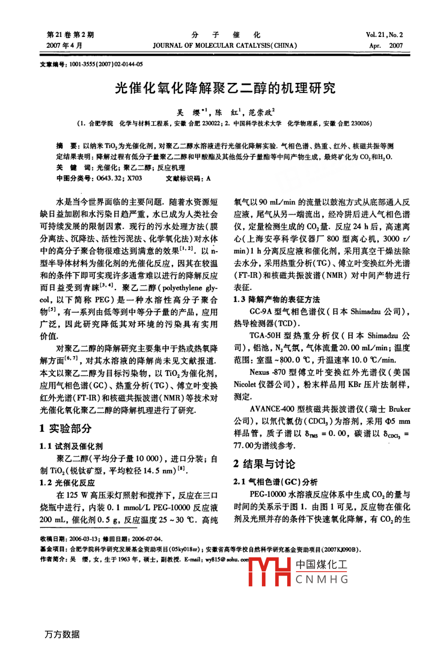 第21卷第2期分子催化Vol. 21 ,No.22007年4月.JOURNAL OF MOLECULAR CATALYSIS( CHINA)Apr.2007文章編號(hào): 10155070201445光催化氧化降解聚乙二醇的機(jī)理研究吳纓"',陳紅',范崇政“(1.合肥學(xué)院化學(xué)與材料工程系, 安徽合肥230022; 2.中國(guó)科學(xué)技術(shù)大學(xué)化學(xué)物理系, 安徽合肥230026)摘要: 以納米TiO2為光催化劑,對(duì)聚乙二醇水溶液進(jìn)行光催化降解實(shí)驗(yàn).氣相色譜、熱重、紅外、核磁共振等測(cè)定結(jié)果表明:降解過(guò)程有低分子量聚乙二醇和甲酸酯及其他低分子量酯等中間產(chǎn)物生成,最終礦化為CO,和H20.關(guān)鍵詞:光催化;聚乙二醇;反應(yīng)機(jī)理中圖分類號(hào): 0643. 32; X703文獻(xiàn)標(biāo)識(shí)碼: A水是當(dāng)今世界面臨的主要問(wèn)題.隨著水資源短氧氣以90 mL/min的流量以鼓泡方式從底部通人反缺日益加劇和水污染日趨嚴(yán)重,水已成為人類社會(huì)應(yīng)液,尾氣從另一端流出,經(jīng)冷阱后進(jìn)入氣相色譜可持續(xù)發(fā)展的限制因素.現(xiàn)行的污水處理方法(膜儀,定量檢測(cè)生成的CO2量.反應(yīng)24 h后,高速離分離法、沉降法、活性污泥法、化學(xué)氧化法)對(duì)水體心(上海安亭科學(xué)儀器廠800型離心機(jī), 3000 r/中的高分子聚合物很難達(dá)到滿意的效果(1.2].以n- min)1 h分離反應(yīng)液和催化劑,采用真空干燥法除型半導(dǎo)體材料為催化劑的光催化反應(yīng),因其在較溫去水分,采用熱重分析(TG)、傅立葉變換紅外光譜和的條件下即可實(shí)現(xiàn)許多通常難以進(jìn)行的降解反應(yīng)(FT-IR) 和核磁共振波譜( NMR)對(duì)中間產(chǎn)物進(jìn)行而日益受到青睞[.4].聚乙二醇( polyelhylene gly~-表征.col,以下簡(jiǎn)稱PEG)是一種水溶性高分子聚合1.3降解產(chǎn)物的表征方法物[5],有一系列由低等到中等分子量的產(chǎn)品,應(yīng)用CC-9A 型氣相色譜儀(日本Shimadzu公司),廣泛,因此研究降低其對(duì)環(huán)境的污染具有實(shí)用熱導(dǎo)檢測(cè)器(TCD).價(jià)值.TGA-50H型熱重分析儀(日本Shimadzu公對(duì)聚乙二醇的降解研究主要集中于熱或熱氧降司),鋁池, N2氣氛,氣體流量20. 00 mL/min;溫度解方面(6.],對(duì)其水溶液的降解尚未見(jiàn)文獻(xiàn)報(bào)道.范圍: 室溫~800.0 C,升溫速率10.0 C/min.本文以聚乙二醇為目標(biāo)污染物,以TiO2為催化劑,Nexus -870 型傅立葉變換紅外光譜儀(美國(guó)應(yīng)用氣相色譜(CC)、熱重分析(TC)、傅立葉變換Nicolet 儀器公司),粉末樣品用KBr壓片法制樣,紅外光譜( FT-IR)和核磁共振波譜( NMR)等技術(shù)對(duì)測(cè)定.光催化氧化聚乙二醇的降解機(jī)理進(jìn)行了研究.AVANCE400型核磁共振波譜儀(瑞士Bruker公司),以氚代氯仿(CDCI,)為溶劑,采用5 mm1實(shí)驗(yàn)部分樣品管,質(zhì)子譜以8ms=0.00,碳譜以8cDas, =1.1試劑及催化劑.77. 00為譜線參考.聚乙二醇(平均分子量10 000),進(jìn)口分裝;自2結(jié)果與討論制Ti02(銳鈦礦型,平均粒徑14. 5 nm)間.1.2光催化反應(yīng)2.1氣相色譜(GC)分析在125 W高壓汞燈照射和攪拌下,反應(yīng)在三口PEC-10000水溶液反應(yīng)體系中生成CO2的量與燒瓶中進(jìn)行,內(nèi)裝0. 1 mmo/L PEG-10000反應(yīng)液時(shí)間的關(guān)系示于圖1. 由圖1可見(jiàn),反應(yīng)物在催化200 mL,催化劑0.5 g,反應(yīng)溫度25 ~30 C.高純劑及光照并存的條件 下快速氧化降解,有CO2的生收稿日期: 2006-03-13;修回日期: 2006-0704.基金項(xiàng)目:合肥學(xué)院科學(xué)研究發(fā)展基金資助項(xiàng)目(05ky018x) ;安徽省高等學(xué)校自然科學(xué)研究基金資助項(xiàng)目(2007KJ090B).作者簡(jiǎn)介:吳纓, 女,生于1963年,碩土,副教授. E-mal; wy815@ sohu. con中國(guó)煤化工TYHCNMHG45第2期成,且催化劑在光的作用下有一一個(gè)被激發(fā)活化的-OH締合峰,是結(jié)構(gòu)水的- OH彎曲振動(dòng).536cm-處的強(qiáng)吸收寬峰為[Ti0,]人面體中的TI -0過(guò)程.的振動(dòng)吸收峰.圖3中曲線b、e吩別為光照前及光照后吸附Y(jié)AeTlme (向)圖1光催化氧化PEC10000所產(chǎn)生的VgfiCO2濃度與時(shí)間的關(guān)系Fig 1 Concentations ofCO2 formed by the300 20001000phoatalytie oxidation of PE-10000圖3純TO,及光催化反應(yīng)前后吸附PEC的TIO2vs time in oulet傅立葉變換紅外光譜圖對(duì)比實(shí)驗(yàn)表明,上述反應(yīng)只有在光照和催化劑Fig.3 FT-IR epecras of pure TO2(a) and TiO2同時(shí)存在的條件下方可進(jìn)行.abeorbed by PE-1000 sample; belfore2.2熱重分析(TG)degradaioan (b) and sfer 24 h degatio(o)對(duì)反應(yīng)物PEC-10000反應(yīng)前和降解24 h后中在TIO,粉末上PEC體系的紅外光譜.對(duì)比發(fā)現(xiàn),由間產(chǎn)物用熱重分析儀測(cè)出樣品的TC曲線圖2.從于催化劑表面吸附有PEG和微量水,在3 448 cm^'附近吸收峰增寬PEG光照前在1710 ~1 750 em~'100處無(wú)特征吸收蜂,而光照24h后,可觀察到在1 744 cm~'對(duì)應(yīng)有酯羰基的伸縮振動(dòng)吸收峰,說(shuō)明反應(yīng)后的溶液中存在酯類降解產(chǎn)物[0],而1 107cm-'處為酯基中的醚氧基(C-0-C)與PEG結(jié)構(gòu).中的C-O- C骨架伸縮振動(dòng)重合,這與Scheirsn00600和Han[0等人的研究報(bào)道基本- -致.Tempersture(C )2.4核磁共振波譜(NMR)分析圖2光降解前后PEC-1000的熱重曲線對(duì)反應(yīng)前后的樣品除獲取'H- NMR和”C-Fig.2 TG ceurves of PEG-10000 sampleeNMR譜圖外,還進(jìn)行同核相關(guān)實(shí)驗(yàn)(COSY),因?yàn)閎efore degnadation and ater 24 h d