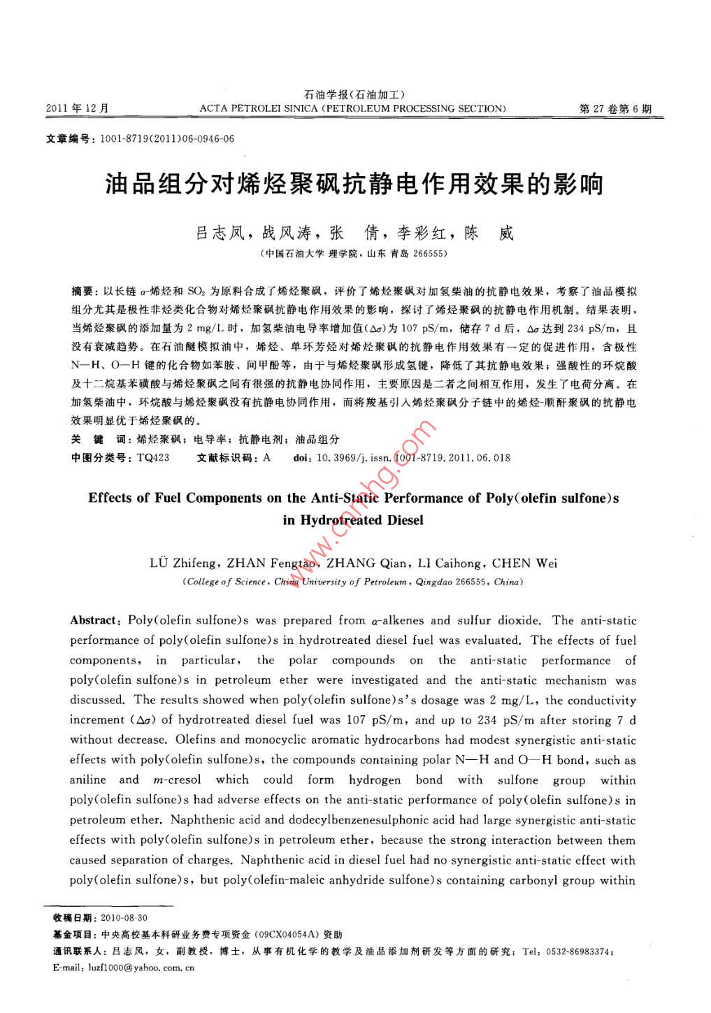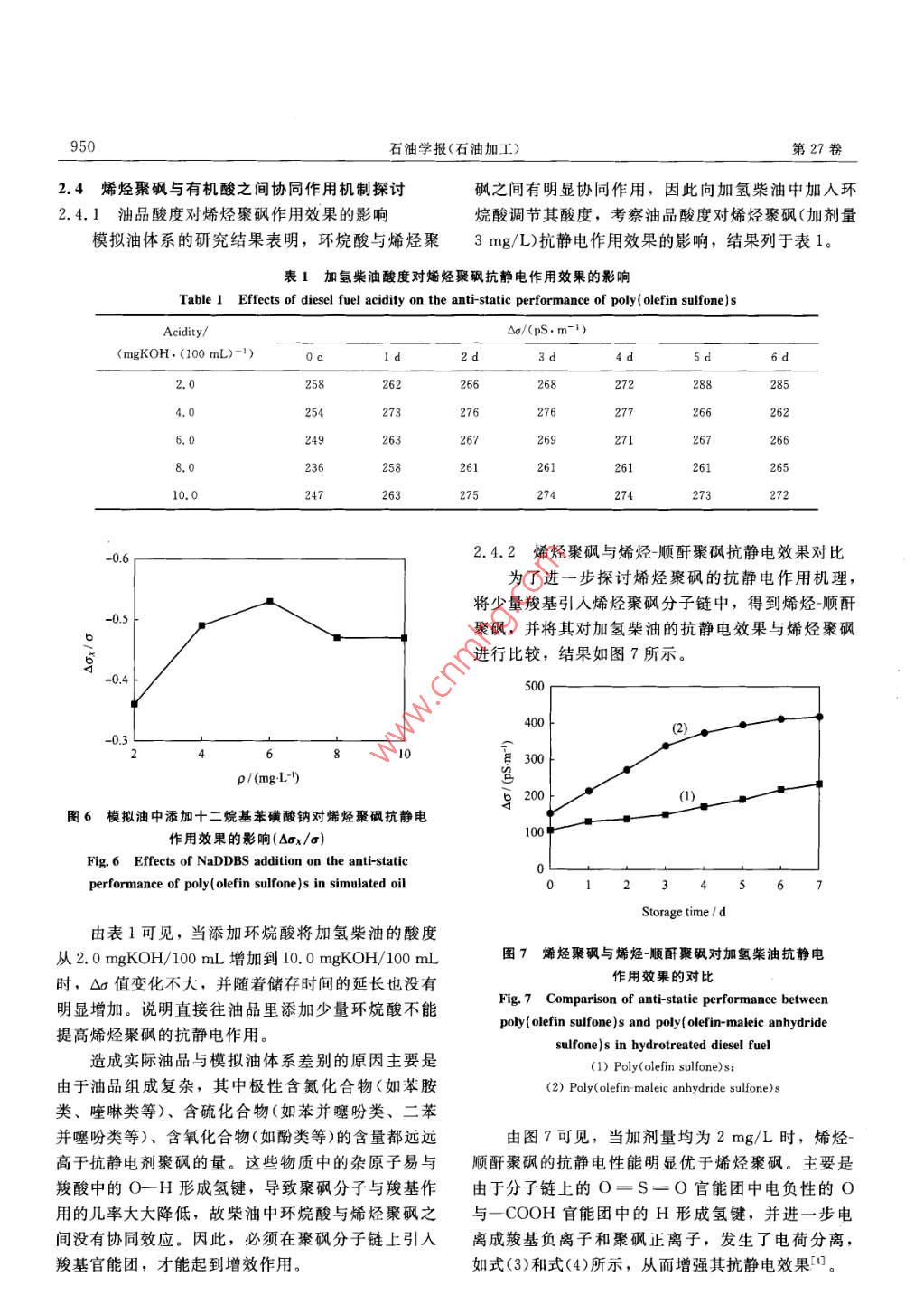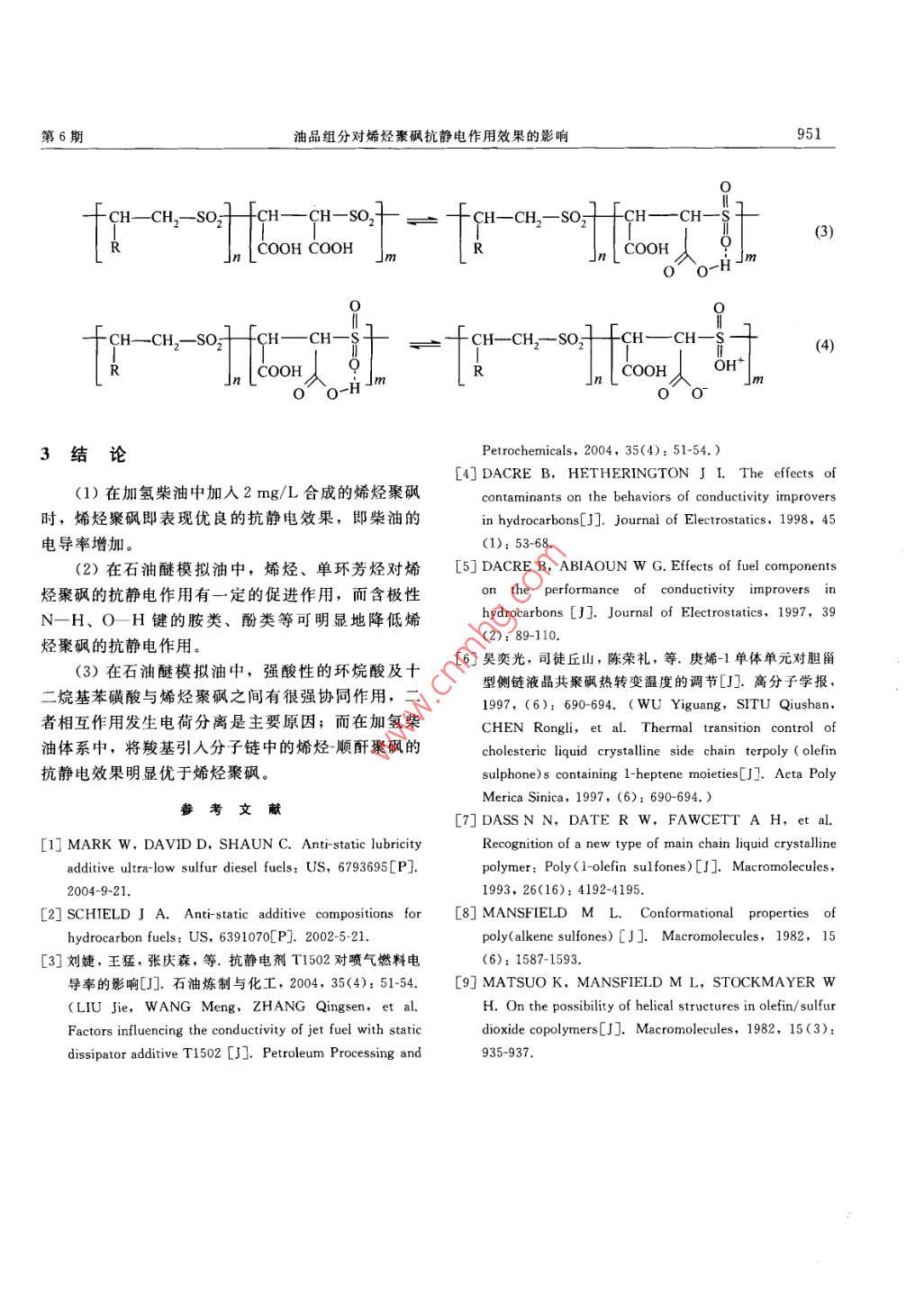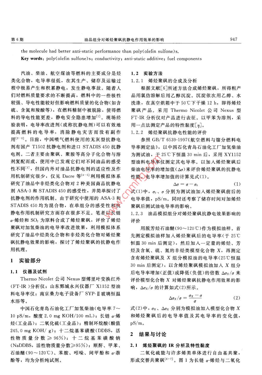 石油學(xué)報(bào)(石油加工)2011年12月ACTA PETROLEI SINICA (PETROLEUM PROCESSING SECTION)第27卷第6期文章編號(hào): 1001-8719(2011)06-0946-06油品組分對(duì)烯烴聚砜抗靜電作用效果的影響呂志鳳,戰(zhàn)風(fēng)濤,張倩,李彩紅,陳威(中國(guó)石油大學(xué)理學(xué)院,山東青島2655摘要:以長(zhǎng)鏈a-烯烴和SO2為原料合成了烯烴聚砜,評(píng)價(jià)了烯烴聚砜對(duì)加氫柴油的抗靜電效果,考察了油品模擬組分尤其是極性非烴類(lèi)化合物對(duì)烯烴聚砜抗靜電作用效果的影響,探討了烯烴聚砜的抗靜電作用機(jī)制。結(jié)果表明,當(dāng)烯烴聚砜的添加量為2 mg/L時(shí),加氫柴油電導(dǎo)率增加值(Oo)為107 pS/m,儲(chǔ)存7 d后,Oo達(dá)到234 pS/m,且沒(méi)有衰減趨勢(shì)。在石油醚模擬油中,烯烴、單環(huán)芳烴對(duì)烯烴聚砜的抗靜電作用效果有一定的促進(jìn)作用,含極性N-H、0- -H鍵的化合物如苯胺、間甲酚等,由于與烯烴聚砜形成氫鍵,降低了其抗靜電效果;強(qiáng)酸性的環(huán)烷酸及十二烷基苯磺酸與烯烴聚砜之間有很強(qiáng)的抗靜電協(xié)同作用,主要原因是二者之間相互作用,發(fā)生了電荷分離。在加氫柴油中,環(huán)烷酸與烯烴聚砜沒(méi)有抗靜電協(xié)同作用,而將羧基引入烯烴聚砜分子鏈中的烯烴-順酐聚砜的抗靜電效果明顯優(yōu)于烯烴聚砜的。關(guān)鍵詞:烯烴聚砜;電導(dǎo)率;抗靜電劑;油品組分中圖分類(lèi)號(hào): TQ423文獻(xiàn)標(biāo)識(shí)碼: Adoi: 10. 3969/i. issn. 1001-8719. 2011. 06.018Effects of Fuel Components on the Anti-Static Performance of Poly( olefin sulfone)sin Hydrotreated DieselLU Zhifeng, ZHAN Fengtao, ZHANG Qian, LI Caihong, CHEN Wei(College of Science, China University of Petroleum , Qingdao 26555. China)Abstract: Poly( olefin sulfone)s was prepared from a-alkenes and sulfur dioxide. The anti-staticperformance of poly(olefin sulfone)s in hydrotreated diesel fuel was evaluated. The effects of fuelcomponents, in particular, the polar compounds on the anti-static performance ofpoly(olefin sulfone)s in petroleum ether were investigated and the anti-static mechanism wasdiscussed. The results showed when poly(olefin sulfone)s's dosage was 2 mg/L, the conductivityincrement (Oo) of hydrotreated diesel fuel was 107 pS/m, and up to 234 pS/m after storing 7 dwithout decrease. Olefins and monocyclic aromatic hydrocarbons had modest synergistic anti-staticeffects with poly(olefin sulfone)s, the compounds containing polar N- -H and O- H bond, such asaniline and m-cresol whichcould form hydrogen bond with sulfone group withinpoly(olefin sulfone)s had adverse effects on the anti-static performance of poly(olefin sulfone)s inpetroleum ether. Naphthenic acid and dodecylbenzenesulphonic acid had large synergistic anti-staticeffects with poly(olefin sulfone)s in petroleum ether, because the strong interaction between themcaused separation of charges. Naphthenic acid in diesel fuel had no synergistic anti-static effect withpoly( olefin sulfone)s, but poly( olefin-maleic anhydride sulfone)s containing carbonyl group within收稿日期: 2010-08 30基金項(xiàng)目:中央高校基本科研業(yè)務(wù)費(fèi)專(zhuān)項(xiàng)資金(09CX04054A)資助通訊聯(lián)系人:呂志鳳,女,副教授,博士,從事有機(jī)化學(xué)的教學(xué)及油品添加劑研發(fā)等方面的研究; Tel: 0532-86983374;E-mail: luzf1000@ yahoo, com. cn第6期油品組分對(duì)烯烴聚砜抗靜電作用效果的影響947the molecule had better anti-static performance than poly( olefin sulfone)s.Key words: poly( olefin sulfone)s; conductivity; anti-static additive; fuel components汽油、柴油、航空煤油等燃料的主要成分是烴1.2實(shí)驗(yàn)方法類(lèi)化合物,電導(dǎo)率很低,在其生產(chǎn)、儲(chǔ)存及運(yùn)輸過(guò)1.2.1烯烴聚砜的合 成及分析程中極易產(chǎn)生和積累靜電,發(fā)生靜電事故。隨著人根據(jù)文獻(xiàn)[6]所述方法合成烯烴聚砜,所得粗產(chǎn)們對(duì)燃料質(zhì)量要求的不斷提高,燃料中的一些極性品用氯仿溶解后用乙醇沉淀。沉淀依次用乙醇、水較強(qiáng)、導(dǎo)電性能較好但影響燃料質(zhì)量的化合物(如含洗滌,在真空烘箱中于50C下干燥12 h,即得烯烴硫、含氮和羧酸等),在燃料精制中被脫除,使得燃聚砜產(chǎn)品。采用Thermo Nicolet 公司Nexus 型料的導(dǎo)電性能更差,靜電安全隱患增加?,F(xiàn)場(chǎng)經(jīng)FT-IR分析儀對(duì)產(chǎn)品進(jìn)行表征。以甲苯為溶劑,采驗(yàn)表明,電導(dǎo)率改進(jìn)劑(或稱(chēng)抗靜電劑)可以有效地用一點(diǎn)法測(cè)定產(chǎn)品的特性黏度[η]。提高燃料的電導(dǎo)率,消除靜電災(zāi)害而沒(méi)有副作1.2.2烯烴聚砜抗靜電性能的評(píng)價(jià)用°3。目前,中國(guó)噴氣燃料使用的無(wú)灰型抗靜電參照GB/T 6539-1997《航空燃料與餾分燃料電劑有國(guó)產(chǎn)T1502抗靜電劑和進(jìn)口STADIS450抗靜導(dǎo)率測(cè)定法》,以中國(guó)石化青島石油化工廠加氫柴油.電劑。二者主要由聚砜、聚胺等高分子化合物與溶為測(cè)試油,于25C下恒溫30 min后,采用XY1152劑復(fù)配而成,使用中已發(fā)現(xiàn)它們對(duì)不同油品的感受型油料電導(dǎo)率儀測(cè)定其電導(dǎo)率。以加入烯烴聚砜后性不同時(shí),但國(guó)內(nèi)外對(duì)油品抗靜電劑的適應(yīng)性及作柴油電導(dǎo)率的增加值(Oo)來(lái)評(píng)價(jià)烯烴聚砜的抗靜電用機(jī)制研究很少,僅見(jiàn)Dacre等[4-5]利用模擬體系性能,電導(dǎo)率增加值的計(jì)算見(jiàn)式(1)。研究了油品中非烴類(lèi)化合