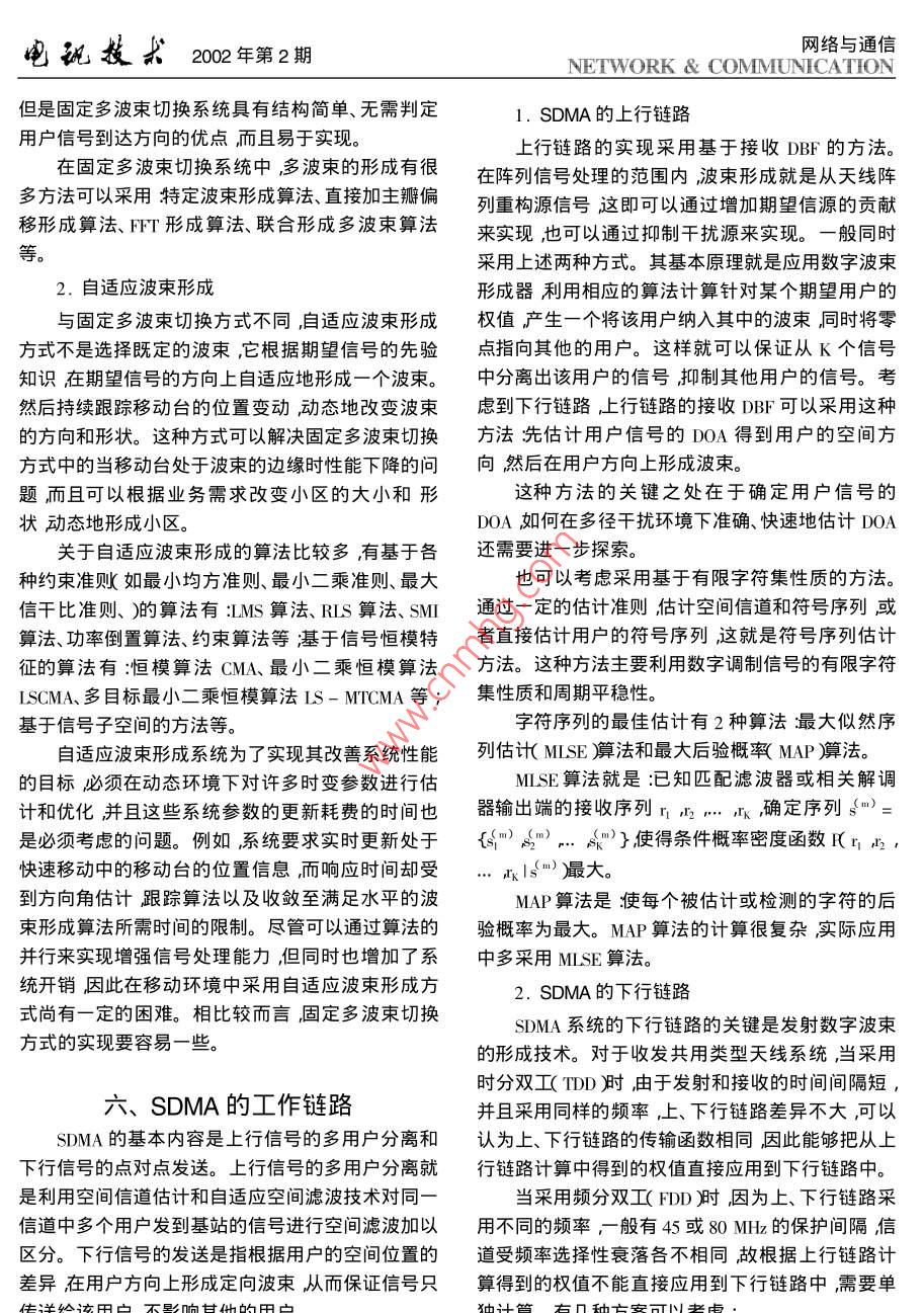 電孤技求202年第2期網(wǎng)絡(luò)與通信NETWORK COMMUNICATION文章編號(hào):1001-893X200m2-0105-0移動(dòng)通信中的空分多址技術(shù)俄廣西龔耀寰電子科技大學(xué)電子工程學(xué)院四川成都610054)摘要在信息時(shí)代人們對(duì)通信業(yè)務(wù)的需求不斷增加這對(duì)通信技術(shù)提出了更高的要求空分多址〔SMA)技術(shù)由于其在提高系統(tǒng)容量和頻譜利用率方面的獨(dú)特優(yōu)勢(shì)而引起了人們的廣泛關(guān)注。本文從基本概念、信道模型、系統(tǒng)實(shí)現(xiàn)和對(duì)通信系統(tǒng)的性能改善等幾個(gè)方面對(duì)空分多址技術(shù)進(jìn)行了較為全面的論述。關(guān)鍵詞移動(dòng)通信空分多址固定多波束切換洎適應(yīng)波束形成中圖分類號(hào)IN929.5文獻(xiàn)標(biāo)識(shí)碼:ASpatial Division Multiple access Technologyin mobile communicationE Guang-xi GONG Yao -huanElectronic Engineering School UESTC hengdu 610054, ChinaAbstract In information age the demand for communication service increases constantly. So higher requirementfor the communication technology is raised. The Spatial-Division- Multiple- Acesse( SDMA technology callsattention broadly by its unique advantage of increasing system capacity and frequency spectrum utilization. Inthis paper the authors discuss thoroughly SDMA technology from such aspects as basic concept channel modelrealization and improvement of the performance of communication systemKey words: Mobile communication "Spatial division multiple access( SDMA ) Multiple beam switch ;Adaptivebeam formin戶方向發(fā)送。SDMA在提高通信服務(wù)質(zhì)量、擴(kuò)大系引言統(tǒng)容量、提高無線資源的利用率、提高系統(tǒng)的可靠性隨著通信業(yè)務(wù)的迅猛發(fā)展和移動(dòng)通信用戶的不以及降低系統(tǒng)成本等方面有卓越的優(yōu)點(diǎn)斷增加現(xiàn)有通信體制FDMA、TDMA、CDMA的容量空分多址技術(shù)起源于雷達(dá)、聲納等軍事領(lǐng)域由已漸趨飽和如何提高無線資源的利用率成為人們于造價(jià)昂貴及其他因素,一直未能應(yīng)用于民用通信思考的重點(diǎn)。隨著陣列信號(hào)處理技術(shù)的發(fā)展空分領(lǐng)域。隨著微電子技術(shù)的飛速發(fā)展DSP芯片的價(jià)多址(SDMA: Spatial Division Multiple Access)技術(shù)可以顯著改善通信系統(tǒng)的性能其在移動(dòng)通信領(lǐng)域的格不斷下降以及數(shù)字信號(hào)處理技術(shù)的日益完善空應(yīng)用已引起人們的極大關(guān)注分多址正在向民用通信系統(tǒng)滲透。依托先進(jìn)的數(shù)字SDMA技術(shù)使用定向波束服務(wù)于不同的用戶信號(hào)處理技術(shù)空分多址在移動(dòng)通信系統(tǒng)中將會(huì)有控制了基站和用戶的空間輻射能量引導(dǎo)能量沿用良好的應(yīng)用前景口胡11電孤技求202年第2期網(wǎng)絡(luò)與通信NETWORK COMMUNICATION加拿大 McMaster大學(xué)研究開發(fā)了4元陣列天線采SDMA的研究現(xiàn)狀用恒模CMA算法。我國(guó)國(guó)內(nèi)部分大學(xué)也正在進(jìn)行歐、美、日等國(guó)非常重視sDMA技術(shù)在未來的移相關(guān)的研究動(dòng)通信方案中的地位與作用,已經(jīng)進(jìn)行了大量的理論分析研究同時(shí)也建立了一些技術(shù)試驗(yàn)平臺(tái)。三、SDMA的基本概念歐洲通信委員會(huì)(CEC勝在RACE計(jì)劃中實(shí)施了SDMA體制又稱空間分割,它使用陣列天線通第一階段智能天線技術(shù)研究稱之為 TSUNAMI,由過在角度域提供虛信道來控制空間。一般來說,S德國(guó)、英國(guó)、丹麥和西班牙合作完成。項(xiàng)目組在95中的120扇區(qū)分割,定多波束的切換也可以DECT基站基礎(chǔ)上構(gòu)造了智能天線試驗(yàn)?zāi)P汀L炀€認(rèn)為屬于SDMA的范疇。SDMA技術(shù)允許在一個(gè)小有8個(gè)陣元組成射頻工作頻率為1.89GHz陣元間區(qū)內(nèi)用相同的頻率、相同的時(shí)隙、相同的擴(kuò)頻碼通距可調(diào)。模型用數(shù)字波束形成的方法實(shí)現(xiàn)智能天過不同的波束為不同的用戶服務(wù)。通過使用陣列天線系統(tǒng)評(píng)估了識(shí)別信號(hào)到達(dá)方向的MUsC算法,線提供對(duì)空間的動(dòng)態(tài)控制從而增加了一個(gè)維度采用的自適應(yīng)算法有NLMS算法和RLS算法。實(shí)驗(yàn)SDMA的基本思想是引導(dǎo)能量沿用戶方向傳系統(tǒng)驗(yàn)證了智能天線的功能2個(gè)用戶4個(gè)空間信輸。通常情況下同移動(dòng)用戶的空間位置和移動(dòng)速道包括上行和下行鏈路比特差錯(cuò)率BER優(yōu)于度不同在基站一側(cè)所接收到的不同用戶的信號(hào)的I0?-3I。試驗(yàn)評(píng)測(cè)了采用 MUSIC算法判別用戶信DOA多普勒頻移和多徑結(jié)構(gòu)等特征也就不同。SD-號(hào)方向的能力同時(shí)通過現(xiàn)場(chǎng)測(cè)試表明圓環(huán)和平MA就是利用這些特征的差異通過陣列天線技術(shù)面天線適于室內(nèi)通信環(huán)境使用而在市區(qū)環(huán)境中采在用戶方向上形成定向波東在同一信道上接收和用簡(jiǎn)單的直線陣更合適。發(fā)送多個(gè)用戶信號(hào)而不發(fā)生相互干擾。實(shí)際上它使日本ATR光電通信研究所研制了基于波束空通信資源不再局限于時(shí)間域、頻率域或碼域而拓展間處理方式的多波束智能天線。天線陣元布局為間到了空間域距半波長(zhǎng)的16陣元平面方陣,射頻工作頻率是個(gè)理想的SDMA系統(tǒng)應(yīng)
