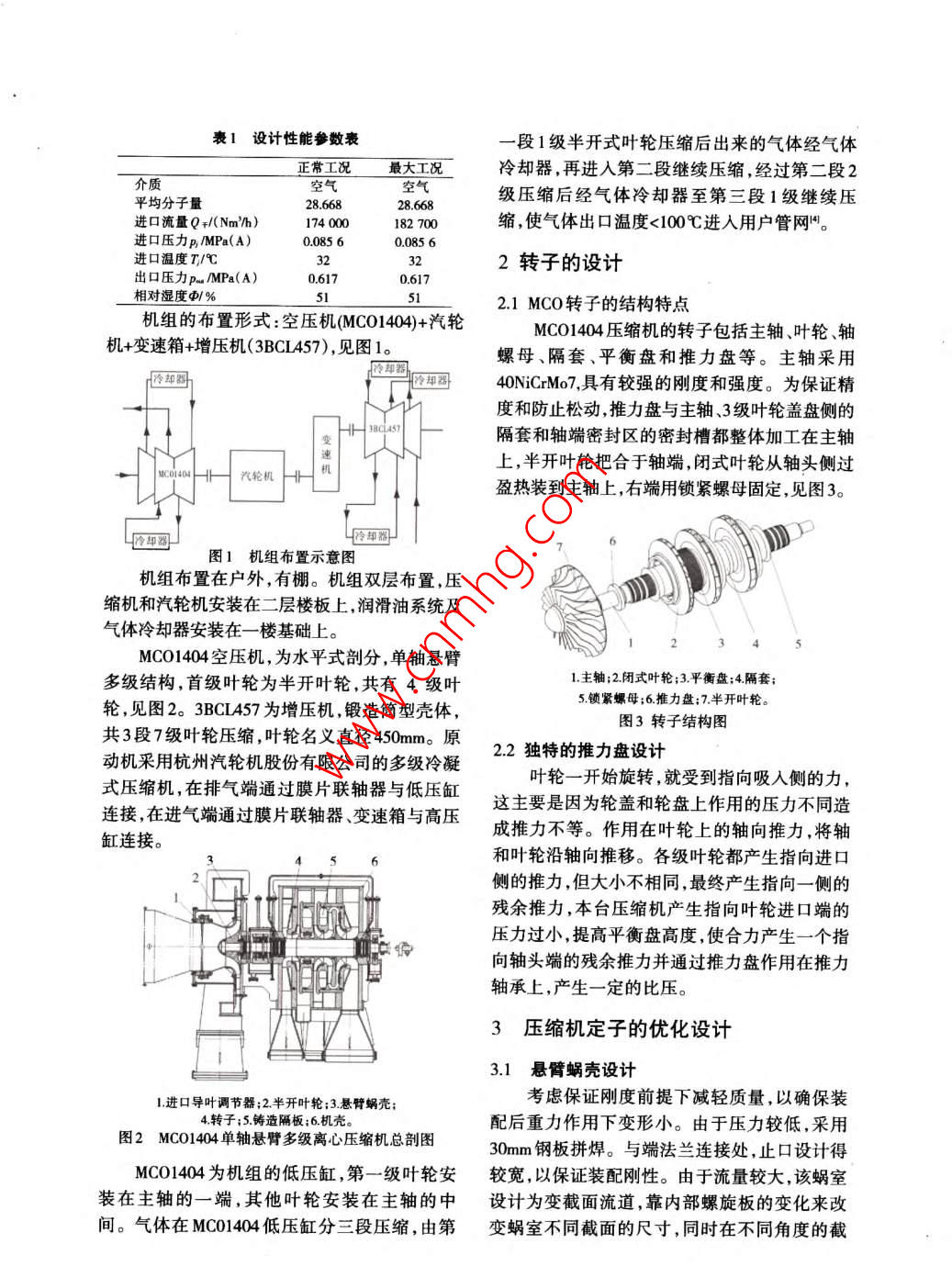 爪機(jī)找術(shù)|設(shè)計(jì)計(jì)算3萬8空分單軸懸臂多級離心壓編機(jī)的研制張玉珠齊智勇/沈陽鼓風(fēng)機(jī)集團(tuán)有限公司中圖分類號(hào):TH452文獻(xiàn)標(biāo)志碼:B設(shè)備。文章編號(hào):1006-8155(2011)06-0022-0在以往3萬Nm/h空分裝置規(guī)模上Research on3800 Air Seperation研制超過3萬Nm:h,其配套空壓機(jī)的設(shè)■摘要:闡述了3萬8 Single Shaft Overhung Multi- stage計(jì)思路和工業(yè)流程等都將發(fā)生大的變空分規(guī)模單軸懸臂多 Compressor化,技術(shù)要求和難度相應(yīng)提高。由于大級離心壓縮機(jī)的研制 Abstract: This paper has specified the型機(jī)組轉(zhuǎn)子的臨界轉(zhuǎn)速、高速平衡能力過程。以追求機(jī)組的 reseacrch process of3800 air sepera-和運(yùn)轉(zhuǎn)穩(wěn)定性等的氣動(dòng)學(xué)分析,以及大整機(jī)效率,確定最佳 tion single shaft overhung multi-stag型焊接機(jī)殼的設(shè)計(jì)制造技術(shù)難度,通常氣動(dòng)設(shè)計(jì)方案為目 compressor. Aiming at the overall仍然采用雙缸壓縮機(jī)。但是,雙缸壓縮標(biāo),從分析轉(zhuǎn)子的臨 efficiency of units., the design and機(jī)雖然結(jié)構(gòu)相對簡單卻存在著制造成界轉(zhuǎn)速和不平衡特 research on comressor are carried out本高、運(yùn)行成本高和機(jī)械損失大等缺性,優(yōu)化定子和轉(zhuǎn)子 from the points of determinting best點(diǎn)。MC型單軸懸臂多級離心壓縮機(jī)結(jié)構(gòu)等全方面進(jìn)行研比較常規(guī)雙缸壓縮機(jī),在同種設(shè)計(jì)參數(shù)發(fā)設(shè)計(jì)。機(jī)組經(jīng)過現(xiàn) the critical speed and unbalanced條件下,其多變效率提高了4%~5%場一次性試車成功, characteristics of rotor, optimizing stator制造成本大大降低,運(yùn)行更加穩(wěn)定,適應(yīng)開創(chuàng)了國產(chǎn)化先例。 d rotor structures and so on.Afer于更大范圍的工況,所以,近幾年來該系■關(guān)鍵詞:空分;壓縮 he successful test on site at the first列機(jī)型在中等規(guī)模的空分裝置中得到廣機(jī);單軸懸臂;結(jié)構(gòu)設(shè)泛的應(yīng)用。鑒于此,設(shè)計(jì)研發(fā)出3萬5以time for the unit it has create計(jì)上空分規(guī)模的MCo壓縮機(jī),是大型空分domestic precedent裝置國產(chǎn)化技術(shù)發(fā)展的關(guān)鍵。Key words: air seperation; compressor;single shaft overhung; structure desig1項(xiàng)目概述0引言根據(jù)某化肥廠一期30萬ta煤制甲醇項(xiàng)目的供貨合同需求,由沈陽鼓風(fēng)機(jī)隨著我國工業(yè)現(xiàn)代化水平的不斷集團(tuán)有限公司承擔(dān)了3萬8空分規(guī)模的提高,冶金、煤化工、化肥等裝置不斷向空壓機(jī)+增壓機(jī)組的研制任務(wù)。大型化發(fā)展,相應(yīng)的空分裝置規(guī)模也越依據(jù)與用戶簽訂的技術(shù)協(xié)議中規(guī)定來越大。作為大型空分裝置的核心設(shè)的流量、壓力溫度等技術(shù)性能參數(shù),進(jìn)備,3-5萬Nm/h空分規(guī)模的多級離心行壓縮機(jī)的氣動(dòng)性能計(jì)算,具體技術(shù)參式壓縮機(jī)組日益成為空分市場的主流數(shù)見表1收稿日期:201-05-11沈陽市110869表1設(shè)計(jì)性能參數(shù)表段1級半開式葉輪壓縮后出來的氣體經(jīng)氣體正常工況最大工況冷卻器,再進(jìn)入第二段繼續(xù)壓縮,經(jīng)過第二段2介質(zhì)空氣平均分子量2866828.668級壓縮后經(jīng)氣體冷卻器至第三段1級繼續(xù)壓進(jìn)口流量Q+/(Nmh)縮,使氣體出口溫度<100℃進(jìn)入用戶管網(wǎng)進(jìn)口壓力MPa(A)0085600856進(jìn)口溫度T/℃2轉(zhuǎn)子的設(shè)計(jì)出口壓力pMPa(A)06170617相對濕度ψ%515121MCO轉(zhuǎn)子的結(jié)構(gòu)特點(diǎn)機(jī)組的布置形式:空壓機(jī)MCO1404)+汽輪機(jī)+變速箱+增壓機(jī)(3BCI457),見圖1MCOl404壓縮機(jī)的轉(zhuǎn)子包括主軸、葉輪、軸螺母、隔套、平衡盤和推力盤等。主軸采用卻臥卻40NCrM7,具有較強(qiáng)的剛度和強(qiáng)度。為保證精度和防止松動(dòng)推力盤與主軸3級葉輪蓋盤側(cè)的變速機(jī)隔套和軸端密封區(qū)的密封槽都整體加工在主軸上,半開葉輪把合于軸端,閉式葉輪從軸頭側(cè)過汽輪機(jī)盈熱裝到主軸上,右端用鎖緊螺母固定,見圖3卻悉卻器圖1機(jī)組布置示意圖機(jī)組布置在戶外,有棚。機(jī)組雙層布置,壓縮機(jī)和汽輪機(jī)安裝在二層樓板上,潤滑油系統(tǒng)及氣體冷卻器安裝在一樓基礎(chǔ)上。MCOl404空壓機(jī),為水平式剖分,單軸懸臂多級結(jié)構(gòu),首級葉輪為半開葉輪,共有4級葉1主軸;2閉式葉輪;3平衡盤;4隔套輪,見圖2。3BCI457為增壓機(jī)鍛造筒型殼體,5鎖緊螺母:6推力盤;7半開葉輪圖3轉(zhuǎn)子結(jié)構(gòu)圖共3段7級葉輪壓縮葉輪名義直徑450mm。原動(dòng)機(jī)采用杭州汽輪機(jī)股份有限公司的多級冷凝22獨(dú)特的推力盤設(shè)計(jì)式壓縮機(jī),在排氣端通過膜片聯(lián)軸器與低壓缸葉輪一開始旋轉(zhuǎn),就受到指向吸入側(cè)的力,連接,在進(jìn)氣端通過膜片聯(lián)軸器、變速箱與高壓這主要是因?yàn)檩喩w和輪盤上作用的壓力不同造缸連接。成推力不等。作用在葉輪上的軸向推力,將軸5和葉輪沿軸向推移。各級葉輪都產(chǎn)生指向進(jìn)口側(cè)的推力,但大小不相同,最終產(chǎn)生指向一側(cè)的殘余推力本臺(tái)壓縮機(jī)產(chǎn)生指向葉輪進(jìn)口端的壓力過小,提高平衡盤高度,使合力
