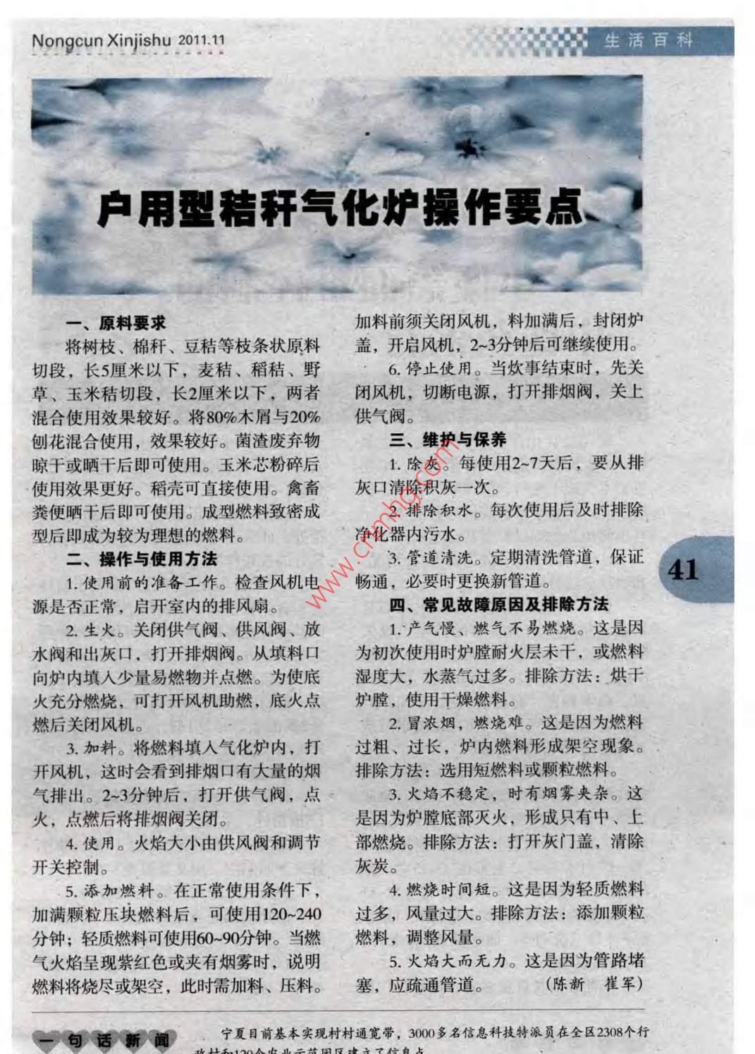 Nongcun Xinjishu 2011.11生活百科戶用型秸稈氣化爐操作要點-、原料要求加料前須關(guān)閉風(fēng)機,料加滿后,封閉爐將樹枝、棉稈、豆秸等枝條狀原料蓋,開啟風(fēng)機,2~3分鐘后可繼續(xù)使用。切段,長5厘米以下,麥秸、稻秸、野6.停止使用。當(dāng)炊事結(jié)束時,先關(guān)草、玉米秸切段,長2厘米以下,兩者閉風(fēng)機,切斷電源,打開排煙閥,關(guān)上混合使用效果較好。將80%木屑與20%供氣閥。刨花混合使用,效果較好。菌渣廢棄物三、維護(hù)與保養(yǎng)晾干或曬干后即可使用。玉米芯粉碎后1.除灰。每使用2~7天后,要從排使用效果更好。稻殼可直接使用。禽畜灰口清除積灰一次。糞便曬干后即可使用。成型燃料致密成2.排除積水。每次使用后及時排除型后即成為較為理想的燃料。凈化器內(nèi)污水。二、操作與使用方法3.管道清洗。定期清洗管道,保證411.使用前的準(zhǔn)備工作。檢查風(fēng)機電暢通,必要時更換新管道。源是否正常,啟開室內(nèi)的排風(fēng)扇。四、常見故障原因及排除方法2.生火。關(guān)閉供氣閥、供風(fēng)閥、放1.產(chǎn)氣慢、燃?xì)獠灰兹紵?。這是因水閥和出灰口,打開排煙閥。從填料口為初次使用時爐膛耐火層未干,或燃料向爐內(nèi)填人少量易燃物并點燃。為使底濕度大,水蒸氣過多。排除方法:烘干火充分燃燒,可打開風(fēng)機助燃,底火點爐膛,使用干燥燃料。燃后關(guān)閉風(fēng)機。2.冒濃煙,燃燒難。這是因為燃料3.加料。將燃料填入氣化爐內(nèi),打過粗、過長,爐內(nèi)燃料形成架空現(xiàn)象。開風(fēng)機,這時會看到排煙口有大量的煙排除方法:選用短燃料或顆粒燃料。氣排出。2~3分鐘后,打開供氣閥,點。3.火焰不穩(wěn)定,時有煙霧夾雜。這火,點燃后將排煙閥關(guān)閉。是因為爐膛底部滅火,形成只有中、上4.使用?;鹧娲笮∮晒╋L(fēng)閥和調(diào)節(jié)部燃燒。排除方法:打開灰門蓋,清除開關(guān)控制?;姨俊?.添加燃料。在正常使用條件下,準(zhǔn) 4. 燃燒時間短。這是因為輕質(zhì)燃料加滿顆粒壓塊燃料后,可使用120-240過多,風(fēng)量過大。排除方法:添加顆粒分鐘;輕質(zhì)燃料可使用60-~90分鐘。當(dāng)燃燃料,調(diào)整風(fēng)量。氣火焰呈現(xiàn)紫紅色或夾有煙霧時,說明5.火焰大而無力。這是因為管路堵燃料將燒盡或架空,此時需加料、壓料。塞, 應(yīng)疏通管道。(陳新崔軍)一句話新聞寧夏目前基本實現(xiàn)村村通寬帶,3000多 名信息科技特派員在全區(qū)2308個行