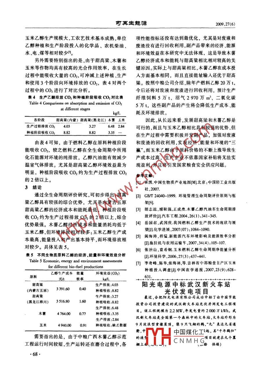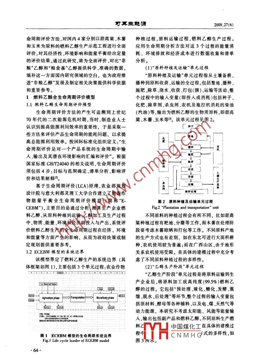 第27卷第6期可再生能Vol 27 No 62009年12月renewable Energy Resources我國(guó)生物質(zhì)燃料乙醇示范工程的全生命周期評(píng)價(jià)張艷麗,高新星,王愛華,趙立欣農(nóng)業(yè)部規(guī)劃設(shè)計(jì)研究院能源環(huán)保所,北京100125)摘要:目前,我國(guó)甜高粱、木薯等“非糧燃料乙醇正處于規(guī)?;茝V的前期論證階段,亟需對(duì)其進(jìn)行全面深入的可行性分析。文章基于生命周期評(píng)價(jià)原理,結(jié)合國(guó)內(nèi)4家燃料乙醇生產(chǎn)企業(yè)的示范工程,對(duì)其全生命周期過程的能源消耗、環(huán)境影響和經(jīng)濟(jì)成本提供定量的評(píng)價(jià)結(jié)果,為評(píng)價(jià)、對(duì)比“非糧”乙醇和“糧食基”乙醇提供科學(xué)、權(quán)威的數(shù)據(jù),填補(bǔ)了這一方面國(guó)內(nèi)研究領(lǐng)域的空白。評(píng)價(jià)結(jié)果表明,發(fā)展甜高粱和木等非糧乙醇是可行的,與玉米乙醇相比具有較強(qiáng)的優(yōu)勢(shì)關(guān)鍵詞:燃料乙醇;生命周期;評(píng)價(jià)中圖分類號(hào):S2162文獻(xiàn)標(biāo)志碼:A文章編號(hào):1671-5292(2009)06-0063-06Life-cycle assessment for Chinese fuel ethanoldemonstration projectsZHANG Yan-li, GAO Xin-xing WANG Ai-hua, ZHAO Li-xinInstitute of Energy and Environment Protection, Chinese Academy of Agriculture Engineering, Beijing 100125, China)Abstract: At present, "non-food"fuel ethanol including sweet sorghum, cassava and other energycrops is at the early stage of large-scale demonstration phase, and it is urgently needed to conducta comprehensive and in-depth feasibility analysis. Based on the principle of life cycle assessment,his study analyzes the whole processes of energy consumption, environmental impact and ecccosts for china's four ethanol demonstration projects, and providentitative evaluation resultThe results will provide scientific and authoritative information for comparing " non-grain"andfood-based"ethanol and fill the gaps in the field of domestic research. Evaluation results showthat the development of sweet sorghum and cassava, and other non-grain ethanol is feasible, andnon-grain"has a strong advantage by comparison with com ethanolKey words: fuel ethanol; life cycle; assessment0引言多元化勢(shì)在必行。為保障糧食安全,我國(guó)提出將停隨著化石能源的日益枯竭和原油基價(jià)的提止建設(shè)糧食乙醇項(xiàng)目,堅(jiān)持發(fā)展“非糧”乙醇,主要高,燃料乙醇替代石油已成為國(guó)內(nèi)外發(fā)展的一種以薯類和甜高粱為原料。趨勢(shì)。“十五”期間,我國(guó)開始以玉米、小麥等陳化目前,我國(guó)甜高粱、木薯等“非糧”燃料乙醇開糧為原料的燃料乙醇試點(diǎn),年生產(chǎn)能力達(dá)到了發(fā)正處于大規(guī)模推廣的前期論證階段,與玉米、小102萬四。目前,由于糧食供需處于緊平衡狀態(tài),麥等糧食基乙醇相比其能源消耗、經(jīng)濟(jì)成本和環(huán)世界糧食價(jià)格大幅度上漲,以玉米等陳化糧為原‘境影響等是否真正具有優(yōu)勢(shì),亟需對(duì)其進(jìn)行系統(tǒng)料的燃料乙醇發(fā)展空間受到了很大的限制,原料的可行性分析針對(duì)上述問題,本研究將應(yīng)用全生收稿日期:2009-06-04;修回日期2009-07-03基金項(xiàng)目:國(guó)家自然科學(xué)基金項(xiàng)日(70741031)。作者簡(jiǎn)介:張艷麗(1976-),女社會(huì)學(xué)碩士,T程師研究方向?yàn)檗r(nóng)村環(huán)境與能中國(guó)煤化工詢。-mail:hangyanli27@yahoo.com.cn遁訊作者:趙立欣(1967-),女,博土,研究員,研究方向?yàn)樯镔|(zhì)能T程咨詢及CNMHG習(xí)耳旎源2009,27(6)命周期評(píng)價(jià)方法,對(duì)國(guó)內(nèi)4家分別以甜高粱、木薯種植過程,原料運(yùn)輸過程,燃料乙醇生產(chǎn)過程。和玉米為原料的燃料乙醇生產(chǎn)示范工程進(jìn)行全面應(yīng)用生命周期分析方法對(duì)這3個(gè)過程的能量消評(píng)價(jià),對(duì)其經(jīng)濟(jì)性、環(huán)境影響和能量平衡給出定量耗、環(huán)境排放和經(jīng)濟(jì)成本進(jìn)行數(shù)據(jù)收集和清單的評(píng)價(jià)結(jié)果。通過此研究將為全面評(píng)價(jià)、對(duì)比“非分析。糧”乙醇和“糧食基”乙醇提供科學(xué)、準(zhǔn)確的數(shù)據(jù),(1)“原料種植及運(yùn)輸”單元過程填補(bǔ)這一方面國(guó)內(nèi)研究領(lǐng)域的空白,也為政府推原料種植及運(yùn)輸”單元過程指從土壤備耕、進(jìn)“非糧乙醇”發(fā)展及制定相關(guān)決策提供科學(xué)依據(jù)播種到原料收獲、運(yùn)輸?shù)娜^程。包括整地、播種和重要參考施肥、除草、澆水、收獲、打包(捆)、運(yùn)輸?shù)然顒?dòng)整1燃料乙醇全生命周期評(píng)價(jià)模型個(gè)過程中的輸入變量(即投入或消耗)包括種子、1.1燃料乙醇生命周期評(píng)價(jià)模型化肥、除草劑、殺蟲劑、農(nóng)機(jī)及拖拉機(jī)消耗的柴油生命周期評(píng)價(jià)方法的產(chǎn)生可追溯到上世紀(jì)(汽油)等輸出為燃料乙醇的生物質(zhì)原料即甜高70年代的二次能源危機(jī)時(shí)期,當(dāng)時(shí),制造業(yè)人士粱、木薯、玉米等。該單元過程見圖2。認(rèn)識(shí)到提高能源利用效率的重要性,于是采取些方法來評(píng)估產(chǎn)品生命周期的能耗問題,以求提高總能源利用效率。按國(guó)際標(biāo)準(zhǔn)化組織定義:“生命周期評(píng)價(jià)是對(duì)一個(gè)產(chǎn)品系統(tǒng)的生命周期中輸人、輸出及其潛在環(huá