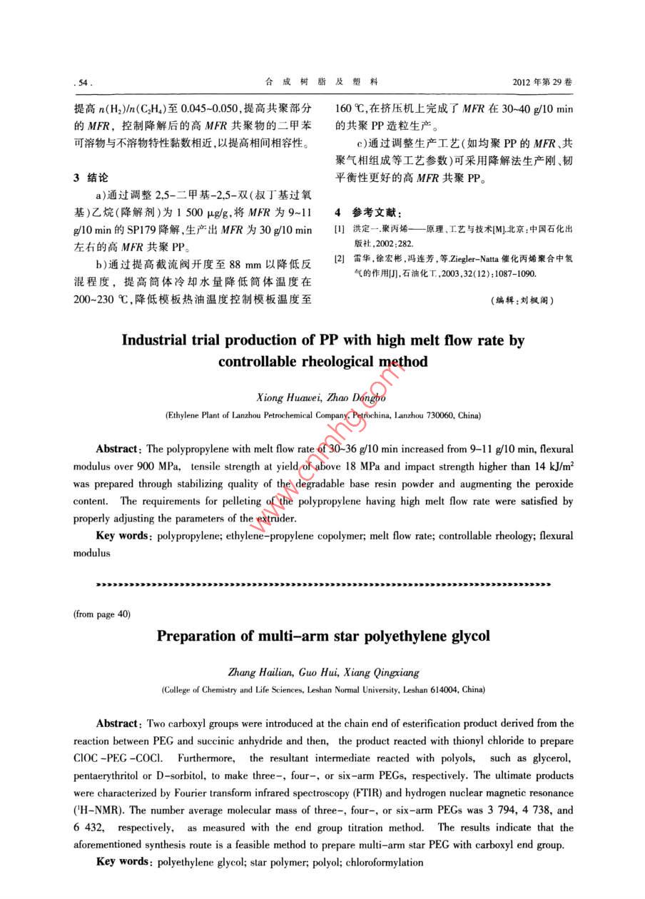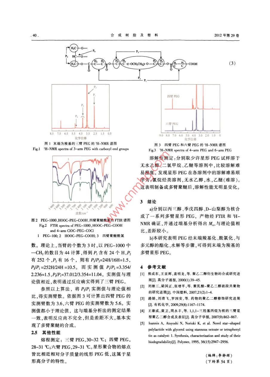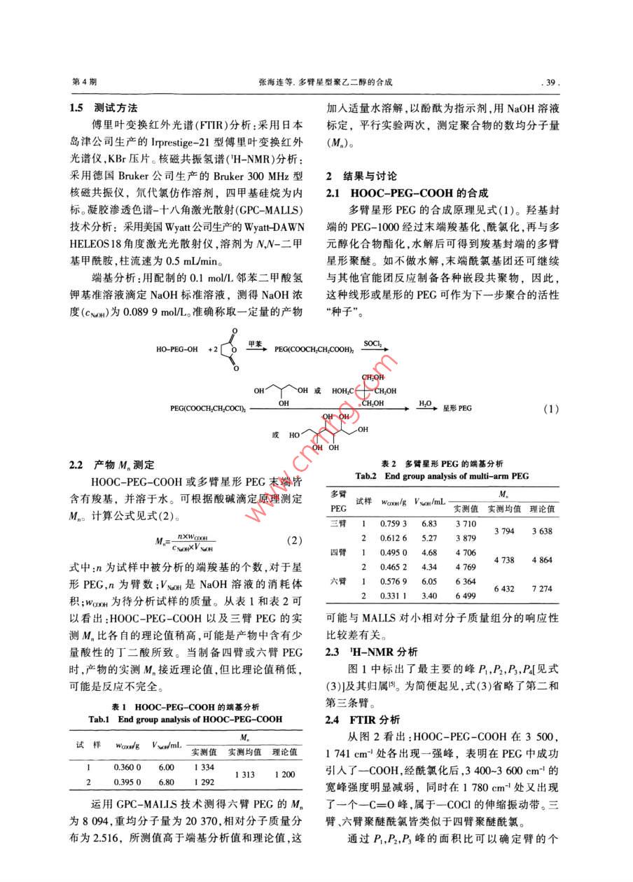 研究與開發(fā)合成樹脂及塑料,2012,29(4):38CHINA SYNTHETIC RESIN AND PLASTICS多臂星形聚乙二醇的合成張海連,郭暉,向清祥(樂山師范學(xué)院化學(xué)與生命科學(xué)學(xué)院,四川省樂山市614004)摘要:聚乙二醇(PEG)經(jīng)與丁二酸酐發(fā)生酯化后,在兩末端引入羧基,再與氯化亞砜反應(yīng)得到聚乙二醇二酰氯,此產(chǎn)物再分別與內(nèi)三醇、季戊四醇或D-山梨醇等多元醇反應(yīng),可分別得到三臂、四臂和六臂星形PEG用傅里葉變換紅外光譜和核磁共振氫譜等對各產(chǎn)物進行了表征,端基分析法得到三臂、四臂和六臂PEG的數(shù)均分子量平均值分別為3794,4738,6432,表明采用上述合成路線可成功得到末端為羧基的多臂星形PEC。關(guān)鍵詞:聚乙二醇星形聚合物多元醇酰氯化中圖分類號:TQ3265文獻標識碼:B文章編號:1002-13962012104-0038-0聚乙二醇(PEG)及其衍生物,既可溶于水,又氯仿振蕩靜置后有白色沉淀,抽濾。濾液用濃鹽可溶于絕大多數(shù)有機溶劑,相對分子質(zhì)量范圍很酸調(diào)節(jié)pH值至2-3,再用30mL氯仿萃取,用10寬,從幾百到數(shù)十萬,常用作藥物賦形劑、乳化劑、mL蒸餾水洗滌有機層,用無水硫酸鈉干燥后,過造紙助劑、潤濕劑、原油破乳劑等。對PEG的改性濾、旋蒸除去氯仿,得白色黏稠物。將此物轉(zhuǎn)移至或共聚物的報道甚多-習,這些共聚物一般是嵌段、60mL乙醚中,冷凍沉淀、干燥,得白色蠟狀固體。接枝、超支化或星形聚合物,但星形PEG的合成經(jīng)標準NaOH溶液檢驗,該固體為羧基封端的方法沒有介紹。星形聚合物具有許多特殊性能(如PEG,即HOOC- PEG-COOH低結(jié)晶度、低玻璃化轉(zhuǎn)變溫度、較小的流體力學(xué)體13聚乙二醇二酰氯(COC-PEG-COC)的合成積、端基數(shù)量更多等),受到科學(xué)界和工業(yè)界的廣將11657g的HOOC-PEG-COOH、17mL氯泛關(guān)注。星形PEG的制備有“先核后臂”法和“先化亞砜、60mL甲苯在80℃下反應(yīng)24h后,減壓臂后核”兩種方法。前者如多元醇引發(fā)環(huán)氧乙烷蒸餾出未反應(yīng)的氯化亞砜,得黏稠液體,此產(chǎn)物被負離子或正離子的開環(huán)聚合,此法步驟繁瑣,條件置干燥器中冷卻后變?yōu)辄S棕色固體。取出少量產(chǎn)苛刻。后者直接以市售或端基改性的PEG為臂,物,充分水解后測定酸值,表明該固體為末端酰氯選擇合適的核制備而成。本工作將通過PEG的化的PEG,即COC- PEG-COCI末端羧基化、酰氯化、酯化等一系列反應(yīng),旨在合14多臂星形PEG的合成成以多元醇為核的星形聚醚。將COC-PEG-COC1和一定量的丙三醇(或季戊四醇、D-山梨醇)在90℃下反應(yīng)8h,得深黃1實驗部分褐色黏稠狀液體,冷卻后變?yōu)楣腆w。在固體中加人原料水,充分水解后用二氯甲烷萃取、無水硫酸鈉干燥PEG-1000,分析純;氯化亞砜,純度95%:均后,旋蒸除去二氯甲烷,得末端為羧基的星形為成都市科龍化工試劑廠生產(chǎn)。丙三醇,分析純,PEG,分別命名為三臂、四臂和六臂PEG。四川天宇油脂化學(xué)有限公司生產(chǎn)。季戊四醇,分析純,成都金山試劑廠生產(chǎn)。D-山梨醇,乙醇中重結(jié)4期:2012-01-30晶兩次后使用,四川航嘉生物醫(yī)藥科技有限責任12-04-28。公司生產(chǎn)。鄰苯二甲酸氫鉀,基準試劑,中國成都作者簡介:張海連,1978年生,講師博上,化學(xué)試劑廠生產(chǎn)。2005年畢業(yè)于中國科學(xué)院成都有機化學(xué)研究所有機化學(xué)專業(yè),現(xiàn)主要從事可生物降解1.2PEG-1000的末端羧基化材料合成與性能研究。E-mail: zhi cioc@將25083gPEG-1000,12518g丁二酸酐和63com;聯(lián)系電話:13658180059150mL甲苯混合并加熱回流6h后,加入50mL基金項目:樂山師范學(xué)院青年教師科研啟動項目(Z0976)。第4期張海連等。多臂星型聚乙二醇的合成1.5測試方法加入適量水溶解,以酚酞為指示劑,用NaOH溶液傅里葉變換紅外光譜(FTIR)分析:采用日本標定,平行實驗兩次,測定聚合物的數(shù)均分子量島津公司生產(chǎn)的 Prestige-21型傅里葉變換紅外M)。光譜儀KBr壓片。核磁共振氫譜(H-NMR)分析采用德國 Bruker公司生產(chǎn)的 Bruker300MHz型2結(jié)果與討論核磁共振儀,氘代氯仿作溶劑,四甲基硅烷為內(nèi)2.1HOOC-PEG-COOH的合成標。凝膠滲透色譜一十八角激光散射( GPC-MALLS)臂星形PEG的合成原理見式(1)。技術(shù)分析:采用美國Wya公司生產(chǎn)的 WyatH-DAWN端的PEG-1000經(jīng)過末端羧基化、酰氯化HELEOS18角度激光光散射儀,溶劑為NN-二甲元醇化合物酯化,水解后可得到羧基封端的多臂基甲酰胺,柱流速為0.5 mUmin星形聚醚。如不做水解,末端酰氯基團還可繼續(xù)端基分析:用配制的0.1mol/L鄰苯二甲酸氫與其他官能團反應(yīng)制備各種嵌段共聚物,因此,鉀基準溶液滴定NaOH標準溶液,測得NaOH濃這種線形或星形的PEG可作為下一步聚合的活性度(cw)為00899moL。準確稱取一定量的產(chǎn)物“種子HO-PEG-OH+2PEG(COOCH CH_ COOH SOCCHIOHH或HoHCCH,OHPEG(COOCH CH, COCTh星形PEG或Ho2產(chǎn)物M測定表2多臂星形PEG的端基分析HOOC-PEG-COOH或多臂星形PEG末端皆Tab 2 End group analysis of multi-arm PEG含有羧基,并溶于水。可根據(jù)酸堿滴定原理測定M,計算公式見式(2)。PEG試樣wm/ g Vs/mL實測值實測均值理論值三臂10.75936833710(2)20612652738793794四臂式中:n為試樣中被分析的端羧基的個數(shù),對于星20.465247384864形PEG,n為臂數(shù);VwH是NaOH溶液的消耗體10576964327274積;wax為待分析試樣的質(zhì)量。從表1和表2可20.33113406499以看出:HOOC-P