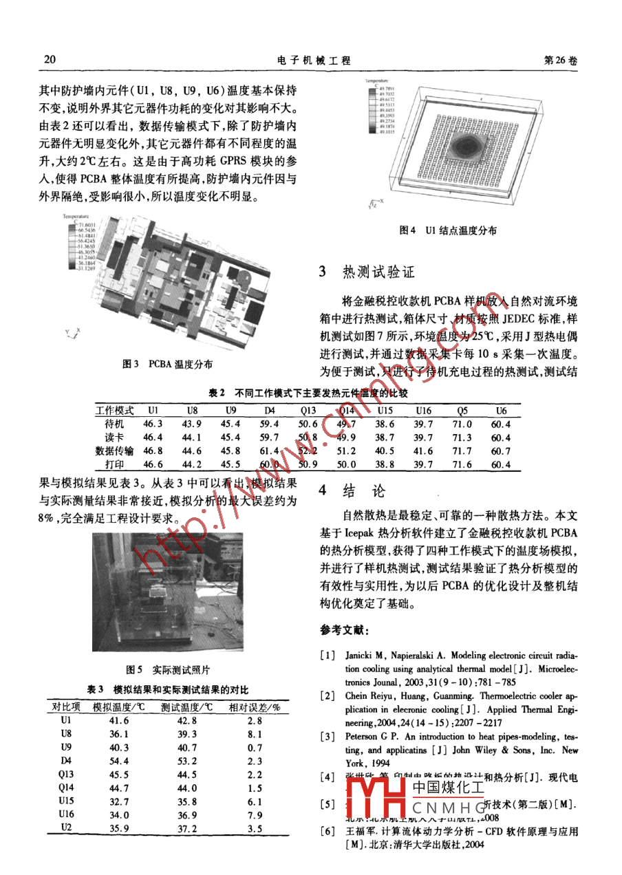 2010年第26卷第3期電子機槭工翟2010.Vol.26No.3Electro- Mechanical Engineering金融稅控收款機PCBA熱設(shè)計和熱分析楊俊逸,謝家文,何彩英,李亞濤,夏冬梅(長城開發(fā)科技股份有限公司,深圳518035)摘要:金融稅控收款機小型化、保密性設(shè)計使得其PCBA熱設(shè)計和熱測試侃為困難,為此基于傳熱學基本原理對PCB及元器件布局進行了熱設(shè)計,并應用 Icepak熱分析軟件對PCBA的熱設(shè)計方案進行了溫度場模擬,獲得了PCBA四種工作模式充電狀態(tài)下的溫度分布。數(shù)值模擬結(jié)果表明:除防護墻內(nèi)的元件外,讀卡模式元器件的溫度明顯高于其它模式相應元器件的溫度,進行了PCBA熱測試,測試結(jié)果表明:元器件溫度都處于正常工作范圍,教值模擬結(jié)果與實驗值也吻合得較妤,說明文中熱設(shè)計和熱分析的有效性。關(guān)鍵詞:熱設(shè)計;熱分析; cepa;金融稅控收款機中圖分類號:TN03;TK124文獻標識碼:B文章編號:1008-5300(2010)03-0017-04Thermal Design and Analysis of PCBA for Finance Fiscal Cash RegisterYANG Jun-yi, XIE Jia-wen, HE Cai-yin, Li Ya-tao, XIA Dong-meiShenzhen Changcheng Kaifa Technology Co., LTD, Shenzhen 518035, China)Abstract: Thermal design and thermal testing of Finance Fiscal Cash Register( FFCR) are becoming more difficult because of its miniaturization and confidentiality. For this reason, a thermal design based on heat trans-fer for PCBa of FFCR is conducted, and Icepak thermal analysis software package is used to carry out numerical simulation of temperature field of PCBA for obtaining temperature distribution of PCBa under the conditions of 4 operating modes model of charging state. The numerical simulation result shows that component tem-perature of data transfer model is significantly higher than that of other operating modes except the componentsprotected by the wall. Thermal test is carried out to verify thermal design and thermal analysis of PCBa of FFCR. The result shows that component temperature is within its reliability temperature range, the result of numerical simulation is in good agreement with the thermal test result, showing the validity of thermal design andKey words: thermal design; icepak; thermal simulation; finance fiscal cash register0引言溫度成指數(shù)關(guān)系增長,工作溫度升高10℃,失效率增大一倍以上。因此熱設(shè)計在電子結(jié)構(gòu)設(shè)計中是不可忽隨著電子元器件及電子產(chǎn)品功率密度的不斷增視的環(huán)節(jié)研究高效率、低成本、環(huán)境友好的散熱方法加,產(chǎn)品小型化的要求溫度已成為影響其可靠性的主對提高電子產(chǎn)品的運行穩(wěn)定性具有重要的意義。要因素。如果各種發(fā)熱元件散出來的熱量不能夠及時與一般電子產(chǎn)品的電路板設(shè)計不同,金融稅控收排出去,就會造成熱量的聚集,從而導致各個元器件的款機的電路板設(shè)計要求既要有一定的穩(wěn)定性又要有溫度超過其所能承受的溫度極限,使得電子設(shè)備的可一定的保密性。因此一些關(guān)鍵芯片往往布置于密封的靠性大大降低。有資料表明,電子設(shè)備的失效有55%小空間這樣一來給熱測試帶來困難,同時由于芯片所是由于溫度超過規(guī)定值而引起的,保證工作穩(wěn)定性處空間狹小密閉,空氣對流不通暢其散熱也成一定和延長使用壽命元件芯片的最高溫度不得超過問題85℃(2。10℃法則3也表明:電子元件失效率隨工作量通YH中國煤化工將芯片散出來的熱CNMHG·收稿日期:2009-12-2918電子機械工程第26卷文中首先根據(jù)熱設(shè)計基本原理及工程經(jīng)驗,對金境及根據(jù)電路設(shè)計所選用的元器件的最高許用溫度。融稅控收款機的PCBA進行了熱設(shè)計;之后應用lce表14給出了常見元器件表面溫度允許值。由于金融ak熱分析軟件對熱設(shè)計方案進行了熱仿真,得到不稅控收款一般在有空調(diào)的室內(nèi)使用,環(huán)境溫度一般為同工作模式、不同狀態(tài)下的PCB及元器件的溫度分25℃左右考慮到加蓋后溫升的影響PCBA熱設(shè)計時布;最后通過熱測試檢驗了熱設(shè)計和熱分析的有效性。取30℃,根據(jù)熱流密度與溫差及散熱方法的關(guān)系1金融稅控收款機PCBA熱設(shè)計經(jīng)計算并考慮到設(shè)備的穩(wěn)定性,確定采用自然冷卻的散熱方法。在進行熱設(shè)計之前,必需了解設(shè)備所處的實際環(huán)表1元器件表面溫度允許值元器件名稱表面允許溫度/℃元器件名稱表面允許溫度/℃變壓器、扼流圈陶瓷電容器金屬膜電阻玻璃陶瓷電容器碳膜電阻器硅晶體管鈀膜電阻鍺晶體管壓制線繞電阻電子管印制電阻85CMOS全密封扁平封裝l25涂漆線繞電阻陶瓷直插、黑瓷直插紙介電容器CMOs塑料直插薄膜電容器TL小規(guī)模集成電路25-125云母電容器70-120TTL中規(guī)模集成電路PCB的熱設(shè)計涉及導體圖形線寬和厚度的選取,完成的金融稅控收款機PCBA熱設(shè)計如圖1所散熱通孔、盲孔的設(shè)計及材質(zhì)、層數(shù)的確定等。根據(jù)電示。路要求及工程實際,金融稅控收款機的印制電路板熱設(shè)計采用三塊水平PCB堆疊而成,最上面為四層電路板,板厚為1.6mm,材質(zhì)為FR4和純銅;中間為6層電路板,直接焊在最上面電路板底面中心部位,并用防護墻將其密封起來,為了提高散熱效果,中間電路板均布散熱孔,孔徑為0.25mm,防護墻材質(zhì)為FR4,并在表面密布細微銅線;最下面為4層電路板,材質(zhì)為FR4和純銅,并在發(fā)熱量較大的電源模塊等部件周圍開設(shè)散熱