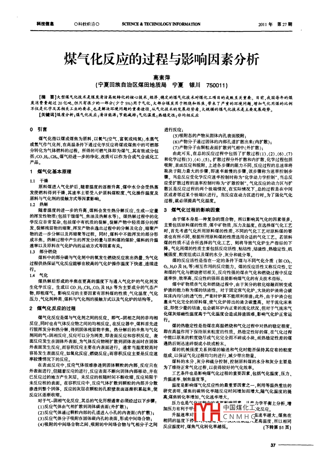 科技信息O科教前沿OSCIENCE TECHNOLOGY INFORMATION2011年第27期煤氣化反應(yīng)的過程與影響因素分析高素萍寧夏回族自治區(qū)煤田地質(zhì)局寧夏銀川750011)【摘要】大型煤氣化技術(shù)是煤炭清潔高效特化的核心技術(shù),經(jīng)濟(jì)、穗定的煤氣化技術(shù)對(duì)煤化工項(xiàng)目的成敗至關(guān)重要。目前,我國每年的煤炭消費(fèi)量超過20億噸,但只有很少的一部分(少于5%)用于氣化,大部分煤炭用于燃燒和煉焦,帶來了嚴(yán)重的環(huán)境問題,增加氣化用煤的比例不僅是化學(xué)及其相關(guān)工業(yè)的要求,也是解決環(huán)境問題的重要途徑,從氣化技術(shù)的發(fā)展趨勢看,大規(guī)模的煤氣化技術(shù)是主要發(fā)展趨勢,【關(guān)鍵詞】質(zhì)分析;煤氣化反應(yīng);清潔能源;節(jié)能減排;氣化度;熱穩(wěn)定性;非均相反應(yīng)0引言進(jìn)行反應(yīng)煤氣化指以煤或煤焦為原料,以氧氣(空氣、富氧或純氧)水蒸氣(5)吸附態(tài)的產(chǎn)物從固體內(nèi)孔表面脫附;或氫氣作氣化劑在高溫條件下通過化學(xué)反應(yīng)將煤或煤焦中的可燃部(6)產(chǎn)物分子通過固體的內(nèi)部孔道擴(kuò)散出來(內(nèi)擴(kuò)散);(7)產(chǎn)物分子由顆粒表面擴(kuò)散到氣相中(外擴(kuò)散);分轉(zhuǎn)化為氣體燃料的過程。所得的可燃?xì)怏w即為煤氣其有效成分包由此可見,在總的反應(yīng)過程中包括了擴(kuò)散過程(1)、(2)、(6)(7)括:COH2、CH,煤氣經(jīng)進(jìn)一步的凈化改質(zhì)可以作為合成氣合成化工和化學(xué)過程(3)、(4)、(5)。擴(kuò)散過程分外擴(kuò)散和內(nèi)擴(kuò)散化學(xué)過程包括產(chǎn)品。吸附、表面反應(yīng)和脫附。上述各步驟的阻力不同反應(yīng)過程的總速率將1煤氣化基本原理取決于阻力最大的步驟即速率最慢的步驟該步驟稱為速率控制步1.1干燥驟。當(dāng)總反應(yīng)受化學(xué)反應(yīng)速率控制時(shí)稱為“化學(xué)動(dòng)力學(xué)控制”,當(dāng)總反應(yīng)受擴(kuò)散過程的速率控制時(shí)稱為“擴(kuò)散控制”。氣化反應(yīng)的動(dòng)力區(qū)與擴(kuò)原料煤進(jìn)入氣化爐后隨著溫度的逐漸升高煤中水分會(huì)受熱蒸散區(qū)是反應(yīng)過程的兩個(gè)極端情況,在實(shí)際情況下,總的過程是在中間發(fā)使燃料得到干燥,其速率主要受人爐原料煤粒度氣化操作溫度及區(qū)或者鄰近某個(gè)極端區(qū)進(jìn)行。當(dāng)反應(yīng)在動(dòng)力區(qū)進(jìn)行時(shí)為了強(qiáng)化氣化原料與氣化劑的接觸方式等因素影響過程,就必須提高氣化溫度熱隨著溫度的進(jìn)一步的升高煤料會(huì)發(fā)生熱分解反應(yīng)生成一定量3煤氣化過程的影響因素的揮發(fā)性物質(zhì)(包括干餾煤氣、焦油及熱解水等)。煤熱解過程中的化由于煤本身是一種復(fù)雜的混合物,所以影響其氣化的因素很多學(xué)反應(yīng)非常復(fù)雜包括煤中有機(jī)質(zhì)的裂解裂解產(chǎn)物中輕質(zhì)部分的揮主要包括原料煤的性質(zhì)煤中礦物質(zhì)壓力及溫度。在選擇煤氣化工藝發(fā)裂解殘留物的縮聚揮發(fā)產(chǎn)物在逸出過程中的分解及化合縮聚產(chǎn)時(shí),首先考慮氣化所用原料煤的性質(zhì)不同的氣化工藝對(duì)原料煤的要物的進(jìn)一步分解以及再縮聚等過程。同時(shí)煤料中不能揮發(fā)的部分形求也有所不同根據(jù)所用原料煤的性質(zhì)選用合適的氣化工藝。若原料成半焦。熱解過程中產(chǎn)生的揮發(fā)分的量與原料煤的煤階、媒料的升溫煤的性質(zhì)不適合所選擇的氣化工藝,則將導(dǎo)致氣化爐生產(chǎn)指標(biāo)的下速率以及原料在氣化爐內(nèi)的運(yùn)動(dòng)方式等因素有關(guān)13部分燃燒降。氣化用煤的性質(zhì)主要包括反應(yīng)活性粘結(jié)性、結(jié)渣性熱穩(wěn)定性、機(jī)煤料中的部分碳與氣化劑中的氧發(fā)生燃燒反應(yīng)放出熱量為氣化械強(qiáng)度粒度組成以及煤的水分灰分和硫分等。過程供熱保證氣化反應(yīng)能夠在較高的氣化爐操作溫度下快速連續(xù)進(jìn)煤的反應(yīng)活性是指在一定的條件下煤與不同氣化介質(zhì)(如CO2行O2、HO及H2等)相互作用的反應(yīng)能力。煤的反應(yīng)活性又稱反應(yīng)性,它14氣化和煤的氣化與燃燒密切相關(guān),反應(yīng)性強(qiáng)的煤在氣化和燃燒過程中反應(yīng)煤熱解后形成的半焦在更高的溫度下與通人氣化爐的氣化劑發(fā)速率快效率高反應(yīng)性的強(qiáng)弱直接影響煤氣化的有關(guān)技術(shù)指標(biāo)生化學(xué)反應(yīng),生成以C0H2CH、CO2及HS等為主要成分的氣態(tài)產(chǎn)煤中礦物質(zhì)在氣化和燃燒過程中由于灰分的軟化熔融而轉(zhuǎn)變成爐渣的能力稱為煤的結(jié)渣性。對(duì)于固定床氣化爐,大塊的爐渣將會(huì)破物即粗煤氣。影響反應(yīng)的主要因素有原料煤的性質(zhì)氣化溫度、氣化壞床內(nèi)均勻的透氣性嚴(yán)重時(shí)爐算不能順利排渣;此外由于爐渣會(huì)包壓力、氣化劑種類、煤料與氣化劑的接觸方式以及氣化爐的結(jié)構(gòu)等。裹未氣化完全的原料煤,使氣化爐排出的渣含碳量高。對(duì)于流化床來2煤氣化反應(yīng)的過程說,即使少量的結(jié)渣,也會(huì)破壞爐內(nèi)正常的流化狀況,但對(duì)于氣流床氣煤氣化反應(yīng)是煤與氣化劑之間的反應(yīng),即氣