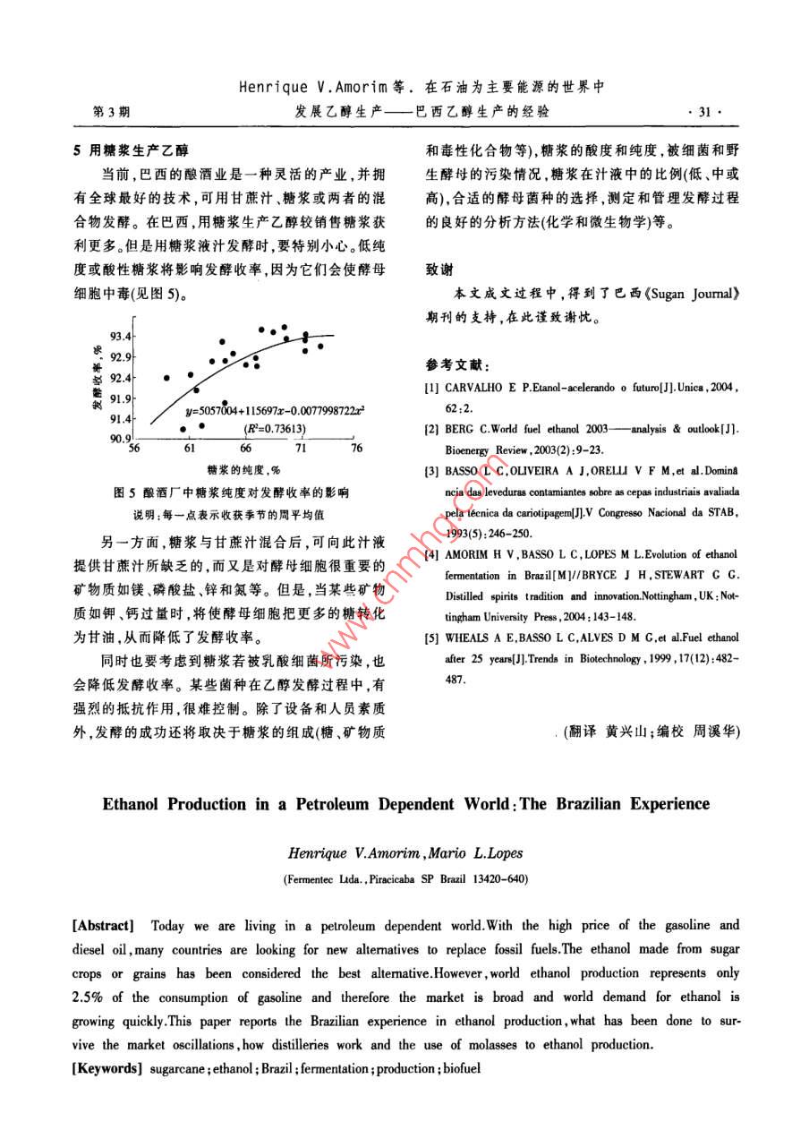 中外能源SINO-GLOBAL ENERGY009年第14卷在石油為主要能源的世界中發(fā)展乙醇生產(chǎn)巴西乙醇生產(chǎn)的經(jīng)驗Henrique VAmorim, Mario L Lopes(巴西 Fermented公司,圣保羅州皮拉西卡巴市13420-640)摘要當前,人們生活在依賴石油的世界中,因為汽油和柴油的價格不斷升高,許多國家都在尋求化石燃油的替代物。用糖類作物或谷物生產(chǎn)的乙醇被視為最好的替代物。然而,全球日前乙醇產(chǎn)量僅為汽油耗量的25%,所以乙醇需求增長迅速,市場廣闊。介綱了巴西乙醇生產(chǎn)的經(jīng)驗;在乙醉市場波動的情況下,乙醇生產(chǎn)商得以生存的措施;乙醇生產(chǎn)商的生產(chǎn)方式;乙醇生產(chǎn)所用糖漿原料的概況等。關(guān)鍵詞甘蔗乙醇巴西發(fā)酵生產(chǎn)生物燃料1前言的乙醇耗量迅速增長,當時聯(lián)邦政府又頒發(fā)了旨在乙醇用作燃料的歷史始于汽車誕生之日。1908降低石油進口的“ Proalcool"計劃,有關(guān)廠商因而受年,當?shù)谝惠v福特 Model t汽車從裝配線下線時,到鼓舞,擴大了甘蔗生產(chǎn),并建設(shè)新的釀酒廠,生產(chǎn)就用乙醇作為其發(fā)動機的燃料,此時石油工業(yè)才剛用作生物燃料的乙醇。如圖1所示,在過去30年剛開始。后來,汽油開始用作燃料并發(fā)現(xiàn)其價格低里,巴西的甘蔗產(chǎn)量從1975年的9100×10t增長至廉,與此同時在在世界各地發(fā)現(xiàn)了新的石油儲量。2007年的49100×10(原文如此,按圖1,應(yīng)為在數(shù)百萬年前,微小的水生植物和動物在高溫高壓39100×10%—譯者注),2007年的甘蔗產(chǎn)量相當于和多層沉積物的復(fù)蓋下,形成了液態(tài)物,人們稱之589×10%b一次能源產(chǎn)量(按圖1數(shù)據(jù)計算,應(yīng)為為石油,它是碳氫化合物的混合物。煉油廠把這些469×10°bl—譯者注,lt甘蔗相當于1.bl原混合物分餾為各種油品,如汽油、柴油、液化石油油)。這些甘蔗是由7萬名農(nóng)民在600×10hm2土地氣、殘渣燃料油和其他產(chǎn)品。多少年來,人們目睹了上種植出來的,此耕地面積約為巴西全部耕地面積世界在消耗化石燃料的同時向大氣排放出數(shù)以百的27%。自“ Proalcool"計劃實施以來,聯(lián)邦政府已萬噸計的二氧化碳、其他氣體和有毒化合物等。但經(jīng)節(jié)約了用于進口原油(包括關(guān)稅)的外匯約1500是,到了1973年,情況發(fā)生了變化,國際原油價格億美元。猛漲,科學(xué)家們此時又宣稱,全球氣候正在加速變巴西燃料銷售網(wǎng)共有3萬多個加油站為2600暖,同時石油儲量正在逐年降低。當前,全球汽油年104輛在汽油中混人2%-26%乙醇的汽車和540消耗量約為12×10m3,而燃料乙醇僅占汽油需求量10輛用純乙醇或含不同比例乙醇(可變?nèi)剂霞夹g(shù))的2.5%如今沒有任何替代燃料可以代替汽油的汽車加油。與此同時,汽車業(yè)推出了可變?nèi)剂掀秃鸵掖肌K?基于經(jīng)濟、社會和環(huán)境的原因,車,它們可使用純乙醇、汽油或兩者以任何比例摻全球燃料乙醇的需求正在增長,到2010年,其產(chǎn)量估計將增至550010%m2。在依賴石油的世界中,巴作者簡介; Henrique V. Amorim,巴西 Fermented公司總裁景首席西作為主要的乙醇生產(chǎn)和使用國,具有特別的意義執(zhí)行官,1966年畢業(yè)于巴西圣保羅大學(xué)農(nóng)業(yè)科學(xué)專業(yè),1970年2生物燃料乙醇畢業(yè)于美國俄亥餓州立大學(xué),獲理科碩士學(xué)位,1972年完成其從1923年起,巴西就將乙醇混人汽油中,其混博士論文。19m7年創(chuàng)建 Fermented公司。人比例約為5%40%不等。1975年以來,用作燃料E-mil: amorim(fermented. com. brHenrique V, Amorim等.在石油為主要能源的世界中第3期發(fā)展乙醇生產(chǎn)——巴西乙醇生產(chǎn)的經(jīng)驗混的燃油。這些可變?nèi)剂掀囋诎臀鞣浅A餍?銷家,但產(chǎn)量集中在中南和西北地區(qū)。預(yù)計到2009量達200×10輛,占2007年汽車總銷量的86%。這年,還將新建一批釀酒廠,每家年生產(chǎn)能力可達到種流行趨勢的出現(xiàn)有以下3個理由:首先是汽油價100×10y-200×10t。而且,很多釀酒廠正在增加其乙高,消費者要尋求廉價的能源,而乙醇價格僅為汽醇生產(chǎn)能力,以滿足國內(nèi)需求和出口到那些正在尋油的60%;其次,可變?nèi)剂掀囀瓜M者可更靈活求替代燃料以減少石油對其經(jīng)濟和環(huán)境影響的國地選用燃油品種,從而少受市場價格變化的影響;家。再次,選用純乙醇或乙醇-汽油混合物作燃油可使0.25有關(guān)從業(yè)人員(包括甘蔗地里的農(nóng)民)獲得環(huán)境和社會效益。2004年以來,可變?nèi)剂宪囕v銷售成為巴西汽車業(yè)的主要增長點。0.10N0.05E至圣室至登系年份圖2巴西乙醇產(chǎn)量的增長情況( Atauro,2008)053釀酒廠如何應(yīng)對市場波動而生存下來§E區(qū)置圣登區(qū)區(qū)堅§在“ Proalcool'計劃實施期間,生產(chǎn)商面臨了乙醇價格由1980年的700美元/m3降至1999年的圖1巴西甘蔗產(chǎn)量逐年增長 Datagro,2008)200美元/m3以下。除乙醇-汽油混合燃料外,聯(lián)邦繼最初的可變?nèi)剂掀囁扇〉膶Σ叱晒χ畯U除了對乙醇市場的干預(yù),價格放開。在巴西后,2005年汽車業(yè)又推出了三種燃料(汽油、乙醇和糖和乙醇的價格產(chǎn)生了雙重的影響。許多糖廠設(shè)有天然氣汽車。而且,又開發(fā)了基于乙醇的燃料電池釀酒裝置,當國際市場的糖價較生產(chǎn)乙醇更可獲利新項目,與此同時,巴西政府推出了“生物柴油”計時,