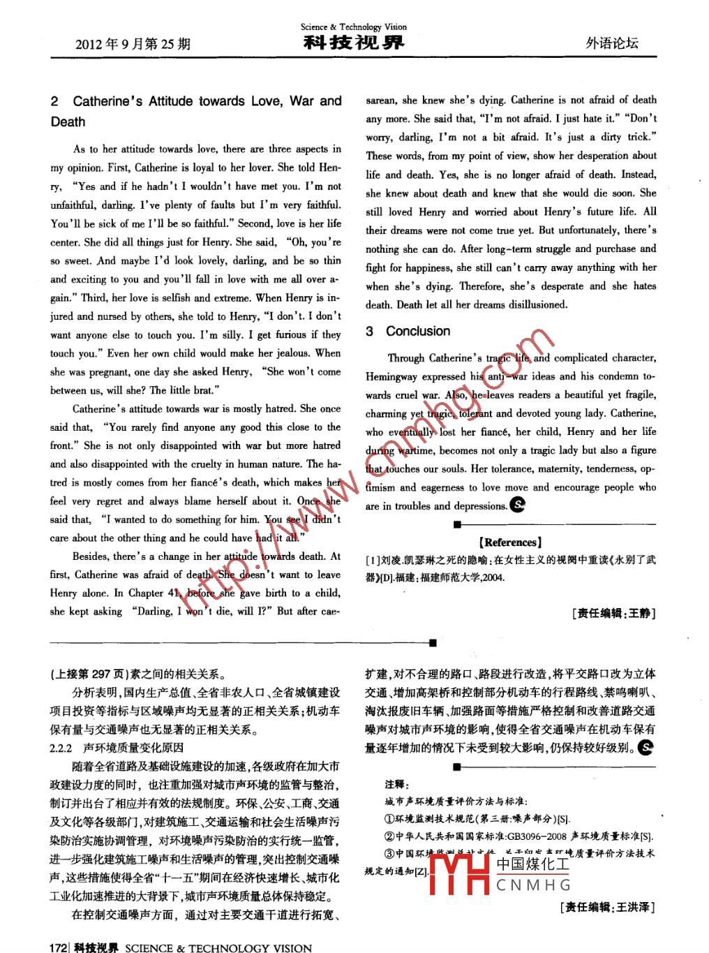 Science & Technology Vision外語論壇科技視界2012年9月第25期The Analysis of Catherine inA Farewell to Arms單曉蓉(重慶大學中國重慶401331)[AbstractCatberine Barkley, as the”heroine in the novel A Furwel to Ams, has a raher cmpicated pronaliy. The tesis10 bein with, alyes her caneter in two side with exmpls One the oe hand, she is oedien, mateml, nature and oiaie.yeton the oher hand, she depeds on love to much and is not cofident enough. The tesis then alyes Caterine's atindestowards love, war and death. Though her atitudes and experience, author exress the cruelness of war and his hatred towards war.[Key words)A Furewell to Ams;Emest Hemingway;CathrinepPemonality0 IntroductionShe knows how t0 keep their tlationhip. In chapter 21, whenIn Emest Hemingway's semi -autobiographical novel ACatherine told Henry she had been pregnant for 3 months, sheFarewell to Ams, Catherine Barkley, as the heroine, has rathertold Heny,“Oh, darling!”“You mustn't mind me."“We werecomplicated character. On the one hand, Catherine appears toboth together again and the self- - consciousness was gone."“Webe a charming and beautil lady who is admired by almost allreally are the same one and we mustn1 misunderstand 。of men. And on the other hand, Catherine is not independentpurpose."“ There' s only us two and in the world there's all theand not confdent enough. She depends on love to much. Andrest of them. If anything comes between us we're gone and thenthat is related to her fiance's death, which changes her atitudethey have us." Fourthly, she is an optinistic girl. She alwaystowards love and war.smiles to Henry no matter how difteult the situation is. Thoughshe was pregnant when they escaped to Swizerland, she sill1 Catherine's Personalitysmiled at him, encouraged Henry and tried her best to helpFint of all, Catherine is obedient and tender. In ChapterHenry.16, she said to Henry,“But I will 1 say just what you wishHowever, on the other hand, Catherine is not independentand 1 do what you wish and then you will never want anyand not confdent enough. She always asked Heny,“Don't Iother gidls, will you?"“1 do what you want and say what youmake a good wife?" She cares about Henry too much ancwant and then I1 be a great sccess, won' 1?" And whendepends on Henry and their love too much. She's relly craryHenry has to comne back to the front, Catherine consoles himabout it. Even, Catherine conceals her real feling in order toinstead of epessing her own sadness. She told Heny,"Do let'somfont Heny. In chapter 21, when she told Henry she hadplease just be happy. You are happy, aren't you? Is there been pregnant for 3 months, she repeated several time that “hanything I do you don't like? Can 1 do anyhing to please you?doesn't worry me."“I haven't wored about it." But in fac, weWould you like me to take down my hair? Do you want tocan easily feel the anxiety frcCatherine. In addition,play?" Secondly, she is matermal. She' always calls HenyCatherine is 100 peaceful during her preganey. Uuly women“daring” and "boy" likes a mother rather than a lover.who are pregnant always have bad temper and are capricious.Catherine thinks about him all the time and is never stingy toYet Catherine is sil tender and obedient as usual. And that ispraise Henry. When Henry told her he once had gonorthea, sheunusual.Nevertheless, I1understand Catherine'seven said:“I wish Id had it to be like you. 1 wish Ir'd stayeddependence and craines tow ards love. These forned becausewith all your girds so I could make fun of them to you."(Inof her fiance's death, her dispintment towards war and alooChapter38) Thirdly, Catherine is quite mature and reasonable. fearfulness of losing lover again.中國煤化工MYHCNMH G作者簡介:單曉蓄(1991- -),女,山東濟南人,大學本科三年級,現(xiàn)就讀于重慶大學外國語學院英語系。SCIENCE & TECHNOLOGY VISION科技視界|171Science & Technology Vision2012年9月第25期科技視界外語論壇2 Catherine's Attitude towards Love, War andsarean, she knew she's dying. Catherine is not afraid of deathDeathany more. She said that, “I'm not afraid. I just hate it." “Don'tworry, darling, I'm not a bit afraid. I's just a dity trick."As to her atitude towards love, there are three aspects inThese words, from my point of view, show her desperation aboutmy opinion. First, Catherine is loyal to her lover. She told Hen-life and death. Yes, she is no longer afraid of death. Instead,ry, “Yes and if he hadn't I wouldn't have met you. I'm notshe knew about death and knew that she would die soon. Stunfaithful, darling. I've plenty of faults but I' m very faithful.still loved Henry and worried about Henry's future ife. AllYou'll be sick of me I'll be so faithful." Second, love is her lifetheir dreams were not come true yet. But unfortunately, there'scenter. She did all things just for Henry. She said,“Oh, you'renothing she can do. After long -term struggle and purchase andso sweel. And maybe I'd look lovely, darling, and be so thinfight for happiness, she still can't cary away anything with herand exciting to you and you'll fall in love with me all over awhen she's dying. Therefore, she's desperate and she hatesgain." Third, her love is selfish and extreme. When Henry is in-death. Death let all her dreams disillusioned.jured and nursed by others, she told to Henry,“I don't. I don'twant anyone else to touch you. I'm sly. 1 get furious if they3 Conclusiontouch you." Even her own child would make her jealous. WhenThrough Catherine' s tragic life and complicated character,she was pregnant, one day she asked Henry,' "She won't comeHemingway expressed his anti -war ideas and his condemn to-betweens, will she? The litle brat."wards cruel war. Also, he leaves readers a beautiful yet fragile,Catherine' s atitude towards war is mostly hatred. She oncecharming yet tragic, tolerant and devoted young lady. Catherine,said that,“You rarely find anyone any good this close