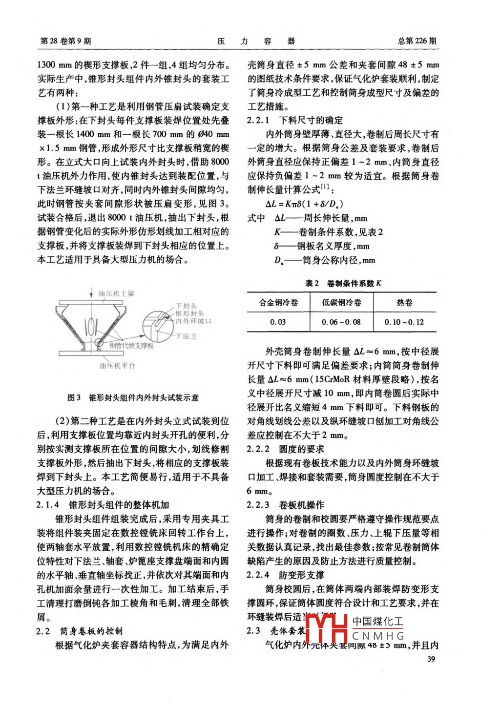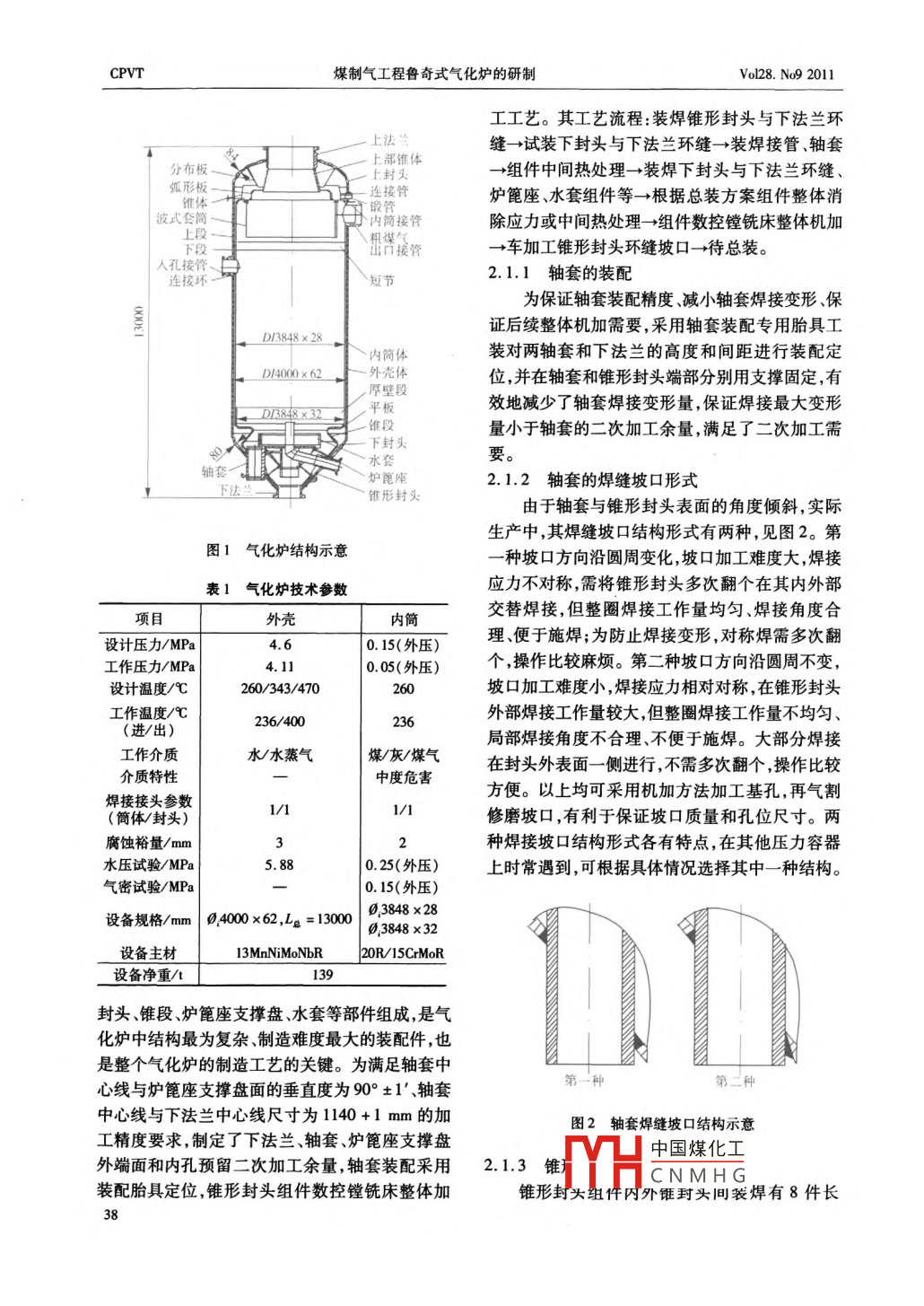 制造與安裝煤制氣工程魯奇式氣化爐的研制袁承春(哈爾濱鍋爐廠有限責(zé)任公司,黑龍江哈爾濱150046 )摘要:介紹了煤制氣工程關(guān)鍵設(shè)備一 魯奇式氣化爐的主要設(shè)計(jì)結(jié)構(gòu)、技術(shù)要求和制造工藝難點(diǎn),對(duì)其關(guān)鍵制造工藝進(jìn)行了論述。關(guān)鍵詞:氣化爐;設(shè)計(jì)結(jié)構(gòu);制造工藝中圖分類號(hào):TQ054;TQ050.6文獻(xiàn)標(biāo)識(shí)碼:B 文章編號(hào) :1001 - 4837(2011 )09 -0037 -05doi:10. 3969/j. isns. 1001 - 4837.2011. 09.008Research on Lurgi Gasification Furnace of Coal Gas Project( Harbin Boiler Co. , Ltd. , Harbin 150046 , China)Abstract : The main design structure , technical requirement and manufacturing process difficulty of Lurgigasification furnace-- key equipment of coal gas project were introduced , and the key manufacturingprocess was discussed.Key words: gasification fumace ;design structure ;manufacturing process煤氣出口接管、人孔接管、連接環(huán)、錐形封頭、下法0引言蘭、軸套、鍛管等部件組成;內(nèi)簡(jiǎn)由下封頭、錐段、平板厚壁段、內(nèi)筒體、短節(jié)、上部錐體、弧形板、內(nèi)煤炭通過(guò)氣化技術(shù)變成清潔能源煤氣,可以筒接管爐篦座水套、波式套筒等部件組成,見(jiàn)圖1。提高煤炭利用效率、減輕環(huán)境污染,具有明顯的社1.2 技術(shù)參數(shù)會(huì)效益、經(jīng)濟(jì)效益和廣闊的開(kāi)發(fā)前景。某公司制氣化爐容器類別為皿類( A2) ,軸套中心線與造的魯奇式氣化爐(以下簡(jiǎn)稱氣化爐)是煤制氣爐 篦座支撐盤(pán)的垂直度為90° +1'、軸套中心線與工程的關(guān)鍵設(shè)備,結(jié)構(gòu)復(fù)雜、技術(shù)要求高、制造難爐體中心線距離尺寸為 1140+1 mm,上下法蘭與度大。通過(guò)制定切實(shí)可行的制造工藝和措施,解氣化爐中心線的垂直度為90° +5' ,外殼筒身公差決了多個(gè)制造工藝難點(diǎn)。0.4000 +5 mm;內(nèi)筒筒身公差0.3848 +5 mm;夾套間隙48 +5 mm。技術(shù)參數(shù)要求高,見(jiàn)表1。1結(jié)構(gòu)特 點(diǎn)和主要技術(shù)參數(shù)2關(guān)鍵制造工藝1.1 結(jié)構(gòu)特點(diǎn)該氣化爐是由外殼與內(nèi)筒組成的立式夾套容2.1錐形封;中國(guó)煤化工器,結(jié)構(gòu)復(fù)雜。外殼由上法蘭、上封頭外殼體、粗錐形封頭YHC NMH G、軸套、下3CPVT煤制氣工程魯奇式氣化爐的研制Vol28. No9 2011工工藝。其工藝流程:裝焊錐形封頭與下法蘭環(huán)縫-→試裝下封頭與下法蘭環(huán)縫- +裝焊接管、軸套上部錐體分布板-X上封頭- +組件中間熱處理- +裝焊下封頭與下法蘭環(huán)縫、弧形板一-連接管爐篦座、水套組件等-→根據(jù)總裝方案組件整體消維體波式套簡(jiǎn)內(nèi)簡(jiǎn)接管除應(yīng)力或中間熱處理-→組件數(shù)控鏜銑床整體機(jī)加出告接管- +車加工錐形封頭環(huán)縫坡口- +待總裝。連校環(huán)與短節(jié)2.1.1軸套的裝配為保證軸套裝配精度、減小軸套焊接變形、保證后續(xù)整體機(jī)加需要,采用軸套裝配專用胎具工D13848x28.內(nèi)簡(jiǎn)體裝對(duì)兩軸套和下法蘭的高度和間距進(jìn)行裝配定_D1400x6020 下外殼體位,并在軸套和錐形封頭端部分別用支撐固定,有,厚壁段D3848x32_平板效地減少了軸套焊接變形量,保證焊接最大變形錐段量小于軸套的二次加工余量,滿足了二次加工需下封頭水套要。軸套一爐篦座2.1.2軸套的焊縫坡口形式. 下法蘭一-5”錐形封頭由于軸套與錐形封頭表面的角度傾斜,實(shí)際生產(chǎn)中,其焊縫坡口結(jié)構(gòu)形式有兩種,見(jiàn)圖2。第圖1氣化爐結(jié)構(gòu)示意- -種坡口方向沿圓周變化,坡口加工難度大,焊接表1氣化爐技術(shù)參數(shù)應(yīng)力不對(duì)稱,需將錐形封頭多次翻個(gè)在其內(nèi)外部交替焊接,但整圈焊接工作量均勻、焊接角度合.項(xiàng)目外殼內(nèi)筒理、便于施焊;為防止焊接變形,對(duì)稱焊需多次翻設(shè)計(jì)壓力/MPa4.60. 15(外壓) .工作壓力/MPa4.11| 0.05(外壓)個(gè),操作比較麻煩。第二種坡口方向沿圓周不變,設(shè)計(jì)溫度/C260/343/470260坡口加工難度小,焊接應(yīng)力相對(duì)對(duì)稱,在錐形封頭工作溫度/9外部焊接工作量較大,但整圈焊接工作量不均勻、236/400236(進(jìn)/出)局部焊接角度不合理、不便于施焊。大部分焊接工作介質(zhì)水/水蒸氣煤/灰/煤氣在封頭外表面--側(cè)進(jìn)行,不需多次翻個(gè),操作比較介質(zhì)特性中度危害方便。以上均可采用機(jī)加方法加工基孔,再氣割焊接接頭參數(shù)(簡(jiǎn)體/封頭)/11/1修磨坡口,有利于保證坡口質(zhì)量和孔位尺寸。兩腐蝕裕量/mm3種焊接坡口結(jié)構(gòu)形式各有特點(diǎn),在其他壓力容器水壓試驗(yàn)/MPa5.880. 25(外壓)上時(shí)常遇到,可根據(jù)具體情況選擇其中- - 種結(jié)構(gòu)。氣密試驗(yàn)/ MPa| 0. 15(外壓)設(shè)備規(guī)格/mm| 0.4000 x62 ,Ls = 130000.3848 x2803848 x32設(shè)備主材13MnNiMoNbR20R/15CrMoR設(shè)備凈重/1封頭、錐段、爐篦座支撐盤(pán)、水套等部件組成,是氣化爐中結(jié)構(gòu)最為復(fù)雜、制造難度最大的裝配件,也是整個(gè)氣化爐的制造工藝的關(guān)鍵。為滿足軸套中第一種第二種心線與爐篦座支撐盤(pán)面的垂直度為90° +1'、軸套中心線與下法蘭中心線尺寸為1140 +1 mm的加圖2軸套焊縫坡 口結(jié)構(gòu)示意工精度要求,制定了下法蘭、軸套、爐篦座支撐盤(pán)中國(guó