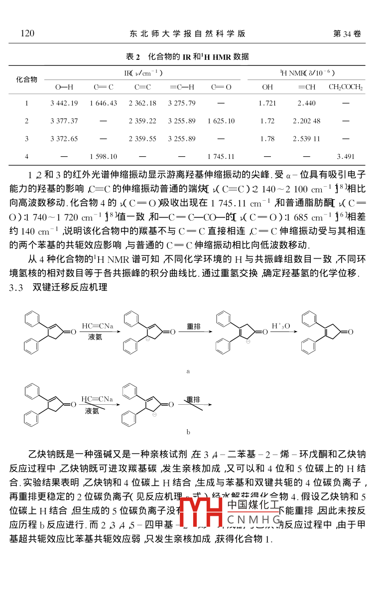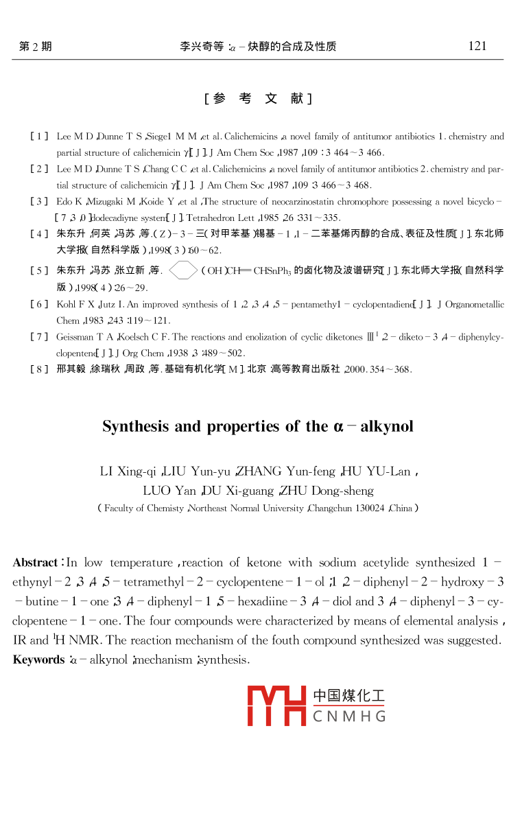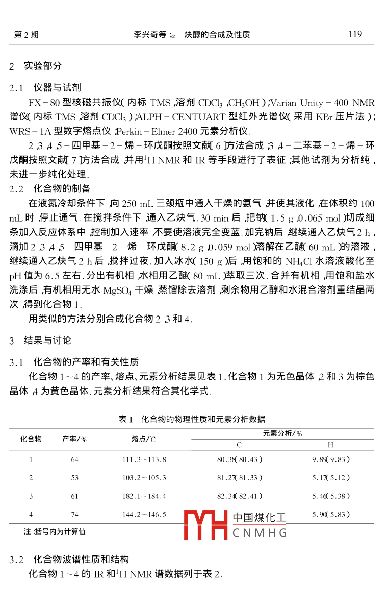 第34卷第2期東北師大學(xué)報自然科學(xué)版Vol. 34 No. 22002年6月JOURNAL OF NORTHEAST NORMAL UNIVERSITYJune 2002[文章編號]000-1832( 2002 )2-0118-04[研究簡報]Q-炔醇的合成及性質(zhì)李興奇,劉蘊宇張云峰胡玉蘭,羅艷杜錫光朱東升(東北師范大學(xué)化學(xué)學(xué)院吉林長春130024 )[摘要]報道了在低溫條件下,以鄰二酮和a -環(huán)烯酮為原料與炔鈉反應(yīng)合成了23 A 5-四甲基-1-乙炔基-2-烯-環(huán)戊醇、1 2-二苯基-2-羥基.-3-丁炔-1一酮、3 A-二苯基-1 5-己二炔-3 A-二醇和3 A-二苯基-3-環(huán)戊烯-1-酮4種化合物.通過元素分析、HNMR和IR等手段對3種新的a-炔醇及一種雙鍵遷移產(chǎn)物的結(jié)構(gòu)進行了表征并對雙鍵遷移反應(yīng)機理及性質(zhì)進行了研究.[關(guān)鍵詞] a-炔醇;反應(yīng)機理合成[中圖分類號] 0624.32[文獻標識碼]A1引言癌癥是一種嚴重危害人類生命健康的常見病和多發(fā)病.80年代末人們發(fā)現(xiàn)了15-二炔-3-烯”體系具有驚人的抗癌活性,是目前世界上最好的抗癌抗菌素1~3].但是這些化合物在自然界含量較低并且分離和提純較難使其應(yīng)用受到限制.炔類化合物是合成抗癌藥物的一種重要中間體4 5]本文通過酮和炔鈉反應(yīng)首次合成了3種a-炔醇化合物并對雙鍵遷移反應(yīng)機理及性質(zhì)進行了研究對進一步系統(tǒng)地研究其抗癌活性及構(gòu)效關(guān)系具有重大的意義.CH3CHL ,C=CHOH C=CHC-L--OOHHC=s(OH .1中國煤化工4MYHCNMHG[收稿日期] 2002-03-05[基金項目]吉林省科技廳應(yīng)用研究項目( 9111)[作者簡介]李興奇( 1970- )男碩士研究生講師朱東升( 1962- )男副教授主要從事金屬有機化學(xué)研究.第2期李興奇等ia-炔醇的合成及性質(zhì)1192實驗部分2.1 儀器與試劑FX - 80型核磁共振儀(內(nèi)標TMS ,溶劑CDCI3 ,CH,OH ) ;Varian Unity - 400 NMR譜儀內(nèi)標TMS溶劑CDCl3 );ALPH- CENTUART型紅外光譜儀(采用KBr壓片法);WRS - 1A型數(shù)字熔點儀Perkin - Elmer 2400元素分析儀.2 3 A 5-四甲基-2-烯-環(huán)戊酮按照文獻6方法合成3 A-二苯基-2-烯-環(huán)戊酮按照文獻7方法合成并用'H NMR和IR等手段進行了表征;其他試劑為分析純,未進-步純化處理.2.2化合物的制備在液氮冷卻條件下向250 mL三頸瓶中通入干燥的氨氣并使其液化在體積約100mL時停止通氣.在攪拌條件下通入乙炔氣.30 min后把鈉( 1.5 g 0.065 mol )切成細條加入反應(yīng)體系中控制加入速率不要使溶液完全變藍.加完鈉后繼續(xù)通入乙炔氣2 h,滴加2 3 A 5-四甲基-2-烯-環(huán)戊酮(8.2 g 0.059 mol )溶解在乙醚( 60 mL )的溶液,繼續(xù)通入乙炔氣2h后攪拌過夜.加入冰水( 150 g )后,用 飽和的NH4Cl水溶液酸化至pH值為6.5左右.分出有機相水相用乙醚(80mL)萃取三次.合并有機相,用飽和鹽水洗滌后有機相用無水MgSO4干燥蒸餾除去溶劑剩余物用乙醇和水混合溶劑重結(jié)晶兩次得到化合物1.用類似的方法分別合成化合物23和4.3結(jié)果與討論3.1化合物的產(chǎn) 率和有關(guān)性質(zhì)化合物1~4的產(chǎn)率、熔點、元素分析結(jié)果見表1.化合物1為無色晶體2和3為棕色晶體A為黃色晶體.元素分析結(jié)果符合其化學(xué)式.表1化合物的物理性 質(zhì)和元素分析數(shù)據(jù)元素分析/%化合物產(chǎn)率/%熔點/CH1111.3~113.880.38( 80.43 )9.899.83)253103.2- 105.381.2X 81.33 )5.1X5.12)361182.1~ 184.482.34( 82.41 )5.465.38 )144.2~ 146.5中國煤化工5.90( 5.83 )注括號內(nèi)為計算值MHCNMHG3.2化合 物波譜性質(zhì)和結(jié)構(gòu)化合物1~4的IR和'HNMR譜數(shù)據(jù)列于表2.120東北師大學(xué)報自然科學(xué)版第34卷表2化合物的 IR和'H HMR數(shù)據(jù)IR( v/cm-1)H NMR( 8/10-6)化合物O-H=CC=C=C-Hc=OOH=CHCH2COCH23442.191 646. 432 362.183275 .791.7212.44023377. .372 359 .223255.89 1 625 . 101.722.202 48-3372.652359.553255.891.782.539 1141 598.10一1 745.113.491.12和3的紅外光譜伸縮振動顯示游離羥基伸縮振動的尖峰.受a-位具有吸引電子能力的羥基的影響C=C的伸縮振動普通的端炔[ (C= =C)2140~2 100 cm-1 jδ]相比向高波數(shù)移動.化合物4的(C= O )吸收出現(xiàn)在1 745.11 cm-1和普通脂肪酮[ (C=O):1740~1 720cm-1j8值- -致和一-C-C- -CO-的以(C-0):1 685 cm-1 j6相差約140 cm-1說明該化合物中的羰基不與C-C直接相連C- C伸縮振動受與其相連的兩個苯基的共軛效應(yīng)影響與普通的C= C伸縮振動相比向低波數(shù)移動.從4種化合物的H NMR譜可知不同化學(xué)環(huán)境的H與共振峰組數(shù)目-致,不同環(huán)境氫核的相對數(shù)目等于各共振峰的積分曲線比.通過重氫交換確定羥基氫的化學(xué)位移.3.3雙鍵遷移反應(yīng)機理aHC=CNa.重排.H+;O液氨HC=CNa_重排液氨~b乙炔鈉既是-種強堿又是-種親核試劑在3 A-二苯基-2-烯-環(huán)戊酮和乙炔鈉反應(yīng)過程中,乙炔鈉既可進攻羰基碳發(fā)生親核加成,又可以和4位和5位碳上的H結(jié)合.實驗結(jié)果表明,乙炔鈉和4位碳上H結(jié)合生成與苯基和雙鍵共軛的4位碳負離子,再重排更穩(wěn)定的2位碳負離孔(見反應(yīng)機理。式)經(jīng))k解蓀得化會物4.假設(shè)乙炔鈉和5位碳.上H結(jié)合但生成的5位碳負離子沒中國煤化工下能重排,因此未按反應(yīng)歷程b反應(yīng)進行.而2,3A,5-四甲基THCN M H為反應(yīng)過程中,由于甲基超共軛效應(yīng)比苯基共軛效應(yīng)弱只發(fā)生親核加成獲得化合物1.第2期李興奇等ia-炔醇的合成及性質(zhì)121[參考文獻][1] Lee MD ,Dunne T S Siegel M M et al. Calichemicins a novel family of antitumor antibiotics 1. chemnistry a