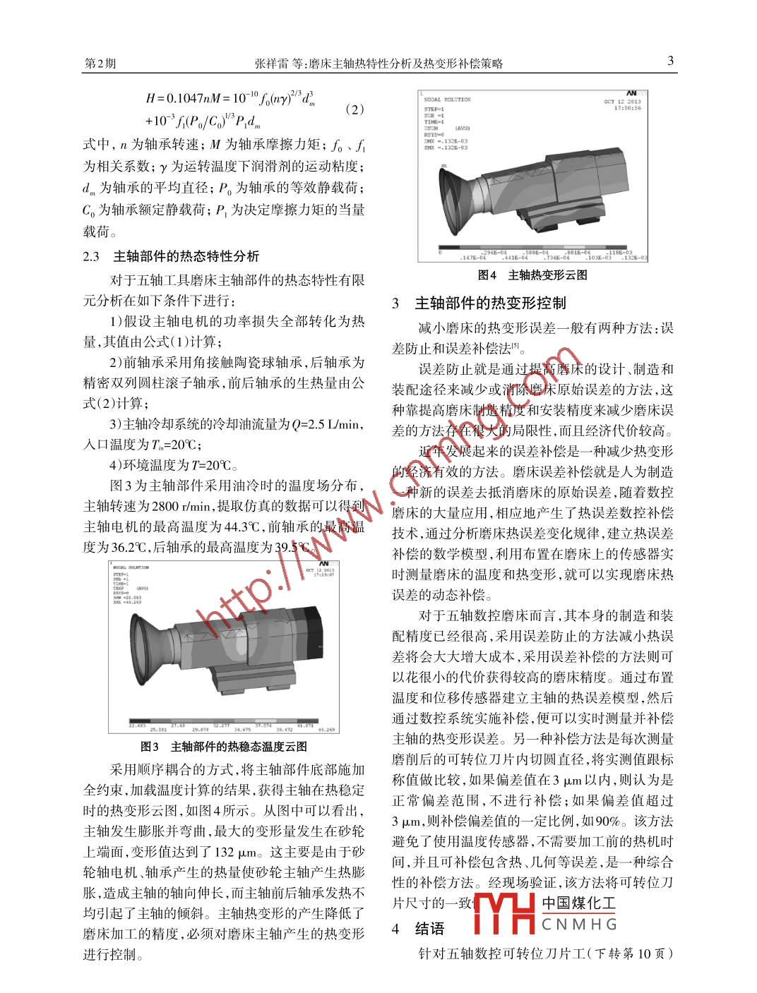 機(jī)電技術(shù)2014年4月磨床主軸熱特性分析及熱變形補(bǔ)償策略張祥雷馮偉陳站羅琪(廈門大學(xué)物理與機(jī)電工程學(xué)院,福建廈門361005)摘要:針對五軸數(shù)控可轉(zhuǎn)位刀片周邊工具磨床建立了砂輪-主軸-軸承-主軸箱的主軸部件有限元模型,分析了主軸部件的熱源及其發(fā)熱量的計(jì)算公式,通過有限元仿真計(jì)算得到磨床主軸的熱穩(wěn)態(tài)溫度場和熱變形量,進(jìn)行了主軸熱特性分析。在不增加溫度、位移傳感器的基礎(chǔ)上提岀了有效的主軸熱變形補(bǔ)償策略,實(shí)現(xiàn)刀片加工精度達(dá)到5μm的精度要求關(guān)鍵詞:主軸靜剛度;軸承-轉(zhuǎn)子系統(tǒng);軸承剛度;熱變形補(bǔ)償中圖分類號:TH161文獻(xiàn)標(biāo)識碼:A文章編號:1672-4801(2014)02-002-03主軸單元作為磨床的關(guān)鍵部件,其熱特性直五軸精密數(shù)控可轉(zhuǎn)位刀片周邊磨床如圖1所接影響磨床加工的精度和穩(wěn)定性,對其進(jìn)行準(zhǔn)確示,磨床主要由床身、主軸、臥式回轉(zhuǎn)工作臺、立式的分析至關(guān)重要。國內(nèi)學(xué)者吳玉厚對高速電主軸回轉(zhuǎn)工作臺、頭架、尾架、高精度兩坐標(biāo)直線工作單元的工作原理、結(jié)構(gòu)、關(guān)鍵技術(shù)和性能分析等方臺、砂輪架、修整器等部件組成。圖2為磨床的主面有較全面的論述。蘭州理工大學(xué)對HMC80臥軸部件,通過工程分析,它有兩個主要熱源:一是式加工中心電主軸熱、動態(tài)特性分析及耦合進(jìn)行電機(jī),主軸電機(jī)在空轉(zhuǎn)或加工時(shí)所消耗的功率轉(zhuǎn)了研究。浙江大學(xué)的蔣興奇對主軸軸承的熱特變?yōu)闊崃?二是軸承,主軸軸承在高速運(yùn)轉(zhuǎn)中存在性進(jìn)行了較深人的研究,并推導(dǎo)了軸承熱變形對的復(fù)雜摩擦生成熱量,直接導(dǎo)致主軸部件的熱變軸承動力學(xué)特性的影響。在以上研究的基礎(chǔ)形,嚴(yán)重時(shí)甚至?xí)l(fā)生金屬粘結(jié)燒傷現(xiàn)象,使軸承上,本文針對自主開發(fā)的五軸數(shù)控精密可轉(zhuǎn)位刀失效。本文分析暫不考慮磨削熱的影響。片周邊磨床的主軸部件的熱特性進(jìn)行了研究,分2主軸部件的熱態(tài)特性分析析其達(dá)到熱穩(wěn)態(tài)時(shí)溫度場和熱變形,提出有效的主軸熱變形補(bǔ)償策略,為提高工具磨床的穩(wěn)定性21主軸電機(jī)的發(fā)熱計(jì)算提供理論依據(jù)主軸電機(jī)的損耗一般分為4類:機(jī)械損耗、電1主軸部件的主要熱源分析損耗、磁損耗和附加損耗。前三類損耗通常稱為主要損耗,附加損耗在總的損耗總所占比例很小約為額定功率的1%~5%,可忽略不計(jì)。故電機(jī)EG產(chǎn)生的熱量可采用下式計(jì)算P=TporL+/R+bfB(1)式中,a為摩擦系數(shù);p為空氣密度;ω為角速度r為轉(zhuǎn)子的外半徑;L為轉(zhuǎn)子的長度;/為電流;R為導(dǎo)體的電阻;b為與電工鋼牌號有關(guān)的常數(shù);f為磁化頻率;B-為磁感應(yīng)強(qiáng)度最大值。22軸承的發(fā)熱計(jì)算圖1磨床整機(jī)外觀圖軸承的摩擦是內(nèi)外套圈相對運(yùn)動時(shí),軸承內(nèi)部各元件對該運(yùn)動阻抗的總和。根據(jù) Palmgren理論,摩擦力矩M主要由空載時(shí)潤滑油粘性所產(chǎn)生的摩擦力矩YHE中國煤化工作用產(chǎn)生的摩擦力矩MCNMHG算公式如圖2主軸部件簡圖*國家科技重大專項(xiàng)(2010ZX04001-162)乍者簡介:張祥雷(1987-),男,在讀博士,研究方向:復(fù)雜曲面成形與精密數(shù)控裝備制造技術(shù)研第2期張祥雷等:磨床主軸熱特性分析及熱變形補(bǔ)償策略7nM=10 o(ny)"dSODAL SelETIONcTi:=013+103f(P0/C0)°Pdn式中,n為軸承轉(zhuǎn)速;M為軸承摩擦力矩;f。、f為相關(guān)系數(shù);y為運(yùn)轉(zhuǎn)溫度下潤滑劑的運(yùn)動粘度dn為軸承的平均直徑;P為軸承的等效靜載荷C為軸承額定靜載荷;P為決定摩擦力矩的當(dāng)量載荷。2.3主軸部件的熱態(tài)特性分析對于五軸工具磨床主軸部件的熱態(tài)特性有限圖4主軸熱變形云圖元分析在如下條件下進(jìn)行主軸部件的熱變形控制1)假設(shè)主軸電機(jī)的功率損失全部轉(zhuǎn)化為熱減小磨床的熱變形誤差一般有兩種方法:誤量,其值由公式(1)計(jì)算差防止和誤差補(bǔ)償法。2)前軸承采用角接觸陶瓷球軸承,后軸承為誤差防止就是通過提高磨床的設(shè)計(jì)、制造和精密雙列圓柱滾子軸承,前后軸承的生熱量由公裝配途徑來減少或消除磨床原始誤差的方法,這式(2)計(jì)算;種靠提高磨床制造精度和安裝精度來減少磨床誤3)主軸冷卻系統(tǒng)的冷卻油流量為Q=2.Lmin,差的方法存在很大的局限性,而且經(jīng)濟(jì)代價(jià)較高。入口溫度為T=20℃近年發(fā)展起來的誤差補(bǔ)償是一種減少熱變形4)環(huán)境溫度為T=20℃。的經(jīng)濟(jì)有效的方法。磨床誤差補(bǔ)償就是人為制造圖3為主軸部件采用油冷時(shí)的溫度場分布種新的誤差去抵消磨床的原始誤差,隨著數(shù)控主軸轉(zhuǎn)速為2800rmin,提取仿真的數(shù)據(jù)可以得到磨床的大量應(yīng)用,相應(yīng)地產(chǎn)生了熱誤差數(shù)控補(bǔ)償主軸電機(jī)的最高溫度為4.3℃,前軸承的最高溫技術(shù),通過分析磨床熱誤差變化規(guī)律建立熱誤差度為36.2℃,后軸承的最高溫度為395℃。補(bǔ)償?shù)臄?shù)學(xué)模型,利用布置在磨床上的傳感器實(shí)時(shí)測量磨床的溫度和熱變形,就