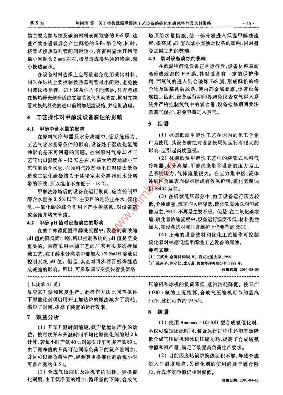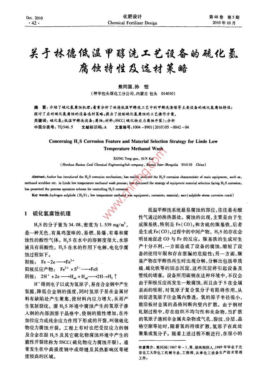 et.2010化肥設計第48卷第5期Chemical Fertilizer Design2010年10月關亍林德低溫甲醵洗工藝設備的硫化氨腐蝕特性及材策略熊同國,孫愷(神華包頭煤化工分公司,內蒙古包頭014010)摘要:介紹了硫化氬腐蝕機理;著重分析了林德低溫甲醇洗工藝中的甲醇洗滌塔等主要設備的硫化氫腐蝕特性;探討了應對硫化腐蝕的設備選材策略;提出了控制硫化氫腐蝕的工藝操作方案。關鍵詞:堿化氫;低溫甲醇洗設備;腐蝕;材料;SSCC(硫化物應力腐蝕開裂);分析中圖分類號:TQ546.5文獻標識碼:A文章編號:1004-8901(2010)05-0042-04Concerning H, S Corrosion Feature and Material Selection Strategy for Linde LowTemperature Methanol WashXIONG Tong-guo, SUN KaiShenhua Baotou Coal Chemical EngineeringSub-company, Baotou Inter-Mongolia 014110 China)Abstract: Author has introduced the H,S corrosion mechanism; has mainly analyzed the H, S corrosion characteristic of main equipment, such asmethanol scrubber etc, in Linde low temperature methanol wash process; has discussed the strategy of equipment material selection facing H,S corrosionhas presented the process operation scheme for controlling H,S corosion.Key words: hydrogen sulphide(H,S); low temperature methanol was equipment; corrosion; material; sece( sulphide stres corrosion crack1硫化氫腐蝕機理低溫甲醇洗系統(tǒng)最易腐蝕的部位,往往是有酸性氣通過的換熱器處。腐蝕的出現,主要是由于生H2S的分子量為34.08,密度為1539mg/m3,成羰基鐵特別是Fe(CO)5和含硫的羰基鐵,后者是一種無色、有臭雞蛋味的、易燃、易爆、有毒和腐是生成Fe(CO)過程中的中間產物。H2的存在會蝕性的酸性氣體。H2S在水中的溶解度很大水溶明顯地促進CO與Fe的反應。羰基鐵的生成對生液具有弱酸性。H1S在水的作用下電解電化學腐產十分不利,一方面造成了設備的腐蝕縮短了設蝕過程如下。備的使用年限和存在泄漏的危險性;另一方面,羰基產物在甲醇熱再生時出現分解,分解出包括單質陽極反應產物:Fe2++S2-→FeS硫硫化鐵等的固態(tài)沉淀,這些沉淀將引起設備及陰極:2H+2e→→H+H+2H→H2↑管線的堵塞。設備所用碳鋼在這種環(huán)境中,不僅會H得到電子以成為氫原子易在合金鋼中產生由于陽極反應而發(fā)生一般腐蝕,而且由于S在金屬氫脆降低合金鋼的強度,同時氫原子易在金屬材表面的吸附,對氫原子復合氫分子有阻礙作用從料有缺陷處產生聚集,使材料內應力增大,從而產而促進氫原子往金屬內滲透。氫的原子半徑很小,生氫制裂紋。濕H2S環(huán)境中腐蝕產生的氫原子滲能沿板材金屬的晶格間斷向壁內擴散。由于鋼材人鋼的內部固溶于晶格中,使鋼的脆性增加,在外軋制過程中,存在組織不均勻性和夾雜物,當擴散加拉應力或殘余應力作用下形成的開裂叫做硫化的氫原子遇到非金屬夾雜物或氣孔裂紋分層、晶物應力腐蝕開裂。工程上有時也把受拉應力的鋼格空隙等處時,隨著氫的持續(xù)擴散氫原子在此處及合金在濕H2S及其它硫化物腐蝕環(huán)境中產生的聚集成氫分子。隨著上述過程不斷進行在很小的脆性開裂統(tǒng)稱為 SSCC(硫化物應力腐蝕開裂)。通常發(fā)生在中高強度鋼中或焊縫及其熱影響區(qū)等硬者簡介:熊同國(1967年-),男湖南湘陰人,1989年畢業(yè)于北度較高的區(qū)域京化工大學化工機械專業(yè),工程師,從事化工設備生產技術管理作第5期熊同國等關于林德低溫甲醇洗工藝設備的硫化氫腐蝕特性及選材策略43區(qū)域內體積急劇膨脹,當達到一定量時,可產生極氫、水絕大部分溶解于甲醇中,氣相成分中硫化氫大的內壓力(可達10MPa),促使表面隆起形成鼓水含量相對很少。因此在工藝氣中濕硫化氫的濃包。當包內壓力繼續(xù)增大,鼓包直徑與隆起高度也度較小,產生的氫離子也較少,對材料帶來的SSCC越來越大,直至最后破裂。這就是容器板材最終分危害也很小。而在原料氣冷卻器中,噴淋甲醇的量層,鼓包甚至開裂的主要原因。很少,同時工藝氣中的水大量冷凝出來,給SSCC的2甲醇洗設備主要采用的碳鋼材料形成創(chuàng)造了很好的條件。氫離子、腐蝕環(huán)境、應力集中是SSC發(fā)生的3個必須條件。因此,原料氣目前國內釆用林德低溫甲醇洗技術的廠家,甲冷卻器的問題多出在底部焊縫處。陜西渭化的原醇洗滌塔以SA203GrE為主,少數廠家考慮建造成料氣冷卻器出口管座與換熱器筒壁角焊縫12點方本選用09 MnNiDR。原料氣冷卻器的選材逐漸放棄向發(fā)生垂直于焊縫的裂紋,前后8次修理,最后更換進口板材SA203GE轉為選擇國產不銹鋼材料304了1m直徑的換熱器筒壁才得以根治。期間生產系或321。水分離罐以16MnDR、09 MnNiDR為主,只統(tǒng)停車共計56天,直接減少尿素產量84萬t。有寧化選用過CF-62且在使用1個月左右發(fā)生嚴上述分析表明原料器冷卻器選用不銹鋼重設備事故,而選用16MnDR的鎮(zhèn)海煉化、陜西渭321等具有較大的運行安全優(yōu)勢。在設備焊接過程化在開車5年左右更換了新的水分離罐,更換原因應當選用合適的焊接工藝,保證焊接區(qū)域的金相組均為設備焊縫有較大裂紋狀缺陷。二氧化碳濃縮織穩(wěn)定,沒有晶間腐蝕趨勢。同時,應當保證整體塔、硫化氫濃縮塔設計溫度一般為-70℃,按照傳硬度不超過200HB,減少發(fā)生應力腐蝕的可能性。統(tǒng)的選材方式應當選用SA203GE,但隨著國產不3.2甲醇水分離器銹鋼材料的價格逐漸降低,很多廠家選用國產304采用林德低溫甲醇洗工藝的廠家,甲醇水分離或32l等不銹鋼材料,少數