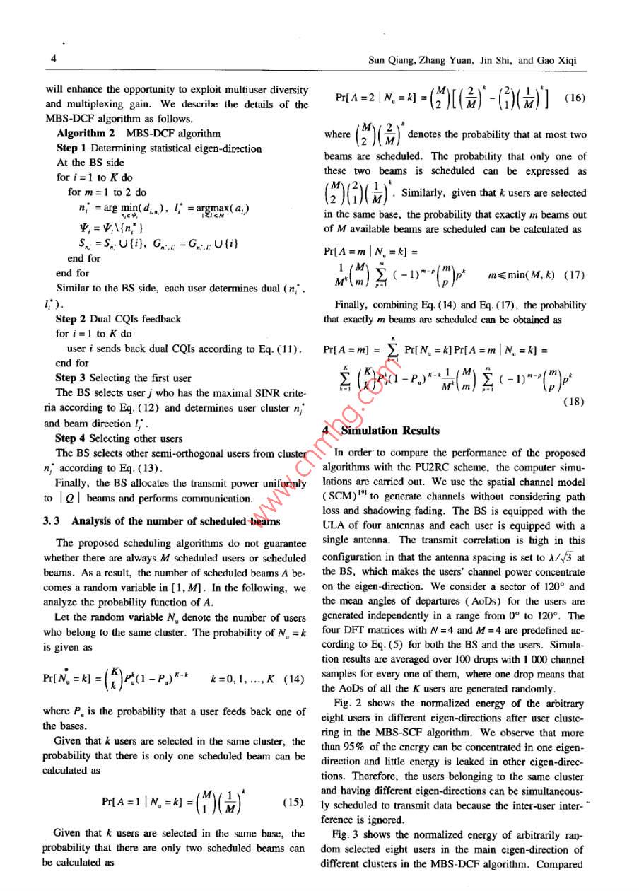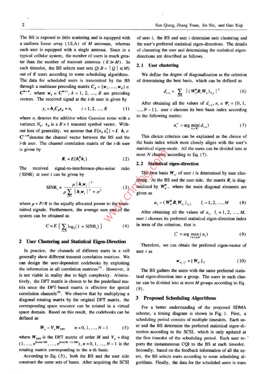 Journal of Southeast University( English Edition) VoL 28, No 1, pp 1-7Mar.2012ISSN1003-7985Limited feedback Sdma schemes based on statistical CSISun Qiang"- Zhang YJin Shi Gao xiqi(National Mobile Communications Research Laboratory, Southeast University, Nanjing 210096, China)School of Electronic and Information Engineering, Nantong University, Nantong 226019, ChinaAbstract: This paper investigates the multi-beam selection and the feedback overhead of the users are higher when aalgorithms for transmit correlation channels by using statistical larger codebook is used to reduce the interference, sincechannel state information( SCSI) and instantaneous channel the beamforming vector is generally determined by an erstate information. Unlike the conventional codebook-basehaustive search in the sets of codebooks at the user sidetransmission scheme, the proposed multi-beam selection with and it is sent back to the base station(BS) at each time-the single channel quality indicator( cQn) feedback(MBSslot. 2) The schedulers become inefficient, especiallySCF)algorithm determines the preferred beam vector by when the user pool is small, because it is unlikely to findexploiting the SCSI and only feeds back CQI at each timeslot. a few simultaneous users with semi-orthogonal channelsThe performance of the MBS-SCF algorithm is nearly then a small user poolsame as that of the conventional scheme. In order to further In this paper, we consider a limited feedback SDMAimprove the average sum rate, a novel multi-beam selectionwith the dual CQls feedback MBS-DCF)algorithm isscheme in a suburban scenario, where the channel fadingof different antennas(e. g. uniform linear array ) at thproposed, which determines dual preferred statistical eigen- BS is highly correlated due to little scattering and smalland simulation results demonstrate that the angular spread. The statistical channel state informationMBS-DCF algorithm can increase the multiuser diversity and (SCSI)represents the statistical properties of the channel.multiplexing gain and exhibits a higher average sum rate.generally including the distribution of channel fading, theKey words: spatial division multiple access; statistical channel average channel gain and the spatial correlation, etc. Itsstate information; multiuser multiple-input multiple-outputcoherence period is generally much longer than that of thedoi:10.3969/jiss.1003-7985.2012.01.001instantaneous channel realizations 4. Therefore it can beasily obtained by the receiver and feed back to the trans-Multiuser multiple-input multiple-output MU-MF. mitter, An altermative is to exploit the uplink/downlinkMO)downlink systems exploit multiplexing gains reciprocity of channel statistics. Compared with the in-and the multiuser diversity gains to significantly increase stantaneous CSI per timeslot, the overhead of the SCSIthe throughput of the systems". In practice,limitedcan befeedback spatial division multiple access SDMABased on these observations, we propose simple andefficient SDMA schemes with limited feedback by explA per-user unitary and rate control( PU2RC) scheme, correlation matrices)are acquired by either of the annelcomputational complexity and little amount of overhead. ting the SCSI. First, assuming that the SCSIs(channelwhich is a practical implementation of the limited feed. methods, the BS and each user can determine theback SDMA scheme with predefined sets of orthogonal co- ferred statistical cigen-direction beamforming vector)ebooks, has been proposed as a practical MU-MIMO so- during the period of updating the SCSI (or each user canlution in next-generation wireless communication stand. determine the preferred statistical eigen-direction and sendards.However, the major drawbacks of the pu2Rc back the index of the preferred statistical eigen-directiorscheme are as follows: 1)The computational complexity to the BS). During the scheduling period, each user onlyfeeds back the channel quality indicator( CQi)on its pre-Received 2011-11-21ferred statistical eigen-direction without the corespondingBiographies: Sun Qiang(1980-), male, lecturer, graduate; Gao Xiqi vector index at each timeslot. Secondly, in order to over-carresponding author), male, doctor, professor, xqgaoe seu. edu.cn.Foundation items: The National Natural Science Foundation of chinaome the obstacle due to a small user pool, cachlo, 608925004, 60002009, 6101 103). the National Science and Technology user can select dual preferred statistical eigen-direcMajor Project of China( No 2009ZX03003-005-02 2009ZX03003-011-04. according to the sCsI. At each timeslot, each user2011ZX0B0B-008-03), the Natural Science Foundation of Jiangsu Province back dual CQIs on its dual preferred statistical eigen-di-of China(No BK201 1019), the Natural Science Foundation of the Jiangsu rections, which will increase the multiplexing gains andHigher Education Institutions of China(No. 10KJBS10021)e multiuser diversity gainsCitation: Sun Qiang, Zhang Yuan, Jin Shi, et al. Limited feedback SDMA schemes based on statistical CSI[ J]. Joumal of Southeast University 1 System Model( English Edition),2012,28(1):1-7.Idoi:10.3969/j.isn.10037985.2012.01.0011We consider the downlink MIMO system with K users.Sun Qiang, Zhang Yuan, Jin Shi, and Gao xiqiThe Bs is exposed to little scattering and is equipped with of user i, the BS and user i determine user clustering anda uniform linear array (ULA)of M antennas, whereas the user's preferred statistical eigen-directions. The detailseach user is equipped with a single antenna, Since in a of clustering the user and determining the statistical eigentypical cellular system, the number of users is much grea- directions are described as followster than the number of transmit antennas(K>M).Ineach timeslot, the BS selects user sets Q(B=IQI