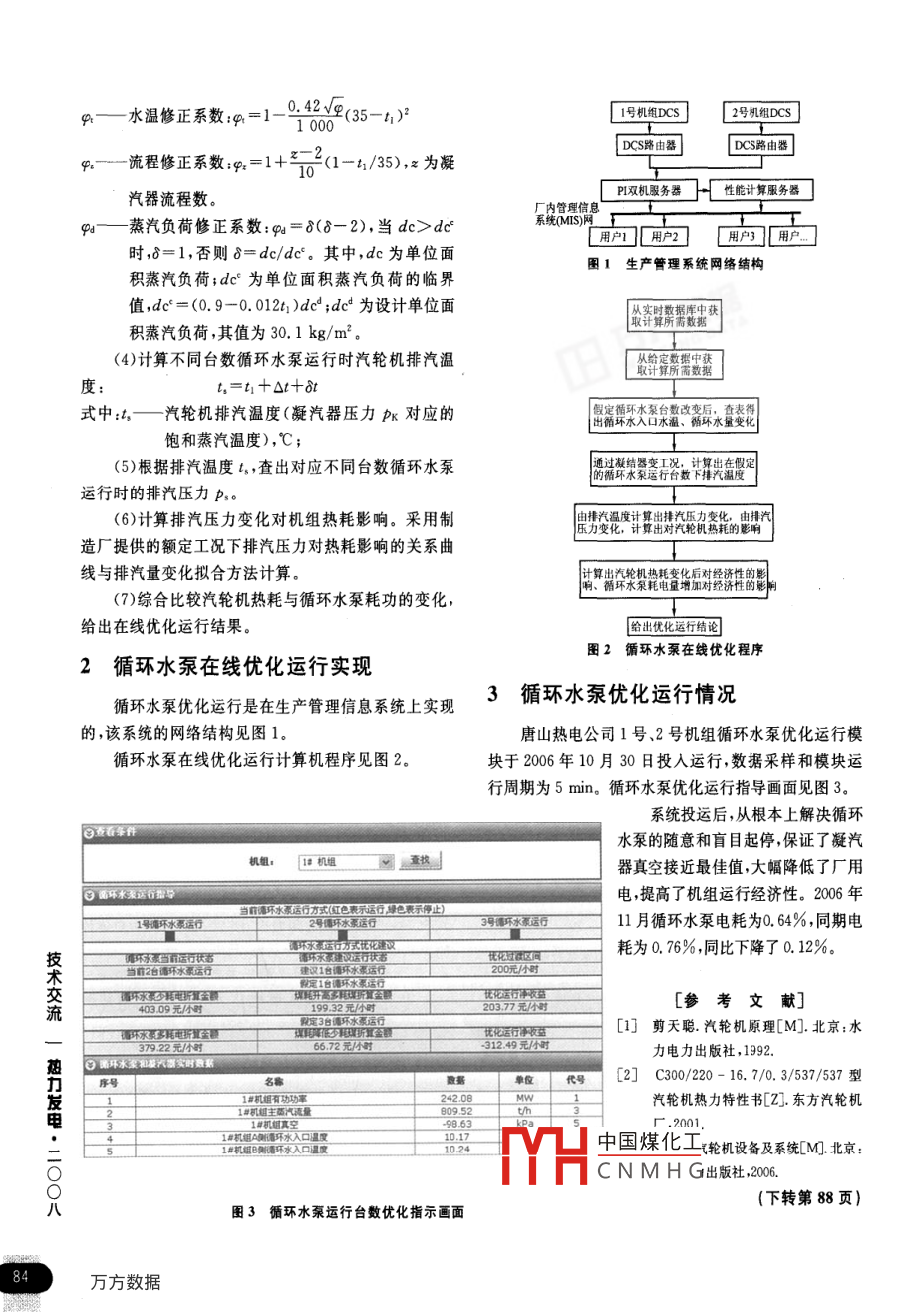 300MW機(jī)組循環(huán)水泵的在線優(yōu)化運行田小冬,劉福君唐山熱電公司,河北唐山063029[摘要]介紹了300MW機(jī)組循環(huán)水泵在線優(yōu)化運行的計算方法、模塊結(jié)構(gòu)及優(yōu)化實施方法。優(yōu)化系統(tǒng)投入后,解決了循環(huán)水泵起停的隨意性和盲目性,節(jié)電效果較好。[關(guān)鍵詞]300MW機(jī)組;汽輪機(jī);凝汽器;循環(huán)水泵;在線優(yōu)化[中圖分類號]TK264.1[文獻(xiàn)標(biāo)識碼]B[文章編號]1002-3364(2008)01-083-02唐山熱電公司300MW機(jī)組汽輪機(jī)為東方汽輪機(jī)式中:De為凝汽器蒸汽負(fù)荷,kg/s;Dw為循環(huán)水流廠制造的C300/220-16.70.3/537/537型、亞臨界、一量,kg/s;h,為排汽焓;h為凝結(jié)水焓,kJ/kg。當(dāng)排汽次中間再熱兩缸兩排汽、抽汽供熱式配3臺長沙水泵壓力變化不大時,△h=h,-h近似不變,一般取△h=廠生產(chǎn)的60IKXC-26型立式混流循環(huán)水泵。2臺泵或2250kJ/kg。實測的不同臺數(shù)循環(huán)水泵運行時的循3臺泵運行時,凝汽器真空提高,供電煤耗下降,但循環(huán)環(huán)水流量和循環(huán)水泵總耗電量見表2水泵耗電量大,使供電煤耗上升。因此,合理安排循環(huán)表2不同臺數(shù)循環(huán)水泵運行時的水泵的運行臺數(shù),對機(jī)組運行經(jīng)濟(jì)性具有重要意義。本循環(huán)水流量和循環(huán)水泵總耗電量文介紹了循環(huán)水泵運行臺數(shù)在線優(yōu)化的實施方法,以及1號機(jī)組2號機(jī)組在1號、2號機(jī)組上的應(yīng)用情況循環(huán)水泵運行臺數(shù)1循環(huán)水流量/t·h-1177483024040284182123096041177循環(huán)水泵功率/kW1237240234981325257936041循環(huán)水泵在線優(yōu)化計算方法和步驟(3)凝汽器端差計算:(1)循環(huán)水入口水溫t1為實測值與循環(huán)水泵運行臺數(shù)對入口水溫影響的修正值相加。試驗測得不同臺數(shù)循環(huán)水泵運行時修正數(shù)值見表1。式中:Aw為凝汽器冷卻面積(18000m2);K為總體傳表1不同臺循環(huán)水泵運對循環(huán)水入口水溫的修正值熱系數(shù):K=14650999qu,其中循環(huán)水泵循環(huán)水泵循環(huán)水泵循環(huán)水泵循環(huán)水泵9冷卻表面清潔程度修正系數(shù),開式循環(huán)時中=交運行臺數(shù)由1臺改由2臺改由3臺改由2臺改0.8~0.85,閉式循環(huán)0.75~0.8,不清潔時流變至2臺變至3臺變至2臺變至1臺0.65~0.75,選取g=0.85;循環(huán)水人口溫度+2+1.5修正值/℃1.1Cw流速與管徑修正系數(shù)9((2)循環(huán)水溫升△t計算由熱平衡方程可求得:其中,Cw為循環(huán)水流速;d為冷卻水管內(nèi)徑;h甫△-=x12中國煤化工CNMHG二00作者簡介:田小冬,唐山熱電公司副總工程師兼發(fā)電部部長xd6280@dtts.cnp—水溫修正系數(shù):9=1-014249(3-4)號機(jī)組Ds2號機(jī)組DCS:g=1+x-2DCS路由DCS路由器流程修正系數(shù)10-(1-4/35),x為凝汽器流程數(shù)。P雙機(jī)服務(wù)器性能計算服務(wù)器廠內(nèi)管理信息g蒸汽負(fù)荷修正系數(shù):g=8(8-2),當(dāng)dc>dc[用戶門[用2】[用戶3[用戶時,=1,否則δ=dc/dc。其中,dc為單位面圖1生產(chǎn)管理系統(tǒng)網(wǎng)絡(luò)結(jié)構(gòu)積蒸汽負(fù)荷;dcs為單位面積蒸汽負(fù)荷的臨界值,dcs=(0.9-0.012t1)d;dc為設(shè)計單位面積蒸汽負(fù)荷,其值為30.1kg/m2。(4)計算不同臺數(shù)循環(huán)水泵運行時汽輪機(jī)排汽溫度式中:t,——汽輪機(jī)排汽溫度(凝汽器壓力pk對應(yīng)的假定循環(huán)水泵臺數(shù)改變后,查表得飽和蒸汽溫度),℃C;(5)根據(jù)排汽溫度t查出對應(yīng)不同臺數(shù)循環(huán)水泵通過凝結(jié)器變工況,計算出在假定勺循環(huán)水泵運行臺數(shù)下排汽溫度運行時的排汽壓力p。(6)計算排汽壓力變化對機(jī)組熱耗影響。采用制造廠提供的額定工況下排汽壓力對熱耗影響的關(guān)系曲線與排汽量變化擬合方法計算。計算出汽輪機(jī)熱耗變化后對經(jīng)濟(jì)響、循環(huán)水泵耗電量增加對經(jīng)濟(jì)(7)綜合比較汽輪機(jī)熱耗與循環(huán)水泵耗功的變化給出在線優(yōu)化運行結(jié)果。[出優(yōu)化運行結(jié)論圖2循環(huán)水泵在線優(yōu)化程序2循環(huán)水泵在線優(yōu)化運行實現(xiàn)循環(huán)水泵優(yōu)化運行是在生產(chǎn)管理信息系統(tǒng)上實現(xiàn)3循環(huán)水泵優(yōu)化運行情況的,該系統(tǒng)的網(wǎng)絡(luò)結(jié)構(gòu)見圖1。唐山熱電公司1號、2號機(jī)組循環(huán)水泵優(yōu)化運行模循環(huán)水泵在線優(yōu)化運行計算機(jī)程序見圖2。塊于2006年10月30日投入運行,數(shù)據(jù)采樣和模塊運行周期為5min。循環(huán)水泵優(yōu)化運行指導(dǎo)畫面見圖3。系統(tǒng)投運后,從根本上解決循環(huán)查看條件水泵的隨意和盲目起停,保證了凝汽機(jī)組,[機(jī)熱器真空接近最佳值,大幅降低了廠用環(huán)水運行導(dǎo)電,提高了機(jī)組運行經(jīng)濟(jì)性。2006年環(huán)水行方式色表示行色表永停環(huán)水系行運行11月循環(huán)水泵電耗為064%,同期電環(huán)家壇行狀數(shù)耗為0.76%同比下降了0.12%。當(dāng)前2臺水索交圖環(huán)水耗電折量金參考文獻(xiàn)流[1]剪天聰.汽輪機(jī)原理[M].北京:水鵡⊙汽力電力出版社,1992位代號[2]C30022016.7/0.3/537/537型1#機(jī)組有功巧率汽輪機(jī)熱力特性書[Z].東方汽輪機(jī)組么環(huán)水入口溫度中國煤化工輪機(jī)設(shè)備及系統(tǒng)[M北京:CNMHG出版社,2006(下轉(zhuǎ