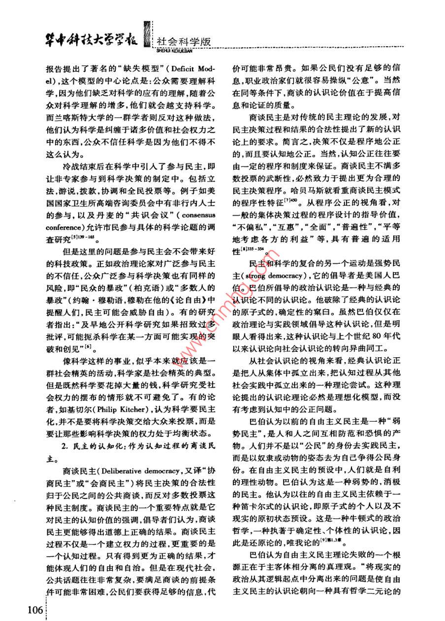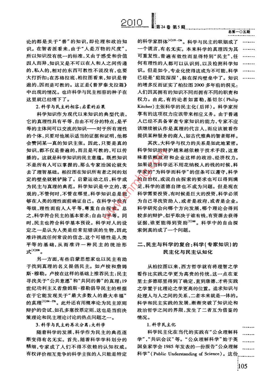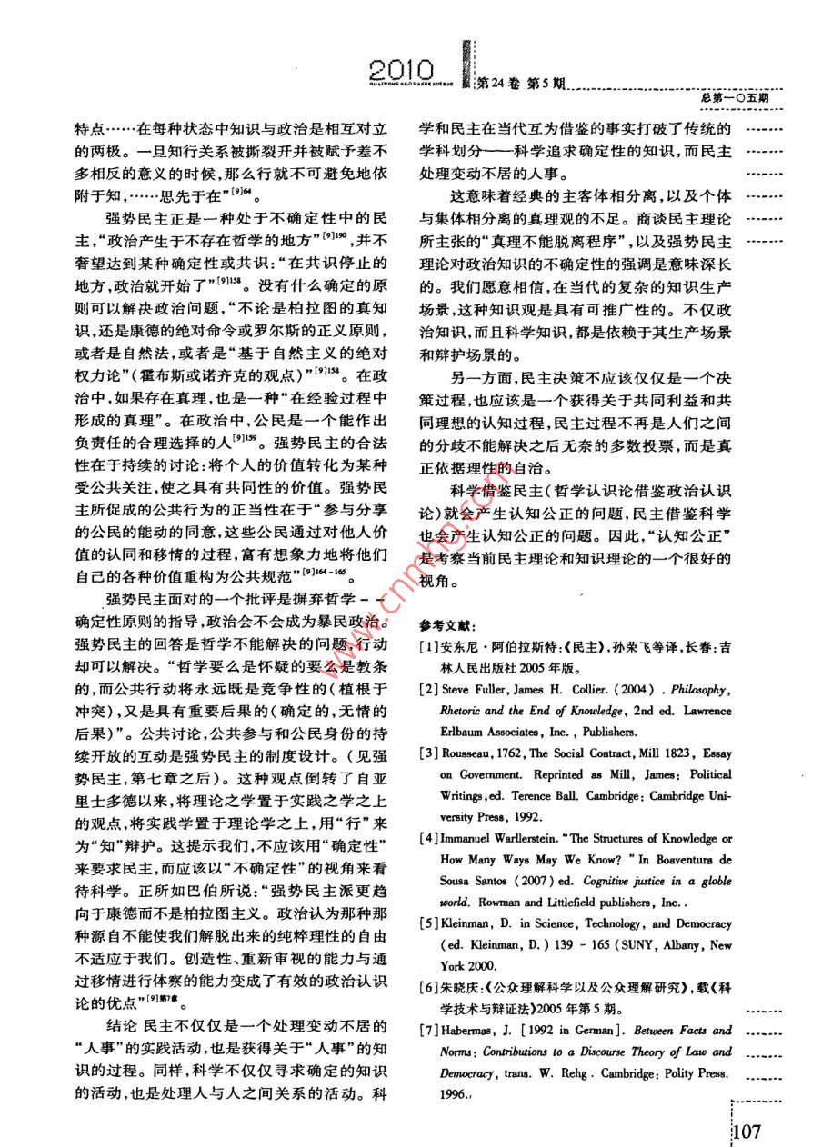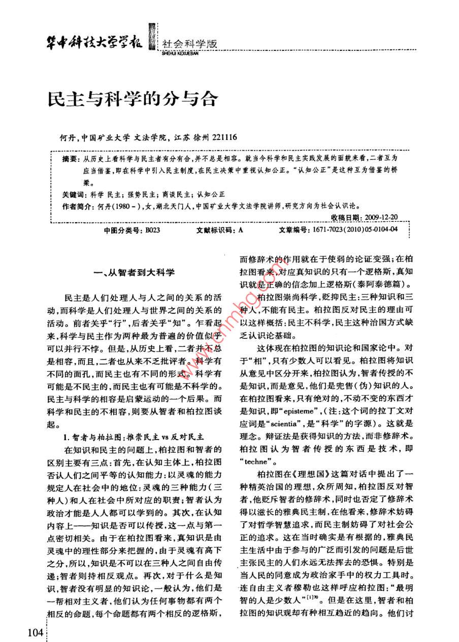 華*斜技大吞松圍社會科學(xué)版民主與科學(xué)的分與合何丹,中國礦業(yè)大學(xué)文法學(xué)院,江蘇徐州22l116摘要:從歷史上看科學(xué)與民主者有分有合,并不總是相容。就當(dāng)今科學(xué)和民主實(shí)踐發(fā)展的面貌來看,二者互為應(yīng)當(dāng)借鑒,即在科學(xué)中引入民主制度,在民主決策中重視認(rèn)知公正。“認(rèn)知公正”是這種互為借鑒的橋關(guān)鍵詞:科學(xué)民主;強(qiáng)勢民主;商談民主;認(rèn)知公正作者簡介:何丹(1980-),女,湖北天門人,中國礦業(yè)大學(xué)文法學(xué)院講師研究方向?yàn)樯鐣J(rèn)識論。收稿期:2001220中圖分類號:B023文獻(xiàn)標(biāo)識碼:A文章編號:1671-7023(2010)05010404而修辭術(shù)的作用就在于使弱的論證變強(qiáng);在柏、從智者到大科學(xué)拉圖看來,對應(yīng)真知識的只有一個邏格斯,真知識就是正確的信念加上邏格斯(泰阿泰德篇)。民主是人們處理人與人之間的關(guān)系的活柏拉圖崇尚科學(xué),貶抑民主:三種知識和三動,而科學(xué)是人們處理人與世界之間的關(guān)系的種人,不能有民主。柏拉圖反對民主的理由可活動。前者關(guān)乎“行”,后者關(guān)乎“知”。乍看起以這樣概括:民主不科學(xué)民主這種治國方式缺來科學(xué)與民主作為兩種最為普遍的價值似乎乏認(rèn)識論基礎(chǔ)。可以并行不悖。但是,從歷史上看,二者并不總這體現(xiàn)在柏拉圖的知識論和國家論中。對是相容,而且,二者也從來不乏批評者。科學(xué)有于“相”,只有少數(shù)人可以看見。柏拉圖將知識不同的面孔,而民主也有不同的形式。科學(xué)有從意見中區(qū)分開來,柏拉圖認(rèn)為智者傳授的不可能是不民主的,而民主也有可能是不科學(xué)的。是知識,而是意見,他們是兜售(偽)知識的人。民主與科學(xué)的相容是啟蒙運(yùn)動的一個后果。而在柏拉圖看來,只有絕對的,不動不變的東西才科學(xué)和民主的不相容,則要從智者和柏拉圖談是知識,即“ episteme”,(注:這個詞的拉丁文對應(yīng)詞是“ scientia”,是“科學(xué)”的字源)。這就是1.智者與柏拉圖:推崇民主v反對民主理念。辯證法是獲得知識的方法,而非修辭術(shù)。在知識和民主的問題上,柏拉圖和智者的柏拉圖認(rèn)為智者傳授的東西是技術(shù),即區(qū)別主要有三點(diǎn):首先,在認(rèn)知主體上,柏拉圖echne否認(rèn)人們之間平等的認(rèn)知能力:以靈魂的能力柏拉圖在《理想國》這篇對話中提出了規(guī)定人在社會中的地位:靈魂的三種能力(三種精英治國的理想,眾所周知,柏拉圖反對智種人)和人在社會中所對應(yīng)的職責(zé);智者認(rèn)為者,他貶斥智者的修辭術(shù)同時也否定了修辭術(shù)政治才能是人人都可以學(xué)到的。其次,在認(rèn)知得以滋長的雅典民主制在他看來修辭術(shù)妨礙內(nèi)容上——知識是否可以傳授,這一點(diǎn)與第一了對哲學(xué)智慧追求,而民主制妨礙了對社會公點(diǎn)密切相關(guān)。由于在柏拉圖看來,真知識是由正的追求。這在當(dāng)時確實(shí)是有根據(jù)的雅典民靈魂中的理性部分來把握的,由于靈魂有高下主生活中由于參與的廣泛而引發(fā)的問題是后世之分所以,知識是不可以在三種人之間自由傳主張民主的人們永遠(yuǎn)無法揮去的恐懼。特別是遞;智者則持相反觀點(diǎn)。再次,對于什么是知當(dāng)人民的同意成為政治家手中的權(quán)力工具時。識,智者沒有明顯的知識論,一般認(rèn)為,他們是連自由主義者穆勒也這樣呼應(yīng)柏拉圖:“最明幫相對主義者,他們認(rèn)為任何事物都有兩個智的人是少數(shù)人”1。但是在這里,智者和柏相反的命題,每個命題都有兩個相反的邏格斯,拉圖的知識觀卻有種相互趨近的趨向。他們討2010-12第x器第5期總第一○五期論的都是關(guān)于“善”的知識,即倫理和政治知的科學(xué)家群體“以。科學(xué)與民主的聯(lián)姻成了識。在智者派看來,由于“人是萬物的尺度”,一個謊言,有名無實(shí)本來科學(xué)的真理因?yàn)槠洹?所以知識沒有統(tǒng)一的標(biāo)準(zhǔn)又由于感受和價值可重復(fù)性,普遍有效性而顯得特別“民主”,任…--因人而異知識又是不可以在人和人之間傳遞何有理性的人都可以認(rèn)識到,以及檢測科學(xué)知的,私人的,相對的東西可教性不說沒有,也要識。但是如今,專業(yè)化使得這成為不可能,科學(xué)大打折扣;在蘇格拉底、柏拉圖看來,知識是普已經(jīng)是‘庭院深深’,躲在深溝壁壘中了。知識…遍的,因而是可教的。這正是《普羅泰戈拉篇》的增多反而證實(shí)了柏拉圖2000多年前的洞見:中出現(xiàn)的情況。也許科學(xué)與民主相容的種子在人們因其擁有的知識不同而擁有不同的職責(zé)和這里就已經(jīng)埋下了。權(quán)力。由此,有的論者如富勒,基切爾( Philip2.科學(xué)與民主的相容:啟蒙的后果Kitcher)主張科學(xué)的民主化(后祥)??茖W(xué)家所科學(xué)知識作為現(xiàn)代以來知識的典型代表,享有的這項(xiàng)權(quán)力應(yīng)該帶來相應(yīng)義務(wù)。由于普通它的真理性具有平等、自由不可分的特點(diǎn),是平人已經(jīng)不具備審查專家知識的能力,專家不應(yīng)等的主體間可以交流的知識——對于所有理性該繼續(xù)被認(rèn)作是真理的代言人,而應(yīng)該被看作的個體,只要對他展示適