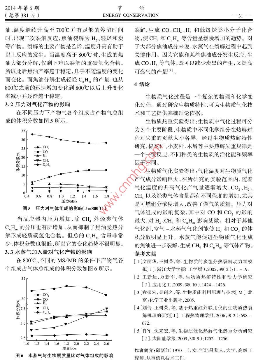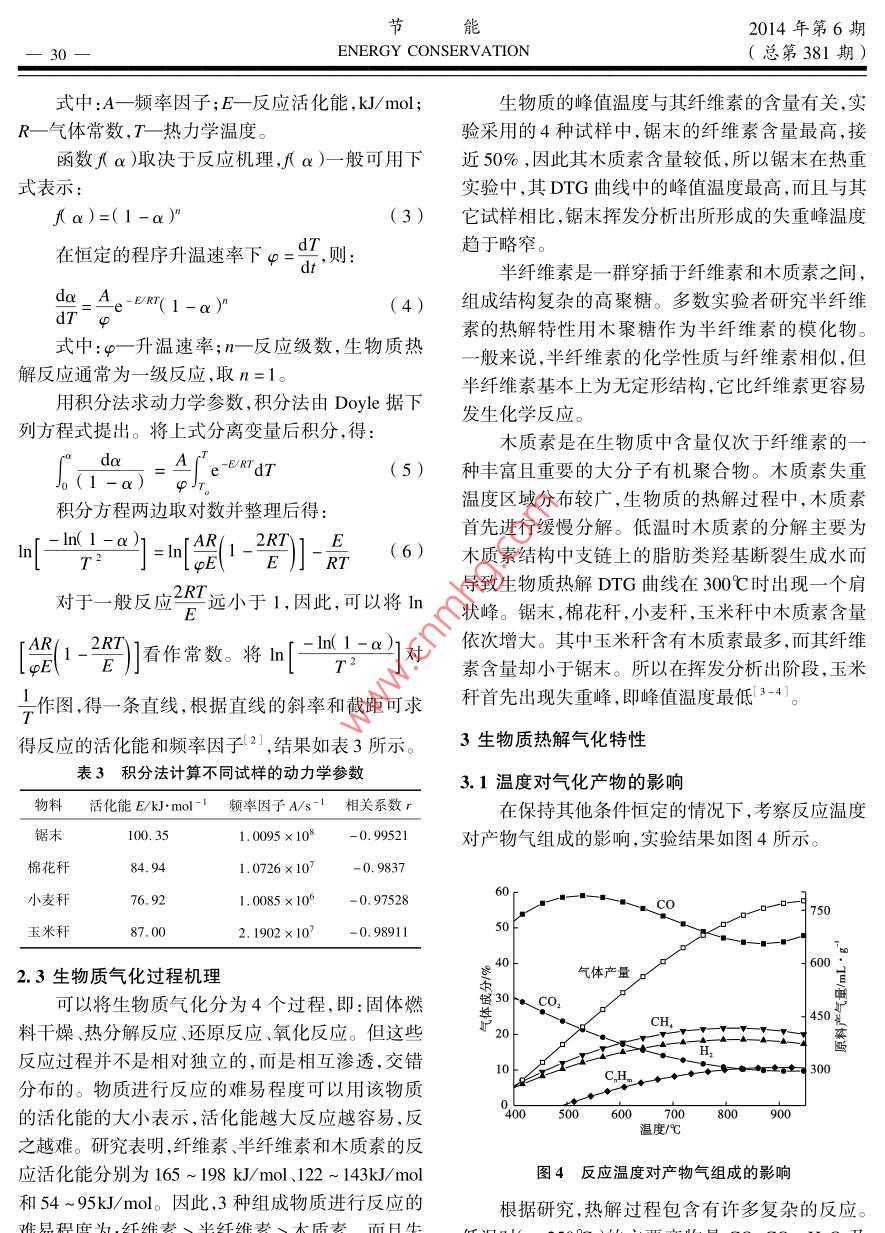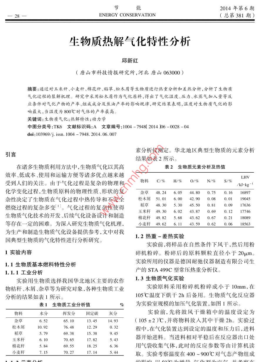 節(jié)能2014年第6期28 ENERGY CONSERVATION(總第381期)生物質(zhì)熱解氣化特性分析邱新紅(唐山市科技情報(bào)研究所,河北唐山063000)摘要:通過(guò)對(duì)玉米稈、小麥稈、棉花稈、稻草、松木屑等生物質(zhì)進(jìn)行熱重分析和差熱分析,分析了生物質(zhì)氣化過(guò)程的裂解機(jī)理。研究中采用松木屑作為氣化原料,得出了氣化溫度、壓力、水蒸氣加入量等反應(yīng)條件對(duì)氣化產(chǎn)物的產(chǎn)率、組成成分及焦油產(chǎn)率的影響規(guī)律,研究結(jié)果表明,溫度對(duì)生物質(zhì)氣化的影響最大,當(dāng)溫度為800℃時(shí)氣體的產(chǎn)率最高。關(guān)鍵詞:生物質(zhì)氣化;熱解特性;動(dòng)力學(xué)中圖分類號(hào):TK6文獻(xiàn)標(biāo)識(shí)碼:A文章編號(hào):104-7948(201406-0028-04doi:103969/j.issn.1004-7948.2014.06.007素分析儀測(cè)定。華北地區(qū)典型生物質(zhì)的元素分析引言結(jié)果如表2所示。在諸多生物質(zhì)利用方法中,生物質(zhì)氣化以其高表2生物質(zhì)元素分析及熱值效率、低成本、使用和運(yùn)輸方便等諸多優(yōu)點(diǎn)越來(lái)越 LHV受到人們的關(guān)注。由于氣化過(guò)程是復(fù)雜的物理和物料C/%H/%0/%/%/% /kJ.kg-I化學(xué)變化過(guò)程,生物質(zhì)原料的物理性質(zhì)、形狀的復(fù)7雜草48.246.0544.800.750.1616897雜性決定了生物質(zhì)在氣化過(guò)程中熱傳導(dǎo)和不完全松木屑51.016.0042.900.080.0119045燃燒過(guò)程的復(fù)雜多變。氣化過(guò)程的復(fù)雜性使得稻草48.305.3045.500.810.0917636玉米稈49.306.0243.870.690.1217746生物質(zhì)氣化技術(shù)的開(kāi)發(fā)、后續(xù)氣化設(shè)備設(shè)計(jì)和制造棉花稈49.825.6843.620.670.2118089等存在一定的困難。為深入研究生物質(zhì)氣化機(jī)理,小麥稈49.626.1143.590.620.0618563為生產(chǎn)和制造生物質(zhì)氣化設(shè)備提供參考,文中對(duì)我國(guó)典型生物質(zhì)的氣化特性進(jìn)行分析研究。1.2熱重-差熱實(shí)驗(yàn)實(shí)驗(yàn)前,將樣品在自然條件下風(fēng)干,然后用粉1實(shí)驗(yàn)內(nèi)容碎機(jī)粉碎。粉碎后的原料顆粒直徑小于20μm。1.1生物質(zhì)基本燃料特性分析實(shí)驗(yàn)所用的儀器是德國(guó)耐馳儀器制造有限公司生1.1.1工業(yè)分析產(chǎn)的STA499C型常壓熱重分析儀。實(shí)驗(yàn)用生物質(zhì)選擇我國(guó)華北地區(qū)主要的農(nóng)作1.3生物質(zhì)氣化實(shí)驗(yàn)物秸稈、木屑、雜草等為研究對(duì)象,各種生物質(zhì)工業(yè)實(shí)驗(yàn)原料采用粉碎機(jī)粉碎成小于10mm,在分析的結(jié)果如表1所示。105℃溫度下烘干2h后備用。生物質(zhì)氣化反應(yīng)器表1生物質(zhì)工業(yè)分析值%為實(shí)驗(yàn)室規(guī)模的加壓氣化裝置,如圖1所示。物料水分揮發(fā)分固定碳灰分實(shí)驗(yàn)前,先將鼓風(fēng)干燥箱中的溫度設(shè)定為雜草6.5265.1013.4514.93(105±2)℃,并將物料放入其中干燥2h實(shí)驗(yàn)過(guò)松木屑10.9276.4812.290.32程中,在氣化裝置達(dá)到設(shè)定的溫度和壓力后,進(jìn)料稻草5.7969.3815.389.45玉米稈6.1070.6517.825.43器開(kāi)始進(jìn)料。當(dāng)進(jìn)料相對(duì)平穩(wěn)后在反應(yīng)器出口處棉花稈5.8469.5518.256.36用氣袋收集氣體,此時(shí)的反應(yīng)參數(shù)等由計(jì)算機(jī)讀小麥稈7.1570.2717.145.44取。實(shí)驗(yàn)考察溫度在400~900℃對(duì)氣態(tài)產(chǎn)物組成11t的響0℃宜2014年第6期節(jié)能(總第381期) ENERGY CONSERVATION291MPa和1.7MPa時(shí),氣態(tài)產(chǎn)物組成的變化規(guī)律。1)第一進(jìn)程主要是將生物質(zhì)外的外在水分吸出,發(fā)生在150℃前,在此過(guò)程中,試樣均有一較大背壓閥焦油阱的失重過(guò)程,并在DTG圖上形成一個(gè)小的失重峰。轉(zhuǎn)鼓流量計(jì)2)溫度達(dá)到170℃后開(kāi)始進(jìn)入第二進(jìn)程,一直氣體采樣袋加熱持續(xù)到400℃,此進(jìn)程主要為生物質(zhì)中揮發(fā)分的析溫度控制儀質(zhì)量流量計(jì)出過(guò)程,是熱解氣化過(guò)程失重最為強(qiáng)烈的進(jìn)程,也螺旋是熱解過(guò)程的主要進(jìn)程;由于生物質(zhì)的90%為纖進(jìn)料器維素、半纖維素、木質(zhì)素3種主要高聚物,它們?cè)谠撨M(jìn)程發(fā)生裂解生成氣體造成試樣質(zhì)量損失,因此,與第一進(jìn)程相比失重分解反應(yīng)更加強(qiáng)烈,表現(xiàn)在T水蒸PC機(jī)發(fā)生器DTG圖上為失重峰更高。背壓閥3)第三進(jìn)程,溫度超過(guò)400℃以后,由于生物圖1生物質(zhì)氣化裝置圖質(zhì)試樣已經(jīng)失去了70%~80%的質(zhì)量,之后是一緩慢地失重過(guò)程。這熱失重過(guò)程中,玉米稈的重量2生物質(zhì)氣化過(guò)程動(dòng)力學(xué)研究變化最小,而鋸末的重量變化則最大,棉花稈和小麥稈居中。2.1生物質(zhì)的熱失重特性2.1.2差熱分析2.1.1熱重分析為研究生物質(zhì)氣化過(guò)程中吸熱或放熱現(xiàn)象對(duì)采用鋸末、小麥稈、棉花稈和玉米稈4種生物質(zhì)進(jìn)行熱重分析。4種不同生物質(zhì)各自的熱重TG原有的升溫或降溫速率的影響,對(duì)鋸末小麥稈、棉曲線和微商熱重DTG曲線分別如圖2、圖3所示?;ǘ捄陀衩锥挼壬镔|(zhì)氣化過(guò)程進(jìn)行了綜合熱分析,結(jié)果表明:生物質(zhì)失重的第一階段即外在水分120…鋸末的脫除,在100℃左右差熱曲線存在較明顯的吸熱100小麥桿一棉花桿峰。第二