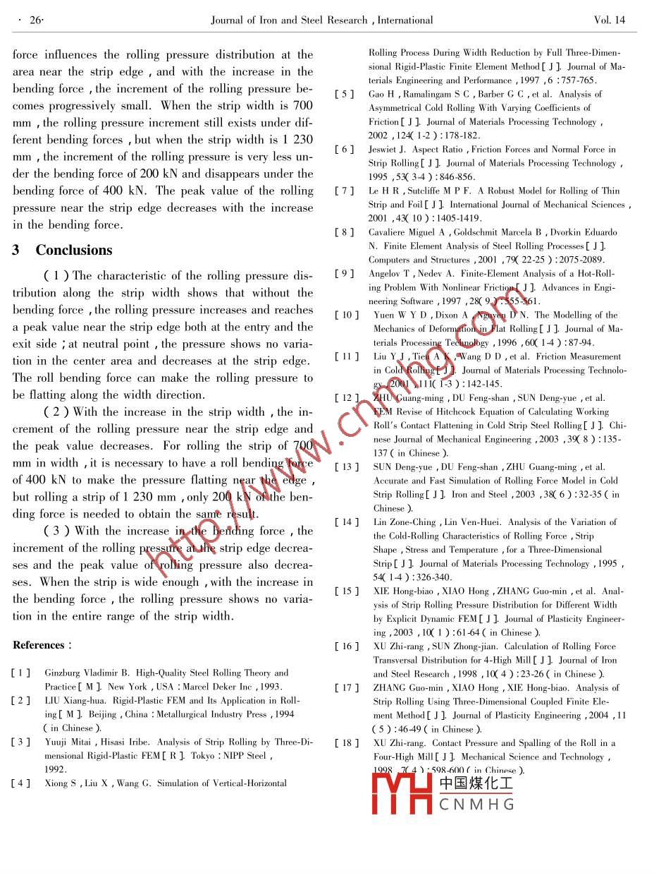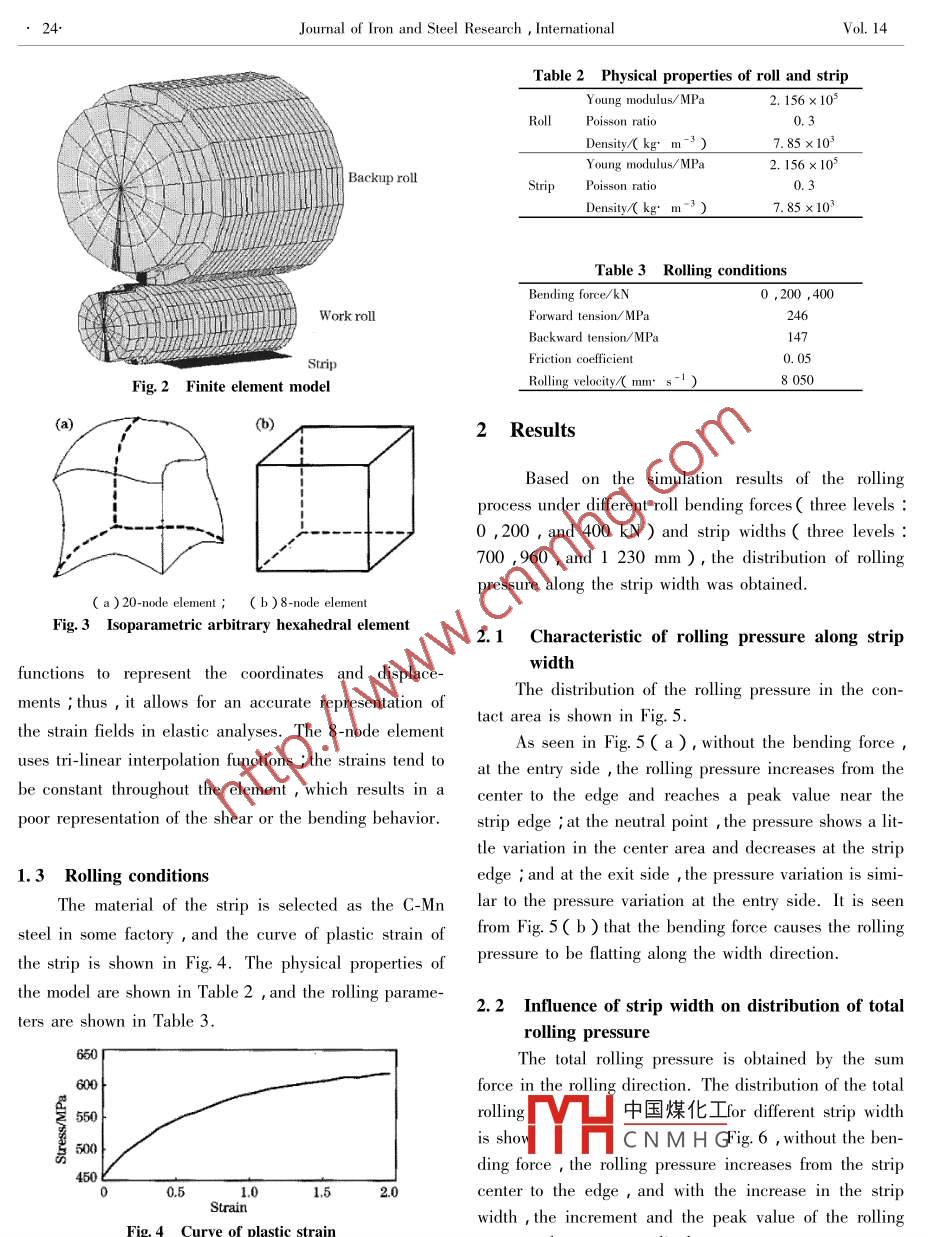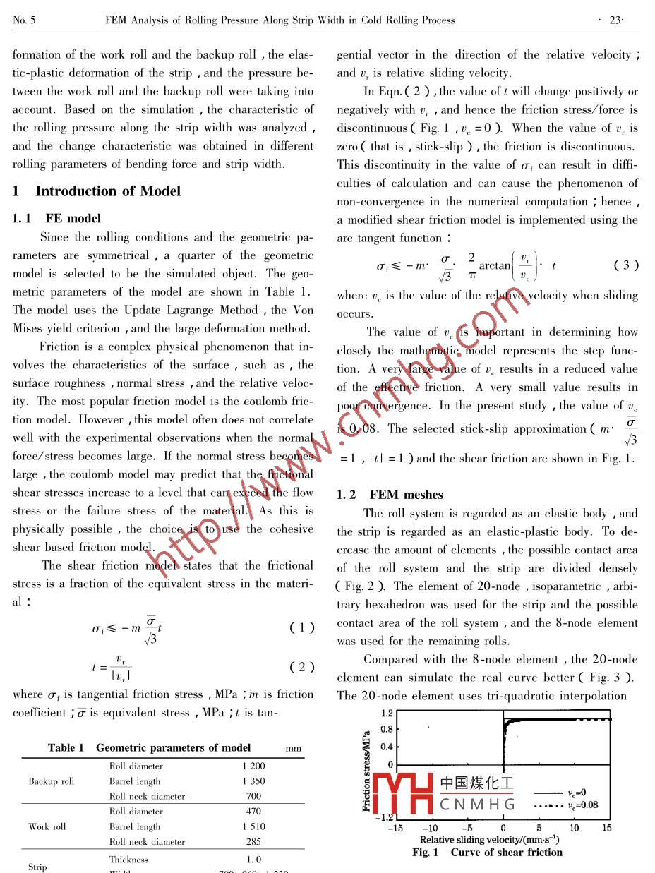 Available online at www.sciencedirect.comScienceDirectJOURNAL OF IRON AND STEEL RESEARCH , INTERNATIONAL 2007 ,14(5 ):22-26FEM Analysis of Rolling Pressure Along Strip Width inCold Rolling ProcessLIU Xiang-hua',SHI Xu2,LI Shan-qing2,XU Jian-yong',WANG Guo-dong'( 1. State Key Laboratory of Rolling and Automation , Northeastern University , Shenyang 110004 , Liaoning , China ;2. Research and Development Center , Baoshan Iron and Steel Co Ltd , Shanghai 201900 , China ;3. Baosteel Branch Co , Baoshan lron and Steel Co Ld , Shanghai 201900 , China )Abstract : Using 3-D elastic-plastic FEM ,the cold strip rlling process in a 4-high mill was simulated. The elastic deforma-tion of rolls , the plastic deformation of the strip , and the pressure between the work roll and the backup roll were taken intoaccount. The distribution of rolling pressure along the strip width was obtained. Based on the simulation results , the peakvalue of rolling pressure and the location of the peak were analyzed under different rolling conditions. The effects of the rollbending force and the strip width on the distribution of rlling pressure along the width direction were determined.Key words : thin strip ; cold rlling ; elastic-plastic FEM ; pressure distributionTo meet the user 's requirements of high quality anddeformation of the rolls cannot be neglected , and the 3-low cost for cold strip product ,it is very important to ob-D elastic-plastic FEM plays an important role in the coldtain high precision models for the calculation of the roll-strip rolling simulation.ing parameters. The rolling pressure and its distributionThere are two aspects on the research of rollinghave efcts on the thickness and shape of the strip ; thepressure : one is the prediction of the rolling force ; this .research on the rolling pressure is more important thanmainly deals with the setup calculation accurately andthe other parameters.rapidly, and the main research is the distribution ofThe main research methods of the deformation andthe rolling pressure along the rolling direction. Many a-the stress of the rolls are the influence function methodcademicians , specifically Miguel A , Angelov T,Yuen .and the FEM , which have been developed recently. The W Y D ,Liu Y J ,ZHU Guang-ming , and SUN Deng-influence function method has been widely used to solveyue , have done considerable work using the FEM to dis-the deformation and the stress of rolls , but it has a limita- cuss the distribution of rolling pressure along the rollingtion that using the model , the influence coefficients weredirection8-13. The other aspect is the research on thecalculated based on the equations for deflection of a sim-rolling pressure distribution along the strip width and theple beam1. 2-D FEM can be used to obtain the rollingentire contact areas ; Lin Zone-Ching , XIE Hong-biaopressure ,but it is not a method to simulate the rllingXU Zhi-rang , and ZHANG Guo-ming have done consid-pressure along the strip width direction. 3-D FEM pro-erable work“-1 on this aspect , and it is important tovides a possibility to obtain a better solution of the physi-control the strip shape , edge drop , wear , and spalling ofcal component for an investigated system. The 3-D rigidthe rol|[ 18]FEM has the characteristic of high efficiency in computa-中國煤化Iling proces in a four-tion , and has been widely applied in the hot rollinghigh stMYHC N M H G elastic-plastic FEM u-processIn cold strip rolling process , the elasticsing the Marc software. In the model , the elastic de-Foundation Item :Item Sponsored by Hi-Tech Research and Development Program of China ( 2003 AA33G010 ) ; National Basic ResearchProgram of China ( G2000067208-4 )Biography LIU Xiang-hud( 1953- ) , Male , Doctor , Professor; E-mail : sx-1jy@ 163. com; Revised Date : April 6 ,2006No. 5FEM Analysis of Rolling Pressure Along Strip Width in Cold Rolling Process23.formation of the work roll and the backup roll , the elas-gential vector in the direction of the relative velocity ;tic-plastic deformation of the strip , and the pressure be-and D, is relative sliding velocity.tween the work roll and the backup roll were taking intoIn Eqn.( 2 ) , the value of t will change positively oraccount. Based on the simulation , the characteristic ofnegatively with U, , and hence the friction stress/ force isthe rolling pressure along the strip width was analyzed ,discontinuous( Fig. 1 ,0。 =0 ). When the value of u, isand the change characteristic was obtained in differentzero( that is , stick-slip ) , the friction is discontinuous.rolling parameters of bending force and strip width.This discontinuity in the value of σ, can result in diffi-culties of calculation and can cause the phenomenon of1 Introduction of Modelnon-convergence in the numerical computation ; hence,1.1 FE modela modified shear friction model is implemented using theSince the rolling conditions and the geometric pa-arc tangent function :rameters are symmetrical ,a quarter of the geometricσ:≤-m°σ,2arctan(3 )model is selected to be the simulated object. The geo-metric parameters of the model are shown in Table 1.where v。is the value of the relative velocity when slidingThe model uses the Update Lagrange Method , the Vonoccurs.Mises yield criterion , and the large deformation method.The value of v。is important in determining howFriction is a complex physical phenomenon that in-closely the mathematic model represents the step func-volves the characteristics of the surface , such as , thetion. A very large value of D。 results in a reduced valuesurface roughness,normal stres,and the relative veloc- of the efective friction. A very small value results inity. The most popular friction model is the coulomb fric-poor convergence. In the present study , the value of Dtion model. However ,this model often does not correlateis 0.08. The selected stick-slip approximation( m'well with the experimental observations when the normal3force/ stress becomes large. If th