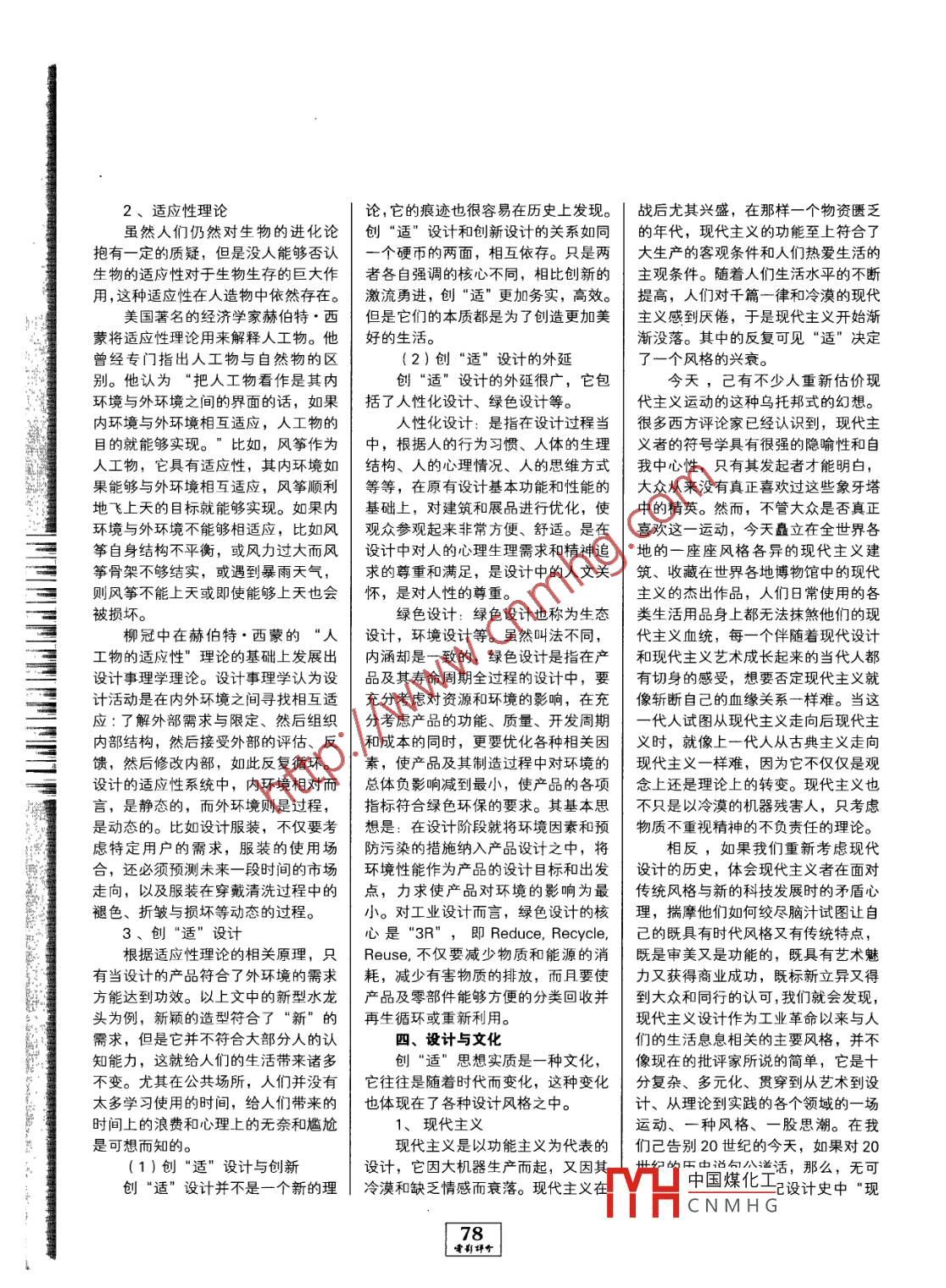 視覺殿堂ncvicw坪個上海交通大學(xué)|趙庭創(chuàng)“適”設(shè)計說[摘要]創(chuàng)新是當(dāng)下非常時髦的詞匯,觀點要創(chuàng)新,技術(shù)要創(chuàng)新,策略要創(chuàng)新,設(shè)計自然也應(yīng)當(dāng)跟上步伐,走創(chuàng)新道路??墒菑默F(xiàn)代主義的衰落到如今各種后現(xiàn)代風(fēng)格的興起,讓我們不斷思考一個問題,在創(chuàng)新的大旗引領(lǐng)下,設(shè)計是不是已經(jīng)迷失了自己的方向?探索設(shè)計應(yīng)當(dāng)回歸設(shè)計的本質(zhì),即是以人我本,創(chuàng)造合理的生活方式,即創(chuàng)“適”。創(chuàng)“適”順應(yīng)了一定的文化,同時也在創(chuàng)造著新的創(chuàng)“適”文化。[關(guān)鍵詞] 創(chuàng)新適應(yīng)性理論 創(chuàng)“適”設(shè)計doi:10.3969/j.ssn.1002- 6916.201 1.23.035一、創(chuàng)新概述強(qiáng)調(diào)個性化而導(dǎo)致的負(fù)面效應(yīng):“如|存方式, 全面提升人的生存質(zhì)量。""尊不可否認(rèn),創(chuàng)新為人類社會的進(jìn).果某一廠家己經(jīng)生產(chǎn)出完美的產(chǎn)品,重人、關(guān)心人、-切以人的生命存步和發(fā)展做出了巨大的貢獻(xiàn)。正因為其他廠家為了促銷,也不得不把原本|在 和生命活動為中心,就必然成為設(shè)創(chuàng)新,我們才有機(jī)會看到鳥巢體育館,完美的設(shè)計加以改變,結(jié)果生產(chǎn)出并計蒞臨和創(chuàng)作的最根本、最重要的原看到IPHONE,看到<2012>.-方面,不讓人滿意的產(chǎn)品。”有人曾辛辣地|則。"我們感嘆人類無窮的創(chuàng)造力;另一方諷刺道:“每-個設(shè)計師都被鼓勵去2、設(shè)計脫離了生活注定失敗面我們卻遇到這樣情況,太多新鮮事發(fā)現(xiàn)一個輪子,要能滾動,但卻不是在唐納德.諾曼的<設(shè)計心理學(xué)>物的誕生,使得我們開始對生活感到圓的。 ”這就是對所謂“ 創(chuàng)造性”-書中有這樣- -個例子: 有些新型水陌生的最大嘲諷。.龍頭的外觀確實很漂亮、光潔、典雅創(chuàng)新是設(shè)計的靈魂。的確,創(chuàng)新二、設(shè)計與生活并榮獲過設(shè)計大獎,但卻不易使用。的側(cè)重點是在于“新”,但并非“新”變了味的創(chuàng)新設(shè)計使設(shè)計與生活|這種設(shè)計存在兩個問題。 第一,為了的就是好的,特別是把“新”理解為過度分裂,使人們忘卻了生活與設(shè)計|美觀, 設(shè)計人員將控制開關(guān)隱藏在水單純的“求異”或“流行性”,都遠(yuǎn)的本然的聯(lián)系。設(shè)計不再是為了生活|龍頭的內(nèi)部結(jié)構(gòu)中, 用戶幾乎找不到離了設(shè)計的本質(zhì)。-個全新的設(shè)計,的需求,設(shè)計師們過熱地追捧表面上|在哪兒, 也不會知道如何操作。第二,全新的體驗方式固然是好的。但是如的 “創(chuàng)新"而未進(jìn)行深入的價值思考。|為 了產(chǎn)品的新穎性,設(shè)計人員沒有遵果只是為了“創(chuàng)新”而“創(chuàng)新”,那1、設(shè)計的本質(zhì)循操作使用的慣例,設(shè)計與生活割裂么只會流于形式主義的虛無之中。.現(xiàn)代主義之初一批關(guān)心社會的有|開來。1、視覺化設(shè)計志青年希望通過設(shè)計改善平民住房、三、創(chuàng)“適”設(shè)計有些設(shè)計師認(rèn)為現(xiàn)代主義的基本生活。他們對8常生活和普通人的關(guān)1、創(chuàng)“適”特點就是簡潔、純凈、取消裝飾、強(qiáng)注,改變了長久以來設(shè)計只為社會權(quán)"適”,通“適”,本義是“到調(diào)材料和工藝特性。于是,他們就以貴服務(wù)的局面,“ 使設(shè)計能夠第一次....去”,〈爾雅》解釋說“適,往也"。此作為自己的設(shè)計標(biāo)準(zhǔn),開始設(shè)計-為廣大的人民大眾服務(wù)”。正是這種| <莊子●逍遙游》 “適百里者,宿春糧;系列方方正正的、簡潔的"現(xiàn)代主義"思想,才使得現(xiàn)代主義運(yùn)動歷經(jīng)近一適千里者,三月聚糧"用的就是本義。產(chǎn)品。他們推崇美觀和藝術(shù)風(fēng)格,為|個世紀(jì), 長久不衰。而現(xiàn)代主義之后|此外。 "適" 另外還有個引申義為“符此而對自己所創(chuàng)造的具有現(xiàn)代感的作的許多設(shè)計運(yùn)動,脫離了B常生活,合”,如《詩●鄭風(fēng)。野有蔓草》“適品沾沾自喜。然而,一些具有“現(xiàn)代只是玩弄新穎的形式,追求某種特殊我愿兮” ,《玉臺新詠. 古詩為焦仲感”的產(chǎn)品有時除了給我們帶來視覺的視覺效果,逐漸脫離了原來的軌道,卿妻作》 “處分適兄意,那得自任?!?。上的沖擊之外,也給我們的生活帶來遠(yuǎn)離了日常生活本身,逐漸與商業(yè)結(jié)在創(chuàng)"適”中,由于“創(chuàng)”本身了許多的不便。合,變成了一種追求視覺化的“國際”|就包含 了“前所未有”的含義,因此2、個性化設(shè)計主義式樣,忘卻了設(shè)計對于提升人們|本文中創(chuàng) “適"表達(dá)了創(chuàng)造符合人類有些設(shè)計師崇尚后現(xiàn)代主義風(fēng)生存質(zhì)量的作用,甚至忘卻了設(shè)計產(chǎn)|生活需要, 符合可持續(xù)發(fā)展,符合生格,強(qiáng)調(diào)個性化,差異性。美國認(rèn)知品 基本功能。態(tài)環(huán)培需求的新的思相_策略和產(chǎn)品心理學(xué)家唐納德.諾曼這樣點評過分|“設(shè)計的本質(zhì)是創(chuàng)造更合理的生中國煤化工YHCNMHG77電影評分2、適應(yīng)性理論論,它