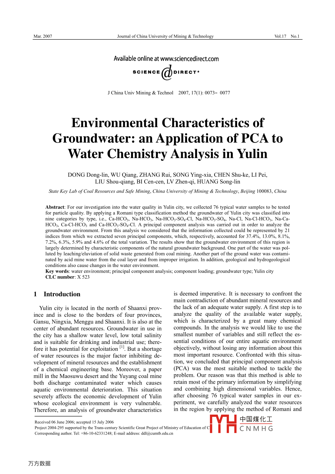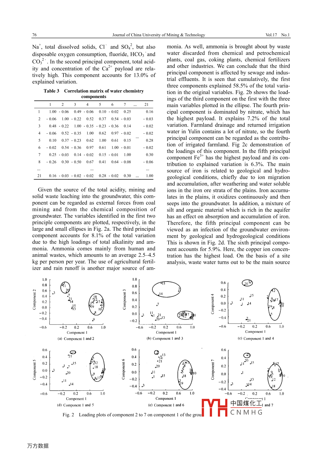 Mar. 2007Journal of China University of Mining & TechnologyVol.17 No.1Available online at www.sciencedirect.comSCIENCEJ China Univ Mining & Technol 2007, 17(1): 0073- 0077Environmental Characteristics ofGroundwater: an Application of PCA toWater Chemistry Analysis in YulinDONG Dong-lin, WU Qiang, ZHANG Rui, SONG Ying-xia, CHEN Shu-ke, LI Pei,LIU Shou-qiang, BI Cen-cen, LV Zhen-qi, HUANG Song-linState Key Lab of Coal Resources and Safe Mining, China University of Mining & Technology, Bejing 100083, China :Abstract: For our investigation into the water quality in Yulin city, we colleted 76 typical water samples to be testedfor particle quality. By applying a Romani type classification method the groundwater of Yulin city was classified intonine categories by type, i.e, Ca-HCO3, Na-HCO3, Na-HCO3-SO4-Cl, Na-HCO3-SO4, Na-Cl, Na-CIl-HCO3, Na-Ca-HCO3, Ca-Cl-HCO3 and Ca-HCO3-SO4-Cl. A principal component analysis was carried out in order to analyze thegroundwater environment. From this analysis we considered that the information collected could be represented by 21indices from which we extracted seven principal components, which, respectively, accounted for 37.4%, 13.0%, 8.1%,7.2%, 6.3%, 5.9% and 4.6% of the total variation. The results show that the groundwater environment of this region islargely determined by characteristic components of the natural groundwater background. One part of the water was pol-luted by leaching/eluviation of solid waste generated from coal mining. Another part of the ground water was contami-nated by acid mine water from the coal layer and from improper irigation. In addition, geological and hydrogeologicalconditions also cause changes in the water environment.Key words: water environment; principal component analysis; component loading; groundwater type; Yulin cityCLC number: X 5231 Introductionis deemed imperative. It is necessary to confront themain contradiction of abundant mineral resources andYulin city is located in the north of Shaanxi prov-the lack of an adequate water supply. A first step is toince and is close to the borders of four provinces,analyze the quality of the available water supply,Gansu, Ningxia, Menggu and Shaanxi. It is also at thewhich is characterized by a great many chemicalcenter of abundant resources. Groundwater in use incompounds. In the analysis we would like to use thethe city has a shallow water level, low total salinitysmallest number of variables and still reflect the es-and is suitable for drinking and industrial use; there-sential conditions of our entire aquatic environmentfore it has potential for exploitation”But a shortageobjectively, w ithout losing any information about thisof water resources is the major factor inhibiting de-most important resource. Confronted with this situa-velopment of mineral resources and the establishmenttion, we concluded that principal component analysisof a chemical engineering base. Moreover, a paper(PCA) was the most suitable method to tackle themill in the Maosuwu desert and the Yuyang coal mineproblem. Our reason was that this method is able toboth discharge contaminated water which causesretain most of the primary information by simplifyingaquatic environmental deterioration. This situationand combining high dimensional variables. Hence,severely affects the economic development of Yulinafter choosing 76 typical water samples in our ex-whose ecological environment is very vulnerable.periment, we carefully analyzed the water resourcesTherefore, an analysis of groundwater characteristicsin the region by applying the method of Romani andReceived 06 June 2006; accepted 15 July 2006中國煤化工Project 2004-295 supported by the Trans-century Scientific Great Project of Ministry of Education of C.MHCNMH GCorresponding author Tel: +86-10-62331248; E-mail address: dd@cumtb.edu.cn.74Journal of China University of Mining & TechnologyVol.17 No.1using PCA.major ions in groundwater; totally dissolved solids,such as anions, which amounts to more than 25%2 Sampling and Methodmilliequivalent, are combined with cation. Ground-water is classified into 49 kinds. On the other hand,2.1 Samplingthe Piper trilinear diagram method consists of twoIn our investigation, water samples were obtainedtriangles and a rhombus and, as well, every borderby using flint glasss conrepresents the milliequivalent of six major ions; to-containers with a capacity of be-tally dissolved solids are stween one and two liter, to collect water from 76 typi-in the rhombus. Their chemical characterization iscal places, such as in the vicinity of coal mines, rivers,based on a discrimination between the diferent re-residential areas, Hongjianzhuo and elsewhere. Awater analysis had never been carrI out in the Yulingions where water samples have been collected. Theirregion. For the different ions which would be identi-collctive characteristics use these sixnajor ions asfied there are various ways for retaining them. Forthe basis of the an; analysis while neglecting the chemi-example, when collected, nitrite and free carbon di- .cal behavior of other ions and relevant geochemicaloxide samples need to be send to the laboratory im-problems. They cannot represent the “special”mediately and measured th; same day if this cannotchemical behavior of groundwater because of theirbe done in the field. Samples of ammonium should belimitations.send to the laboratory at once and should be meas-To solve this problem, ameliorated Romani dia-ured within three days. Small samples (< 100 mg/L)grams have been proposed, given the limitations Ro-of fluorine ions, chloride ions, bicarbonate anions,mani experienced in his research with using trilinearhydroxide radicals, sulfateradicals, nitrate, sodiumdiagrams'. This method added comments on specificions, calcium ions, magnesium ions and silicic acidions in order to classify, groundwater correctly. In hiswere also immediately sent to the laboratory and thestudy of the chemical behavior and associated geo-analyse