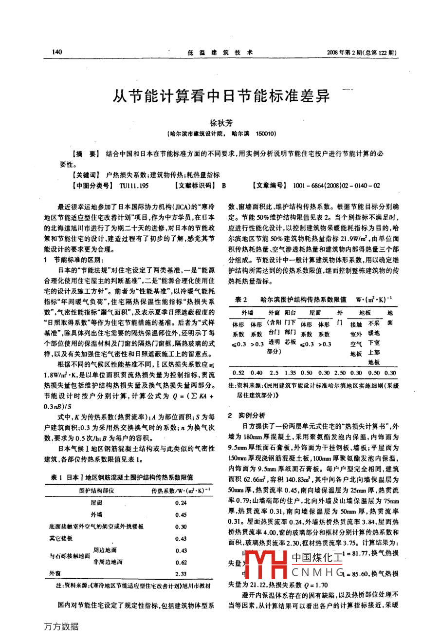建筑技術2008年第2期(總第從節(jié)能計算看中日節(jié)能標準差異徐秋芳哈爾濱市建筑設計院,哈爾濱150010)摘要】結合中國和日本在節(jié)能標準方面的不同要求,用實例分析說明節(jié)能住宅按戶進行節(jié)能計算的必要性?!娟P鍵詞】戶熱損失系數(shù);建筑物傳熱;耗熱量指標【中圖分類號】TU.195【文獻標識碼】B【文章編號】1001-6864(2008)02-040-02最近很幸運地參加了日本國際協(xié)力機構(ICA)的“寒冷數(shù)、窗墻面積比、維護結構傳熱系數(shù)。根據(jù)節(jié)能目標分別確地區(qū)節(jié)能適應型住宅改善計劃項目,作為中方學員,在日本定。節(jié)能50%維護結構限值見表2。當個別指標不滿足時的北海道旭川市進行了為期二十天的進修,對日本的節(jié)能政應進行性能化設計,以控制建筑物采暖能耗指標為目的哈策和節(jié)能住宅的設計建造過程有了初步的了解感覺其節(jié)爾濱地區(qū)節(jié)能50%建筑物耗熱量指標219Wm2,由單位面能設計的要求更為合理積傳熱耗熱量、空氣滲透耗熱量和建筑物內(nèi)部得熱量三個部1節(jié)能標準的區(qū)別:分組成。節(jié)能設計中一般計算建筑物體形系數(shù),用以確定維日本的“節(jié)能法規(guī)”對住宅設定了兩類基準,一是“能源護結構所需達到的傳熱系數(shù)限值繼而控制整棟建筑物的傳合理化使用住宅屋主的判斷基準”,二是“能源合理化使用住熱耗熱量指標宅的設計及施工方針"。前者為性能基準”以冷暖氣能耗指標“年間暖氣負荷”,住宅隔熱保溫性能指標“熱損失系表2哈爾濱圍護結構傳熱系數(shù)限值W(m2k數(shù)”,氣密性能指標“漏氣面積”,及表示夏季日照遮蔽程度的外墻外窗陽臺屋面外地板地“日照取得系數(shù)”等作為住宅節(jié)能措施的基準。后者為“式樣體形體形(含陽門下體形體形門接觸不采面基準”,除具體列出住宅需要的隔熱保溫部位外還明示了每系數(shù)系數(shù)臺門部門系數(shù)系數(shù)室外哽地個部位使用的保溫材料及門窗的隔熱門窗框隔熱玻璃的式≤0.3>03透明芯板≤0.3>0.3空氣下室樣,以及有關加強住宅氣密性和日照遮蔽施工上的留意點。部分)地板上部根據(jù)不同的氣候區(qū)性能基準不同,I區(qū)熱損失系數(shù)應≤板18W/m2·K,是以單位面積貫流熱損失量為控制指標,貫流0520.402.1.350.50.32.00.300.00.0熱損失量包括維護結構熱損失量及換氣熱損失量兩部分。注:資料來源:《民用建筑節(jié)能設計標準哈爾濱地區(qū)實施細則(采暖節(jié)能設計時按戶分別計算,計算公式為Q=(∑MA+居住建筑部分》0.3nB)/S式中,K為傳熱系數(shù)(熱貫流率);A為部位面積;S為每2實例分析戶建筑面積03為采用熱交換換氣時的系數(shù);n為換氣次方提供了一份兩層單元式住宅的“熱損失計算書”,外數(shù),要求為05次/h;B為每戶的容積。墻為180mm厚混凝土,采用聚氨酯發(fā)泡內(nèi)保溫,內(nèi)飾面為日本氣候I地區(qū)鋼筋混凝土結構或與此類似的氣密性9.5m厚紙面石膏板外飾面為干掛鋼板、墻板;平屋面為建筑,各部位傳熱系數(shù)限值見表1150mm厚現(xiàn)澆鋼筋混凝土板,100m厚聚氨酯發(fā)泡內(nèi)保溫內(nèi)飾面為95mm厚紙面石膏板。每戶戶型完全相同,建筑表1日本1地區(qū)鋼筋混凝土圍護結構傳熱系數(shù)限值面積62.66m2,容積140.83m3,其中間各戶北向墻保溫層為困護結構部位傳熱系數(shù)/w·(m2K)50m厚,熱貫流率045,南向墻保溫層為25mm厚,熱貫流屋面率0.79;山墻端部的住戶,北向外墻及山墻保溫層為75mm厚熱貫流率0.31,南向墻保溫層為50mm厚,熱貫流率底面接觸室外空氣的架空或外挑樓板0.300.31。屋面熱貫流率024,外墻熱橋熱貫流率384屋面熱橋熱貫流率400,窗的玻璃部分和框材分別計算傳熱系數(shù)和其它樓板面積玻璃熱貫流率230,框材熱貫流率375。計算結果為周邊地面與石礫接觸地面非周邊地面失量VL中國煤化工=87氣熱預CNMHG=8560,換氣熱損注:資料來源(寒冷地區(qū)節(jié)能適應型住宅改善計劃》旭川市教材失量為21.12熱損失系數(shù)Q=1.70避開內(nèi)保溫體系存在的固有缺陷,以及熱橋部位處理不國內(nèi)對節(jié)能住宅設定了規(guī)定性指標包括建筑物體型系當?shù)纫蛩?從計算結果可以看出各戶的計算指標接近采暖徐秋芳:從節(jié)能計算看中日節(jié)能標準差異141負荷均勻,不同厚度的保溫材料均發(fā)揮了最大的作用孔磚,采用80mm厚聚苯板外保溫,外飾面為薄抹灰涂料內(nèi)再用國內(nèi)的住宅實例作比較計算,一棟六層四單元純住飾面為混合砂漿,平屋面為120m厚鋼筋混凝土板,100m宅,每單元兩戶的兩室明廳戶型,山墻戶型設東向或西向明厚擠塑聚苯板外保溫。維護結構傳熱系數(shù)見表3、4廳居室在山墻也開窗層高28m。外墻為240mm厚承重多外墻構造:外80聚苯乙烯泡沫板+240粘土磚材料名稱編厚度導熱系數(shù)λ蓄熱系數(shù)S修止系數(shù)修正后熱阻R(由外到內(nèi))/m/w.(m.K)-1/w.(m2.k)-1聚合物增強砂漿L0.870聚苯乙烯泡沫塑料0.041.600水泥砂漿0.990l1,3700.027240mm粘土多孔磚0.5800.414石灰砂漿各層之和傳熱系數(shù)K=1/(0.11+二R+0.04)屋面構造:100擠塑聚苯乙烯泡沫板+120現(xiàn)澆鋼筋混凝土板材料名稱編厚度導熱系數(shù)λ蓄熱系數(shù)S修正系數(shù)修正后熱阻R(山外到內(nèi))/W(mK)-1/w(m2K)-1/(m2→k)w-l防水卷材L0.1703.332水泥砂漿L0.930113731.00擠塑聚苯乙烯泡沫塑料3.030隔氣層水泥砂漿爐渣混凝土1