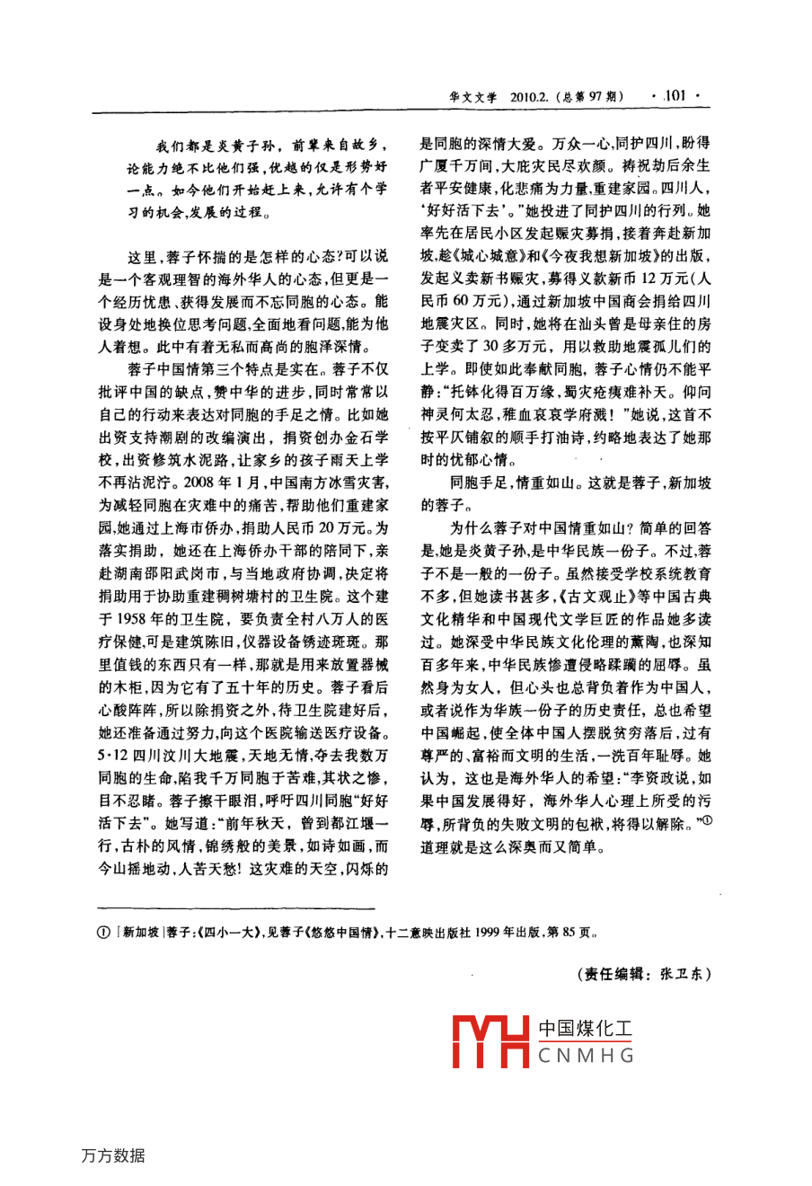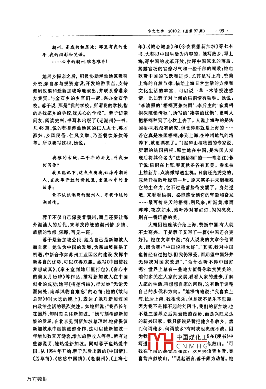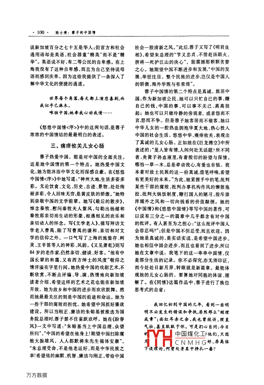 華文文學(xué)2010.2.(總第9期)·97蓉子的中國情陸士清(復(fù)旦大學(xué)中文系,上海200433)摘要:新加坡女作家尊子執(zhí)著于改名換姓是她中國情結(jié)的明顯表現(xiàn)。蓉子的中國情涵益著親情、族情和中華情的豐富內(nèi)容。痛癢攸關(guān)兒女心腸是蓉子中國情的特點(diǎn)。對中國全面關(guān)注這是其一。態(tài)度真誠這是其二。實(shí)在的手足之情這是其三。不忘中華幾女的歷史貴任是蓉子中華情的根。關(guān)鍵詞:蓉子;親情;族情;中華情中圖分類號:I06文獻(xiàn)標(biāo)識碼:A文章編號:1006-0677(2010)20097-05、姓名凝結(jié)的中國情王蓉芷(詩人羅門的夫人)的筆名也是“蓉子但她堅(jiān)持不改。她說“一來‘蓉’是我的本名蓉子的中國情,也許該從她的筆名和姓名來我深信我的作品有我自己的風(fēng)格,讀者是不說起。可能分不清的?!庇腥司驮谖恼轮邪凳救刈酉肴刈邮切录悠碌娜A文女作家,生于廣東省沾臺灣女詩人的光。蓉子在《由蓉子的筆名談潮安縣金石龍閣鄉(xiāng)陳厝隴,(今金石鎮(zhèn)龍下起》一文中氣憤地回?fù)?“一個有傲骨的人,是村),是陳氏家族的女兒,當(dāng)然姓陳。因?yàn)榧彝ゲ粫驗(yàn)閯e人有價(jià)值而擠上去沾點(diǎn)光彩的?!敝啬休p女,5歲時由祖母作主過繼給姨媽當(dāng)養(yǎng)臺灣詩人蓉子到訪新加坡,接待機(jī)構(gòu)邀請她以女8歲時跟隨姨媽過番,移居馬來西亞柔佛州李賽蓉為名參與接待時她拒絕了這個要求,堅(jiān)的一個偏僻的小鎮(zhèn)笨珍。姨夫姓李她也改姓為持以蓉子身份與同名詩人見面。蓉子衛(wèi)護(hù)自己李取名為李賽蓉。1970年她開始投稿最初用的筆名,因?yàn)樗咽切录悠挛乃嚱绲囊粏T,她的是江采蓉秋芙等筆名后來改用“蓉子”為筆的這個筆名不僅得到了讀者的廣泛認(rèn)同,而且名。她在《初見彩虹》初版自序中有過這樣的也有了一定的國際影響。她在新加坡所出版的交待:“直到(19)75年我投稿給文藝界前輩姚書都用“蓉子”這個名字。報(bào)章雜志、電臺、電紫先生,用了我的原名:蓉,姚紫先生認(rèn)為單字視臺,用她的作品時是這個名字訪問她時也是的筆名不好,便替我加上一個‘子字,我是在這個名字。馬來西亞兩家華文報(bào)紙時常轉(zhuǎn)載她文章發(fā)表后才知道的。這以后我就一直用著。的作品;臺灣出版的《新加坡華文文學(xué)選集》,我是喜歡這個筆名的,雖然有人勸我改用其他也選她和散立:中國出版《文藝百科全的但我想這是沒有必要的?!北M管臺灣女詩人書》,中國煤化工的小說。這CNMHG作者簡介:陸士清,男,復(fù)旦大學(xué)中文系教授陸士清:蓉子的中國情些就是證明。所以她這個筆名理應(yīng)受到尊重。為明確的表現(xiàn)嗎?正如她在《初見·彩虹》的第三版后記中所說的:“同名本是很平常的事,貴賓降臨,我們必、親情、族情、中華情須表示尊重,但我們又怎能不自重呢?筆名雖當(dāng)然,蓉子的中國情結(jié)不只是確認(rèn)一個正是我個人的事而蓉子卻是新加坡文藝界的一宗的中國名那么簡單,它涵蓋著親情、族情和份子。這種不尊重本地寫作人的作風(fēng),又怎不中華情的豐富的內(nèi)容。叫人心寒呢?”蓉子雖然過繼給了姨媽,但她對自己生身蓉子喜歡這個筆名尊重甚至捍衛(wèi)這個筆父母有著深厚的感情。三歲時母親帶她到田間名,這也許跟她的中國情結(jié)沒有太大的關(guān)系;勞動將她放在田頭木桶中。為免她受涼母親但是她把自己的姓名改成姓“蓉”名“子”那可將自己的外衣披在她身上。這件衣服傳遞的慈就是中國情結(jié)的表現(xiàn)了。在《說名道姓》一文中母的溫暖,讓她記一輩子。一次母親買了炒棵她說:“武俠小說里有說:坐不改名行不改姓。回來背著眾人悄悄給了她一塊。這一塊炒棵我喜歡這種豪情卻自幼身不由己姓了幾年的慈愛的滋味也讓蓉子體味到如今。母親,總是陳,忽然被改為姓李?!薄氨蛔穯柧売蓪擂斡中乃?duì)繅衾@。在《老潮州<序>》文中,她寫道酸!”她又說:“中國人素來重男輕女潮汕尤甚,“別了潮州地思念更殷切。26載長回憶潮州女兒只能從姓,名字不排序,僅從兄弟的名字更雅麗!母親的慈愛,我沒有忘記;祖母的叮中知道自己屬于哪個輩分。名無序姓任改,干嚀,長留心底。睡里夢里?;厝??!鄙贂r她讀古脆自己選個愜意的,幾年前重新登記身份證,文《鄭伯克段于鄢》篇,被鄭莊公挖地道會母和華人都有中文名,于是欣然填上:姓蓉名子?!憋@潁考叔孝行感動得暗暗流淚。原來姨媽待她不然,蓉子“愜意的”改名換姓,是對中國的重男好她很反感有一段時間不理姨媽,鄭莊公地輕女封建意識的反抗,是潛在的中國情結(jié)的浮道會母的故事使她后悔。她覺得作為甥女,還現(xiàn)。更為重要的是,她認(rèn)為自己所改的這個姓應(yīng)當(dāng)尊重和孝敬姨媽。蓉子喜歡潮劇,常聽潮名,是堂堂正正的中國名字。在《說名道姓》一劇故事。潮劇《白兔記》寫的是離開生母十年之文中她又寫道:久的劉知遠(yuǎn),因打獵追兔來到家鄉(xiāng)的井邊,遇到了孤苦的母親,抱頭相會喜不自禁。這個故有些人乍聽蓉子,就說是日本名。芙事深深打動了蓉子的心。她發(fā)誓,此生一定要蓉的蓉,老子、孟子、君子的子,完全正宗報(bào)答慈母養(yǎng)育之恩。蓉子是在中國傳統(tǒng)倫理思的中國名!想哺育下成長起來的,她覺得孝敬父母是是做