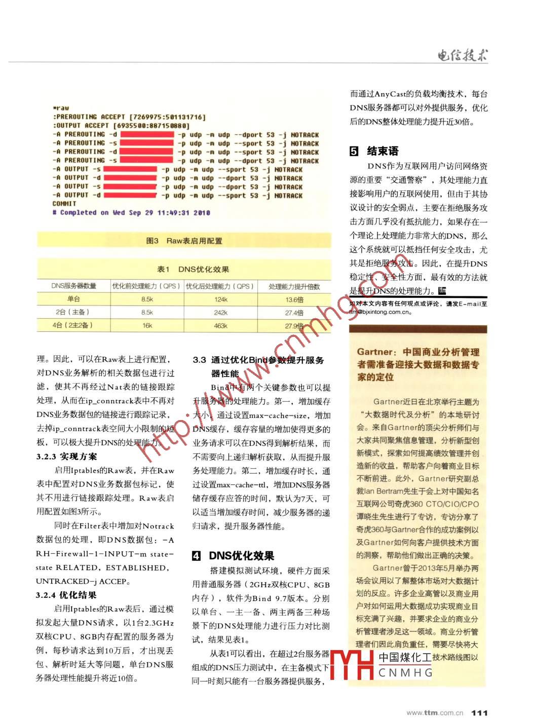 電信技術(shù)DP tech杭州迪普科技有限公司協(xié)辦DNS性能優(yōu)化實踐張承宋志軍中國移動通信集團山西有限公司通過對運營商網(wǎng)絡(luò)DNS的邏輯架構(gòu)、系統(tǒng)參數(shù)進行優(yōu)化,在不增加硬件配置的條件下,大幅提升DNS的處摘要理性能,節(jié)省硬件投資,達到節(jié)能減排、經(jīng)濟高效的目的。關(guān)津詞DNS AnyCast lptables0引言次的攻擊,造成1臺基于Bind的普通DNS服務DNS ( Domain Name System )是因特網(wǎng)器達到性能瓶頸,出現(xiàn)丟包、響應時延大等問的一項核心服務,它可以將域名和IP地址相互題,同時DNS服務器內(nèi)存使用率達到95%。映射,從而使人們通過域名更方便地訪問互聯(lián)因此,需要對DNS進行性能優(yōu)化,提升網(wǎng),而不用記住32位IP地址。DNS處理能力,增加對網(wǎng)絡(luò)攻擊的防御能力。DNS在Internet. 上具有重要的作用,2014年1月21日,全國DNS由于受到拒絕服務攻擊,全3 DNS性能優(yōu)化國大半網(wǎng)站不同程度地出現(xiàn)訪問故障。下文旨3.1通過AnyCast技術(shù)實現(xiàn)最 大化處理能在通過提升DNS的性能,可以在一-定程度 上緩力提升解針對DNS的拒絕服務攻擊。運營商DNS緩存服務器根據(jù)網(wǎng)絡(luò)規(guī)模至少需要兩臺或更多,- -般為- -主一備。當主服務2 DNS現(xiàn)狀器發(fā)生故障脫網(wǎng)后,可由備服務器繼續(xù)提供服運營商網(wǎng)絡(luò)DNS- -般由授權(quán)域名服務器、務,不影響用戶感知,但是如果主服務器由于遞歸域名服務器和緩存域名服務器組成,其中業(yè)務請求量太大或者受到大規(guī)模拒絕服務攻擊只有緩存服務器直接面向用戶提供域名解析服時,此時服務器達到服務瓶頸,但用戶請求不;務,遞歸請求會轉(zhuǎn)至遞歸服務器處理。由于會被調(diào)度至備服務器,導致解析時延大,無法DNS開放服務單一-般沒有必要部署專用硬解析等故障,影響用戶業(yè)務感知。件防火墻,通過Linux操作系統(tǒng)的軟件防火墻通過AnyCast技術(shù),將用戶請求負載分擔Iptables即可滿足安全防護要求。DNS數(shù)據(jù)包為至多臺緩存服務器,這樣可以實現(xiàn)對DNS緩存無連接的小UDP數(shù)據(jù)包,對帶寬要求極低,因服務器處理性能的最大化,不會由于單臺服務此即使2MHz帶寬的用戶發(fā)起DNS拒絕服務攻器的中國煤化工改造前,服務擊,理論上可達到每秒3906.25次請求。通過控CH.CNMHG制3個用戶同時發(fā)動攻擊,即可達到每秒約1萬器的取八工C,二工域田服務器達到瓶www.ttm.com.cn 1 09