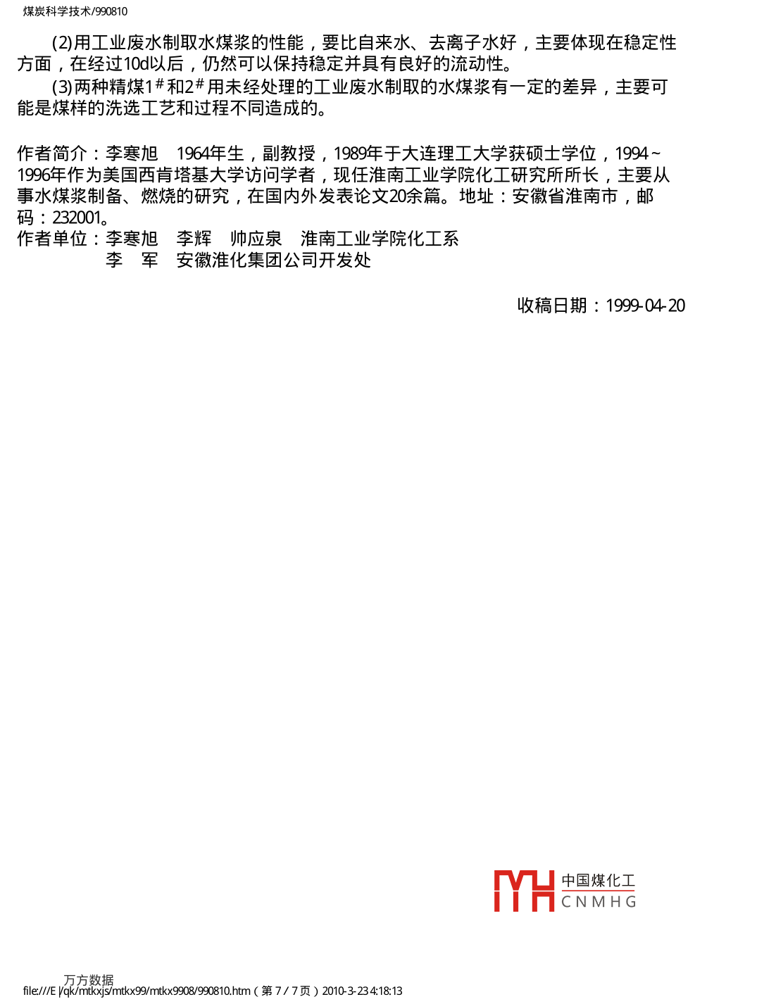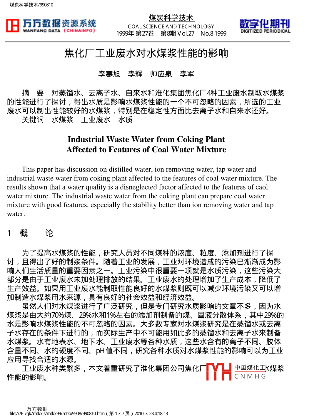 焦化廠工業(yè)廢水對水煤漿性能的影響