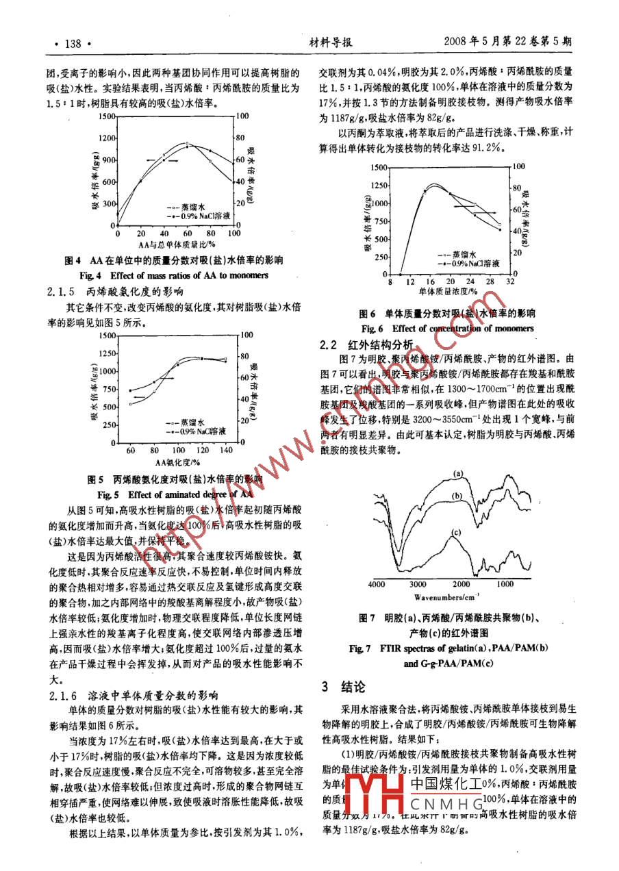 136·材料導(dǎo)報(bào)2008年5月第22卷第5期明膠接枝共聚丙烯酸銨-丙烯酰胺董奮強(qiáng)1,崔英德2,胡軍楚],李妮妮,何春林廣東工業(yè)大學(xué)輕工化工學(xué)院,廣州510006;2仲愷農(nóng)業(yè)技術(shù)學(xué)院化學(xué)與化工系,廣州510225)摘要研究了溶液聚合法制備明膠-聚〔丙烯酸銨丙烯酰胺)( G-g-PAA/PAM)可降解高水性樹(shù)脂的方法。對(duì)明膠/單體及丙烯酸銨/丙烯酰胺質(zhì)量比、丙烯酸中和度、單體濃度及N,N-亞甲基雙丙烯酰胺和過(guò)硫酸鉀相對(duì)含量影響產(chǎn)品吸(鹽)水性能的情況進(jìn)行測(cè)試,從中優(yōu)選出較合適的反應(yīng)條件,并用紅外光譜對(duì)產(chǎn)物進(jìn)行表征。該高吸水性樹(shù)脂的吸水倍率達(dá)1187g/g,吸鹽水倍率達(dá)82g/g。FTIR分析表明,反應(yīng)產(chǎn)物為明膠與丙烯銨、丙烯酰胺的接枝共聚物關(guān)鍵詞明膠丙烯酸銨丙烯酰胺接枝高吸水性樹(shù)脂可生物降解Preparation of Biodegradable Gelatin-g-Poly(AmmoniumAcrylate-co-AcrylamideDONG Fenqiang, CUI Yingde, HU Junchu, LI Nini, HE Chunlin(1 Faculty of Light Industry and Chemical Engineering, Guangdong University of Technology, Guangzhou 510006;2 Department of Chemistry and Chemincal Engneering, Zhongkai University of Agriculture and Technology, Guangzhou 510225)Abstract Poly( ammonium acrylate-co-acrylamide) grafted gelatin with high water absorbency and biodegradability is synthesized. The suitable condition of synthesis is chosed by estimating the effects of the mass ratio of gelatinto monomers and ammonium acrylate to acrlyamide degree of neutralization of acrylic acid, the concentration of mono-mers in solution and relative mass of N, N-methylene bis acrylamide or potassium persulphate to monomers on the wa-ter absorbency of products. The experimental results show that the product would be provided with the most water alsorbency of 1187g/g and 0. 9%NaCl solution of 82g/g. FtiR spectrum of the product indicates that it is gelatin-g-poly(ammonium acrylate-coracrylamide)Key word gelatin, ammonium acrylate, acrylamide, graft, superabsorbent resin, biodegradable高吸水性樹(shù)脂作為一種功能性高分子材料已廣泛應(yīng)用于醫(yī)餾)明膠(化學(xué)純青島明膠廠,105℃烘箱中干燥至恒重),25%疔衛(wèi)生農(nóng)林建筑環(huán)境等領(lǐng)域中。其中丙烯酸系高吸水性樹(shù)脂因氨水(分析純,廣東光華化學(xué)廠有限公司),過(guò)硫酸鉀(分析純,廣其吸水倍率高且成本低而受到廣泛的關(guān)注但其生物降解性差目州化學(xué)試劑廠),丙酮(分析純,天津市紅巖化學(xué)試劑廠),氯化鈉前研究較多的為丙烯酸接枝共聚物如淀粉纖維素殼聚糖海藻(分析純成都市聯(lián)合化工試劑研究所),鄰苯二甲酸氫鉀(分析酸等接枝丙烯酸制備高吸水性樹(shù)脂1-。聚谷氨酸雖然具有非常純,成都化學(xué)試劑廠),N,N-亞甲基雙丙烯酰胺(分析純天津高的吸水性能和可完全生物降解性但成本太高市新純化學(xué)試劑研究所)。明膠是一種具有蛋白質(zhì)結(jié)構(gòu)的兩性高分子聚電解質(zhì)具有1.2實(shí)驗(yàn)儀器優(yōu)良的生物降解性能在感光材料、醫(yī)藥、食品、紡織涂料、建C86型電熱恒溫水浴鍋(廣州越秀醫(yī)療器械廠),FA2104材染料電子工業(yè)化妝品等領(lǐng)域得到廣泛應(yīng)用,其接枝共聚型電子天平(上海良平儀器儀表有限公司),JB50D型增力電動(dòng)研究也很多1,但以明膠接枝共聚丙烯酸銨丙烯酰胺制備攪拌器(江蘇榮華),101-2型電熱鼓風(fēng)干燥箱(上海盧南科學(xué)化高吸水性樹(shù)脂的研究還未見(jiàn)報(bào)道。工聯(lián)營(yíng)廠), Nicolet380FTR紅外光譜儀( Thermo Electron公本研究擬通過(guò)制備這種高吸水性樹(shù)脂,在賦予產(chǎn)品可生物司),SHzⅢ型真空泵(廣東真空設(shè)備廠)。降解性能的同時(shí),引入具有肥效性的氮元素使之在農(nóng)林業(yè)保1.3明膠接枝產(chǎn)物的制備水應(yīng)用方面也有較好的前景。在50mL燒杯中加入一定量的明膠及少量水,加熱使明膠實(shí)驗(yàn)溶解冷卻至室溫。按照實(shí)驗(yàn)條件加人適量丙烯酸,在冰水浴中邊攪拌邊緩慢加入一定量氨水溶液丙烯酰胺、交聯(lián)劑和水最1.1實(shí)驗(yàn)試劑后加入引發(fā)劑,然后放進(jìn)烘箱控制反應(yīng)溫度為60℃,持續(xù)4h,丙烯酰胺(AM分析純,海凌峰化學(xué)試劑有限公司),丙烯再于1中國(guó)煤化工色粉狀粗產(chǎn)品酸(AA,化學(xué)純天津市科密歐化學(xué)試劑開(kāi)發(fā)中心,經(jīng)減壓蒸二分離24h,洗去反應(yīng)產(chǎn)CNMHG國(guó)家自然科學(xué)基金(20376087);廣東省自然科學(xué)基金(033307)董奮強(qiáng):男,1963年生,副高,碩士,主要從事高分子材料研究Tel:020-3932239E-mail:dfg@gdut.edu.cn明膠接枝共聚丙烯酸銨丙烯酰胺/重奮強(qiáng)等·137·物中殘留的試劑、寡聚體等,40℃真空干燥至恒重得到純化的當(dāng)交聯(lián)劑用量為單體用量的0.005%~0.05%時(shí),產(chǎn)品的接枝共聚物。吸水能力很大,繼續(xù)增大時(shí),吸水倍率快速降低。但吸鹽水率在單體接枝共聚到明膠上的轉(zhuǎn)化率按式(1)計(jì)算整個(gè)實(shí)驗(yàn)范圍內(nèi)隨交聯(lián)劑增加而降低。這是因?yàn)殡S交聯(lián)劑用單體轉(zhuǎn)化率=純化產(chǎn)品質(zhì)量。原明膠質(zhì)量×109%量的增加案合物通過(guò)交聯(lián)形成的網(wǎng)絡(luò)結(jié)構(gòu)趨于完善可溶性鏈段逐漸減少,但彈性收縮壓卻逐漸增加,導(dǎo)致交聯(lián)劑在0.04%時(shí)樹(