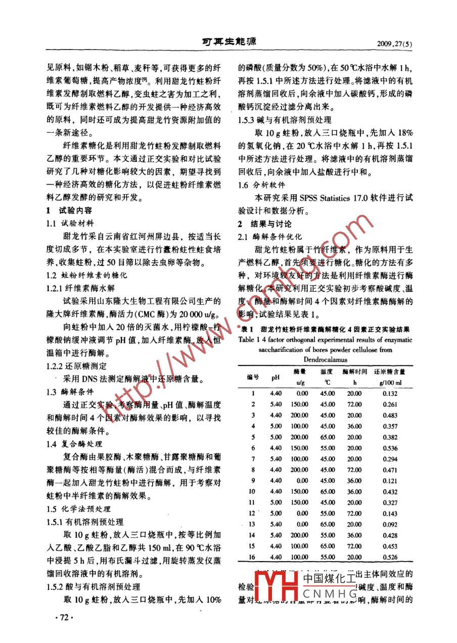 第27卷第5期可耳生能獠Vol 27 No 52009年10月Renewable Energy Resources0ct.200甜龍竹蛀粉纖維素燃料乙醇發(fā)酵的糖化研究孫世中,李俊俊,孫愛華,高天榮,謝建(云南師范大學教育部可再生能源材料先進技術與制備重點實驗室,云南昆明650092)摘要:纖維素糖化是甜龍竹蛀粉燃料乙醇發(fā)酵研究中的重要內(nèi)容。正交試驗和對比試驗結(jié)果表明,在pH值為44、溫度為55℃,酶用量為200u/g,酶解時間小于20h條件下,進行纖維素酶解較合適但酶解率較低。通過酸或堿并結(jié)合有機溶劑進行預處理能顯著提高蛀粉纖維素糖化率。同時添加半纖維素復合酶進行酶解,能使蛀粉中大部分半纖維素水解,并能促進纖維素的酶解。關鍵詞:甜龍竹;蛀粉;纖維素糖化;纖維素預處理;半纖維素中圖分類號:TK6;S216,2文獻標志碼:A文章編號:1671-5292(2009)040071-04Prelimilary study on saccharification of bores powdercellulose from dendrocalamus for fuel ethanol fermentationSUN Shi-zhong, LI Jun-jun, SUN Ai-hua, GAO Tian-rong, XIE Jian(The Renewable Energy Technology and Advanced Materials Preparation Laboratory of Education Ministry, YunnanNormal University, Kunming 650092, China)Abstract: It is the significant step for saccharification of bores powder cellulose from dendrocalamus to be used In the preparation of fuel ethanol. The results of orthogonal test and comparing testshow that the condition of pH4, 4, 55 C, 200 u/g of enzyme quantity in 20 hours is more suitable forbores powder cellulose hydrolysis with low rate still. The combination of acid or alkali and organicsolvents for pretreatment can significantly improve the rate of saccharification of bores powder cek-lulose. Adding simultaniously compound enzyme for hemicellulose hydrolysis is enabling the majority of bores powder hemicellulose hydrolysis, and can promote the hydrolysis of celluloseKey words: dendrocalamus: bores powder; cellulose saccharification; cellulose pretreatmentmIce0引言本文以甜龍竹蛀粉作為原料發(fā)酵制取燃料乙木質(zhì)纖維類原料是地球上數(shù)量最多的一種可醇。與其它原料相比,以蛀粉纖維素發(fā)酵制取燃料再生資源。發(fā)展經(jīng)濟高效、清潔環(huán)保的木質(zhì)纖維生乙醇具有許多明顯的優(yōu)勢:①甜龍竹包括版納甜物轉(zhuǎn)化乙醇技術,已成為世界生物能源科技發(fā)展龍竹、馬來甜龍竹、勃氏甜龍竹等,含糖量較高,廣的戰(zhàn)略制高點。針對我國國情,發(fā)展以木質(zhì)纖維泛分布于東南亞南亞及中國南方廣大地區(qū),資源類原料生物轉(zhuǎn)化燃料乙醇為重點的生物能源技豐富樹;②竹蠹蛀食甜龍竹竹材效率高,可通過術,可以避免以糧食為原料帶來的“與農(nóng)爭地”和人工控制方式進一步提高粉蛀效率門;③蛀粉顆“與人爭食”的弊端,兼得經(jīng)濟、生態(tài)、社會多重效粒細膩均勻,不需要機械研磨,具有顯著的成本優(yōu)益,是全面可持續(xù)發(fā)展的必然要求。勢和易酶解性/④蛀粉纖維素含量超過其它常收稿日期:2009-03-27?;痦椖?國家自然科學基金項目(20762015);云南省自然科學基金項目(中國煤化工作者簡介:孫世中(1968-),男云南會澤人講師主要從事生物質(zhì)能技術的4CNMHGymnueducr通訊作者:謝建(1957-),男,云南昆明人教授,主要從事生物質(zhì)能技術的研元AerAte∠6com可耳生能鴉2009,27(5)見原料,如鋸木粉、稻草、麥稈等,可獲得更多的纖的磷酸(質(zhì)量分數(shù)為50%),在50℃水浴中水解1h維索葡萄糖提高產(chǎn)物濃度網(wǎng)。利用甜龍竹蛀粉纖再按151中所述方法進行處理。將濾液中的有機維素發(fā)酵制取燃料乙醇,變蟲蛀之害為加工之利,溶劑蒸餾回收后,向余液中加入碳酸鈣,形成的磷既可為纖維素燃料乙醇的開發(fā)提供一種經(jīng)濟高效酸鈣沉淀經(jīng)過濾分離出來。的原料,同時還可成為提高甜龍竹資源附加值的1.53堿與有機溶劑預處理條新途徑。取10g蛀粉,放入三口燒瓶中,先加入18%纖維素糖化是利用甜龍竹蛀粉發(fā)酵制取燃料的氫氧化鈉,在20℃水浴中水解1h,再按15.1乙醇的重要環(huán)節(jié)。本文通過正交實驗和對比試驗中所述方法進行處理。將濾液中的有機溶劑蒸餾研究了幾種對糖化影響較大的因素,期望尋找到回收后,向余液中加入鹽酸進行中和。種經(jīng)濟高效的糖化方法,以促進蛀粉纖維素燃1.6分析軟件料乙醇發(fā)酵的研究和開發(fā)。本研究采用 SPSS Statistics170軟件進行試1試驗內(nèi)容驗設計和數(shù)據(jù)分析1.1試驗材料2結(jié)果與討論甜龍竹采自云南省紅河州屏邊縣,按適當長21酶解條件優(yōu)化切成多節(jié),在本實驗室進行竹蠹粉蛀性蛀食培甜龍竹蛀粉屬于竹纖維素,作為原料用于生養(yǎng),收集蛀粉,過50目篩以除去蟲卵等雜物。產(chǎn)燃料乙醇,首先須要進行糖化糖化的方法有多1.2蛀粉纖維素的糖化種,對環(huán)境較友好的方法是利用纖維素酶進行酶1.2.1纖維素酶水解解糖化。本研究利用正交實驗初步考察酸堿度、溫試驗采用山東隆大生物工程有限公司生產(chǎn)的度、酶量和酶解時間4個因素對纖維素酶酶解的隆大牌纖維素酶酶活力(CMC酶)為20000ug。影響試驗結(jié)果見表1。向蛀粉中加人20倍的滅菌水,用檸檬酸-檸襄1甜龍竹蛀粉纖維素酶解糖化4因囊正交實驗結(jié)果檬酸鈉緩沖液調(diào)節(jié)pH值,加入纖維素酶,放入恒 Table14 factor orthogonal experimental results of enzym溫箱中進行酶解saccharification of bores powder cellulose fromDendrocalamus1.22還原糖測定酶量溫度酶解時間還原糖含量采