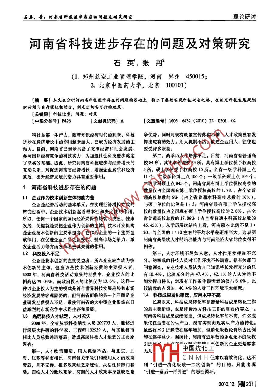 石美,等:河南省科技進步存在的問題及對策研究理論研討河南省科技進步存在的問題及對策研究石英,張丹(1.鄭州航空工業(yè)管理學院,河南鄭州450015;2.北京中醫(yī)藥大學,北京100101)[摘要]本文在分析河南省科技進步存在的問題的基礎上,指出了要想實現(xiàn)科技興省之路,在制定科技發(fā)展規(guī)劃時必須與自身現(xiàn)狀相結(jié)合,制定出切實可行的政策。[關鍵詞]科技進步;問題;對策[中圖分類號] F426[文獻標識碼] A[文章編號] 1005 -6432 (2010) 22 -0201 -02科技是第一-生產(chǎn)力,隨著知識經(jīng)濟時代的到來,科技爭優(yōu)勢。同時對現(xiàn)有政策宣傳落實不夠,人才政策沒有發(fā)進步在經(jīng)濟增長中的作用越來越大,已成為經(jīng)濟發(fā)展的主揮出應有的效力。用人機制不活,就連企業(yè)用人,往往也動力。目前,河南省已初步具備了支撐經(jīng)濟和社會發(fā)展、要受許多限制。參與國際經(jīng)濟競爭的科技實力,為加速社會科技進步奠定第二,高學歷人才培養(yǎng)不足。目前,河南省有普通高了堅實的基礎。因此,研究河南省科技進步與經(jīng)濟增長的校84所,其中本科院校33所,具有博士學位授予權高校互動關系,對促進河南省經(jīng)濟增長,增強企業(yè)素質(zhì)和經(jīng)濟5所,碩士學位授予權高校15所。全省- -級學科博士點素質(zhì),提升經(jīng)濟發(fā)展的潛力具有重要作用。11個,二級學科博士點106個;一級學科碩士點104個,二級學科碩士點845個。河南省具有博士學位授權高校的1河南省科技進步存在的問題數(shù)量僅占全國現(xiàn)有博士學位授權高校的1.7%,占全省普1.1 企業(yè)作為技術創(chuàng)新主體的能力差通高校總數(shù)的6% (占全省普通本科高??倲?shù)的16%),企業(yè)是經(jīng)濟活動的基本單元,在實現(xiàn)經(jīng)濟增長方式的與碩士單位的比例是1: 3;河南省具有碩士學位授權高轉(zhuǎn)變過程中,企業(yè)技術創(chuàng)新起著根本性和決定性的作用。校的數(shù)量僅占全國現(xiàn)有碩士學位授權高校的2.8%,占全所以,任何一個國家的國民經(jīng)濟要保持持續(xù)、快速、健康省普通高校總數(shù)的17. 86% (占全省普通本科高??倲?shù)的發(fā)展,關鍵就是要把企業(yè)作為創(chuàng)新的主體。技術開發(fā)機構(gòu)45. 45%)。從學歷層次結(jié)構(gòu)上看,河南碩本比例不足1:是企業(yè)技術創(chuàng)新的主要承擔者,它作為企業(yè)的- -個重要組20,與全國的1: 10 左右的平均水平差距相當大。這表明成部門,在促進企業(yè)產(chǎn)品更新?lián)Q代、提高市場競爭力、激河南省高層次人才的培養(yǎng)能力與河南經(jīng)濟大省的位次很不發(fā)企業(yè)活力等方面發(fā)揮著極其關鍵的作用。相稱。1.2科技投入不足第三,人才環(huán)境不盡如人意,人才作用發(fā)揮尚不充企業(yè)是技術創(chuàng)新的直接受益者,所以企業(yè)應當成為技分。約四成的科技人員對工作環(huán)境不甚滿意。據(jù)有關部門術創(chuàng)新的主體,也應該是技術創(chuàng)新經(jīng)費的主要投人者。問卷調(diào)查,專業(yè)技術人員認為自己知識特長發(fā)揮充分的只2008年,河南省科技活動籌集的經(jīng)費中,企業(yè)投入的比有10.4%,比較充分的占47.4%, 42. 1%的人認為尚不例高達79. 04%,而政府投入的比例僅為13.6%,這樣- -能發(fā)揮出特長;對現(xiàn)有工作條件很滿意的僅占8.6%,比種以企業(yè)投人為主的模式是符合世界科技發(fā)展趨勢和市場較滿意的占5|% , 40. 4%的人對T作環(huán)境不太滿意。經(jīng)濟發(fā)展的客觀需要的。但河南省面臨的另-一個問題是企1.4 科技成果轉(zhuǎn)化率低、應用水平不高業(yè)研發(fā)經(jīng)費投人不足,致使河南省的大中型企業(yè)很難在日長期以來,科技成果轉(zhuǎn)化率是衡量科技成果轉(zhuǎn)化工作益激烈的市場競爭中求得生存和發(fā)展。的最主要指標,也是評價地方科技工作的重要內(nèi)容之- -。1.3高層科技人才缺乏, 人才流失河南省科技成果成績突出,但成果轉(zhuǎn)化率卻不高,許多成2008年,全省從事科技活動人員209793人,能夠進果僅僅是潛在的生產(chǎn)力,沒有實現(xiàn)向現(xiàn)實生產(chǎn)力的轉(zhuǎn)化。行深層次科研的科學家、工程師132939 人,與其他省市雖然技術引進經(jīng)費在逐年增加,但消化吸收經(jīng)費所占比例相比人員總數(shù)遠遠落后。造成高層科技人才缺乏的主要原卻在逐年減少。據(jù)統(tǒng)計,河南有近半數(shù)的企業(yè)還不能吸收因有:手創(chuàng)新的企業(yè)更是寥寥中國煤化工第一,人才政策滯后,用人機制不活。與北京、上無幾海、江蘇等省市相比,河南省關于吸引和使用人才的政策YHCN M H G難以有效消化,達不滯后,且不完善,很多政策缺乏系統(tǒng)性、靈活性和部門聯(lián)到“引進一-消化吸收-二次創(chuàng)新”的目的,只能出現(xiàn)動。面臨人才的激烈競爭,河南的人才政策本身就缺乏競“引進- 落后一再引進"的惡性循環(huán)。2010.12 [M201]理論研討中國市場2010年第48期 (總第607期)2.4營造良好的科技環(huán)境和條件2對策科研體制的改革要適應以下“三個轉(zhuǎn)變”:“ 創(chuàng)新主2.1拓寬科技投入渠道, 建立多元化的科技投入體系體多元化”一實現(xiàn)創(chuàng)新主體由單 - -科研部門向多元化財政科研投人要爭取達到國家有關規(guī)定。政府要選擇轉(zhuǎn)