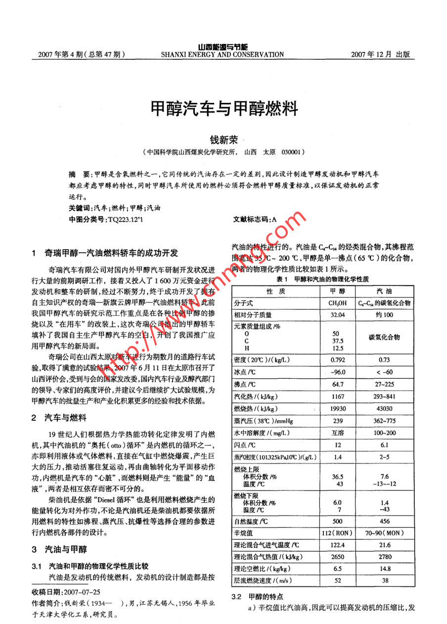 山西能源與節(jié)能2007年第4期(總第47期)SHANXI ENERGY AND CONSERVATION2007年12月出版甲醇汽車與甲醇燃料錢新榮(中國(guó)科學(xué)院山西煤炭化學(xué)研究所,山西太原030001)摘要:甲醇是含氧燃料之一,它同傳統(tǒng)的汽油存在一定的差別,因此設(shè)計(jì)制造甲醇發(fā)動(dòng)機(jī)和甲醇汽車都應(yīng)考慮甲醇的特性,同時(shí)甲醇汽車所使用的燃料必須符合燃料甲醇質(zhì)量標(biāo)準(zhǔn),以保證發(fā)動(dòng)機(jī)的正常運(yùn)行。關(guān)鍵詞:汽車;燃料;甲醇;汽油中圖分類號(hào):TQ223.12*1文獻(xiàn)標(biāo)志碼:A汽油的特性進(jìn)行的。汽油是Ce-Cu的烴類混合物,其沸程范1奇瑞甲醇一 -汽油燃料轎 車的成功開發(fā)圍寬達(dá)35 C~ 200 e,甲醇是單- -沸點(diǎn)(65 C )的化合物,奇瑞汽車有限公司對(duì)國(guó)內(nèi)外甲醇汽車研制開發(fā)狀況進(jìn)兩者的物理化學(xué)性質(zhì)比較如表1所示。行大量的前期調(diào)研工作,接著又投入了1 600萬(wàn)元資金進(jìn)行表1甲醇和汽油的物理化學(xué)性質(zhì)發(fā)動(dòng)機(jī)和整車的研制,經(jīng)過(guò)不斷努力,終于成功開發(fā)了擁有性質(zhì)甲醇汽油自主知識(shí)產(chǎn)權(quán)的奇瑞一新旗云牌甲醇- -汽油燃料轎車。此前|分子式CH,0H Cr C。的碳?xì)浠衔镂覈?guó)甲醇汽車的研究示范工作重點(diǎn)是在各種比例甲醇的摻相對(duì)分子質(zhì)量32.04約100燒以及“在用車”的改裝上,這次奇瑞公司推出的甲醇轎車元素質(zhì)量組成1%填補(bǔ)了我國(guó)自主生產(chǎn)甲醇汽車的空白,開創(chuàng)了我國(guó)推廣應(yīng)C9。碳?xì)浠衔镉眉状计嚨男戮置妗?75奇瑞公司在山西太原對(duì)新車進(jìn)行為期數(shù)月的道路行車試(密度( 20C )/(kgL)0.7920.73驗(yàn),取得了滿意的試驗(yàn)結(jié)果。2007年6月11日在太原市召開了| 冰點(diǎn)C-96.0<-60山西評(píng)價(jià)會(huì)受到與會(huì)的國(guó)家發(fā)改委,國(guó)內(nèi)汽車行業(yè)及醇汽部門|沸點(diǎn)心64.727-225的領(lǐng)導(dǎo)、專家們的高度評(píng)價(jià),并建議今后繼續(xù)擴(kuò)大試驗(yàn)規(guī)模,為| 汽化熱/( kJkg)1167293-841甲醇汽車的批量生產(chǎn)和產(chǎn)業(yè)化積累更多的經(jīng)驗(yàn)和技術(shù)依據(jù)。燃燒熱/(kJ/kg)19930430302汽車與燃料| 蒸汽壓( 38C )mmHg239362~77519世紀(jì)人們根據(jù)熱力學(xué)熱能功轉(zhuǎn)化定律發(fā)明了內(nèi)燃水中溶解度1( m/L)互溶100-200機(jī),其中汽油機(jī)的“奧托(otto )循環(huán)”是內(nèi)燃機(jī)的循環(huán)之一,| 閃點(diǎn)rC .26.亦即利用液體或氣體燃料,直接在氣缸中燃燒爆震,產(chǎn)生巨蒸汽密度( 101325kPa1OC )(@/L).42-5大的壓力,推動(dòng)活塞往復(fù)運(yùn)動(dòng),再由曲軸轉(zhuǎn)化為平面移動(dòng)作I燃燒上限功,內(nèi)燃機(jī)是汽車的“心臟”,而燃料則是產(chǎn)生“能量"的“血體積分?jǐn)?shù)1%36.57.6溫度心C43-13--12液”,兩者是相互依存而密不可分的。柴油機(jī)是依據(jù)"Diesel循環(huán)”也是利用燃料燃燒產(chǎn)生的燃燒下限體積分?jǐn)?shù)/%5.014能量轉(zhuǎn)化為對(duì)外作功,不論是汽油機(jī)還是柴油機(jī)都要依據(jù)所溫度心7用燃料的特性如沸程、蒸汽壓抗爆性等選擇合理的參數(shù)進(jìn)自然溫度rC500456行內(nèi)燃機(jī)各部件的設(shè)計(jì)。| 辛烷值112(RON) 70-90( MON)| 理論混合氣進(jìn)氣溫度心122.421.63汽油與甲醇| 理論混合氣熱值(kJhg)265027803.1汽油和甲醇的物理化學(xué)性質(zhì)比較| 理論空燃比1(kgkg).514.8汽油是發(fā)動(dòng)機(jī)的傳統(tǒng)燃料,發(fā)動(dòng)機(jī)的設(shè)計(jì)制造都是按|層流燃燒速度1( m/s )523收稿日期:2007-07-25作者簡(jiǎn)介:錢新榮(1934- ),男 ,江蘇無(wú)錫人,1956年畢業(yè)3.2 甲醇的特點(diǎn)a)辛烷值比汽油高,因此可以提高發(fā)動(dòng)機(jī)的壓縮比,發(fā)于天津大學(xué)化工系,研究員?!?4●山西能源與節(jié)能2007年12月動(dòng)機(jī)的熱效率明顯提高。現(xiàn)有甲醇生產(chǎn)廠都是按照化工甲醇的標(biāo)準(zhǔn)進(jìn)行甲醇生b)甲醇的燃燒速度和火焰?zhèn)鞑ニ俣缺绕涂?所以燃產(chǎn),化工甲醇主要用作化工原料。所以產(chǎn)品純度是質(zhì)量控制燒的定容性較好,燃燒持續(xù)期短,過(guò)后燃燒程度小,有利于熱的主要內(nèi)容,標(biāo)準(zhǔn)中12項(xiàng)指標(biāo)都是圍繞甲醇化合物自身特效率提高。性制定的。而燃料甲醇作為發(fā)動(dòng)機(jī)燃料必須按照發(fā)動(dòng)機(jī)燃料c)甲醇是含氧燃料,在燃燒過(guò)程中有自供氧效應(yīng),在的燃燒特性來(lái)制定標(biāo)準(zhǔn),所以兩者的要求有所區(qū)別。內(nèi)燃機(jī)中燃燒較均勻,減少了局部富氧或缺氧的幾率,CO和4.1 標(biāo)準(zhǔn)內(nèi)容不同HC的產(chǎn)生量減少,排放量降低,從而使燃燒效率和熱效率均化工甲醇已有質(zhì)量標(biāo)準(zhǔn)GB 338- -2004。提高,能耗率降低。有12項(xiàng)指標(biāo):色度、密度沸程高錳酸鉀試驗(yàn)水溶性試驗(yàn)、d)甲醇的汽化熱比汽油高兩倍多,當(dāng)其進(jìn)入氣缸后,水份含量、酸度堿度羰基化合物蒸發(fā)殘?jiān)蛩嵯礈臁⒁掖剂?。能吸收沿途管壁面后周圍高溫零件壁面的熱量而使自己蒸燃料甲醇目前只有山西省地方?biāo)準(zhǔn)DBI4/T 93- 2002。發(fā),利用了廢熱余熱而使自身的能位提高,又降低了氣缸、燃有8項(xiàng)