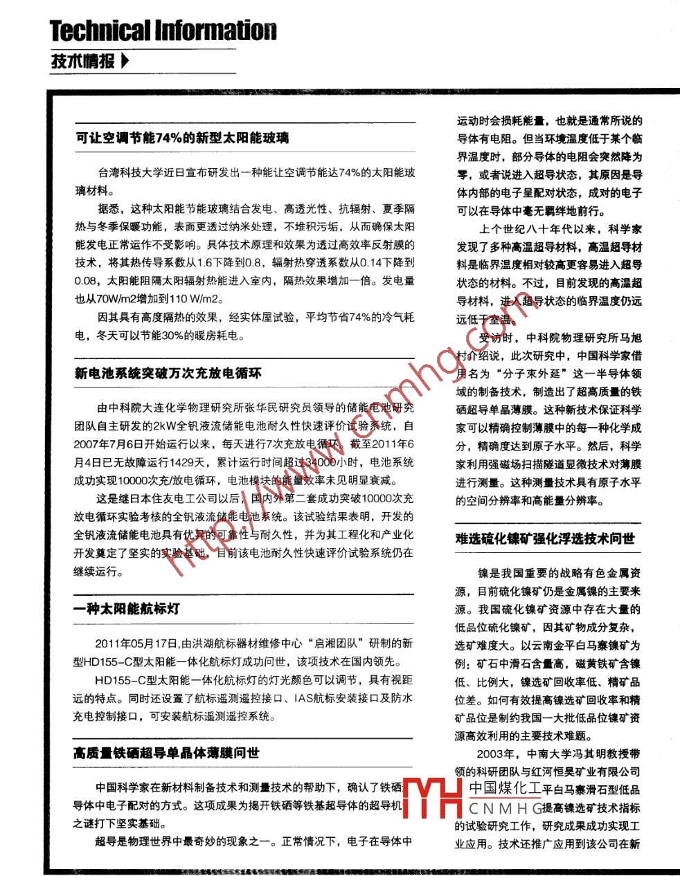 Technical Information技術(shù)情報>運動時會損耗能最t, 也就是通常所說的可讓空調(diào)節(jié)能74%的新型太陽能玻璃導體有電阻。但當環(huán)境溫度低于某個臨界溫度時,部分導體的電阻會突然降為臺灣科技大學近日宣布研發(fā)出一種能讓空調(diào)節(jié)能達74%的太陽能玻零,或者說進入超導狀態(tài),其原因是導璃材料。體內(nèi)部的電子呈配對狀態(tài),成對的電子據(jù)悉,這種太陽能節(jié)能玻璃結(jié)合發(fā)電、高透光性、抗輻射、夏季隔可以在導體中毫無羈絆地前行。熱與冬季保暖功能,表面更透過納米處理,不堆積污垢,從而確保太陽上個世紀八十年代以來,科學家能發(fā)電正常運作不受影響。具體技術(shù)原理和效果為透過高效率反射膜的發(fā)現(xiàn)了多種高溫超導材料,高溫超導材技術(shù),將其熱傳導系數(shù)從1.6下降到0.8,輻射熱穿透系數(shù)從0.14下降到料是臨界溫度相對較高更容易進入超導0.08,太陽能阻隔太陽輻射熱能進入室內(nèi),隔熱效果增加一倍。發(fā)電量狀態(tài)的材料。不過,目前發(fā)現(xiàn)的高溫超也從70W/m2增加到1 10 W/m2。導材料,進入超導狀態(tài)的臨界溫度仍遠因其具有高度隔熱的效果,經(jīng)實體屋試驗,平均節(jié)省74%的冷氣耗遠低于室溫。電,冬天可以節(jié)能30%的暖房耗電。受訪時,中科院物理研究所馬旭村介紹說,此次研究中,中國科學家借新電池系統(tǒng)突破萬次充放電循環(huán)用名為“分子束外延”這一-半導體領(lǐng)域的制備技術(shù),制造出了超高質(zhì)量的鐵由中科院大連化學物理研究所張華民研究員領(lǐng)導的儲能電池研究硒超導單晶薄膜。這種新技術(shù)保證科學團隊自主研發(fā)的2kW全釩液流儲能電池耐久性快速評價試驗系統(tǒng),自家可以精確控制薄膜中的每-種化學成2007年7月6日開始運行以來,每天進行7次充放電循環(huán)。截至2011年6分,精確度達到原子水平。然后,科學月4日已無故障運行1429天,累計運行時間超過34000小時,電池系統(tǒng)家利用強磁場掃描隧道顯微技術(shù)對薄膜成功實現(xiàn)0000次充/放電循環(huán),電池模塊的能量效率未見明顯衰減。進行測量。這種測量技術(shù)具有原子水平這是繼日本住友電工公司以后,國內(nèi)外第二套成功突破0000次充的空間分辨率和高能量分辨率。放電循環(huán)實驗考核的全釩液流儲能電池系統(tǒng)。該試驗結(jié)果表明,開發(fā)的全釩液流儲能電池具有優(yōu)異的可靠性與耐久性,并為其工程化和產(chǎn)業(yè)化難選硫化鎳礦強化浮選技術(shù)問世開發(fā)奠定了堅實的實驗基礎(chǔ),目前該電池耐久性快速評價試驗系統(tǒng)仍在繼續(xù)運行。鎳是我國重要的戰(zhàn)略有色金屬資源,目前硫化鎳礦仍是金屬鎳的主要來一種太陽能航標燈源。我國硫化鎳礦資源中存在大量的低品位硫化鎳礦,因其礦物成分復雜,2011年05月17日,由洪湖航標器材維修中心“啟湘團隊”研制的新選礦難度大。以云南金平白馬寨鎳礦為型HD155- -C型太陽能- -體化航標燈成功問世, 該項技術(shù)在國內(nèi)領(lǐng)先。例:礦石中滑石含量高,磁黃鐵礦含鎳HD155-C型太陽能- -體化航標燈的燈光顏色可以調(diào)節(jié),具有視距低、比例大,鎳選礦回收率低、精礦品遠的特點。同時還設(shè)置了航標遙測遙控接口、IAS航標安裝接口及防水位差。如何有效提高鎳選礦回收率和精充電控制接口,可安裝航標遙測遙控系統(tǒng)。礦品位是制約我國一大批低品位鎳礦資源高效利用的主要技術(shù)難題。高質(zhì)鐵硒超導單晶體薄膜問世2003年,中南大學馮其明教授帶領(lǐng)的科研團隊與紅河恒昊礦業(yè)有限公司中國科學家在新材料制備技術(shù)和測量技術(shù)的幫助下,確認了鐵硒中國煤化工平白馬寨滑石型低品導體中電子配對的方式。這項成果為揭開鐵硒等鐵基超導體的超導機:MYHC N M H G提高鎳選礦技術(shù)指標之謎打下堅實基礎(chǔ)。的試驗研究工作,研究成果成功實現(xiàn)工超導是物理世界中最奇妙的現(xiàn)象之- -。正常情況下,電子在導體中業(yè)應用。技術(shù)還推廣應用到該公司在新1萬方數(shù)漏x 201疆哈密的鎳礦。該項研究工作先后得到化硅單晶材料研究的基礎(chǔ)上,戴培貰在研究工作中進行了不同原料密了云南省省院省校合作計劃及國家重大度和燒結(jié)工藝的對比試驗,建立了碳化硅多晶陶瓷的生長模型,并從基礎(chǔ)理論研究(973)計劃的支持。8熱力學和動力學角度解釋了碳化硅多晶生長的原理。此方法完全不同年來,項目攻克了層層技術(shù)難關(guān),取得于現(xiàn)有的碳化硅陶瓷的制備工藝,獲得的材料具有優(yōu)異的性能,在軍了豐碩成果: .工、電子、機械等行業(yè)具有良好的應用前景,此技術(shù)已申請國家發(fā)明開發(fā)了脫泥-浮選、分步浮選兩種專利。該研究受到國家基金委項目、教育部博士點基金項目支持。新工藝,形成了難選低品位硫化鎳礦強化浮選技術(shù);研制了新的硫化鎳礦浮選高效藥劑和藥劑制度,強化了含鎳科學家利用病毒提高光電池轉(zhuǎn)化率磁黃鐵礦的浮選回收;開發(fā)出分步丟尾的脫泥浮選流程和分步浮選流程,美國麻省理工學院的研究人員日前成功利用病毒提高太陽能電池使得金平鎳礦工業(yè)生產(chǎn)鎳平均回收率能量轉(zhuǎn)化效率,該技術(shù)有望應用于太陽能電池生