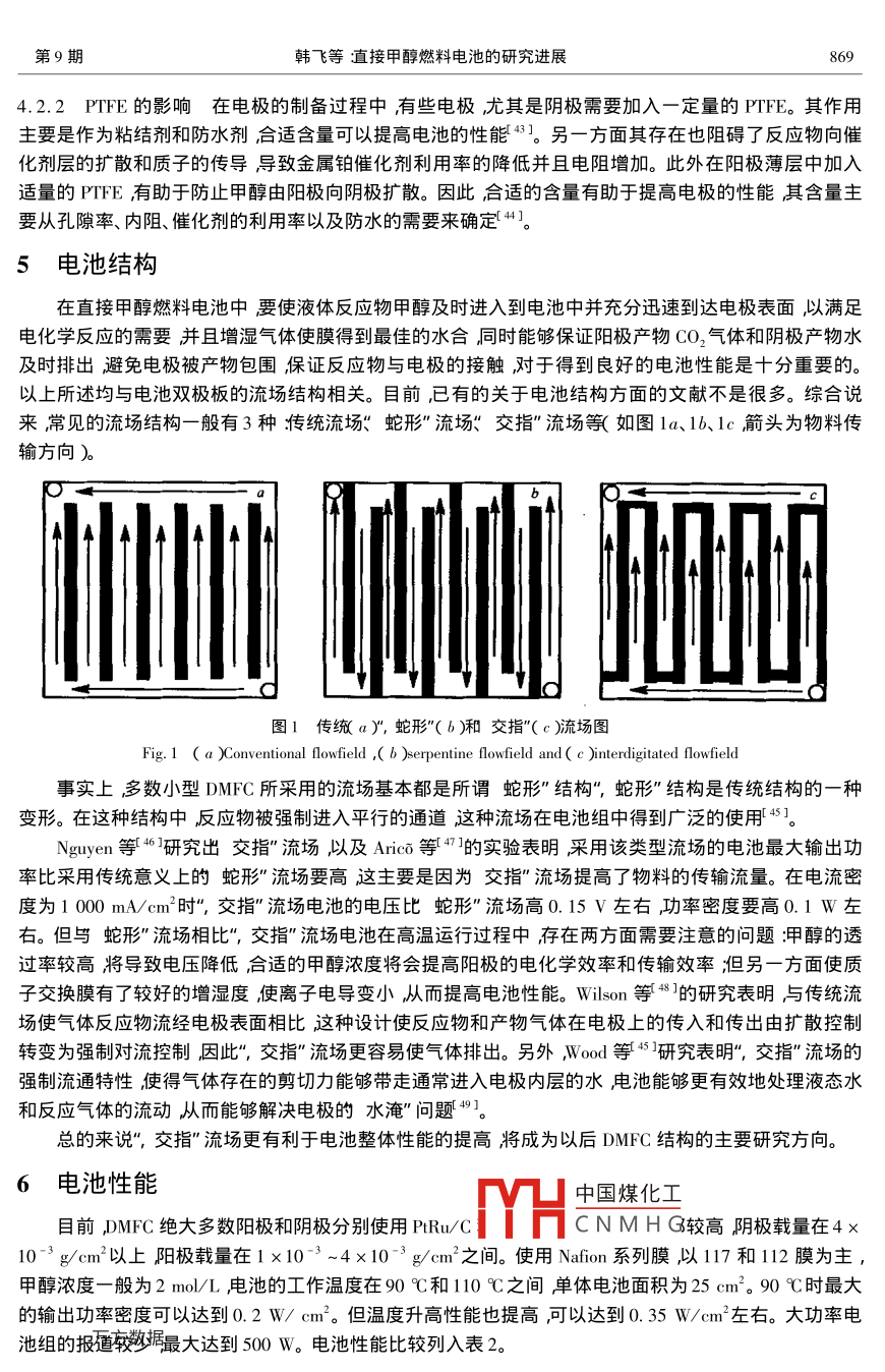 第21卷第9期應用化學Vol 21 No 92004年9月CHINESE JOURNAL OF APPLIED CHEMISTRYsep.2004f綜合評述直接甲醇燃料電池的研究進展韓飛劉長鵬邢巍′陸天虹中國科學院長春應用化學研究所長春130022)摘要綜述了直接甲醇燃料電池DMFC)的幾個方面研究進展如電催化劑、質子交換膜、膜電極集合體電池結構以及電池性能等論述了直接甲醇燃料電池的國內外研究現(xiàn)狀及進展分析了所存在的問題預測了DMFC的發(fā)展方向及應用前景關鍵詞直接甲醇燃料電池虍催化劑質子交換膜膜電極集合體電池性能綜述中圖分類號646文獻標識碼∶文章編號】0000518(2004)9086507直接甲醇燃料電池DMFC)以其燃料來源豐富、儲存方便、結構簡單、操作安全、持續(xù)供電時間長等優(yōu)點而日益受到廣泛關注預計將在小型家用電器、筆記本電腦、手機以及軍事移動性儀器等領域具有廣泛的應用前景。在過去的二十多年里,人們對這種新型電源產生了巨大熱情,許多國家均對發(fā)展DMFC進行了較大的科技投入。有關DMFC研究的報道和文獻很多本文對DMFC的電催化劑、質子交換膜、膜電極集合體、電池結構以及性能等方面的研究進展作如下評述。1陽極電催化劑1.1金屬催化劑甲醇電催化氧化的研究在20世紀60年代就開始進行。鉑是最先被用作甲醇等有機小分子電催化氧化反應的催化劑也是目前最有效的單一金屬催化劑。研究表明甲醇在Pt上首先發(fā)生吸附之后解離吸附生成中間體并在電催化劑的表面吸附同時給出電子。鉑對甲醇的氧化具有較高的催化活性但其缺點是價格昂貴在鉑電極表面上氧化甲醇所需的超電教(0.5~0.6ⅴ)大大超過甲醇的熱力學電(0.043V)易中毒等。鉑系的其它金屬如Au、Ag、Os、Ir、Ru、Rh、Pd等也表現(xiàn)出了一定的電催化活性1.2鉑基二元或多元電催化劑為了解決單用鉑作催化劑的活性仍不高和催化劑中毒等問題人們對鉑基二元或多元金屬催化劑進行了廣泛研究。經(jīng)過30多年大量工作許多致力研究DMFC陽極催化劑的學者一致認為合金催化劑中催化活性最高的是P-lu合金這種合金催化劑既降低了毒化的程度又使甲醇的氧化過電位降低約100mV。目前多數(shù)DMFC采用PRu/C作為陽極電催化劑對催化氧化甲醇機理的研究也比較多3。元合金催化劑對甲醇氧化的電催化活性好的原因還沒有定論但多數(shù)人傾向 Watanabe所提出的雙功能機理4。辛勤等3在單一或混合二元或三元醇的混合溶液為反應體系中制備PRu及其它鉑基催化劑,既提高了甲醇電催化活性又降低了成本。PSn催化劑是人們關注的另一類催化劑系統(tǒng)Sn的主要優(yōu)點是可以在較低電位下活化水生成OH物種這對于需要OH以氧化CO…等毒化物種的甲醇氧化是有利的。通過化學還原方法制得的二元復合催化劑對甲醇的電催化氧化活性PtRu>PtOs>Pt-Ag>PtR6。在三組分合金催化劑中 PtRuW/c對甲醇氧化表出是亨竹汗1PuSn-W四組分催化劑半電池實驗證明所制備的催化劑活性優(yōu)于P催化劑中國煤化工劑的基礎上研究了多種P基催化劑如Pt-Cr、PtSr在T基體電極上修飾PCNMH等催化劑對甲醇的電2003-12-23收稿200403-25修回國家科技部八六三"(2001AA323060)國家科技部九七三"(G200006408)和國家自然科學基金(20373068)資助項目通訊聯(lián)系店男1963年生研究員博士生導師;E- mail xingweic@ciac.cm;研究方向北學電源和金屬表面電化學處理技術866應用化學第21卷催化氧化都表現(xiàn)出了比Pt催化劑高的活性。1.3其它催化劑用金屬或金屬氧化物修飾的鉑催化劑存在的問題之一就是表面生成的氧化物導電性低含稀土元素的鈣鈦礦型ABO3氧化物導電性能較好表面富氧對甲醇及其中間產物的氧化有一定活性。在ABO3氧化物中A為Sr、Ce、Sm、P、Ia等B為Co、、F、Ru等1。過渡金屬卟啉類化合物作為CO電催化氧化的催化劑也有過一些研究如負載在活性炭上的阽h、Ir卟啉化合物在酸性介質中對CO電催化氧化有很好的活性。從過渡金屬絡合物作為氧還原催化劑中得到啟發(fā)認為金屬大環(huán)絡合物高溫熱解后,金屬仍以較高價態(tài)穩(wěn)定存在的性質會提高P在甲醇氧化中的催化活性。實驗證明這類催化劑對于甲醇的催化活性都大于Pt。從目前的研究結果來看由于催化劑的制備方法影響催化劑的表面積、結晶狀態(tài)和分散度等因而可以通過改進制備方法來優(yōu)化催化劑。以PRu合金催化劑為例制備方法可歸為兩大類即膠體化學法和共沉淀法艸。此外邢巍等已經(jīng)申請化學還原和溶膠凝膠法等制備催化劑方法的專利均能夠有效控制催化劑的粒徑獲得性能較好的催化劑。2陰極電催化劑隨著DMFC越來越受到重視并開始向實用化方向發(fā)展研制具有耐甲醇能力的陰極電催化劑就更加必要。利用不同方法制備不同類型的本體或負載型P合金催化劑綜合研究其催化氧還原活性和耐甲醇能力并通過各種表征手段研究和分析其合金效應探求性能優(yōu)越的DMFC陰極電催化劑。這里介紹DMFC陰極電催化劑的發(fā)展歷史和最新研究進展。2.1鉑催化劑對于氧陰極還原催化劑的研究遠沒有陽極的那樣活躍。這主要是因為PL/C是目前DMFC主要使用的陰極電催化劑盡管在動力學上氧的還原還是較慢的步驟以及易于被甲醇所毒化但因為其催化氧還原的活性和穩(wěn)定性較高所以在已有的關于DMFC性能的報道中絕大部分使用的陰極催化劑都是PL/C。與陽極催化劑的發(fā)展相似最初所采